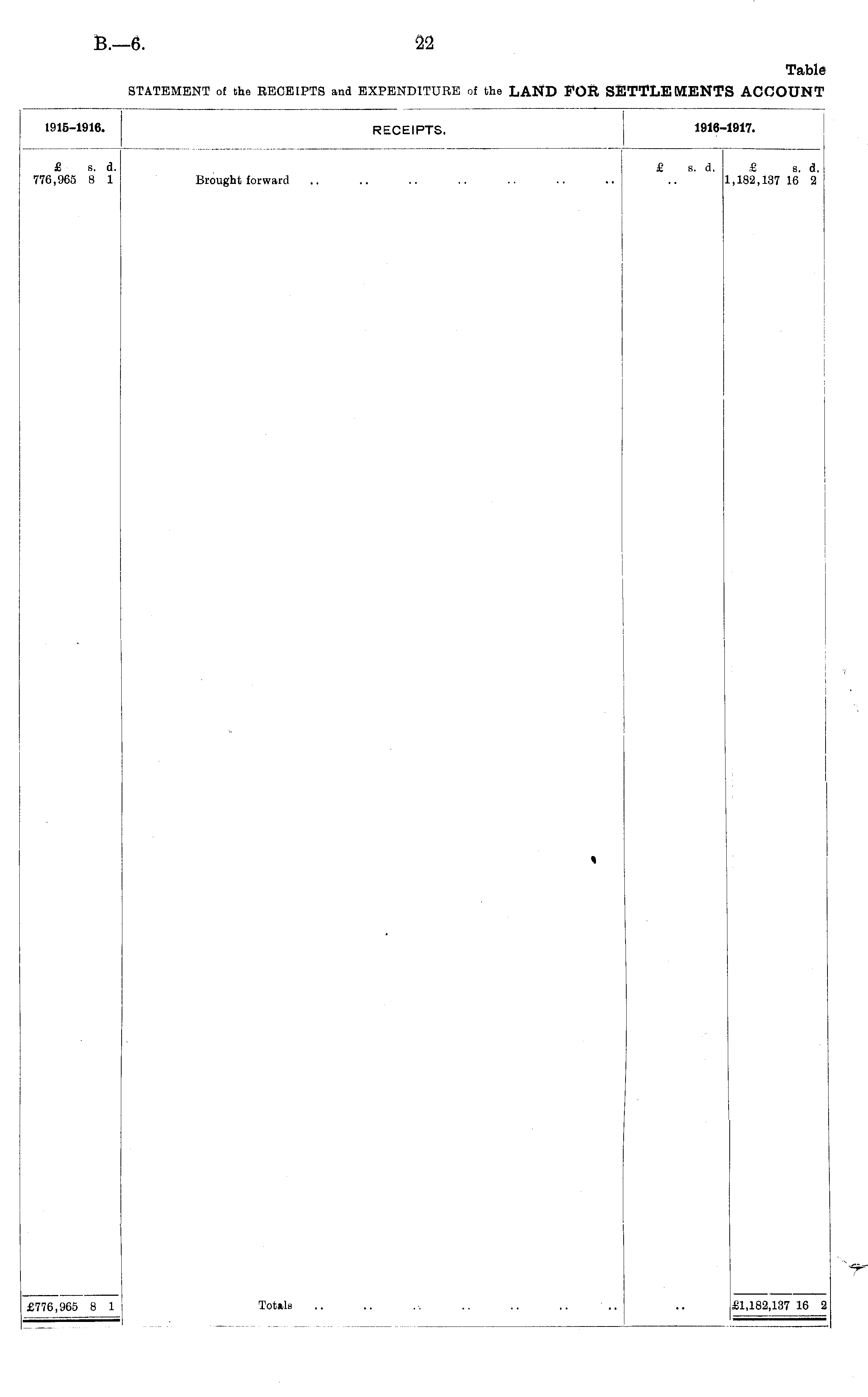 1915-1916. RECEIPTS. 1916-1917. £ a. d. 776,965 8 1 Brought forward £ s. d. £ s. d. 1,182,137 16 2 % A Totals v^ £776,965 8 1 £1,182,137 16 2