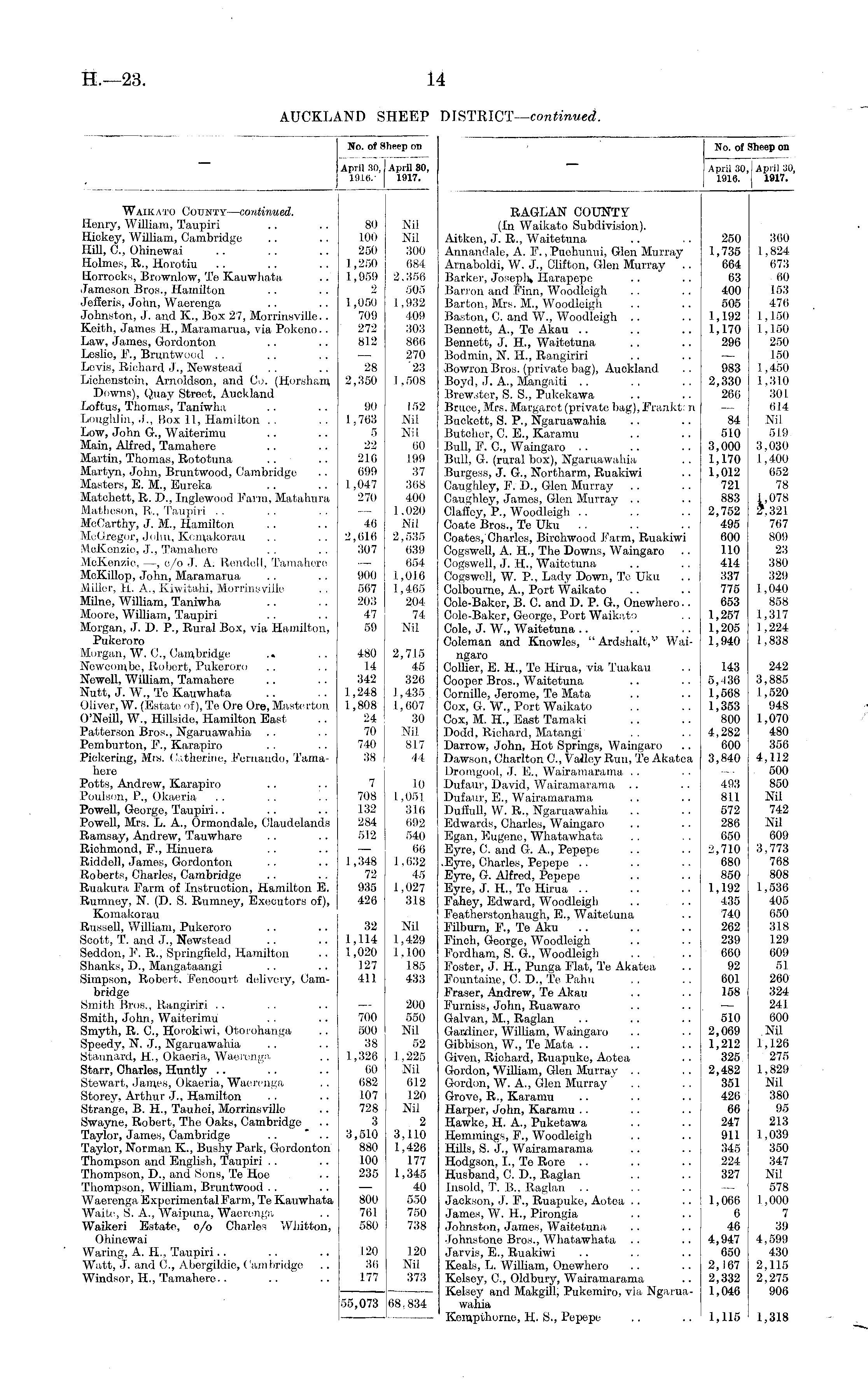 No. of Sheep on April 30,1 April 80, 1916. 1917. April 80,1 April 30, 1916. 1917. No. of .Sheep on Waikato County— continued. Henry, William, Taupiri Hickey, William, Cambridge Hill, C, Ohinewai Holmes, R., Horotiu Horrocks, Brownlow, Te Kauwhata .Tameson Bros., Hamilton .Tefferis, John, Waerenga Johnston, J. and K., Box 27, Morrinsville.. Keith, James H., Maramarua, via Pokeno.. Law, Jamos, Gordonton, Lcslio, P., Bruntwood Levis, Richard J., Newstead Lichcnstein, Arnoldson, and Co. (Horsham Downs), Quay Street, Auckland Loftus, Thomas, Taniwha Loughlin, J., Box II, Hamilton Low, John G., Waiterimu Main, Alfred, Tamahere Martin, Thomas, Rototuna Martyn, John, Bruntwood, Cambridge Masters, E. M., Eureka Matchett, R. D., Inglewood Farm, Matahura Matheson, It., Taupiri McCarthy, J. M., Hamilton McGregor, John, Kcmakorau McKenzie, J., Tamahere McKenzie, —, c/o .T. A. Rendell, Tamahere McKillop, John, Maramarua Miller, Tt. A., Kiwitahi, Morrinsville Milne, William, Taniwha Moore, William, Taupiri Morgan, J. D. P., Rural Box, via Hamilton, Pukeroro Morgan, W. C, Cambridge Ncwconibo, Robert, Pukeroro Newell, WiUiam, Tamahere Nutt, J. W., To Kauwhata Oliver, W. (Estate of), Te Ore Ore, Masterton O'Neill, W., Hillside, Hamilton East Patterson Bros., Ngaruawahia Pemburton, F., Karapiro Pickering, Mrs. Catherine, Fernando, Tamahere Potts, Andrew, Karapiro Poulson, P., Okaeria Powell, George, Taupiri.. Powell, Mrs. L. A., Ormondale, Olaudelands Ramsay, Andrew, Tauwhare Richmond, F., Hinuera Riddell, Jamos, Gordonton Roberts, Charlos, Cambridge Ruakura Farm of Instruction, Hamilton E. Rumnoy, N. (D. S. Rumncy, Executors of), Komakorau Russell, William, Pukeroro Scott, T. and J., Newstead Seddon, I 1 '. R., Springfield, Hamilton Shanks, D., Mangataangi Simpson, Robert, Fencourt delivery, Cambridge Smith Bros., Rangiriri .. Smith, John, Waiterimu Smyth, R. C, Horokiwi, Otorohanga Speedy, N. J., Ngaruawahia Stannard, H., Okaeria, Waerenga Starr, Charles, Huntly Stewart, .Tames, Okaeria, Waerenga Storey, Arthur ,L, Hamilton Strange, B. H., Tauhei, Morrinsville Swayne, Robert, The Oaks, Cambridge Taylor, James, Cambridge .. Taylor, Norman K., Bushy Park, Gordonton Thompson and English, Taupiri Thompson, D., and Sons, Te Hoe Thompson, William, Bruntwood W aerenga Experimental Farm, Te Kauwhata Waite, S. A., Waipuna, Waerenga Waikeri Estate, o/o Charles Whitton, Ohinewai Waring, A. H„, Taupiri Watt, J. and C, Abergildic, Cambridge Windsor, H., Tamahore.. 80 100 250 1,250 1,969 2 1,050 709 272 812 28 2,350 90 1,703 5 22 210 699 1,047 270 40 2,616 307 900 507 203 47 59 480 14 342 1,248 1,808 24 70 740 38 Nil Nil 300 084 2,356 505 1.932 409 303 866 270 23 1.508 152 Nil Nil 00 199 37 308 400 1.020 Nil 2,535 039 054 1,016 1,465 204 74 Nil 2,715 45 326 1,435 1,007 30 Nil 817 44 RAGLAN COUNTY (In Waikato Subdivision). Aitken, J. R., Waitetuna Annandale, A. F. ,Puehunui, Glen Murray Arnaboldi, W. J., Clifton, Glen Murray Barker, Joseph, Harapepe Barron and Finn, Woodleigh Barton, Mrs. M., Woodleigh Baston, C. and W., Woodleigh Bennett, A., Te Akau Bennett, J. H., Waitetuna Bodmin, N. TL, Rangiriri Bowron Bros, (private bag), Auckland. Boyd, J. A., Mangaiti Brewster, S. S., Pukekawa Bruce, Mrs. Margaret (private bag), Frankt: n Buckett, S. P., Ngaruawahia Butcher. C. E., Karamu Bull, F. C, Waingaro Bull, G. (rural box), Ngaruawahia Burgess, J. G., Northarm, Ruakiwi Caughloy, F. D., Glen Murray Caughley, James, Glen Murray Claffey, P., Woodleigh Coatc Bros., Te Uku Coates,'Charles, Birchwood Farm, Ruakiwi Cogswell, A. IL, The Downs, Waingaro Cogswell, J. H., Waitetuna Cogswell, W. P., Lady Down, 'Te Uku Colbourne, A., Port Waikato Cole-Baker, B. C. and D. P. G., Onewhero.. Cole-Baker, George, Port Waikato Cole, J. W., Waitetuna Coleman and Knowles, " Ardshalt,'-' Waingaro Collier, E. IL, Te Hirua, via 'Tuakau Cooper Bros., Waitetuna Cornillo, Jerome, Te Mata Cox, G. W., Port Waikato Cox, M. H., Fast Tamaki Dodd, Richard, Matangi Darrow, John, Hot Springs, Waingaro Dawson, Charlton C, Valley Run, Te Akatca Dromgool, J. E., Wairamarama Dufaur, David, Wairamarama Dufaur, E., Wairamarama Duffull, W. R., Ngaruawahia Edwards, Charlos, Waingaro Egan, Eugene, Whatawhata Eyre, C. and G. A., Pepepe .Eyre, Charles, Pepepe Eyre, G. Alfred, Pepepe Eyre, J. IL, To Hirua Fahey, Edward, Woodleigh Featherstonhaugh, E., Waitetuna Filburn, F., To Aku Finch, George, Woodleigh Fordham, S. G., Woodleigh Foster, J. H., Punga Flat, To Akaten Fountaine, 0. D., 'Te Pahu Fraser, Andrew, Te Akau Furniss, John, Ruawaro Galvan, M., Raglan Gardiner, William, Waingaro Gibbison, W., Te Mata Given, Richard, Ruapuke, Aotea Gordon, WiUiam, Glen Murray Gordon, W. A., Glen Murray Grove, R., Karamu Harper, John, Karamu Hawke, H. A., Puketawa Hemmings, F., Woodleigh Hills, S. .1., Wairamarama Hodgson, I., Te Rore Husband, 0. D., Raglan lusold, T. B., Raglan Jackson, J. F., Ruapuke, Aotea James, W. H., Pirongia •Johnston, James, Waitetuna ■lohnstone Bros., Whatawhata Jarvis, E., Ruakiwi Keals, L. William, Onewhero Kolsoy, G, Oldbury, Wairamarama Kelsoy and Makgill, Pukemiro, via. Ngaruawahia Kempfchorne, H. S., Pepepe 250 1,735 664 63 400 505 1,192 1,170 296 983 2,330 260 84 510 3,000 1,1.70 1,012 721 883 2,752 495 000 110 414 337 775 653 1,257 1,205 1,940 143 5,436 1,568 1,353 800 4,282 600 3,840 300 1,824 073 00 153 476 1,150 1,150 2,50 150 1,450 1,310 301 614 Nil 519 3,030 1,400 052 78 I .07H 2.321 767 809 23 380 329 1,040 858 1,317 1,224 1,838 242 3,885 1,520 948 1,070 480 356 4,112 500 850 Nil 742 Nil 609 3,773 768 808 1,536 405 650 318 129 609 51 260 324 241 600 Nil 1,126 275 1,829 Nil 380 95 213 1,039 350 347 Nil 578 1,000 7 39 4,599 430 2,115 2,275 906 7 708 132 284 512 10 1,051 316 692 540 00 1,032 45 1,027 318 493 811 572 286 650 2,710 680 850 1,192 435 740 262 239 660 92 601 158 1,348 72 935 426 32 .1,114 1 ,020 127 411 Nil 1,429 1,100 185 433 700 500 38 1,326 00 682 107 728 3 3,510 880 100 235 200 550 Nil 52 1,225 Nil 012 120 Nil 2 3,1