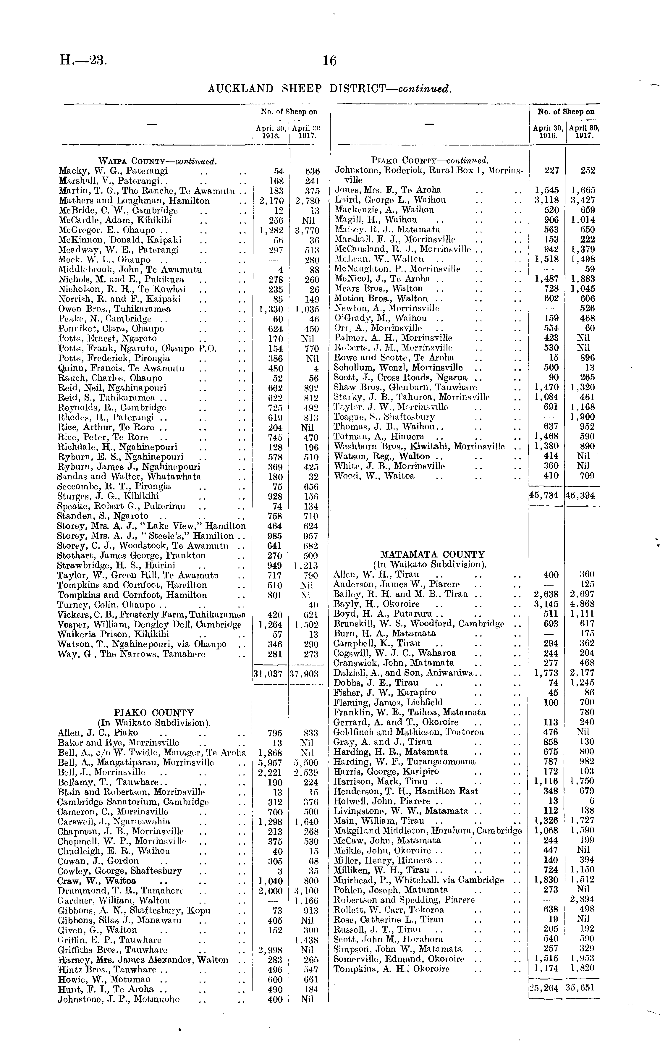 No. of Sheep on April 30,1 April 30 1916. 1917. No. of Sheep on April 30, j April 30, 1916. 1917. Waipa County-— continued. Maeky, W. G., Paterangi Marshall, V., Paterangi.. Martin, T. G., The Ranchc, Te Awamutu .. Mathers and Loughman, Hamilton McBride, C. W., Cambridge McCardle, Adam, Kihikihi McGregor, E., Ohaupo McKinnon, Donald, Kaipaki Mcadway, W. E., Paterangi Meek, W. L., Ohaupo .. Middle brook, John, Te Awamutu Nichols, M. and E., Pukikura Nicholson, R. H-, Te Kowhai Norrish, It. and F., Kaipaki Owen Bros., Tuhikaramea Peake, N., Cambridge Penniket, Clara, Ohaupo Potts, Ernest, Ngaroto Potts, Frank, Ngaroto, Ohaupo P.O. Potts, Frederick, Pirongia Quinn, Francis, To Awamutu Ranch, Charles, Ohaupo Reid, Neil, Ngahinapouri Reid, S., Tuhikaramea Reynolds, R., Cambridge Rhodes, IL, Paterangi Rice, Arthur, Te Rore Rice, Peter, Te Rore Richdale, H., Ngahinepouri Ryburn, E. S., Ngahinepouri Ryburn, James J., Ngahinepouri Sandas and Walter, Whatawhata Seccombe, It. T., Pirongia Sturges, J. G., Kihikihi Speake, Robert G., Pukerimu Standen, S., Ngaroto Storey, Mrs. A. J., "Lake View," Hamilton Storey, Mrs. A. J., " Steele's," Hamilton .. Storey, C. J., Woodstock, Te Awamutu .. Stothart, James George, Frankton Strawbridge, H. S., Hairini Taylor, W., Green Hill, Te Awamutu Tompkins and Cornfoot, Hamilton Tompkins and Cornfoot, Hamilton Turney, Colin, Ohaupo Vickers, C. B., Frosterly Farm, Tuhikaramea Vosper, William, Dengley Dell, Cambridge Waikeria Prison, Kihikihi Watson, T., Ngahinepouri, via Ohaupo Way, G , The Narrows, Tamahere 54 168 183 2,170 12 256 1,282 66 297 4 278 235 85 1,3.30 00 624 1.70 154 386 480 52 662 022 725 019 204 745 128 578 309 180 75 928 74 758 464 985 641 270 949 717 510 801 636 241 375 2,780 13 Nil 3,770 30 513 280 88 260 26 149 1,035 46 450 Nil 770 Nil 4 56 892 812 492 813 NU 470 196 510 425 32 056 150 134 710 024 957 082 500 1,213 790 Nil Nil 40 621 I . 502 13 290 273 Piako County— continued. Johnstone, Roderick, Rural Box I, MorrinsviUe Jones, Mrs. F., Te Aroha Laird, George L., Waihou Mackenzie, A., Waihou Magill, IL, Waihou Maisey, R. J., Matamata Marshall, F. J., Morrinsville McCausland, R. J., MorrinsviUe .. McLean, W., Waltcn .. McNaughton, P., Morrinsville McNicol, J., Te Aroha .. Mears Bros., Walton Motion Bros., Walton Newton, A., Morrinsville O'Grady, M., Waihou .. Orr, A., Morrinsville Palmer, A. TL, Morrinsville Roberts, J. M., Morrinsville Rowe and Scotte, Te Aroha Scholium, Wenzl, MorrinsviUe Scott, ,!., Cross Roads, Ngarua Shaw Bros., Glenburn, Tauwhare Starky, J. B., Tahuroa, MorrinsviUe Taylor, J. W., Morrinsville Teague, S.. Shaftesbury Thomas, J. B., Waihou.. Tot man, A., Hinuera .. Washburn Bros., Kiwitahi, Morrinsville .. Watson, Reg., Walton White, J. B., Morrinsville Wood, W„ Waitoa 227 1,545 3,118 520 906 .563 153 942 1,518 1,487 728 602 159 554 423 530 1.5 500 90 1,470 1,084 691 252 1,665 3,427 659 1,014 550 222 1,379 1,498 59 1,883 1,045 006 526 468 60 Nil Nil 890 13 265 1.320 461 1,168 1,900 952 590 890 Nil ' Nil 709 637 1,468 1,380 414 360 410 45,734 46,394 PIAKO COUNTY (In Waikato Subdivision). Allen, J. C, Piako Baker and Rye, Morrinsville Bell, A., c/o W. Twidle, Manager, Te Aroha Bell, A., Mangatiparau, MorrinsviUe. Bell, .1., Morrins\ille Bellamy, T., Tauwhare.. Blain and Robertson, MorrinsviUe Cambridge Sanatorium, Cambridge Cameron, C, MorrinsviUe Carswell,.).. Ngaruawahia Chapman, J. B., Morrinsville Chopmell, W. P., MorrinsviUe Chudleigh, E. It., Waihou Cowan, J., Gordon Cowley, George, Shaftesbury Craw, W., Waitoa Drummond, T. R., Tamahere Gardner, WiUiam, Walton Gibbons, A. N., Shaftesbury, Kopu Gibbons, Silas J., Manawaru Given, G., Walton Griffin, 15. P., Tauwhare Griffiths Bros., Tauwhare Harney, Mrs. James Alexander, Walton .. Hintz Bros., Tauwhare Howie, W., Motumao Hunt, F. I., Te Aroha Johnstone, J. P., Motmuoho 1.31,037 420 1,204 57 346 281 795 13 1,868 5,957 2,221 190 13 312 700 1,298 213 375 40 305 3 1,040 2,000 37,903 833 Nil Nil 5.500 2.539 224 15 370 500 1,040 268 530 15 08 35 800 3.100 I .100 913 Nil 300 ! .438 Nil 265 .547 661 184 Nil MATAMATA COUNTY (In Waikato Subdivision). Allen, W. H„ Tirau Anderson, James W., Piarere Bailey, R. H. and M. B., Tirau Bayly, H., Okoroire Boyd, H. A., Putaruru Brunskill, W. S., Woodford, Cambridge .. Bum, H. A., Matamata Campbell, K, Tirau Cogswill, W. J. G, Waharoa Cranswick, John, Matamata Dalziell, A., and Son, Aniwaniwa.. Dobbs, J. E„ Tirau Fisher, J. W., Karapiro Fleming, James, Lichfield Franklin, W. E., Taihoa, Matamata Gerrard, A. and T., Okoroire Goldfinch and Mathieson, Toatoroa Gray, A. and J., Tirau Harding, H. R., Matamata Harding, W. F., Turangaomoana Harris, George, Karipiro Harrison, Mark, Tirau Henderson, T. H., Hamilton East Holwell, John, Piarere Livingstone, W. W., Matamata Main, WiUiam, Tirau Makgiland Middleton, Horahora, Cambridge McCaw, John, Matamata Mcikle, John, Okoroire Miller, Henry, Hinuera Milliken, W. H., Tirau Muirhead, P., Whitehall, via Cambridge .. Pohlen, Joseph, Matamata Robertson and Spudding, Piarere Rollett, W. Carr, Tokoroa Rose;, Catherine L., Tirau Russell, .T. T., Tirau Scott, .Tohn M., Horahora Simpson, John W., Matamata Somerville, Edmund, Okoroire Tompkins, A. H-, Okoroire 400 300 — 125 2,638 2,697 3,145 4.868 511 1,11] 693 017 — . 175 294 302 244 204 277 408 1,773 2,177 74 1 ,245 45 80 100 700 780 113 240 476 Nil 858 130 675 800 787 982 172 103 1,116 1,750 348 679 13 6 112 138 1,326 ! 1,727 1,008 ; 1.590 244 i 199 447 I Nil 140 : 394 724 I 1,150 1,830 ! 1,512 273 i Nil 2,894 638 ' 498 19 ! Nil 205 192 540 590 257 329 1,515 1,953 1,174 1,820 73 405 152 2.998 283 496 600 490 400 25,204 |35,651
