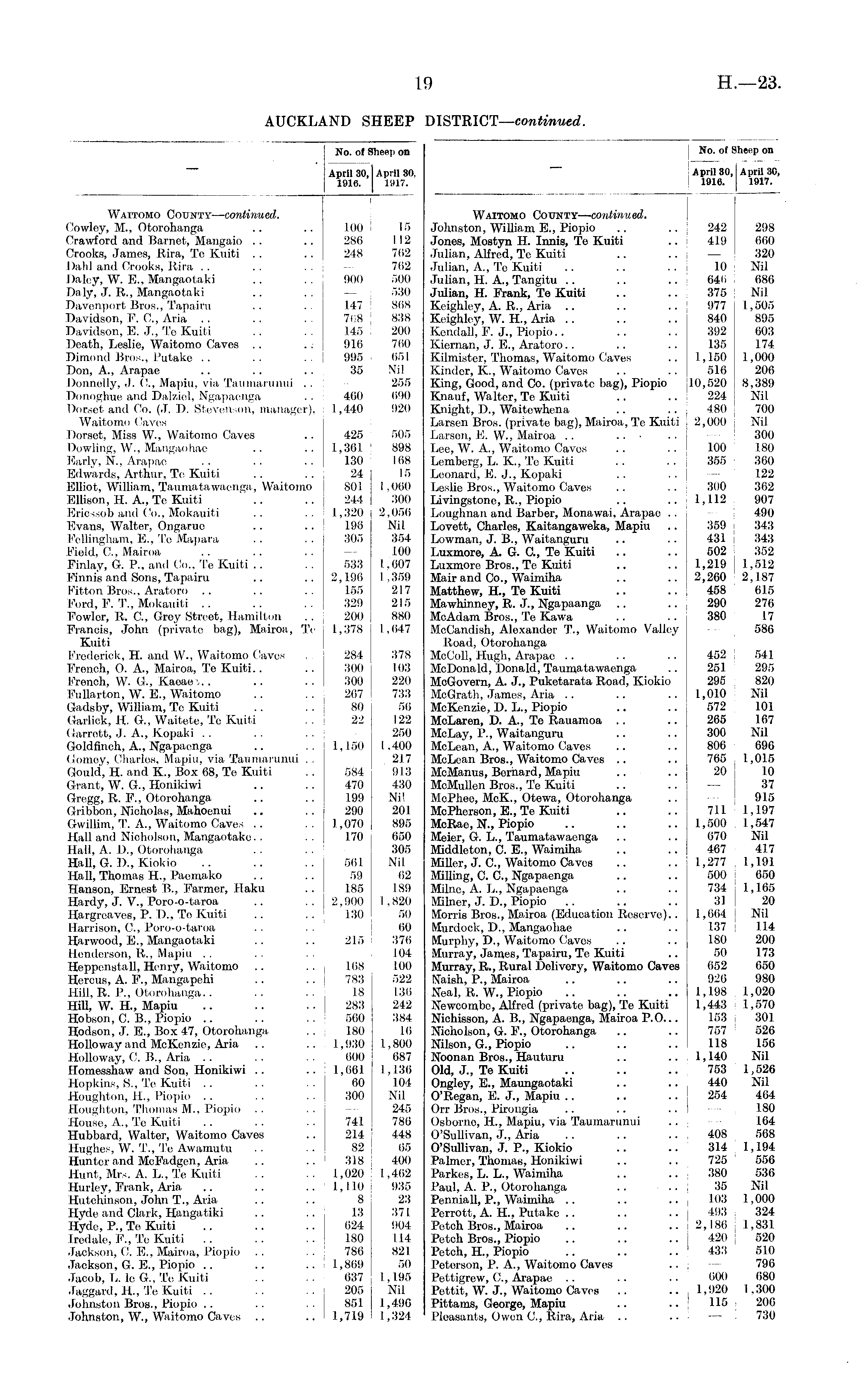 No. of Sheep on April 30, April 80. 1916. 1917. No. of Sheep on April 30,1 April 30, 1916. 1917. Waitomo County— continued. Cowley, M., Otorohanga .. .. 100 Crawford and Barnet, Mangaio .. .. 286 Crooks, James, Rira, To Kuiti .. .. 248 Dahl and Crooks, Rira Daley, W. E„ Mangaotaki .. .. 900 Daly, J. R., Mangaotaki Davenport Bros., Tapairu .. . . 147 Davidson, F. G, Aria .. .. . . 708 Davidson, E. J., To Kuiti .. . . 145 Death, Leslie, Waitomo Caves .. . ; 916 ! Dimond Bros., Putake .. .. . . 995 Don, A., Arapae .. .. .. 35 Donnelly, J. G, Mapiu, via Taumarunui . . Donoghue and Dalziel, Ngapaenga .. 460 Dorset and Co. (J. D. Stevenson, manager), 1,440 Waitomo Oaves Dorset, Miss W., Waitomo Caves .. 425 Dowling, W., Mangaohae .. .. 1,301 Early, N., Arapae .. .. . . 130 Edwards, Arthur, Te Kuiti . . .. 24 EUiot, William, Taumatawaenga, Waitomo 801 Ellison, H. A., Te Kuiti .. .. 244 Ericssob and Co., Mokauiti .. .. 1,320 Evans, Walter, Ongarue .. .. 196 Fcllingham, E., Te Mapara . . .. 305 Field, C, Mairoa Finlay, G. P., and Co., Te Kuiti .. 533 Finnis and Sons, Tapairu .. .. 2,190 Fitton Bros., Aratoro .. .. .. 155 Ford, F. T., Mokauiti .. .. . . 329 Fowler, R. G, Grey Street, Hamilton .. 200 Francis, John (privato bag), Mairoa, Te 1,378 Kuiti Frederick, H. and W., Waitomo Caves . . 284 French, O. A., Mairoa, Te Kuiti.. .. 300 French, W. G., Kaoae',.. .. ,'. 300 FuUarton, W. E., Waitomo .. .. 267 Gadsby, William, To Kuiti .. .. 80 Garlick, H. G., Waitete, Te Kuiti .. 22 Garrott, J. A., Kopaki Goldfinch, A., Ngapaenga .. .. 1,150 Gorncy, Charles, Mapiu, via Taumarunui . , Gould, H. and K., Box 68, Te Kuiti .. 584 Grant, W. G., Honikiwi .. .. 470 Gregg, R. F., Otorohanga .. .. T99 Gribbon, Nicholas, Mahoenui .. .. 290 Gwillim, T. A., Waitomo Caves .. .. 1,070 Hall and Nicholson, Mangaotake.. .. 170 Hall, A. D., Otorohanga Hall, G. D., Kiokio .. .. .. 561 Hall, Thomas H., Paemako .. .. 59 Hanson, Ernest B., Farmer, Haku .. 185 Hardy, J. V., Poro-o-taroa .. .. 2,900 Hargreaves, P. D., To Kuiti .. .. 130 Harrison, C, Poro-o-taroa . . Harwood, E., Mangaotaki .. '.. 215 Henderson, R., Mapiu Heppenstall, Henry, Waitomo .. .. 168 | Hercus, A. F., Mangapehi .. .. 783 Hill, R. P., Otorohanga.. . . . . 18 Hill, W. H., Mapiu .. .. . . 283 Hobson, C. B., Piopio .. .. .. 560 Hodson, J. E., Box 47, Otorohanga .. 180 HoHoway and McKenzie, Aria .. .. 1,930 Holloway, 0. B., Aria .. .. . . 000 Homesshaw and Son, Honikiwi .. .. 1,001 Hopkins, S., Te Kuiti .. .. ... 60 Houghton, H., Piopio . . . . . . 300 Houghton, 'Thomas M., Piopio House, A., 'To Kuiti .. . . . . 741 Hubbard, Walter, Waitomo Caves .. 214 j Hughes, W. T., Te Awamutu . . . . 82 Hunter and McFadgen, Aria .. .. 318 1 Hunt, Mrs. A. L., Te Kuiti .. .. 1,020 Hurley, Frank, Aria .. .. .. 1,110 Hutchinson, John T., Aria .. . .* 8 Hyde and Clark, Hangatiki .. .. 13 Hyde, P., Te Kuiti .. .. .. 624 Irodale, F., To Kuiti .. .. .. 180 Jackson, 0. E., Mairoa, Piopio . . . . 786 Jackson, G. E., Piopio .. .. .. 1,809 .Tacob, L. le G., To Kuiti .. .. 637 •laggard, H., Te Kuiti .. . . . . 205 Johnston Bros., Piopio .. .. 851 .Tohnston, W., Waitomo Caves .. .. 1,719 15 112 762 762 500 530 868 838 200 760 051 Nil 255 090 920 505 898 108 15 1,000 300 2,050 Nil 354 100 1,007 I , 359 217 215 880 I , 047 378 103 220 733 66 122 250 1,400 217 913 430 Nil 201 895 650 305 Nil 02 189 1,820 50 00 376 104 100 522 130 242 384 10 1,800 687 1,136 104 Nil 245 786 448 05 400 1,402 935 23 371 904 1.14 821 50 1,195 Nil 1,490 1,324 Waitomo County— continued. Johnston, WiUiam E., Piopio Jones, Mostyn H. Innis, Te Kuiti Julian, Alfred, Tc Kuiti Julian, A., To Kuiti Julian, H. A., Tangitu .. Julian, H. Frank, Te Kuiti Keighley, A. R., Aria Keighley, W. H., Aria Kendall, F. J., Piopio.. Kiernan, J. E., Aratoro.. Kilmister, 'Thomas, Waitomo Caves Kinder, K, Waitomo Caves King, Good, and Co. (private bag), Piopio Knauf, Walter, Te Kuiti .. Knight, D., Waitewhena Larsen Bros, (private bag), Mairoa, Te Kuiti Larsen, E. W., Mairoa .. .. ■ Lee, W. A., Waitomo Caves Lemberg, L. K., 'Tc Kuiti Leonard, E. J., Kopaki Leslie Bros., Waitomo Caves Livingstone, R., Piopio Loughnan and Barber, Monawai, Arapae . . Lovett, Charles, Kaitangaweka, Mapiu Lowman, J. B., Waitanguru Luxmore, A. G. G, Te Kuiti Luxmore Bros., Te Kuiti Mair and Co., Waimiha Matthew, H., Te Kuiti Mawhinnoy, R. J., Ngapaanga McAdam Bros., Te Kawa McCandish, Alexander T., Waitomo Valley Road, Otorohanga McColl, Hugh, Arapae McDonald, Donald, Taumatawaenga MoGovern, A. J., Puketarata Road, Kiokio McGrath, James, Aria McKenzie, D. L., Piopio McLaren, D. A., Te Rauamoa McLay, P., Waitanguru McLean, A., Waitomo Caves McLean Bros., Waitomo Caves McManus, Bernard, Mapiu McMullen Bros., 'To Kuiti McPhee, M!cK., Otewa, Otorohanga McPherson, E., Te Kuiti McRae, N., Piopio Meier, G. L., Taumatawaenga Middleton, C. E., Waimiha MiUer, J. C., Waitomo Caves MiUing, C. C, Ngapaenga Milne, A. L., Ngapaenga MTlner, J. D., Piopio Morris Bros., Mairoa (Education Reserve).. Murdoch, D., Mangaohae Murphy, D., Waitomo Caves Murray, James, Tapairu, Te Kuiti Murray, R., Rural Delivery, Waitomo Caves Naish, P., Mairoa Neal, R. W., Piopio Newcombo, Alfred (private bag), To Kuiti Nichisson, A. B., Ngapaenga, Mairoa P.O... Nicholson, G. F., Otorohanga Nilson, G., Piopio Noonan Bros., Hauturu Old, J., Te Kuiti Ongley, E., Maungaotaki O'Regan, E. J., Mapiu Orr Bros., Pirongia Osborne, H., Mapiu, via Taumarunui O'Sullivan, J., Aria O'Sullivan, J. P., Kiokio Palmor, Thomas, Honikiwi Parkes, L. L., Waimiha Paul, A. P., Otorohanga .. Penniall, P., Waimiha Perrott, A. H., Putake Fetch Bros., Mairoa Petch Bros., Piopio Petch, H, Piopio Peterson, P. A., Waitomo Caves Pettigrew, O, Arapae Pettit, W. J., Waitomo Caves Pittams, George, Mapiu Pleasants, Owen C, Rira, Aria 242 298 419 660 320 10 Nil 640 080 375 Nil 977 1,505 840 895 392 003 135 174 1,150 1,000 516 206 10,520 8,389 224 Nil 480 700 2,000 Nil 300 100 1.80 355 360 122 300 362 1,112 907 490 359 343 43