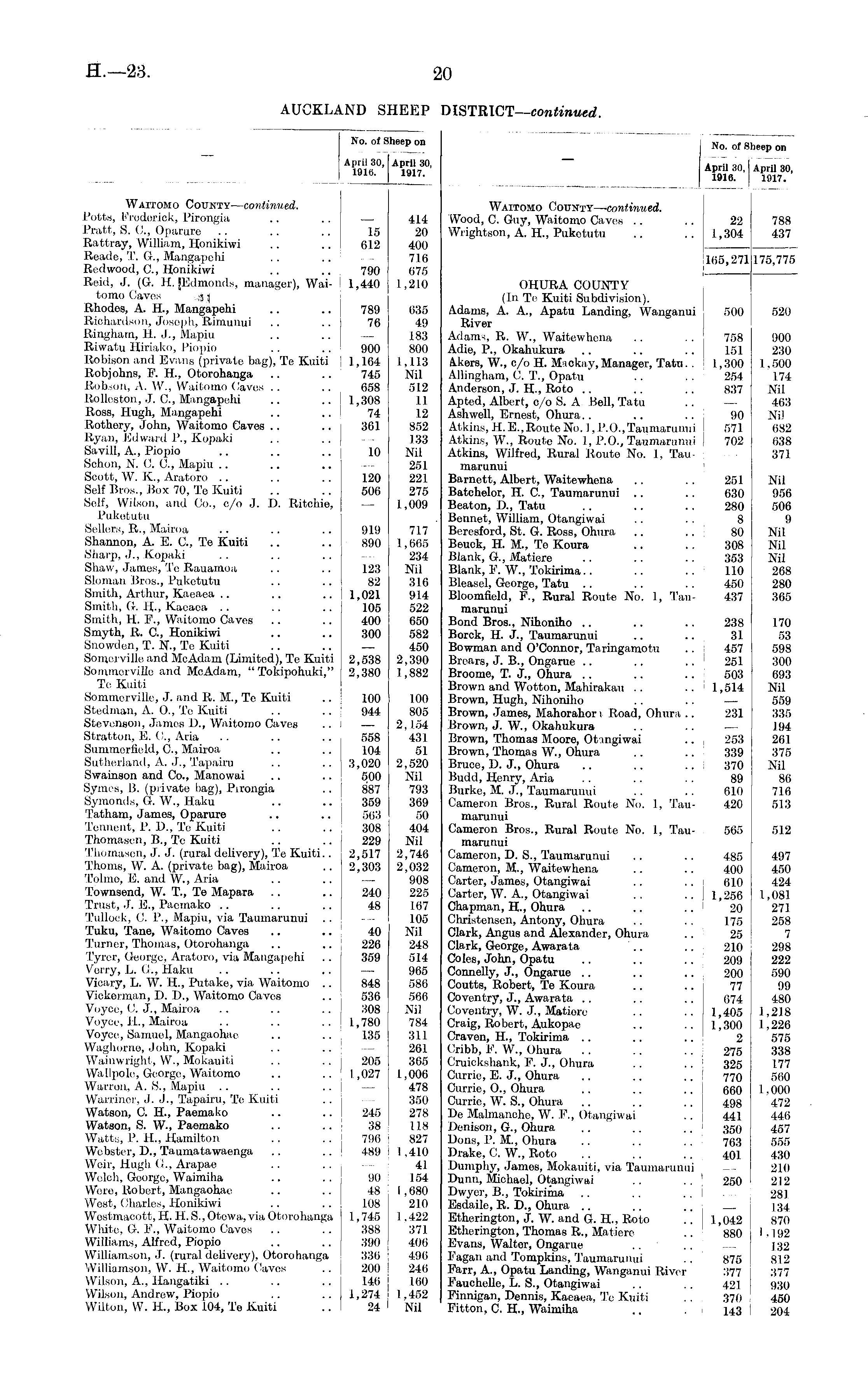 No. of SI April 30, 1916. Iheep on April 30, 1917. No. of Sheep on April 30,1 April 30, 1916. j 1917. Waitomo County— continued. Potts, Frederick, Pirongia .. .. — Pratt, S. C, Oparure .. .. .. 15 Rattray, William, Honikiwi .. .. 612 Reade, T. G, Mangapehi .. .. — Redwood, C, Honikiwi .. .. 790 Reid, J. (G. H. [Edmonds, manager), Wai- 1,440 tomo Caves . ..j j Rhodes, A. H., Mangapehi .. .. 789 Richardson, Joseph, Rimunui .. .. 76 Ringham, H. J., Mapiu .. .. — Riwatu Hiriako, Piopio .. .. 900 Robison and Evans (private bag), Te Kuiti I 1,164 Robjohns, F. H., Otorohanga .. .. 745 Robson, A. W., Waitomo Caves .. .. 658 Rolleston, J. G, Mangapehi .. .. 1,308 Ross, Hugh, Mangapehi .. .. 74 Rothery, John, Waitomo Caves .. .. 361 Ryan, Edward P., Kopaki .. .. — Savill, A., Piopio .. .. .. 10 Schon, N. C. G, Mapiu Scott, W. K, Aratoro .. .. .. 120 Self Bros., Box 70, Te Kuiti .. .. 506 Self, Wilson, and Co., c/o J. D. Ritchie, — Puketutu Sellers, R., Mairoa .. .. .. 919 Shannon, A. E. C, Te Kuiti .. .. 890 Sharp, J., Kopaki .. .. .. — Shaw, James, Te Rauamoa .. .. 123 Sloman Bros., Puketutu .. .. 82 Smith, Arthur, Kaeaea .. .. .. 1,021 Smith, G. H-, Kaeaea .. .. .. 105 Smith, H. F., Waitomo Caves .. .. 400 Smyth, It. C, Honikiwi .. .. 300 Snowdon, T. N., Te Kuiti .. .. — Somerville and McAdam (Limited), Te Kuiti 2,538 SommerviUe and McAdam, " Tokipohuki," 2,380 Te Kuiti SommerviUe, J. and R. M., Te Kuiti .. 100 Stedman, A. O., Te Kuiti .. .. 944 Stevenson, James D., Waitomo Caves ..I — Stratton, E. C, Aria .. .. .. 558 Summorfield, C, Mairoa .. .. 104 Sutherland, A. J., Tapairu .. .. 3,020 Swainson and Co., Manowai .. .. 500 Symes, B. (private bag), Pirongia .. 887 Symonds, G. W., Haku .. .. 359 Tatham, James, Oparure .. .. 563 Tenneiit, P. D., Te Kuiti .. .. 308 Thomasen, B., Te Kuiti .. .. 229 Thomasen, J. J. (rural delivery), To Kuiti.. 2,517 Thorns, W. A. (private bag), Mairoa .. 2,303 Tolmo, E. and W, Aria Townsend, W. T., Te Mapara .. .. 240 Trust, J. E., Paemako .. .. .. 48 Tullock, C. P., Mapiu, via Taumarunui Tuku, Tane, Waitomo Caves .. .. 40 Turner, Thomas, Otorohanga .. .. 226 Tyrer, George, Aratoro, via Mangapehi .. 359 Vorry, L. G., Haku .. .. .. — Vicary, L. W. H., Putake, via Waitomo .. 848 Vickerman, D. D., Waitomo Caves .. ' 536 Voycc, C. J., Mairoa .. .. .. 308 Voycc, IL, Mairoa .. .. .. 1,780 Voyce, Samuel, Mangaohae .. .. 135 Waghorne, John, Kopaki Wainwright, W., Mokauiti .. .. 205 Wallpole, George, Waitomo .. .. 1,027 Warren, A. S., Mapiu Warrinor, J. J., Tapairu, Tc Kuiti Watson, C. H, Paemako .. .. 245 Watson, S. W., Paemako .. .. 38 Watts, P. H, Hamilton .. .. 790 Webster, D., Taumatawaenga .. .. 489 Weir, Hugh G., Arapae Welch, George, Waimiha .. .. 90 Were, Robert, Mangaohae .. .. 48 West, Charles, Honikiwi .. .. 108 Wostmacott, IT. H. S., Otewa, via Otorohanga 1,745 White, G. F., Waitomo Caves .. .. 388 Williams, Alfred, Piopio .. .. 390 Williamson, J. (rural delivery), Otorohanga 330 Williamson, W. H., Waitomo Caves .. 200 Wilson, A., Hangatiki .. .. .. 146 Wilson, Andrew, Piopio .. .. 1,274 Wilton, W. H., Box 104, Te Kuiti .. 24 414 20 400 716 675 1,210 635 49 183 800 1,113 Nil 512 11 12 852 133 Nil 251 221 275 1,009 717 1,665 234 Nil 316 914 522 650 582 450 2,390 1,882 100 805 2,154 431 51 2,520 Nil 793 369 ,50 404 Nil 2,746 2,032 908 225 167 105 Nil 248 514 965 586 566 Nil 784 311 261 365 1,006 478 350 278 118 827 1,410 41 154 I , 080 210 1,422 371 406 496 246 160 1.452 Nil Waitomo County— continued. Wood, C. Guy, Waitomo Caves .. .. 22 788 Wrightson, A. H, Puketutu .. .. 1,304 437 105.271 175 775 105,271 175,770 OHURA COUNTY (In Te Kuiti Subdivision). Adams, A. A., Apatu Landing, Wanganui ' 500 520 River Adams, R. W., Waitewhena .. .. 758 900 Adie, P., Okahukura .. .. .. 151 230 kkers, W., c/o H. Mackay, Manager, Tatu. . 1,300 1. ,500 Allingham, 0. T., Opatu .. . . 254 174 Anderson, J. H, Roto .. .. .. 837 Nil Aptcd, Albert, c/o S. A Bell, Tatu .. — 463 Ashwell, Ernest, Ohura.. .. .. j 90 Nil Atkins, H.E., Route No. I, P.O., Taumarunui I 571 682 Atkins, W., Route No. 1, P.O., Taumarunui | 702 638 Atkins, Wilfred, Rural Route No. 1, Tau- | 371 marunui Barnett, Albert, Waitewhena .. .. 251 Nil Batohelor, H. G, Taumarunui .. .. 630 956 Beaton, D., Tatu .. .. .. 280 506 Bonnet, William, Otangiwai .. ... 8 9 Beresford, St. G. Ross, Ohura .. ,. 80 Nil Beuck, H. M., Te Koura .. .. 308 Nil Blank, G., Matiere .. .. .. 353 Nil Blank, F. W., Tokirima.. .. .. 110 268 Bleasel, George, Tatu .. .. .. 450 280 Bloomfield, F., Rural Route No. 1, Tan- 437 365 marunui Bond Bros., Nihoniho .. .. .. 238 170 Borck, H. J., Taumarunui .. .. 31 53 Bowman and O'Connor, Taringamotu .. j 457 598 Brcars, J. B., Ongarue .. .. .. : 251 300 Broome, T. J., Ohura .. .. .. 503 693 Brown and Wotton, Mahirakau .. .. 1,514 Nil Brown, Hugh, Nihoniho .. .. — 559 Brown, James, Mahorahor i Road, Ohura .. 231 335 Brown, J. W., Okahukura .. .. — 194 Brown, Thomas Moore, Otangiwai .. , 253 261 Brown, Thomas W., Ohura .. .. I 339 375 Bruce, D. J., Ohura .. .. .. ! 370 Nil Budd, Henry, Aria .. .. .. ! 89 86 Burke, M. J., Taumarunui .. .. 610 716 Cameron Bros., Rural Route No. 1, Tau- 420 513 marunui Cameron Bros., Rural Route No. 1, Tau- 565 512 marunui Cameron, D. S., Taumarunui .. .. 485 497 Cameron, M., Waitewhena .. .. 400 450 Carter, James, Otangiwai .. .. ■ 610 424 Carter, W. A., Otangiwai .. .. ! 1,256 1,081 Chapman, H., Ohura .. .. .. 20 271 Christensen, Antony, Ohura .. .. 175 258 Clark, Angus and Alexander, Ohura .. 25 7 Clark, George, Awarata '.. .. 210 298 Coles, John, Opatu .. .. .. 209 222 Connelly, J., Ongarue .. .. .. 200 590 Coutts, Robert, Te Koura .. .. 77 99 Coventry, J., Awarata .. .. .. 674 480 Coventry, W. J., Matiore .. .. 1,405 1,218 Craig, Robert, Aukopae .. .. 1,300 1,226 Craven, H., Tokirima .. .. .. 2 575 Cribb, F. W., Ohura .. .. .. j 275 338 Cruickshank, F. J., Ohura .. .. 325 177 Curric, E. J., Ohura .. .. .. ; 770 560 Currie, O., Ohura .. .. .. 66