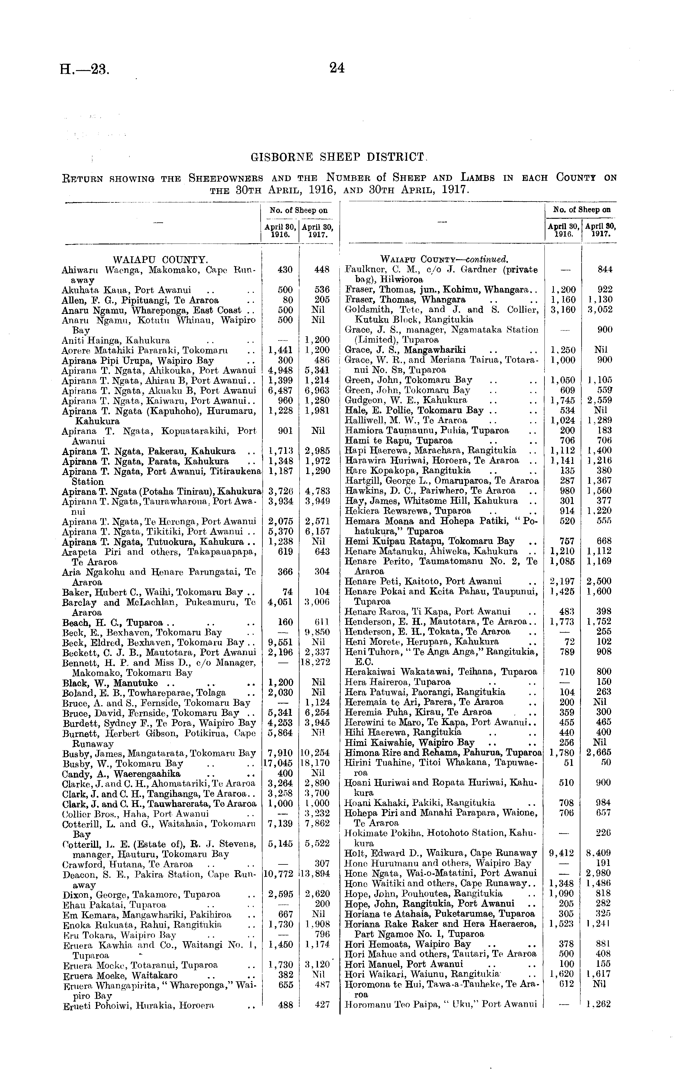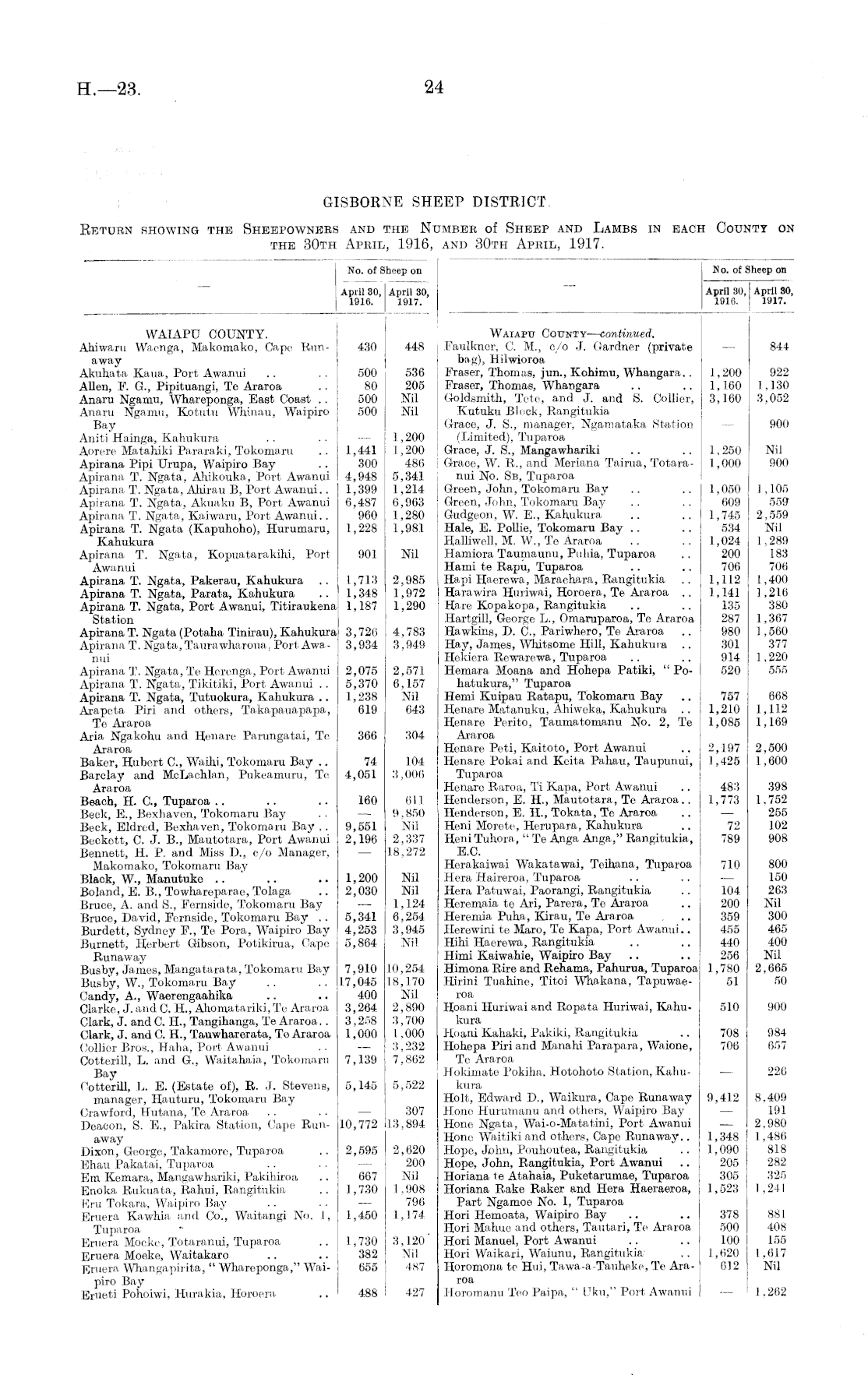 GISBORNE SHEEP DISTRICT. Return showing the Sheepowners and the Number of Sheep and Lambs in each County on the 30th April, 1916, and 30th April, 1917.