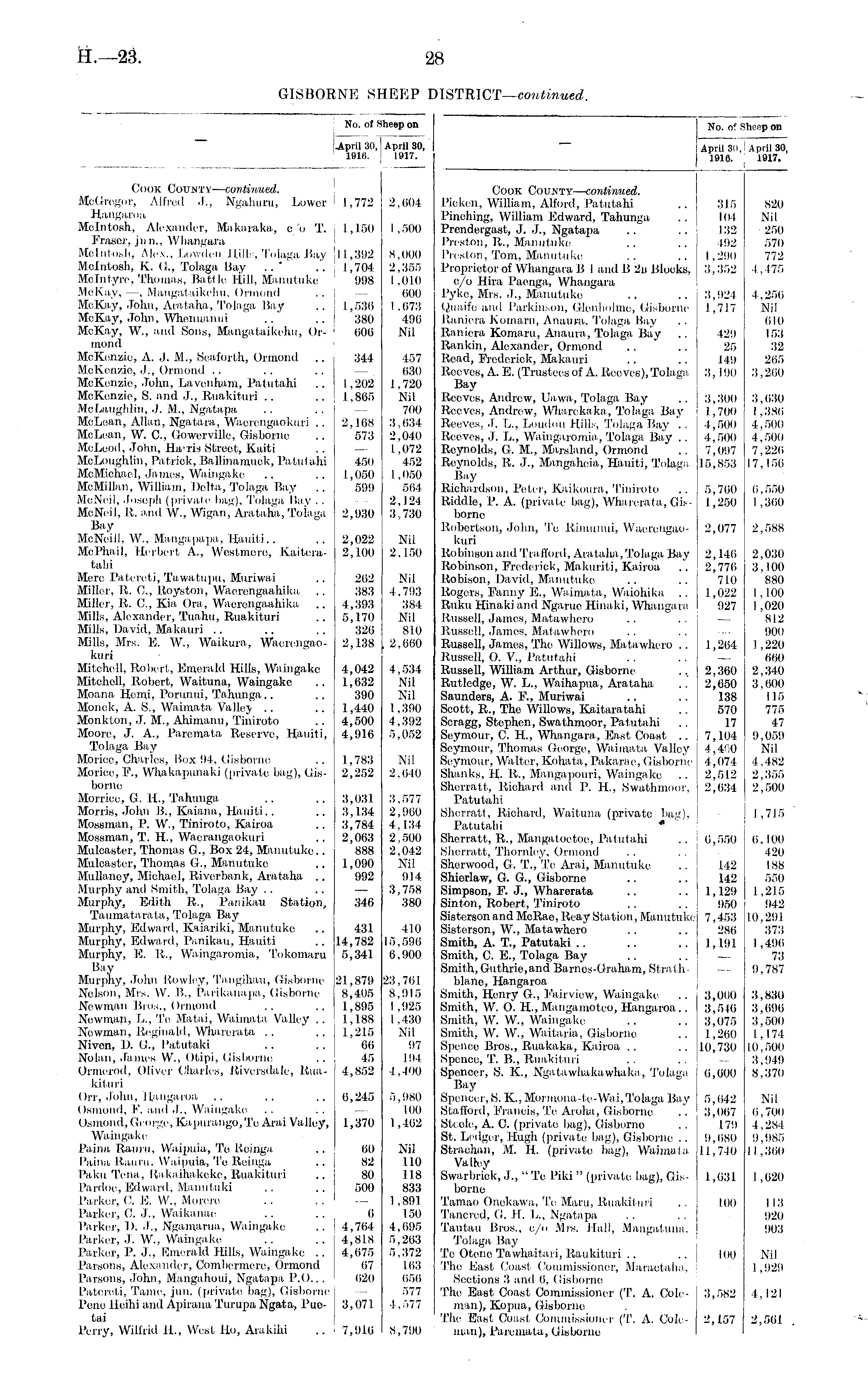 No. of S iheep on I April 30, 1 1917. No. of f iheep on I.April 30, 1916. April 30, 1916. April 30, 1917. Cook County— continued. McGregor, Alfred J., Ngalniru, Lower I 1,772 Hangaroa, Mcintosh, Alexander, Ma karaka, c/o T. 1,150 Fraser, jun., Whangara Mcintosh, Alex., Lowden Hills, Tolaga Bay 11,392 Mcintosh, K. G., Tolaga Bay .. ' .'. 1,704 Mclntyro, Thomas, Battle, Hill, Manutuke 998 McKay,—, Maugataikchu, Ormond McKay, John, Arataha, Tolaga Bay .. 1,536 McKay, John, Whenuanui .. .. 380 McKay, W., and Sons, Maugataikchu, Or- 006 miind McKenzie, A. J. M., Seaforth, Ormond .. 344 McKenzio, .1., Ormond .. McKenzie, John, Lavciiham, Patutahi .. 1,202 McKenzie, S. and J., Ruakituri .. .. \ 1,865 McLaughlin, J. M., Ngatapa .. .. — McLean, Allan, Ngatara, Waerengaokuri .. 2,168 McLean, W. C, Gowerville, Gisborne .. 573 McLeod, John, Ha-ris Street, Kaiti .. — McLoughlin, Patrick, Ballinamuck, Patutahi 450 McMichael, James, Waingake .. .. 1,050 McMillan, William, Delta, Tolaga Bay .. 599 McNeil, Joseph (private bag), 'Tolaga Bay . . McNeil, It. and W., Wigan, Arataha, Tolaga 2,930 Bay McNeill, W., Mangapapa, Hauiti.. .. 2,022 McPhail, Herbert A., Westmere, Kaitora- 2,100 tahi Mere Patercti, Tawatupu, Muriwai .. 202 Miller, It. C, Royston, Waerengaahika .. 383 Miller, It. G, Kia Ora, Waerengaahika .. 4,393 Mills, Alexander, Tuahu, Ruakituri .. 5,170 Mills, David, Makauri .. .. .. 320 Mills, Mrs. E. W., Waikura, Waerengao- 2,138 kuri Mitchell, Robert, Emerald Hills, Waingake 4,042 Mitchell, Robort, Waituna, Waingake .. 1,632 Moana Hemi, Porunui, Tahunga.. .. 390 Monck, A. S., Waimata Valley .. .. 1,440 Monkton, J. M., Ahimanu, Tiniroto .. 4,500 Moore, J. A., Paremata Reserve, Hauiti, 4,916 Tolaga Bay Morice, Charles, Box 9-1. Gisborne, .. 1,783 Morice, P., Whakapunaki (private bag), Gis- 2,252 borne Morricc, G. H., Tahunga ,. .. 3,031 Morris, John B., Kaiana, Hauiti.. .. 3,134 Mossman, P. W., Tiniroto, Kairoa .. 3,784 Mossman, T. H., Waerangaokuri .. 2,063 Mulcaster, Thomas G., Box 24, Manutuke.. 888 Mulcaster, Thomas G., Manutuke .. 1,090 Mullaney, Michael, Rivcrbank, Arataha .. 992 Murphy and Smith, Tolaga Bay Murphy, Edith R., Panikau Station, 340 Taumatarata, Tolaga Bay Murphy, Edward, Kaiariki, Manutuke .. 431 Murphy, Edward, Panikau, Hauiti .. 14,782 Murphy, E. It., Waingaromia, 'Tokomaru 5,341 Bay Murphy, John Rowley, Taugihau, Gisborne 21,879 Nelson, Mrs. W. B., Pprikanapa, Gisborne 8,405 Newman Bros., Ormond .. .. 1,895 Newman, L., 'Te Matai, Waimata Valley .. 1,188 Newman, Reginald, Wharerata .. .. 1,215 Niven, D. G., Patutaki .. .. 66 Nolan, James W., Otipi, Gisborne .. 45 Ormerod, Oliver Charles, Riversdale, Rua- 4,852 kituri Orr, .Tohn, Hangaroa .. .. .. 6,245 Osmond, F. and J., Waingake Osmond, George, Kapurango.Tc Arai Valley, 1,370 Waingake Paina Rauru, Waipuia, To Reinga .. 00 Paina Rauru. Waipuia,'Te Reinga .. 82 Paku Tcna, Rakaihakeke, Ruakituri .. 80 Pardoe, Fdward, Manutuki .. .. 500 Parker, 0. E. W„ Morere Parker, C. J., Waikanae .. .. 0 Parker, I). J., Xganviriia, Waingake .. 4,764 Parker, J. W., Waingake .. .. 4,818 Parker, P. J., Emerald Hills, Waingake .. 4,675 Parsons, Alexander, Combermcre, Ormond 07 Parsons, John, Mangahoui, Ngatapa P.O.. . 620 I 'nt ii- I i. Tame. jun. (private bag), < lisborne Pone Heihi and Apirana Turupa Ngata, Puo- 3,071 tai 2,004 I , 500 8,000 2,355 I ,010 000 1,073 496 Nil 457 030 1,720 Nil 700 3,034 2,040 1,072 452 1,060 504 2,124 3,730 Nil 2,150 Nil 1.793 381 Nil 810 , 2.660 4,534 Nil Nil 1.390 4,392 5,0,52 Nil 2,040 Cook County— continued. Picken, William, Alford, Patutahi Pinching, William Fdward, Tahunga Prendergast, J. J., Ngatapa Preston, It., Manutuke Preston, Tom, Manutuke Proprietor of Whangara B I and B 2n Blocks, c/o Hira Paenga, Whangara I'yke, Mrs. J., Manutuke Quaife and Parkinson, Glenhohne, Gisborne Raniera Komaru, Anaura, 'Tolaga Bay Raniera Komaru, Anaura, Tolaga Bay Rankin, Alexander, Ormond Read, Frederick, Makauri Reeves, A. E. (Trustees of A. Reeves), Tolaga Bay Reeves, Andrew, Uawa, Tolaga Bay Reeves, Andrew, Whurckaka, 'Tolaga Bay Reeves, .T. L., Loudon Hill;-, Tolaga Bay . . Reeves, J. L., Waingaromia, 'Tolaga Bay .. Reynolds, G. M., Marslaud, Ormond Reynolds, R. J., Mangaheia, Hauiti, Tolaga Bay Richardson, Peter, Kaikoura, Tiniroto Riddle, P. A. (private bag), Wharerata, Gisborne Robertson, John, 'Te Rinmnui, Waerengaokuri Robinson and Tra fiord, Arataha, Tolaga Bay Robinson, Frederick, Makuriti, Kairoa Robison, David, Manutuke Rogers, Fanny E., Waimata, Waiohika .. Ituku Hinaki and Ngaruc Hinaki, Whangara Russell, Jamos, Matawhero Russell, James, Matawhero Russell, James, 'The Willows, Matawhero .. Russell, 0. V., Patutahi Russell, William Arthur, Gisborne Rutlcdgc, W. L., Waihapua, Arataha Saunders, A. F., Muriwai Scott, R., The Willows, Kaitaratahi Scragg, Stephen, Swathmoor, Patutahi Seymour, C. H., Whangara, East Coast .. Seymour, Thomas George, Waimata Valley Seymour, Walter, Kohata, Pakarae, Gisborne Shanks, H. It., Mangapoiiri, Waingake Sherratt, Richard and P. H., Swathmoor, Patutahi Sherratt, Richard, Waituna (private bat;). Patutahi Sherratt, R., Mangatoetoe, Patutahi Sherratt, Thornley, Ormond Sherwood, G. T.,Tc Arai, Manutuke Shierlaw, G. G., Gisborne Simpson, F. J., Wharerata Sinton, Robert, 'Tiniroto Sisterson and Mcltao, Reay Station, Manutuki; Sisterson, W., Matawhero Smith, A. T., Patutaki Smith, C. E., Tolaga Bay Smith, Guthrie,and Barnes-Graham, Strathblane, Hangaroa Smith, Henry (!., Fairview, Waingake Smith, W. O. H., Mangamotco, Hangaroa .. Smith, W. W., Waingake Smith, W. W., Waitaria, Gisborne Spence Bros., Ruakaka, Kairoa Spence, T. B., Ruakituri Spencer, S. K., Ngatawhakawhaka, 'Tolaga Bay Spencer, S. K.,Mormona-te-Wai,Tolaga Bay Stafford, Francis, Te Aroha, Gisborne Steele, A. 0. (private bag), Gisborno St. Ledger, Hugh (private bag), Gisborne . . Strachan, M. IT. (private bag), Waimata Valh;y Swarbriok,,)., " Te Piki " (private bag), Gisborne Tamao Opekawa, 'To Maru, Ruakitur