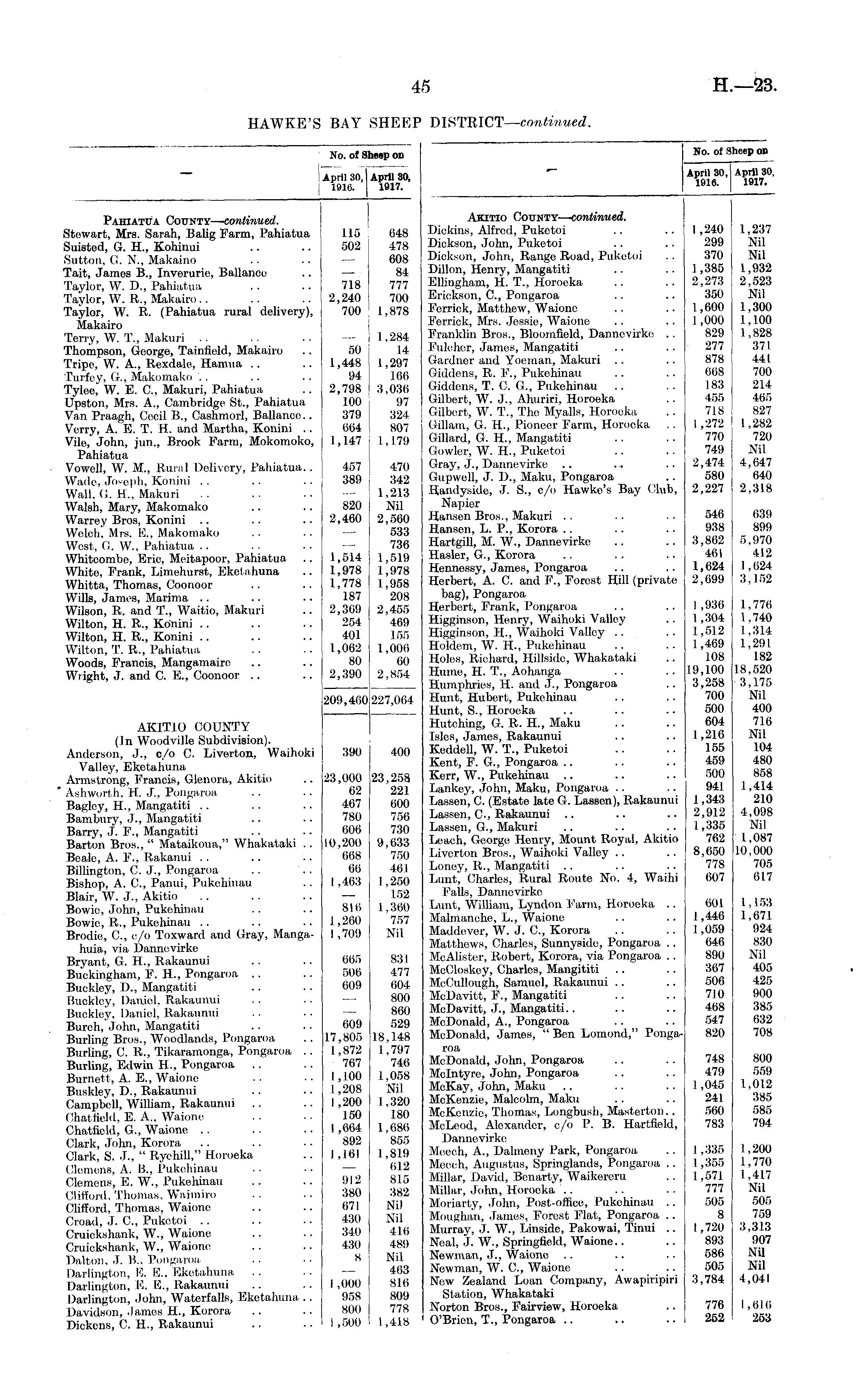 No. of Sheep on April 30,1 April 30, j 1916. 1917. No. of Sheep on April 30, April 30, 1916. 1917. Pahiatua County— continued. Stewart, Mrs. Sarah, BaUg Farm, Pahiatua Suisted, G. H., Kohinui .Sutton, G. N., Makaino Tait, James B., Inverurie, Ballanee Taylor, W. D., Pahiatua Taylor, W. R., Makairo Taylor, W. R. (Pahiatua rural delivery), Makairo Terry, W. T., Makuri Thompson, George, Tainfield, Makairo Tripe, W. A., Rexdale, Hamua Turfey, G, Makomako Tylee, W. E. G, Makuri, Pahiatua Upston, Mrs. A., Cambridge St., Pahiatua Van Praagh, Cocil B., Cashmorl, Ballanee.. Verry, A. E. T. H. and Martha, Konini .. Vile, John, jun., Brook Farm, Mokomoko, Pahiatua Vowell, W. M., Rural Delivery, Pahiatua.. Wade, Joseph, Konini Wall, G. H., Makuri Walsh, Mary, Makomako Warrey Bros, Konini Welch', Mrs. E., Makomako West, G. W., Pahiatua Whitcombe, Eric, Meitapoor, Pahiatua White, Frank, Limehurst, Eketahuna Whitta, Thomas, Coonoor Wills, James, Marima Wilson, R. and T., Waitio, Makuri Wilton, H. R., Konini Wilton, H. R., Konini Wilton, T. It., Pahiatua Woods, Francis, Mangamaire Wright, J. and G E., Coonoor AKITIO COUNTY (In Woodville Subdivision). Anderson, J., o/o C. Liverton, Waihoki Valloy, Eketahuna Armstrong, Francis, Glenora, Akitio Ashworth. H. J., Pongaroa. Bagley, H., Mangatiti Bam bury, J., Mangatiti Barry, J. F., Mangatiti Barton Bros., " Mataikoua," Whakataki .. Beale, A. P., Rakanui BilUngton, C. J., Pongaroa Bishop, A. C, Panui, Pukehinau Blair, W. J., Akitio Bowie, John, Pukehinau Bowie, R., Pukehinau Brodie, C, c/o Toxward and Gray, Mangahuia, via Dannevirke Bryant, G. H., Rakaunui Buckingham, F. H., Pongaroa Buckloy, D., Mangatiti Buckley, Daniel. Rakaunui Buckley, Daniel, Rakaunui Burch, John, Mangatiti Burling Bros., Woodlands, Pongaroa Burling, C. R., Tikaramonga, Pongaroa .. Burling, Edwin H., Pongaroa Burnett, A. E., Waione Buskley, D., Rakaunui Campbell, William, Rakaunui Ohatfield, E. A.. Waione Chatfiold, G., Waione Clark, John, Korora Clark, S. J., " Ryehill," Horoeka Clemens, A. B., Pukehinau Clemens, E. W., Pukehinau Clifford, Thomas. Waimiro Clifford, Thomas, Waione Croad, J. C, Puketoi Cruickshank, W., Waione Cruickshank, W., Waione Dalton, J. B., Pongaroa. Darlington, E. E., Eketahuna Darlington, E. E., Rakaunui Darlington, John, Waterfalls, Eketahuna, .. Davidson, .lames H., Korora Dickens, C. H., Rakaunui 209,400 390 23,000 62 467 780 606 10,200 668 60 1,463 115 502 718 2,240 700 50 1,448 94 2,798 100 379 664 1,147 457 389 820 2,460 1,514 1,978 1,778 187 2,309 254 401 1,062 80 2,390 227,064 400 23,258 221 600 756 730 9,033 750 461 1,250 152 1,360 7,57 Nil 648 478 608 84 777 700 1,878 1,284 1.4 1,297 166 3,030 97 324 807 1,179 470 342 1,213 Nil 2,500 533 736 1,519 1,978 1,958 208 2,455 469 155 1,006 60 2,854 Akitio County— -continued. Dickins, Alfred, Puketoi Dickson, John, Pukotoi Dickson, John, Range Road, Puketoi Dillon, Henry, Mangatiti Ellingham, H. T., Horoeka Eriokson, G, Pongaroa Ferrick, Matthew, Waione Ferrick, Mrs. Jessie, Waione FrankUn Bros., Bloomfield, Dannevirke .. Fulchcr, James, Mangatiti Gardner and Yoeman, Makuri Giddens, R. P., Pukehinau Giddens, T. C. G., Pukehinau Gilbert, W. J., Ahuriri, Horoeka Gilbert, W. T., The Myalls, Horoeka Gillam, G. H., Pioneer Farm, Horoeka Gillard, G. H., Mangatiti Gowler, W. H., Puketoi Gray, J., Dannevirke Gupwell, J. I)., Maku, Pongaroa Haiidyside, .T. S., c/o Hawke's Bay Club, Napier Hansen Bros., Makuri Hansen, L. P., Korora Hartgill, M. W., Dannevirke Hasler, G., Korora Hennessy, James, Pongaroa Herbert, A. C. and P., Forest Hill (private bag), Pongaroa Herbert, Frank, Pongaroa Higginson, Henry, Waihoki Valley Higginson, H., Waihoki Valley Holdem, W. H., Pukehinau Holes, Richard, Hillside, Whakataki Hume, H. T., Aohanga Humphries, H. and J., Pongaroa Hunt, Hubert, Pukehinau Hunt, S., Horoeka Hutching, G. R. H., Maku Isles, James, Rakaunui Keddell, W. T., Puketoi Kent, F. G., Pongaroa Kerr, W., Pukehinau Lankey, .Tohn, Maku, Pongaroa Lassen, C. (Estate late G. Lassen), Rakaunui Lassen, C, Rakaunui Lassen, G., Makuri Leach, George Henry, Mount Royal, Akitio Liverton Bros., Waihoki Valley Loney, R., Mangatiti Lunt, Charles, Rural Route No. 4, Waihi Falls, Dannevirke Lunt, William, Lyndon Farm, Horoeka .. Malmanche, L., Waione Maddever, W. J. C, Korora Matthews, Charles, Sunnysidc, Pongaroa .. McAlister, Robert, Korora, via Pongaroa .. McCloskey, Charles, Mangititi McCullough, Samuel, Rakaunui .. McDavitt, P., Mangatiti McDavitt, ,L, Mangatiti.. McDonald, A., Pongaroa McDonald, James, " Ben Lomond," Pongaroa McDonald, John, Pongaroa Mdntyre, John, Pongaroa McKay, John, Maku McKenzie, Malcolm, Maku McKenzie, Thomas, Longbush, Masterton.. McLeod, Alexander, c/o P. B. Hartfleld, Dannevirke Mcech, A., Dalmeny Park, Pongaroa Mceoh, Augustus, Springlands, Pongaroa .. Millar, David, Bonarty, Waikereru Millar, John, Horoeka .. Moriarty, .lohn, Post-office, Pukehinau .. Moughan, James, Forest Flat, Pongaroa .. Murray, J. W., Linside, Pakowai, Tinui .. Neal, J. W., Springfield, Waione.. Newman, J., Waione Newman, W. G, Waione New Zealand Loan Company, Awapiripiri Station, Whakataki Norton Bros., Fairview, Horoeka O'Brien, T., Pongaroa 1,240 299 370 1,385 2,273 350 1,600 1,000 829 277 878 668 183 455 718 I ,272 770 749 2,474 580 2,227 546 938 3,862 461 1,624 2,699 I ,936 1,304 1,512 1,409 108 19,100 3,258 700 500 604 1,216 155 459 500 941 1 ,343 2,912 1,335 762 8,650 778 607 1,237 Nil Nil 1,932 2,523 Nil 1,300 1,100 1,828 371 441 700 214 465 827 1,282 720 Nil 4,647 640 2,318 639 899 5,970 412 1,624 3,152 1,776 1,740 1,314 1,291 182 18,520 3,175 Nil 400 716 Nil 104 480 858 1,414 210 4.098 Nil 1,087 10,000 705 617 816 1 ,260 1,709 665 506 609 831 477 604 800 860 529 18,148 1,797 746 1,058 Nil 1,320 180 1,080 855 1,819 612 815 382 Nil Nil 416 489 Nil 463 816 809 778 1,418 601 1,446 1,059 646 890 367 506 710 468 547 820 1,153 1,671 924 830 Nil 405 425 900 385 632 708 609 17,805 1,872 767 1,100 1,208 1,200 150 1,664 892 1,161 7