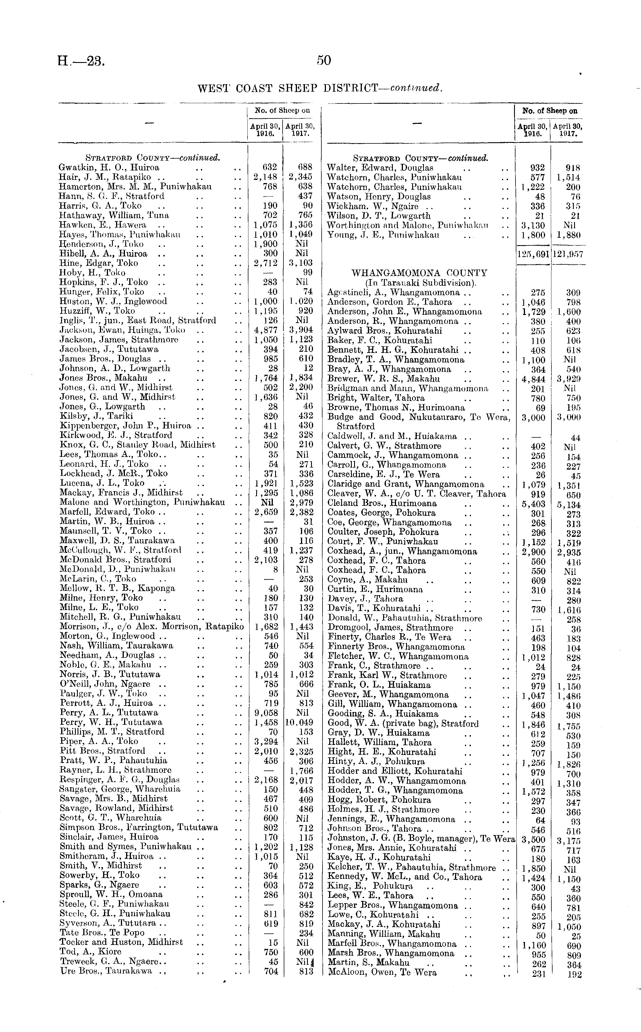 April 30, April 30, 1916. 1917. No. of Sheep on No. of Sheep on April 30, | April 30, 1916. 1917. Stratford County— continued. Gwatkin, H. 0., Huiroa Hair, J. M., Ratapiko Hamcrton, Mrs. M. M., Puniwhakau Hann, S. G. F., Stratford Harris, G. A., Toko Hathaway, William, Tuna Hawken, E., Hawera Hayes, Thomas, Puniwhakau Henderson, J., Toko HibeU, A. A., Huiroa Hine, Edgar, Toko Hoby, H., Toko Hopkins, F. J., Toko Hunger, Felix, 'Toko Huston, W. J., Inglewood Huzziff, W., Toko Inglis, T\, jun., East Road, Stratford Jackson, Ewan, Huinga, Toko Jackson, James, Strathmore Jacobsen, J,, Tututawa James Bros., Douglas Johnson, A. D., Lowgarth Jones Bros., Makahu Jones, G. and W., Midhirst Jones, G. and W., Midhirst Jones, G., Lowgarth Kilsby, J., Tariki Kippenborger, <Tohn P., Huiroa Kirkwood, E. J., Stratford Knox, G. G, Stanley Road, Midhirst Lees, Thomas A., Toko.. Leonard, H. J., Toko Lockhcad, J. Melt., Toko Luecna, J. L., Toko Mackay, Francis J., Midhirst .. .. . Malone and Worthington, Puniwhakau Marfell, Edward, Toko Martin, W. B., Huiroa Maunsell, T. V., Toko .. Maxwell, D. S., Taurakawa McCullough, W. F„ Stratford McDonald Bros., Stratford McDonald, D., Puniwhakau McLarin, G, Toko Mellow, R. T. B., Kaponga Milne, Henry, Toko Milne, L. E., Toko Mitchell, R. G., Puniwhakau Morrison, J., c/o Alex. Morrison, Ratapiko Morton, G., Inglewood Nash, William, Taurakawa Needham, A., Douglas Noble, G. E., Makahu .. Norris, J. B., Tututawa O'Neill, John, Ngaere Paulgor, J. W., Toko Perrott, A. J., Huiroa Perry, A. L., Tututawa Perry, W. H., Tututawa Phillips, M. T., Stratford Piper, A. A., Toko Pitt Bros., Stratford Pratt, W. P., Pahautuhia Raynor, L. H., Strathmoro Respinger, A. F. G., Douglas Sangster, Goorgo, Wharehuia Savage, Mrs. B., Midhirst Savage, Rowland, Midhirst Scott, G. T., Wharehuia Simpson Bros., Farrington, Tututawa Sinclair, James, Huiroa Smith and Symes, Puniwhakau Smithcram, J., Huiroa Smith, V., Midhirst Sowerby, H., Toko Sparks, G., Ngaere Sproull, W. H., Omoana Steele, G. F., Puniwhakau Steele, G. H., Puniwhakau Syverson, A., Tututara Tate Bros., Te Popo Tocker and Huston, Midhirst Tod, A., Kiore Treweek, G. A., Ngaere.. Ure Bros., Taurakawa ., ,. 632 2,148 768 190 702 1,075 1,010 1 ,900 300 2,712 283 40 1,000 1 ,195 126 4,877 I ,050 394 985 28 1,764 502 1,030 28 820 411 342 500 35 54 371 1,921 1,295 NU 2,0.59 357 400 419 2,103 8 088 2,345 638 437 90 765 1,356 1,049 Nil Nil 3,103 99 Nil 74 1,020 920 Nil 3,904 1,123 210 610 12 1,834 2,200 Nil 40 432 430 328 21.0 Nil 271 336 1,523 1,080 2,979 2,382 31 106 116 1,237 278 Nil 253 30 130 132 140 1,443 Nil 554 34 303 1,012 666 Nil 813 Nil 10,049 153 Nil 2,325 306 1,766 2,017 448 409 486 Nil 712 115 1,128 Nil 250 512 572 301 842 682 819 234 Nil 000 Nil-j 813 Stratford County— continued. Walter, Edward, Douglas Watchorn, Charles, Puniwhakau Watchorn, Charles, Puniwhakau Watson, Henry, Douglas Wickham. W., Ngaire Wilson, D. T., Lowgarth Worthington and Malone, Puniwhakau Young, J. E., Puniwhakau WHANGAMOMONA COUNTY (In Taranaki Subdivision). Agestinoli, A., Whangamomona Anderson, Gordon E., Tahora Anderson, John E., Whangamomona Anderson, It., Whangamomona Aylward Bros., Kohuratahi Baker, F. C, Kohuratahi Bennett, H. H. G., Kohuratahi Bradley, T. A., Whangamomona Bray, A. J., Whangamomona Brewer, W. R. S., Makahu Bridgman and Mann, Whangamomona Bright, Walter, Tahora Browne, Thomas N., Hurimoana Budge and Good, Nukutauraro, To Wera, Stratford Caldwell, J. and M., Huiakama Calvert, G. W., Strathmore Cammock, J., Whangamomona Carroll, G., Whangamomona Carscldine, E. J., Te Wera Claridge and Grant, Whangamomona Cleaver, W. A., c/o U. T. Cleaver, Tahora Cleland Bros., Hurimoana Coates, George, Pohokura Coe, George, Whangamomona Coulter, Joseph, Pohokura Court, F. W., Puniwhakau Coxhead, A., jun., Whangamomona Coxhead, F. G, Tahora Coxhead, F. C, Tahora Coyne, A., Makahu Curtin, E., Hurimoana Davey, J., Tahora Davis, T., Kohuratahi Donald, W., Pahautuhia, Strathmore Dromgool, James, Strathmore Finerty, Charles R., Te Wera Finnerty Bros., Whangamomona Fletcher, W. G, Whangamomona Frank, G, Strathmore Frank, Karl W., Strathmore Frank, O. L., Huiakama Geever, M., Whangamomona Gill, WilUam, Whangamomona Gooding, S. A., Huiakama Good, W. A. (private bag), Stratford Gray, D. W., Huiakama Hallett, William, Tahora Hight, H. E., Kohuratahi Hinty, A. J., Pohukura Hodder and Elliott, Kohuratahi Hodder, A. W., Whangamomona Hodder, T. G., Whangamomona Hogg, Robert, Pohokura Holmes, H. J., Strathmore Jennings, E., Whangamomona Johnson Bros., 'Tahora Johnston, J. G. (B. Boyle, manager), Te Wera Jones, Mrs. Annie, Kohuratahi Kayo, H. J., Kohuratahi Kelcher, T. W., Pahautuhia, Strathmore .. Kennedy, W. McL., and Co., Tahora King, E., Pohukura Lees, W. E., Tahora Lepper Bros., Whangamomona Lowe, G, Kohuratahi Mackay, J. A., Kohuratahi Manning, William, Makahu Marfell Bros., Whangamomona Marsh Bros., Whangamomona .. Martin, S., Makahu McAloon, Owen, Te Wera 125,691 932 577 I ,222 48 336 21 3,130 1,800 275 I ,046 1,729 380 255 no 408 1,100 364 4,844 201 780 69 3,000 402 256 236 26 I ,079 919 5,403 301 268 296 1 ,152 2,900 560 550 609 310 121,957 918 1,514 200 70 315 21 Nil 1,880 309 798 1,000 400 623 100 018 Nil 540 3,929 Nil 7.50 195 3,000 44 Nil 154 227 45 1,361 650 5,1.34 273 313 322 1,519 2,935 410 Nil 822 314 280 1,010 258 30 183 104 828 24 225 1,150 1,480 410 308 1,755 530 159 150 1,820 700 1,310 358 347 366 93 510 3,1.75 717 163 Nil 1,150 43 360 781 205 1,050 25 690 809 364 192 40 180 157 310 1,082 546 740 50 259 1 ,014 785 95 719 9,058 I ,458 70 3,294 2,010 456 730 151 463 198 1 ,012 24 279 979 I ,047 460 548 I ,840 012 259 707 1,256 979 401 1,572 297 230 64 546 3,500 675 180 I ,850 1,424 300 550 640 255 897 50 1,160 955 262 231 2,168 150 467 510 600 802 170 1,202 1,015 70 364 603 286 811 619 15 750 45 704