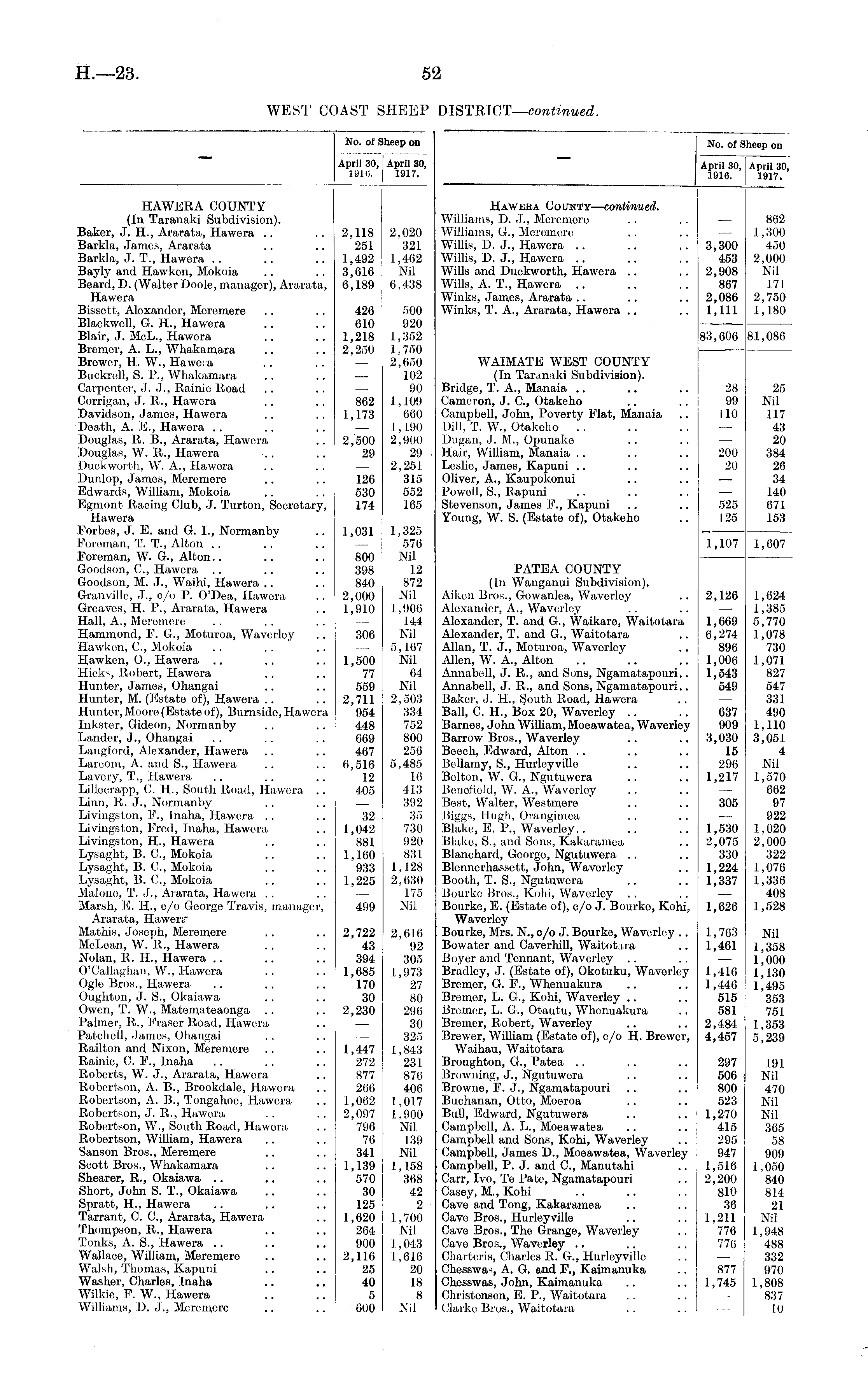 No. of Sheep on April 30, | April 30, 1916. 1917. No. of Sheep on April 30, April 30, 1916. 1917. HAWERA COUNTY (In Taranaki Subdivision). Baker, J. H., Ararata, Hawera Barkla, James, Ararata Barkla, J. T., Hawera Bayly and Hawken, Mokoia Beard, D. (Walter Doole,manager), Ararata, Hawera Bissett, Alexander, Meremere Blackwell, G. H-, Hawera Blair, J. McL., Hawera Bremer, A. L., Whakamara Brewer, H. W., Hawera Buckrell, S. P., Whakamara Carpenter, J. J., Rainio Road Corrigan, J. R., Hawora Davidson, James, Hawera Death, A. E., Hawera Douglas, R. B., Ararata, Hawera Douglas, W. R., Hawera Duckworth, W. A., Hawora Dunlop, Jamos, Meremero Edwards, William, Mokoia Egmont Racing Club, J. Turton, Secretary, Hawera Forbes, J. E. and G. I., Normanby Foreman, T. T., Alton Foreman, W. G., Alton.. Goodson, C, Hawera Goodson, M. J., Waihi, Hawera Granville, J., c/o P. O'Dea, Hawora Greaves, H. P., Ararata, Hawera Hall, A., Meremere Hammond, F. G., Moturoa, Waverley Hawken, C, Mokoia Hawken, O., Hawera Hicks, Robert, Hawera Hunter, James, Ohangai Hunter, M. (Estate of), Hawera Hunter, Moore (Estate of), Burnside, Hawora Inkster, Gideon, Normanby Lander, J., Ohangai Langford, Alexander, Hawera Larcom, A. and S., Hawera Lavery, T., Hawera Lilloorapp, C. H-, South Road, Hawera .. Linn, R. J., Normanby Livingston, P., Inaha, Hawera Livingston, Fred, Inaha, Hawera Livingston, IL, Hawera Lysaght, B. C, Mokoia Lysaght, B. C, Mokoia Lysaght, B. G, Mokoia Malone, T. J., Ararata, Hawera Marsh, E. H., o/o Georgo Travis, manager, Ararata, Hawerir Mathis, Josoph, Meremere McLean, W. It., Hawera Nolan, R. H., Hawera O'Callaghan, W., Hawera Oglo Bros., Hawera Oughton, J. S., Okaiawa Owen, T. W., Matemateaonga .. Palmer, R., Fraser Road, Hawera Patehcll, James, Ohangai Railton and Nixon, Meremere Rainie, C. F., Inaha Roberts, W. J., Ararata, Hawera Robertson, A. B., Brookdale, Hawera Robertson, A. B., Tongahoe, Hawera Robertson, J. It., Hawera Robertson, W., South Road, Hawera Robertson, WiUiam, Hawera Sanson Bros., Meremere Scott Bros., Whakamara Shearer, R., Okaiawa Short, John S. T., Okaiawa Spratt, H., Hawera Tarrant, C. C, Ararata, Hawera Thompson, R., Hawera Tonks, A. S., Hawera WaUace, William, Meremero Walsh, Thomas, Kapuni Washer, Charles, Inaha Wilkie, F. W., Hawera Williams, D. J., Meremere 2,118 251 1,492 3,616 6,189 2,020 321 1,402 Nil 6,438 Hawera County— continued. Williams, D. J., Meremere Williams, G., Meremero Willis, D. J., Hawera Willis, D. J., Hawera Wills and Duckworth, Hawera Wills, A. T., Hawera Winks, James, Ararata Winks, T. A., Ararata, Hawora 3,300 453 2,908 867 2,086 1,111 862 1,300 450 2,000 Nil 1.71 2,750 1,180 426 610 1,218 2,250 500 920 1,352 1,750 2,650 102 90 1,109 660 1,190 2,900 29 • 2,251 315 552 165 WAIMATE WEST COUNTY (In Taranaki Subdivision). Bridge, T. A., Manaia Cameron, J. G, Otakeho Campbell, John, Poverty Flat, Manaia Dill, T. W., Otakeho Dugan, J. M., Opunake Hair, William, Manaia LesUc, James, Kapuni OUver, A., Kaupokonui Powell, S., Itapuni Stevenson, James P., Kapuni Young, W. S. (Estate of), Otakeho |83,.606 81,086 862 1,173 28 99 110 25 Nil 117 43 20 384 26 34 140 671 153 2,500 29 200 20 126 530 174 525 125 1,031 1,325 576 Nil 12 872 Nil 1,906 144 Nil 5,167 Nil 64 Nil 2,503 334 752 800 256 5,485 16 413 392 35 730 920 831 1,128 2,630 T75 Nil 1,107 PATEA COUNTY (In Wanganui Subdivision). Aiken Bros., Gowanlea, Waverley Alexander, A., Waverley Alexander, T. and G., Waikare, Waitotara Alexander, T. and G., Waitotara Allan, T. J., Moturoa, Wavorloy Allen, W. A., Alton Annabcll, J. R., and Sons, Ngamatapouri.. Annabel!, J. R., and Sons, Ngamatapouri.. Baker, J. H., South Road, Hawera Ball, G IL, Box 20, Waverley Barnes, John WiUiam, Moeawatea, Waverley Barrow Bros., Waverley Beech, Edward, Alton Bellamy, S., Hurleyville Bolton, W. G., Ngutuwora Bouefield, W. A., Wavorloy Best, Walter, Westmere Biggs, Hugh, Orangimea Blake, E. P., Waverley.. Blake, S., and Sons, Kakaramea Blanchard, George, Ngutuwera Blennerhassett, John, Waverley Booth, T. S., Ngutuwera Bourke Bros., Kohi, Waverley Bourke, E. (Estate of), c/o J. Bourke, Kohi, Wavorloy Bourke, Mrs. N., c/o J. Bourke, Waverley .. Bowater and Caverhill, Waitotara Boyer and Tonnant, Waverley Bradley, J. (Estate of), Okotuku, Waverley Bremer, G. F., Whcnuakura Bremer, L. G., Kohi, Waverley Bremer, L. G., Otautu, Whenuakura Bremer, Robort, Waverley Brewer, William (Estate of), c/o H. Brewer, Waihau, Waitotara Broughton, G., Patea Browning, J., Ngutuwera Browne, F. J., Ngamatapouri Buchanan, Otto, Moeroa Bull, Edward, Ngutuwera Campbell, A. L., Moeawatea Campbell and Sons, Kohi, Waverley Campbell, James D., Moeawatea, Waverley CampbeU, P. J. and G, Manutahi Carr, Ivo, To Pate, Ngamatapouri Casey, M., Kohi Cave and Tong, Kakaramea Cave Bros., Hurleyville Cave Bros., The Grange, Waverley Cave Bros., Waverley Chartcris, Charles R. G., Hurleyville Chesswas, A. G. and P., Kaimanuka Chesswas, John, Kaimanuka Christensen, E. P., Waitotara Clarke Bros., Waitotara i,607 800 398 840 2,000 1,910 2,126 1,624 1,385 5,770 1,078 730 1,071 827 547 331 490 1,110 3,051 4 Nil 1,570 662 97 922 1,020 2,000 322 1,070 1,330 408 1,528 306 1,500 77 559 2,711 954 448 669 467 0,516 12 405 1,669 0,274 890 1,000 1,543 549 637 909 3,030 15 296 1,217 32 1,042 881 1,160 933 1,225 305 1,530 2,075 330 1,224 1,337 499 1,626 2,722 43 394 1,685 170 30 2,230 2,616 92 305 1,973 27 80 290 30 325 1,843 231 876 406 1,017 1,900 Nil 139 Nil 1,158 368 42 2 1,700 Nil 1,043 1,616 20 18 8 Nil 1,763 1,461 1,416 1,440 515 581 2,484 4,457 Nil 1,358 1,000 1,130 1,495 353 751 1,353 5,239 1,447 272 877 266 1,062 2,097 796 70 341 1,139 570 30 125 1,620 264 900 2,116 25 40 5 000 297 506 800 523 1,270 415 295 947 1,516 2,200 810 36 1,211 776 770 191 Nil 470 Nil Nil 365 58 909 1,050 840 814 21 Nil 1,948 488 332 970 1,808 837 10 877 1,745
