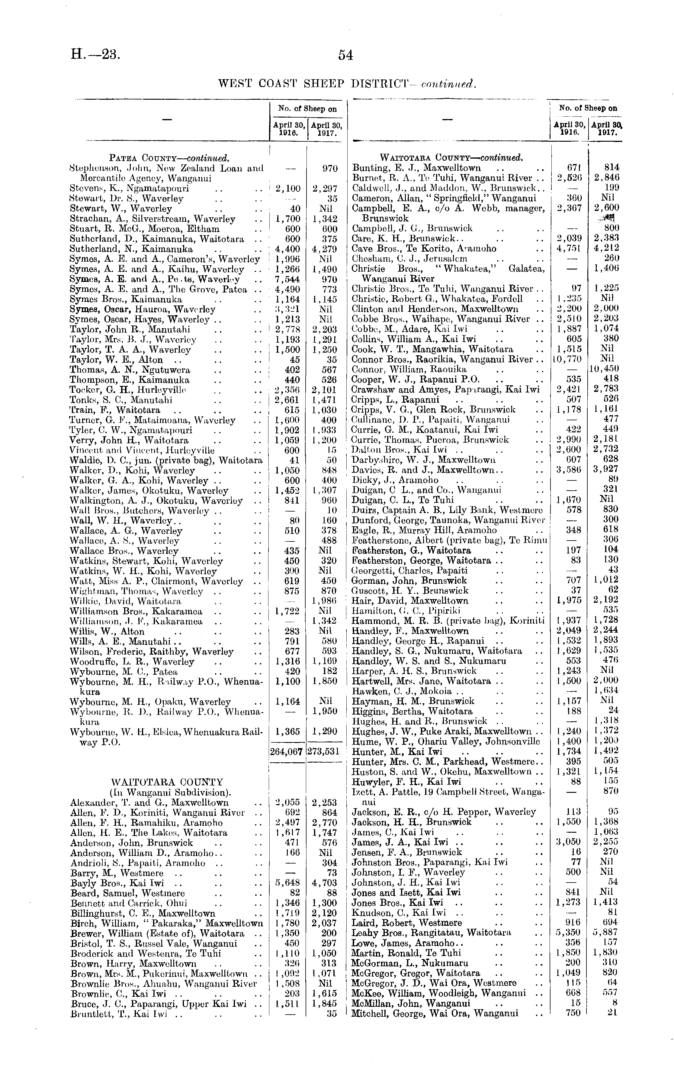 No. of Sheep on April 30, April 30, 1916. 1917. No. of Sheep on April 30,1 April 30l 1916. 1917. Patea County— continued. Stephenson, John, New Zealand Loan and Mercantile Agency, Wanganui Stevens, K, Ngamatapouri .. .. 2,100 Stewart, Dr. S., Waverley Stewart, W., Waverley .. .. 40 Strachan, A., Silverstream, Waverley .. 1,700 Stuart, R. McG., Moeroa, Eltham ' .. 600 Sutherland, D., Kaimanuka, Waitotara .. ' 600 Sutherland, N., Kaimanuka .. .. j 4,400 Symes, A. E. and A., Cameron's, Waverley i 1,996 Symes, A. E. and A., Kaihu, Waverley .. 1,266 Symes, A. E. and A., Pe.ts, Waverley .. 7,544 Symos, A. E. and A., The Grove, Patea .. 4,490 Symes Bros., Kaimanuka .. .. 1,164 Symes, Oscar, Hauroa, Waverley .. 3,321 Symes, Oscar, Hayes, Waverloy .. .. j 1,21.3 Taylor, John R„ Manutahi .. .. 2,778 'Taylor, Mrs. B. J., Waverley .. .. 1,193 Taylor, T. A. A., Waverley' .. .. 1,500 Taylor, W. E., Alton .. .. .. 45 Thomas, A. N., Ngutuwera .. .. 402 Thompson, E., Kaimanuka .. .. 440 Tocker, G. H„ Hurleyville , . .. j 2,350 Tonks, S. C, Manutahi .. .. 2,661 Train, F., Waitotara .. .. .. j 615 Turner, G. F., Mataimoana, Waverley .. 1,600 Tyler, C. W., Ngamatapouri .. " .. 1,902 Verry, John H., Waitotara .. .. 1,059 Vincent and Vincent, Hurleyville .. j 600 Waldie, D. G, jun. (private bag), Waitotara ' 41 Walker, D., Kohi, Waverley .. ..1,050 Walker, G. A., Kohi, Waverley .. .. 600 Walker, James, Okotuku, Waverley .. 1,452 Walkington, A. J., Okotuku, Waverley .. 8:11 Wall Bros., Butchers, Waverley Wall, W. H., Waverley.. .. .. 80 Wallace, A. G., Waverley .. . . 510 Wallace, A. S., Waverley Wallace Bros., Waverley .. .. 435 Watkins, Stewart, Kohi, Waverley .. 450 Watkins, W. H., Kohi, Waverley .. 300 Watt, Miss A. P., Clairmont, Waverley .. 619 Wightman, Thomas, Waverley .. .. 875 Wilkio, David, Waitotara Williamson Bros., Kakaramea .. .. 1,722 Williamson, J. F., Kakaramea .. .. — Willis, W., Alton .. .. .. 283 Wills, A. E., Manutahi .. .. .. 791 WUson, Frederic, Raithby, Waverley .. 677 Woodruffe, L. R., Waverley .. .. 1,316 Wybourne, M. C, Patea .. . . 420 Wybourne, M. IL, Railway P.O., Whenua- 1,100 kura Wybourne, M. IL, Opaku, Waverley .. 1,164 Wybourne, It. ])., Railway P.O., Whenuakura Wybourne, W. H., Elslea, Whenuakura Rail- 1,365 way P.O. 204,067 970 2,297 35 Nil 1,342 000 375 4,279 Nil 1,490 970 773 1,145 Nil Nil 2,203 1,291. 1,250 35 567 526 2,101 1,471 1,030 400 1,933 1,200 15 50 848 400 1,307 960 10 160 378 488 Nil 320 Nil 450 870 1,986 Nil 1,342 Nil 580 593 1,169 182 1,850 Waitotara County— continued. Bunting, E. J., Maxwelltown Burnet, R. A., Tc 'Tuhi, Wanganui River .. Caldwell, J., and Maddon, W., Brunswick.. Cameron, Allan, " Springfield," Wanganui Campbell, E. A., c/o A. Webb, manager, Brunswiok Campbell, J. G., Brunswick Care, K. IL, Brunswick. . Cave Bros., Te Korito, A'amoho Chesham, O. J., Jerusalem Christie Bros., " Whakatea," Galatea, Wanganui River Christie Bros., Te Tuhi, Wanganui River . . Christie, Robert G., Whakatea, Fordell Clinton and Henderson, MaxweUtoWn Cobbe Bros., Waihape, Wanganui River .. Cobbe, M., Adare, Kai Iwi Coffins, William A., Kai Iwi Cook, W. T., Mangawhia, Waitotara Connor Bros., Raorikia, Wanganui River .. Connor, William, Raouika Cooper, W. J., Rapanui P.O. Crawshaw and Amyos, Paparangi, Kai Iwi Cripps, L., Rapanui Cripps, V. G., Glen Rock, Brunswick Oullinanc, D. P., Papaiti, Wanganui Currie, G. M., Koatanui, Kai Iwi Currie, Thomas, Pucroa, Brunswick Dalton Bros,, Kai Iwi Darbyshirc, W. J., Maxwelltown Davies, R. and J., Maxwelltown.. Dicky, J., Aramoho Duigan, C L., and Co., Wanganui Duigan, G L., Te Tuhi Duirs, Captain A. B., Lily Bank, Westmere Dunford, George, Taunoka, Wanganui River Eaglo, R., Murray Hill, Aramoho Featherstone, Albert (private bag), Tc Rinni Featherston, G., Waitotara Foathorston, Georgo, Waitotara Georgctti, Charles, Papaiti Gorman, John, Brunswick Guscott, H. Y., Brunswick Hair, David, Maxwelltown Hamilton, G. G, Pipiriki Hammond, M. R. B. (private hag), Koriniti Handley, F., Maxwelltown Handley, George H., Rapanui Handley, S. G., Nukumaru, Waitotara Handley, W. S. and S., Nukumaru Harper, A. H. S., Brunswick Hartwell, Mrs. Jane, Waitotara Hawken, C. J., Mokoia Hayman, II. M., Brunswick Higgins, Bertha, Waitotara Hughes, H. and It., Brunswick Hughes, J. W., Puke Araki, Maxwelltown . . Hume, W. P., Ohariu Valley, Johnsonville Hunter, M., Kai Iwi Hunter, Mrs. C. M., Parkhead, Westmere.. Huston, S. and W., Okohu, Maxwelltown .. Huwyler, F. H., Kai Iwi Izett, A. Pattlo, 19 Campbell Street, Wanganui Jackson, E. R., c/o H. Pepper, Waverley Jackson, H. H., Brunswick James, C, Kai Iwi James, J. A., Kai Iwi Jensen, F. A., Brunswick Johnston Bros., Paparangi, Kai Iwi Johnston, I. P., Waverley Johnston, J. H., Kai Iwi Jones and Isett, Kai Iwi Jones Bros., Kai Iwi Knudson, G, Kai Iwi Laird, Robert, Westmere Leahy Bros., Rangitatau, Waitotara Lowo, Jamos, Aramoho.. Martin, Ronald, Te Tuhi McGorman, L., Nukumaru McGregor, Grcgor, Waitotara McGregor, J. D, Wai Ora, Westmere McKee, William, Woodleigh, Wanganui .. McMiUan, John, Wanganui Mitchell, George, Wai Ora, Wanganui 671 2,520 300 2,307 2,039 4,751 97 I .235 2,200 2,510 1,887 605 1,515 10,770 535 2,421 507 1,178 422 2,990 2,600 607 3,586 814 2,840 199 Nil 2,000 800 2,383 4,212 260 1,406 1,225 Nil 2,000 2,203 1,074 380 Nil Nil 10,4.50 418 2,783 520 1,161 477 449 2,181 2,732 628 3,927 89 321 Nil 830 300 618 300 104 130 43 1,012 62 2,192 535 1,728 2,244 1,893 I , 535 476 Nil 2,000 1,034 Nil 24 1.318 1.372 1,20.) 1,492 505 1,154 155 870 1,070 578 348 197 83 707 37 1,975 1,937 2,049 1,532 I ,629 553 I ,243 1,500 Nil 1,950 1,157 188 1,290 1,240 I ,400 1,734 395 1,321. 88 204,007 273,531 WAITOTARA COUNTY (In Wanganui Subdivision). Alexander, T. and G., Maxwelltown .. 2,055 Allen, F. D., Koriniti, Wanganui River .. 692 Allen, F. H., Ramahiku, Aramoho .. 2,497 Allen, H. E., The Lakes, Waitotara .. 1,617 Anderson, John, Brunswick .. .. 471 Anderson, William D., Aramoho.. .. 166 Andrioli, S