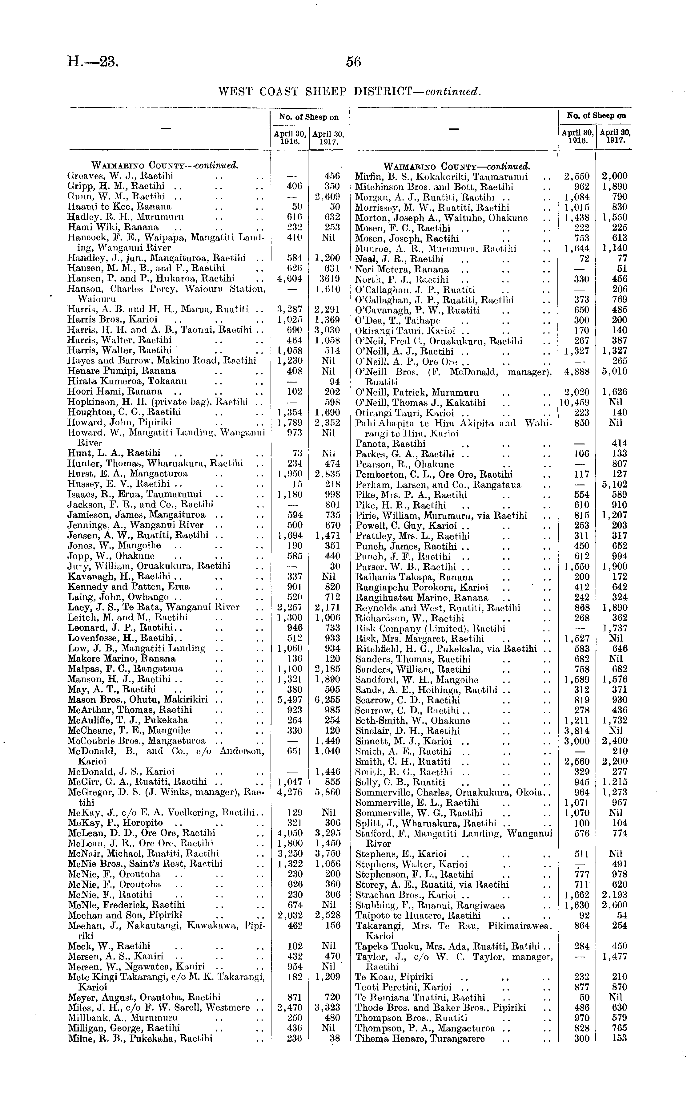 No. of Sheep on April 30,1 April 30, 1916. 1917. No. of Sheep on 1 April 30, April 80, 1916. 1917. Waimarino County— continued. Greaves, W. J., Raetihi Gripp, H. M., Raetihi Gunn, W. M„ Raetihi Haami te Kee, Ranana Hadley. it. H., Murumuru Hami Wild, Ranana Hancock, F. E., Waipapa, Mangatiti Landing, Wanganui River Handley, J., jun., Mangaituroa, Raetihi .. Hansen, M. M., B., and P., Raetihi Hansen, P. and P., Hukaroa, Raetihi Hanson, Charles Percy, Waiouru Station, Waiouru Harris, A. B. and IT. IL, Marua, Ruatiti .. Harris Bros., Karioi Harris, H. II. arrd A. B., Taonui, Raetihi .. Harris, Walter, Raetihi Harris, Walter, Raetihi Hayes and Barrow, Makino Road, Raetihi Henare Pumipi, Ranana Hirata Kumoroa, Tokaanu Hoori Hami, Ranana Hopkinson, H. H. (private bag), Raetihi . . Houghton, C. G., Raetihi Howard, John, Pipiriki Howard, W., Mangatiti Landing, Wanganui River Hunt, L. A., Raetihi Hunter, Thomas, Wharuakura, Raetihi Hurst, E. A., Mangaeturoa Hussey, E. V., Raetihi Isaacs, R., Erua, Taumarunui Jackson, F. R., and Co., Raotihi Jamieson, James, Mangaituroa Jennings, A., Wanganui River Jensen, A. W., Ruatiti, Raotihi Jones, W., Mangoihe Jopp, W., Ohakune Jury, William, Oruakukura, Raetihi Kavanagh, H., Raetihi Kennedy and Patten, Erua Laing, John, Owhango Lacy, J. S., Tc Rata, Wanganui River Leitch, M. and M., Raotihi Leonard, J. P., Raetihi.. Lovenfosse, H., Raetihi.. Low, J. B., Mangatiti Landing Makere Marino, Ranana Malpas, F. G, Rangataua Manson, H. J., Raetihi May, A. T., Raetihi Mason Bros., Ohutu, Makirikiri McArthur, Thomas, Raetihi McAuliffe, T. J., Pukekaha McCheane, T. E., Mangoihe McCoubrio Bros., Mangaeturoa McDonald, B., and Co., c/o Anderson, Karioi McDonald, J. S., Karioi McGirr, G. A., Ruatiti, Raotihi McGregor, D. S. (J. Winks, manager), Raetihi McKay, J., c/o E. A. Voelkering, Raetihi.. McKay, P., Horopito McLean, D. D., Ore Ore, Raotihi McLean, J. It., Ore Ore, Raetihi McNair, Michael, Ruatiti, Raetihi McNie Bros., Saint's Rest, Raetihi McNie, F., Oroutoha McNie, P., Oroutoha McNie, P., Raetihi McNie, Frederick, Raetihi Meehan and Son, Pipiriki Meehan, •!., Nakautangi, Kawakawa, Pipiriki Meek, W., Raetihi Mersen, A. S., Kaniri Mcrsen, W., Ngawatoa, Kaniri Mete Kingi Takarangi, c/o M. K. Takarangi, Karioi Meyer, August, Orautoha, Raetihi Miles, J. H., c/o F. W. Sarell, Westmere .. Millbank, A., Murumuru MiUigan, George, Raetihi Milne, R. B., Pukekaha, Raetihi 406 50 616 232 410 584 020 4,004 3,287 1,025 690 464 1,058 1,230 408 102 I .35 1 1,789 973 73 234 1 ,950 15 1,180 594 500 I ,094 190 585 337 901 520 .2,257 1 ,300 946 512 1,060 130 1,100 1 ,321 380 5,497 923 254 330 456 350 2,609 50 632 253 Nil 1,200 631 3619 1,610 2,291 1,369 3,030 1,058 514 Nil Nil 94 202 598 1,090 2,352 Nil Nil 474 2.835 218 998 801 735 670 1,471 351 440 30 Nil 820 712 2,171 1,006 733 933 934 120 2,185 1,890 505 0,255 985 254 120 1,449 1,040 Waimarino County— continued. Mirfin, B. S., Kokakoriki, 'Taumarunui Mitchinson Bros, and Bott, Raetihi Morgan, A. J., Ruatiti, Raetihi Morrissey, M. W„ Ruatiti, Raetihi Morton, Joseph A., Waituhe, Ohakune Moscn, F. C, Raetihi Mosen, Joseph, Raetihi Munroe, A. IT., Murumuru, Raetihi Neal, J. R., Raetihi Neri Metera, Ranana North, P. ,T„ Raotihi O'Callaghan, .1. P.. Ruatiti (>'( allaghan, J. P., Ruatiti, Raetihi O'Cavanagh, P. W., Ruatiti O'Dea, T„ Taihape Okirangi Tauri, Karioi .. O'Neil, Fred 0., Oruakukura, Raetihi O'Noill, A. J., Raetihi .. O'Neill. A. P., Ore Ore .. O'Noill Bros. (F. McDonald, manager), Ruatiti O'Neill, Patrick, Murumuru O'Neill, Thomas J., Kakatihi Otirangi 'Tauri, Karioi Pahi Ahapita te Hira Akipita and Wahirangi te Hira. Karioi Pancta, Raetihi Parkes, G. A., Raetihi Pearson, It., Ohakune Pemberton, C. L., Ore Ore, Raetihi I'ci hani, Larson, and Co., Rangataua Pike, Mrs. P. A., Raetihi Pike, H. R., Raetihi Pirie, William, Murumuru, via Raetihi Powell, C. Guy, Karioi Prattley, Mrs. L., Raetihi Punch, James, Raetihi Punch,, J. F., Raetihi Purser, W. B., Raetihi .. Raihania Takapa, Ranana Rangiapehu Porokoru, Karioi .. Rangihuatau Marino, Ranana Reynolds and West, Ruatiti, Raetihi Richardson, W., Raetihi Risk Company (Limited), Raetihi Risk, Mrs. Margaret, Raetihi Ritchfield, H. G., Pukekaha, via Raetihi .. Sanders, Thomas, Raotihi Sanders, William, Raetihi Sandford, W. TL, Mangoihe Sands, A. E., Hoihinga, Raetihi .. Scarrow, C. D., Raetihi Sea now, G D., Raetihi .. Seth-Smith, W., Ohakune Sinclair, I). IL, Raetihi Sinnett, M. J., Karioi Smith, A. F., Raetihi Smith, C. IL, Ruatiti .. Smith, It. (!.. Raetihi Solly, C. B., Ruatiti SommerviUe, Charles, Oruakukura, Okoia.. Sommerville, E. L., Raetihi Sommerville, W. G., Raotihi Splitt, J., Wharuakura, Raetihi Stafford, P., Mangatiti Landing, Wanganui River Stephens, E., Karioi Stephens, Walter, Karioi Stephenson, F. L., Raetihi Storey, A. E., Ruatiti, via Raetihi Straohan Bros., Karioi Stubbing, P., Ruanui, Rangiwaea Taipoto te Huatere, Raetihi Takarangi, Mrs. Te Ran, Pikimairawea, Karioi Tapeka Tiioku, Mrs. Ada, Ruatiti, Ratihi .. 'Taylor, J., o/o W. 0. Taylor, manager, Raetihi Te Koau, Pipiriki Teoti Peretini, Karioi .. 'Tc Reniiaua Tuatini, Raetihi Thode Bros, and Baker Bros., Pipiriki Thompson Bros., Ruatiti Thompson, P. A., Mangaeturoa Tihema Henare, Turangarero 2,550 902 1,084 1,015 1,438 222 753 1,044 72 330 373 650 300 170 267 1,327 4,888 2,020 10,459 223 850 100 117 554 610 815 253 311 450 612 1 ,550 200 412 242 868 268 2,000 1,890 790 830 1,550 225 613 1,140 77 51 456 206 769 485 200 140 387 1,327 265 5,0.10 1,020 Nil 140 Nil 414 133 807 127 5,102 589 910 1,207 203 317 652 994 1,900 172 042 324 1,890 362 1,737 Nil 046 Nil 082 1,576 371 930 436 1,732 Nil 2,400 210 2,200 277 1,215 1,273 957 Nil 104 774 I ,527 583 682 758 I ,589 312 819 278 1,211 3,814 3,000 051 1,047 4,276 1,440 855 5,860 2,560 329 945 964 1,071 1,070 100 570 I 2!) 321 4,050 1 ,800 3,250 1 ,322 230 020 230 674 2,032 462 Nil 306 3,295 1,450 3,750 1,056 200 360 306 Nil 2,528 156 511 777 711 1,662 1,630