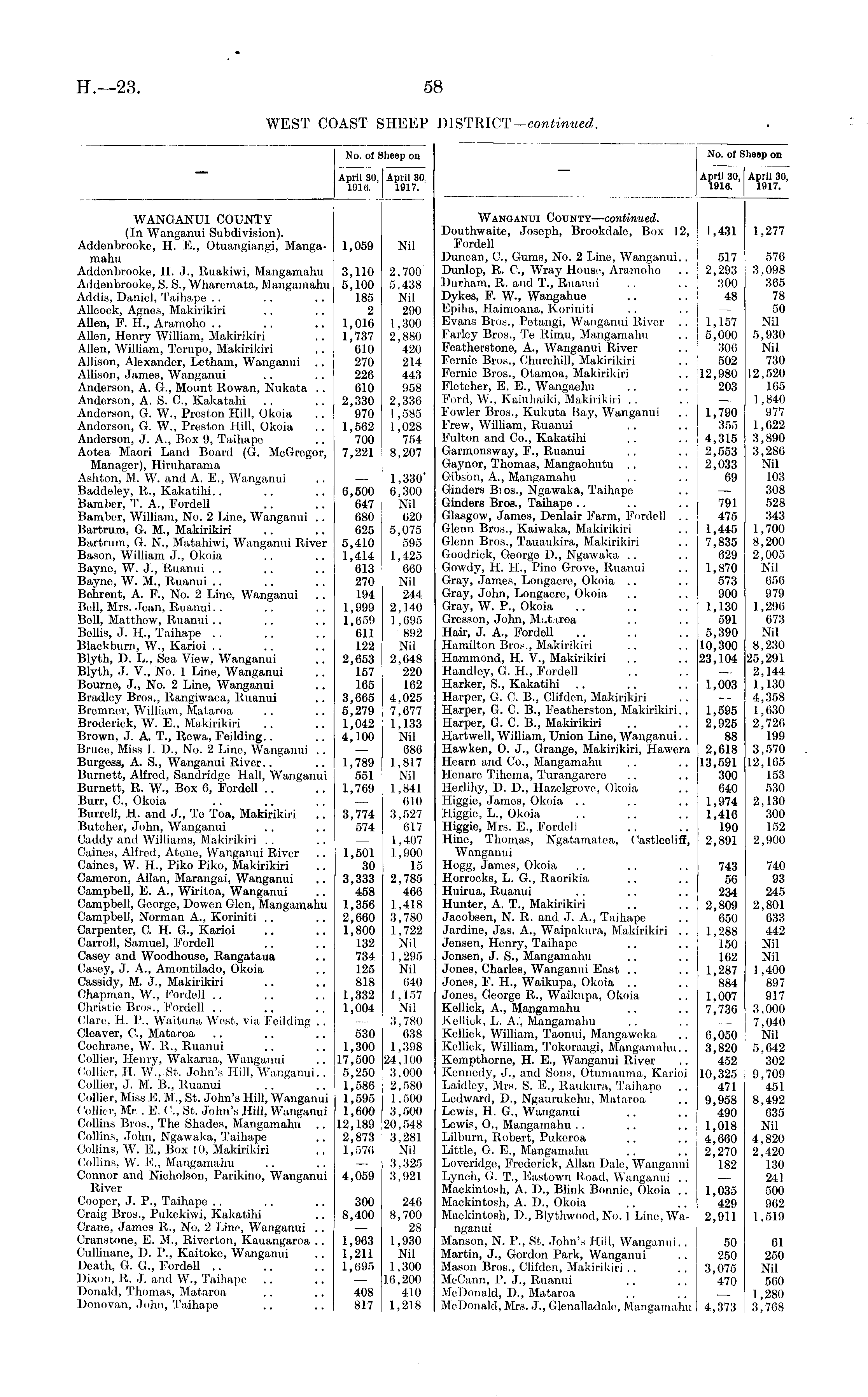 No. of f April 30, 1916. Iheep on I April 30. 1917. No. of Sheep on April 30, | April 30, 1916, 1917. WANGANUICOUNTY (In Wanganui Subdivision). Addenbrookc, H. E., Otuangiangi, Mangamahu Addenbrooke, H. J., Ruakiwi, Mangamahu Addenbrookc, S. S., Wharomata, Mangamahu Addis, Daniel, 'Taihape AUcock, Agnos, Makirikiri AUen, F. H., Aramoho Allen, Henry William, Makirikiri Allen, William, Tempo, Makirikiri Allison, Alexander, Letham, Wanganui Allison, James, Wanganui Anderson, A. G., Mount Rowan, Nukata .. Anderson, A. S. C, Kakatahi Anderson, G. W., Preston Hill, Okoia Anderson, G. W., Preston Hill, Okoia Anderson, J. A., Box 9, Taihapo Aotea Maori Land Board (G. McGregor, Manager), Hiruharama Ashton, M. W. and A. E., Wanganui Baddeley, It., Kakatihi.. Bamber, T. A., Fordell Bamber, William, No. 2 Lino, Wanganui .. Bartrum, G. M., Makirikiri Bartrum, G. N., Matahiwi, Wanganui River Bason, William J., Okoia Bayne, W. J., Ruanui Bayne, W. M., Ruanui Behrent, A. F., No. 2 Lino, Wanganui Bell, Mrs. Jean, Ruanui.. BcU, Matthew, Ruanui Bollis, J. H., Taihape Blackburn, W., Karioi Blyth, D. L., Sea View, Wanganui Blyth, J. V., No. 1 Line, Wanganui Bourne, J., No. 2 Line, Wanganui Bradley Bros., Rangiwaca, Ruanui Bremr.cr, William, Mataroa Broderick, W. E., Makirikiri Brown, J. A. T., Rewa, Feilding.. Bruce, Miss I. D., No. 2 Line, Wanganui . . Burgess, A. S., Wanganui River.. Burnett, Alfrod, Sandridge Hall, Wanganui Burnett, R. W., Box 6, Fordell Burr, C, Okoia Burrell, H. and J., Te Toa, Makirikiri Butcher, John, Wanganui Caddy and Williams, Makirikiri .. Caines, Alfred, Atone, Wanganui River Caines, W. H., Piko Piko, Makirikiri Cameron, Allan, Marangai, Wanganui Campbell, E. A., Wiritoa, Wanganui Campbell, Goorgo, Dowen Glen, Mangamahu Campbell, Norman A., Koriniti Carpenter, G H. G., Karioi Carrol], Samuel, Fordell Casey and Woodhouse, Rangataua Casey, J. A., Amontilado, Okoia Cassidy, M. J., Makirikiri Chapman, W., Fordell .. Christie Bros., FordeU Clare, H. P., Waituna West, via Feilding .. Cleaver, G, Mataroa Cochrane, W. It., Ruanui Collier, Henry, Wakarua, Wanganui Collier, IL W., St. John's Hill, "Wanganui.. Collier, J. M. B., Ruanui Collier, Miss E. M., St. John's Hill, Wanganui Collier, Mr. . E. G, St. John's Hill, Wanganui ColUns Bros., The Shades, Mangamahu Collins, John, Ngawaka, Taihape Collins, W. F., Box 10, Makirikiri Collins, W. H., Mangamahu Connor and Nicholson, Parikino, Wanganui River 1,059 3,110 5,100 185 2 1,010 1,737 610 270 226 610 2,330 970 1,562 700 7,221 6,500 647 680 625 5,410 1,414 613 270 194 1,999 1,659 611 122 2,653 157 165 3,665 5,279 1,042 4,100 1,789 551 1,769 Nil 2,700 5.438 Nil 290 1,300 2,880 420 214 443 958 2,330 1,585 1,028 754 8,207 1,330' 0,300 Nil 620 5,075 595 1,425 660 Nil 244 2,140 1,095 892 Nil 2,048 220 102 4,025 7,077 1,133 Nil 686 1,817 Nil 1,841 610 3,527 017 1,407 1,900 15 2,785 466 1,418 3,780 1,722 Nil I . 295 Nil 040 1,157 Nil 3,780 638 1,398 21,100 3,000 2,580 1.500 3.500 20,548 3.281 Nil 3.325 3,921 Wanganui County— continued. Douthwaite, Joseph, Brookdale, Box 12, Fordell Duncan, G, Gums, No. 2 Line;, Wanganui. . Dunlop, R. G, Wray House, Aramoho Durham, R. and T., Ruanui Dykes, F. W., Wangahuo Fpiha, Haimoana, Koriniti Evans Bros., Potangi, Wanganui River .. Farley Bros., Te itimu, Mangamahu Foatherstone, A., Wanganui Rivor Fernie Bros., Churchill, Makirikiri Fernie Bros., Otamoa, Makirikiri Fletcher, E. E., Wangaehu Ford, W., Kaiuhaiki, Makirikiri Fowler Bros., Kukuta Bay, Wanganui Frew, William, Ruanui Fulton and Co., Kakatihi Garmonsway, F., Ruanui Gaynor, Thomas, Mangaohutu Gibson, A., Mangamahu Ginders Bios., Ngawaka, Taihape Ginders Bros., Taihape Glasgow, Jamos, Denlair Farm, Fordell .. Glenn Bros., Kaiwaka, Makirikiri Glenn Bros., Tauaukira, Makirikiri Goodrich, Goorgo D., Ngawaka Gowdy, H. H., Pino Grove, Ruanui Gray, James, Longacre, Okoia Gray, John, Longacre, Okoia Gray, W. P., Okoia Grcsson, John, Mi.taroa Hair, J. A., FordeU Hamilton Bros., Makirikiri Hammond, H. V., Makirikiri Handley, G. H., Fordell Harkcr, S., Kakatihi Harper, G. C. B., Clifden, Makirikiri Harper, G. C. B., Featherston, Makirikiri.. Harper, G. C. B., Makirikiri Hartwell, William, Union Lino, Wanganui.. Hawken, O. J., Grange, Makirikiri, Hawera Hearn and Co., Mangamahu Honare Tihcma, Turangarcro Herlihy, D. D., Hazelgrove, Okoia Higgie, Jamos, Okoia Higgie, L., Okoia Higgie, Mrs. E., Fordell Hine, Thomas, Ngataiuatea, Oastlecliff, Wanganui Hogg, James, Okoia Horroeks, L. G., Raorikia Huirua, Ruanui Hunter, A. T., Makirikiri Jacobson, N. It. and J. A., Taihape Jardine, Jas. A., Waipakura, Makirikiri . . Jensen, Henry, Taihape Jensen, J. S., Mangamahu Jones, Charles, Wanganui East Jones, F. H., Waikupa, Okoia Jones, George It., Waikupa, Okoia Kcllick, A., Mangamahu Kcllick, L. A., Mangamahu Kcllick, William, Taonui, Mangaweka Kcllick, William, 'Tokorangi, Mangamahu.. Kempthorne, H. E., Wanganui River Kennedy, ,1., and Sons, Otiimaiima, Karioi Laidley, Mrs. S. E., Raukura, Taihape Ledward, D., Ngaurukchu, Mataroa Lewis, H. G., Wanganui Lewis, ()., Mangamahu . . Lilburn, Robert, Pukeroa Little, G. E., Mungamahu Loveridge, Frederick, Allan Dale, Wanganui Lynch, G. T., Eastown Road, Wanganui . . Mackintosh, A. D., Blink Bonnie, Okoia .. Mackintosh, A. D., Okoia Mackintosh, D., Blythwood, No. 1 Line, Wanganui Manson, N. P., St. John's Hill, Wanganui.. Martin, J., Gordon Park, Wanganui Mason Bros., Clifden, Makirikiri McGinn, P. J., Ruanui MoDonald, D., Mataroa McDonald, Mrs. J., Glonalladale, Mangamahu : 1,431 517 2,293 300 48 1,157 5,000 306 502 12,980 203 — 1,790 355 4,315 2,553 2,033 69 791 475 1,445 7,835 629 1,870 573 900 1,130 591 5,390 10,300 23,104 1,003 1,595 2,925 88 2,618 13,591 300 640 1,974 1,416 190 2,891 1,277 576 3,098 365 78 50 Nil 5,930 Nil 730 12,520 165 1,840 977 1,622 3,890 3,280 Nil 103 308 528 343 1,700 8,200 2,005 Nil 656 979 1,290 673 Nil 8,2.30 25,291 2,144 1,130 4,358 1,030 2,726 199 3,570 12,165 153 530 2,130 300 152 2,900 3,774 