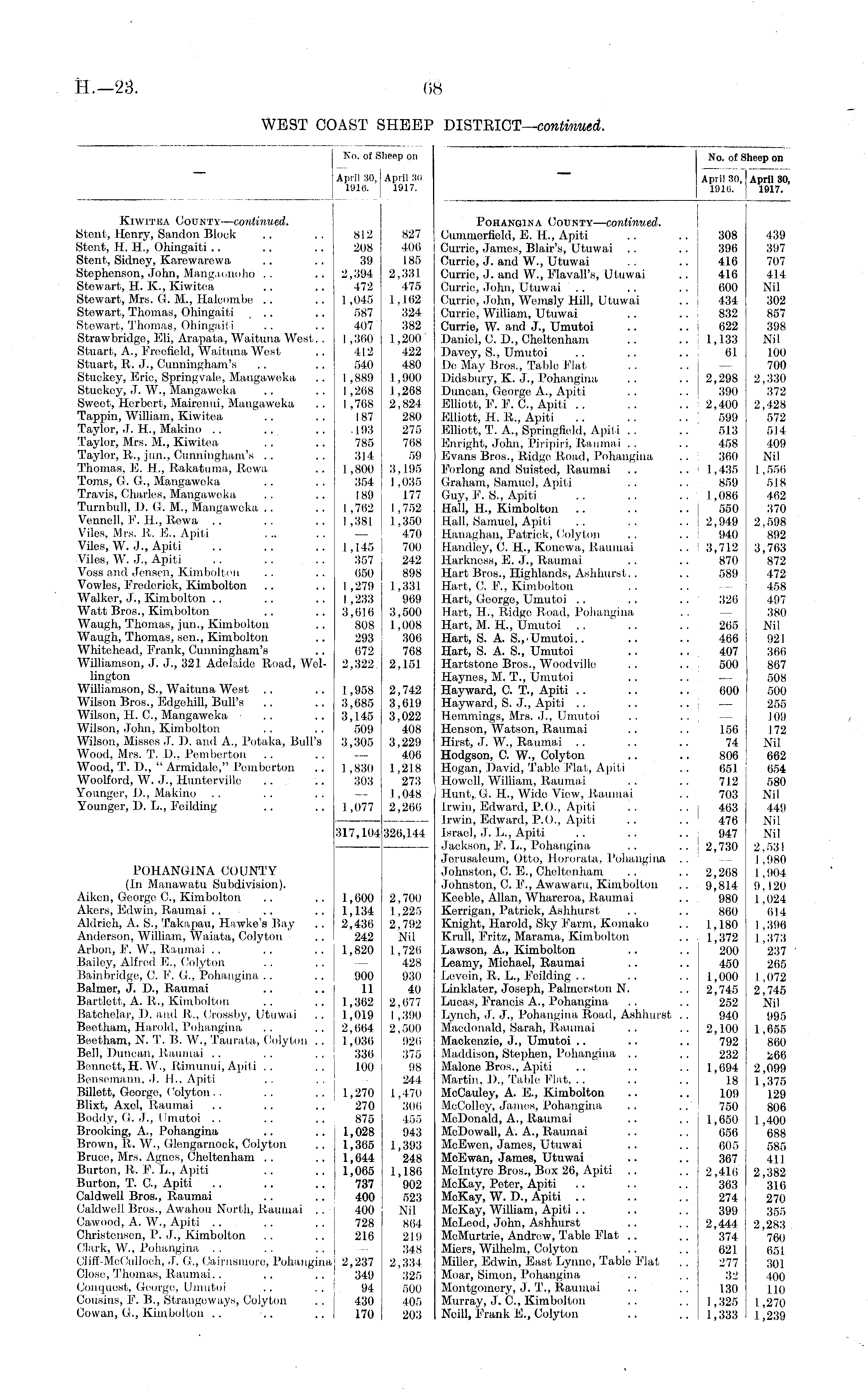 No. of S iheep on No. of Sheep on April 30,1 April 30, 1916. 1917. April 30, | 1916. I April 311 1917. Kiwitea County— continued. Stent, Henry, Sandon Block Stent, IT. TL, Ohingaiti Stent, Sidney, Karewarewa Stephenson, John, Mangaonoho Stowart, H. K., Kiwitca Stewart, Mrs. G. M., Halcombe Stewart, Thomas, Ohingaiti ... Stewart, 'Thomas, Ohingaiti Straw bridge, Eli, Arapata, Waituna West. . Stuart, A., Freefleld, Waituna West Stuart, R. J., Cunningham's Stuckey, Eric, Springvale, Mangaweka Stuckcy, J. W., Mangaweka Sweet, Herbert, Mairenui, Mangaweka Tappin, William, Kiwitea Taylor, ,1. H., Makino Taylor, Mrs. M., Kiwitea Taylor, R., jun., Cunningham's Thomas, E. II., Rakatiima, Rewa Toms, G. G., Mangaweka Travis, Charles, Mangawoka Turnbull, D. G. M., Mangaweka Vennell, F. IT., Rewa Viles, Mrs. It. E., Apiti Viles, W. J., Apiti Viles, W. J., Apiti Voss and Jensen, Kimbolton Vowlos, Frederick, Kimbolton Walker, J., Kimbolton Watt Bros., Kimbolton Waugh, Thomas, jun., Kimbolton Waugh, Thomas, sen., Kimbolton Whitehead, Frank, Cunningham's Williamson, J. J., 321. Adelaide Road, Wellington Williamson, S., Waituna West Wilson Bros., Edgehill, Bull's Wilson, H. C, Mangaweka ■ Wilson, John, Kimbolton Wilson, Misses J. D. and A., Potaka, Bull's Wood, Mrs. T. D., .Pemberton Wood, T. D., " Armidale," Pemberton Woolford, W. .!., Hunterville Younger, D., Makino Younger, D. L., Foilding 812 208 39 2,394 472 1 ,045 587 407 1,300 412 540 1 ,889 1,208 I ,708 187 .193 785 314 1 ,800 354 189 I ,702 1,381 1,145 357 650 j 1 ,279 1,233 3,016 ,808 293 672 2,322 1,958 3,085 3,145 509 3,305 I ,830 303 827 406 185 2,331 475 1,102 324 382 1,200 422 480 1,900 1,268 2,824 280 275 768 59 3,195 I ,035 177 1,7.52 1,350 470 700 242 898 1,331 969 3,500 1,008 306 768 2,151 2,742 3,619 3,022 408 3,229 406 1,218 273 1,048 2,200 Pohangina County— continued. Cummerfield, E. H., Apiti .. .. j 308 Currie, James, Blair's, Utuwai .. .. 390 Currie, J. and W., Utuwai . . .. 416 Curric, J. and W., Flavall's, Utuwai .. 416 Curric, John, Utuwai .. .. .. 600 Currie, John, Wemsly Hill, Utuwai .. ! 434 Currie, William, Utuwai .. .. I 832 Currie, W. and J., Umutoi .. .. j 622 Daniel, C. D., Cheltenham .. .. j 1,133 Davey, S., Umutoi .. .. .. 61 De May Bros., Table Flat Didsbiiry, K. J., Pohangina .. .. 2,298 Duncan, George A., Apiti . . .. 390 Elliott, F. F. G, Apiti .. .. .. 2,400 Elliott, H. R., Apiti .. .. .. ! 599 Elliott, T. A., Springfield, Apiti . . .. j 513 Enright, John, Piripiri, Raumai . . .. j 458 Evans Bros., Ridge Road, Pohangina .. I 360 Forlong and Suisted, Raumai .. ■ • ' 1,435 Graham, Samuel, Apiti .. . . 859 Guy, F. S., Apiti . . . . .. 1,086 Hall, H„ Kimbolton .. . . .. 550 Hall, Samuel, Apiti ., .. ..2,949 Hanaghan, Patrick, Colyton .. .. 940 Handley, 0. H., Kouowa, Raumai .. I 3,712 Harkness, E. J., Raumai .. .. 870 Hart Bros., Highlands, Ashhurst.. .. 589 Hart, C. P., Kimbolton Hart, George, Umutoi .. .. .. j 326 Hart, H., Ridge Road, Pohangina Hart, M. H-, Umutoi . . .. .. 265 Hart, S. A. S.,• Umutoi.. .. .. 406 Hart, S. A. S., Umutoi .. .. 407 Hartstone Bros., Woodvillo .. ... 500 Haynos, M. T., Umutoi .. .. ' — Hayward, C. T., Apiti .. .. ... 600 Hayward, S. J., Apiti .. .. ,. — Hommings, Mrs. ,1., Umutoi . . .. J — Henson, Watson, Raumai .. .. I 156 Hirst, J. W., Raumai .. .. .. 74 Hodgson, G W., Colyton .. .. 806 Hogan, David, 'Tabic Flat, Apiti .. 651 Howell, William, Raumai . . .. 712 Hunt,. G. H-, Wide Viow, Raumai .. 703 Irwin, Edward, P.O., Apiti .. .. i 403 Irwin, Edward, P.O., Apiti .. .. 470 Israel, J. L., Apiti .. .. .. ; 947 Jackson, F. L., Pohangina .. .. 2,730 Jorusaloum, Otto, Hororata, Pohangina . . Johnston, C. E., Cheltenham .. .. 2,208 Johnston, C. P., Awawaru, Kimbolton .. 9,814 Keeble, Allan, Whareroa, Raumai .. 980 Kerrigan, Patrick, Ashhurst .. .. 800 Knight, Harold, Sky Farm, Komako .. 1,180 Krull, Fritz, Marama, Kimbolton .. , 1,372 Lawson, A., Kimbolton .. . . 200 Leamy, Michael, Raumai .. .. 450 Levoin, R. L., Foilding .. .. .. 1,000 Linklater, Joseph, Palmerston N. .. 2,745 Lucas, Francis A., Pohangina . . .. 252 Lynch, J. J., Pohangina Road, Ashhurst . . 940 Macdonald, Sarah, Raumai .. .. 2,100 Mackenzie, J., Umutoi .. .. .. 792 Maddison, Stephen, Pohangina .. .. 232 Malone Bros., Apiti .. .. .. 1,094 Martin, IX, Table Flat, .. .. .. 18 McCauley, A. E., Kimbolton .. .. 109 MoColley, James, Pohangina .. ..' 750 McDonald, A., Raumai .. .. 1,650 McDowall, A. A., Raumai .. . . 656 McEwen, James, Utuwai .. . . 605 McEwan, James, Utuwai .. .. 367 Mcfntyre Bros., Box 26, Apiti .. .. 2,416 McKay, Peter, Apiti .. .. .. 363 McKay, W. D., Apiti .. .. .. 274 McKay, William, Apiti .. .. .. 399 McLeod, John, Ashhurst .. .. j 2,444 McMurtrie, Andrew, Table Flat .. .. I 374 Miers, Wilhelm, Colyton .. .. 621 Miller, Edwin, East Lynne, Table Flat .. 277 Moar, Simon, Pohangina . . . . 32 Montgomery, J. T., Raumai .. . . 130 Murray, J. C, Kimbolton .. .. 1,325 Neill, Frank E,, Colyton .. .. 1,333 439 397 707 414 Nil 302 857 398 Nil 100 700 2,330 372 2,428 572 514 409 Nil 1,556 518 462 370 2.598 892 3,703 872 472 458 497 380 Nil 921 366 867 508 500 255 109 172 Nil 662 054 580 Nil 449 Nil Nil 2,531 1,980 1,904 9,120 1,024 014 I ,396 1,373 237 265 I ,072 2,745 Nil 995 1,655 860 266 2,099 1,375 129 806 1,400 688 585 411 2,382 316 270 355 2,283 760 651 301 400 110 1,270 1,239 1 ,077 317,104 326,144 POHANGINA COUNTY (In Manawatu Subdivision). Aiken, George C, Kimbolton Akers, Edwin, Raumai Aldrioh, A. S., Takapau, Hawke's Bay Anderson, William, Waiata, Colyton Arbon, F. W., Raumai Bailey, Alfred E., Colyton Bainbridge, G F. G., Pohangina Balmor, J. D., Raumai Bartlett, A. R., Kimbolton Batchelar, D. and R., Crossby, Utuwai Beetham, Harold, Pohangina Beetham, N. T. B. W., Taurata, Colyton . . Bell, Duncan, Raumai Bennett, H, W., Riinunui, Apiti ., Bensemann, J. IT., Apiti Billett, George, (blyton Blixt, Axol, Raumai Bodily, G. J., Umutoi Brooking, A., Pohangina Brown, It. W., Glengarnock, 