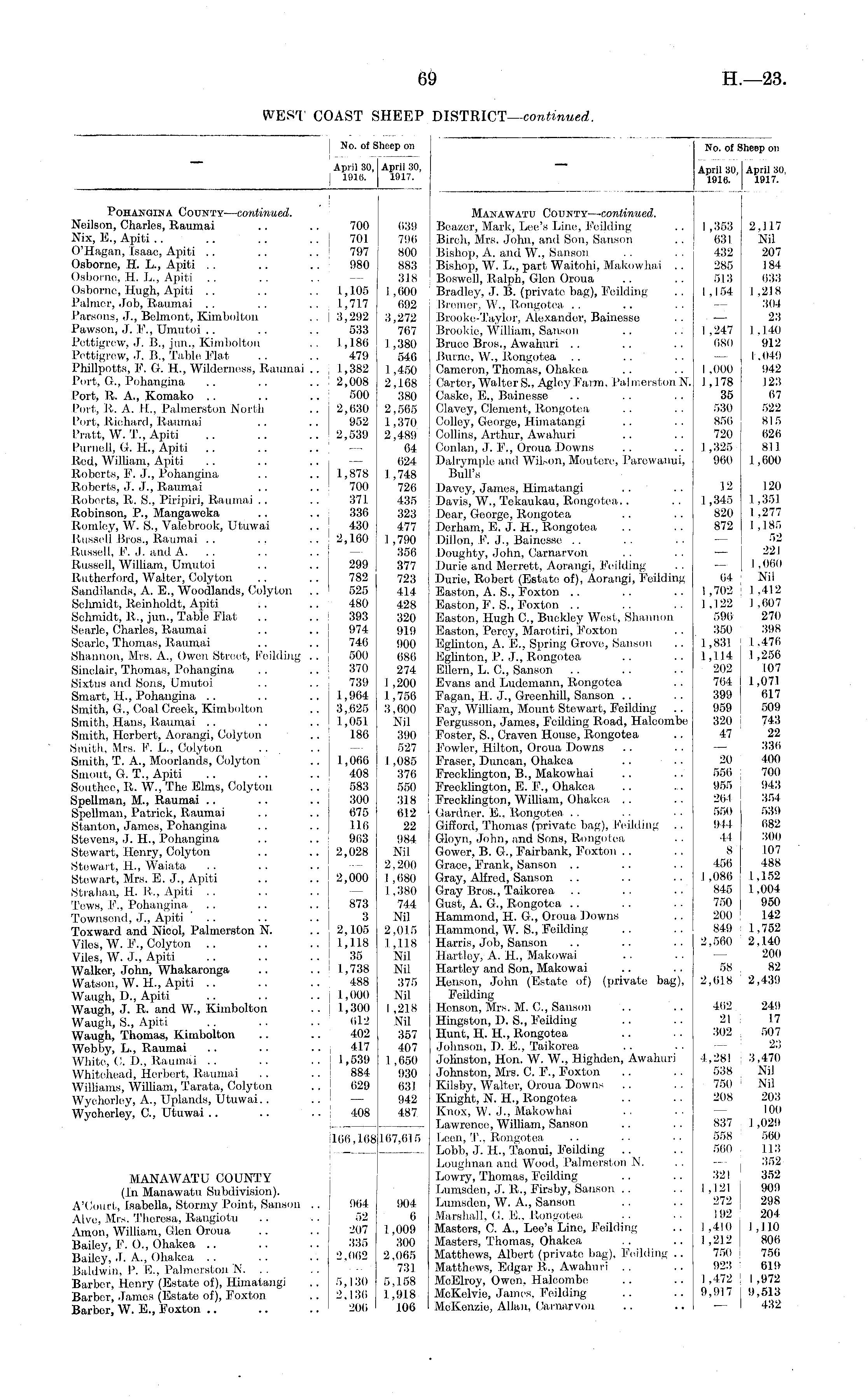I No. off Iheep on I April 30, 1917. No. of Sheep on April 30, | 1916. April 30, April 30, 1916. 1917. I . I Pohangina County— continued. Neilson, Charles, Raumai .. .. 700 Nix, E., Apiti .. .. .. .. 701 O'Hagan, Isaac, Apiti .. .. .. 797 Osborno, H. L., Apiti .. .. .. 980 Osborne, H. L., Apiti Osborne, Hugh, Apiti .. .. 1,105 Palmer, Job, Raumai .. .. .. 1,717 Parsons, J., Belmont, Kimbolton .. | 3,292 Pawson, J. P., Umutoi .. .. .. 533 Pcttigrew, J. B., jun., Kimbolton .. ' 1,186 Pcttigrcw, J. B., Table Flat .. .. 479 Phillpotts, F. G. H., Wilderness, Raumai .. , 1,382 Port, G, Pohangina .. .. ..12,008 Port, R. A., Komako .. .. .. 500 Port, It. A. IT., Palmerston North .. 2,030 Port, Richard, Raumai .. .. 952 Pratt, W. T., Apiti .. .. ..2,539 Purnell, G. H., Apiti .. .. .. — Red, William, Apiti Roberts, F. J., Pohangina .. .. 1,878 Roberts, J. J., Raumai .. .. 700 Roberts, It. S., Piripiri, Raumai . . .. 371 Robinson, P., Mangaweka .. .. 330 Romley, W. S., Valcbrook, Utuwai .. 430 Russell Bros., Raumai .. .. .. 2,160 Russell, F. J. and A. .. Russell, William, Umutoi .. .. 299 Rutherford, Walter, Colyton .. .. 782 Sandilands, A. E., Woodlands, Colyton .. 525 Schmidt, Rcinholdt, Apiti .. .. 480 Schmidt, R., jun., Table Flat .. .. 393 Searle, Charles, Raumai .. .. 974 Searle, Thomas, Raumai .. .. 746 Shannon, Mrs. A., Owen Street, Feilding .. ] 500 Sinclair, Thomas, Pohangina . . .. ! 370 Sixtus and Sous, Umutoi .. .. 739 Smart, H., Pohangina .. .. .. 1,904 Smith, G., Coal Creek, Kimbolton .. 3,625 Smith, Hans, Raumai .. .. .. 1,051 Smith, Herbert, Aorangi, Colyton .. 186 Smith, Mrs. F. L., Colyton Smith, T. A., Moorlands, Colyton .. 1,066 Smoiit, G. T., Apiti .. .. .. 408 Southoe, It. W., The Elms, Colyton .. 583 SpeUman, M., Raumai .. . . .. 300 Spellman, Patrick, Raumai .. .. 675 Stanton, James, Pohangina .. .. 116 Stevens, J. H., Pohangina .. .. 903 Stewart, Henry, Colyton .. .. 2,028 Stewart, H., Waiata Stewart, Mrs. E. J., Apiti .. .. 2,000 Strahan, H. It., Apiti Tews, F.„ Pohangina .. .. .. 873 Townsend, J., Apiti ' .. .. .. 3 Toxward and Nicol, Palmerston N. .. 2,105 Viles, W. F., Colyton .. .. .. 1,1.1.8 Viles, W. J., Apiti .. .. .. 35 Walker, John, Whakaronga .. .. 1,738 Watson, W. H., Apiti .. .. .. 488 Waugh, D., Apiti .. .. .. 1,000 Waugh, J. R. and W., Kimbolton .. 1,300 Waugh, S., Apiti .. .. .. 012 Waugh, Thomas, Kimbolton .. .. 402 Webby, L., Raumai .. .. .. 417 White, C. D„ Raumai .. .. .. 1,539 Whitehead, Herbert, Raumai . . .. 884 Williams, William, Tarata, Colyton .. 629 Wychorley, A., Uplands, Utuwai.. Wycherley, G, Utuwai .. .. ' .. 408 039 790 800 883 318 1,000 692 3,272 707 1,380 546 1,450 2,168 380 2,565 1,370 2,489 64 624 1 ,748 726 435 323 477 1,790 356 377 723 414 428 320 919 900 686 274 I ,200 1,756 3,000 Nil 390 527 I ,085 376 550 318 612 22 984 Nil 2,200 1,080 1,380 744 Nil 2,015 1,118 Nil Nil 375 Nil I ,218 Nil 357 407 1 ,050 930 031 942 487 Manawatu County-— continued. Beazer, Mark, Lee's Line, Feilding Birch, Mrs. John, and Son, Sanson Bishop, A. and W., Sanson Bishop, W. L., part Waitohi, Makowhai . . Boswoll, Ralph, Glen Oroua Bradley, ,1. B. (private bag), Feilding Bremer, W., Rongotea Brooke-Taylor, Alexander, Bainesse Brookie, William, Sanson Bruce Bros., Awahuri Burne, W., Rongotea . . Cameron, Thomas, Ohakea Carter, Walter S., AgleyFarm, PalmerstonN. Caske, E., Bainesse Clavey, Clement, Rongotea Colloy, George, Himatangi Collins, Arthur, Awahuri Ooiilan, J. F., Oroua Downs Dalrymple and Wilson, Moutere, Parewanui, Bull's Davey, James, Himatangi Davis, W., Tekaukau, Rongotea,. Dear, Goorge, Rongotea Dcrham, E. J. H., Rongotea Dillon, F. J., Bainesse Doughty, John, Carnarvon Durie and Merrett, Aorangi, Feilding Durie, Robert (Estate of), Aorangi, Feilding Easton, A. S., Foxton Easton, F. S., Foxton Easton, Hugh C, Buckley West, Shannon Easton, Percy, Marotiri, Foxton Eglinton, A. E., Spring Grove, Sanson Eglinton, P. J., Rongotea Ellern, L. C, Sanson Evans and Ludomann, Rongotea Fagan, H. J., Greenhill, Sanson Fay, William, Mount Stowart, Feilding Fergusson, James, Foilding Road, Halcombe Foster, S., Craven House, Rongotea Fowler, Hilton, Oroua Downs Fraser, Duncan, Ohakea .. Frecklington, B., Makowhai Frecklington, E. P., Ohakea Frecklington, William, Ohakea Gardner, E., Rongotea Gifford, Thomas (private bag), Feilding . . Gloyn, John, and Sons, Rongotea Gower, B. G., Fairbank, Foxton Grace, Frank, Sanson Gray, Alfred, Sanson Gray Bros., Taikorea Gust, A. G., Rongotea Hammond, H. G., Oroua Downs Hammond, W. S., Feilding Harris, Job, Sanson Hartley, A. TL, Makowai Hartley and Son, Makowai Henson, John (Estate of) (private bag), Feilding Henson, Mrs. M. C, Sanson Hingston, D. S., Feilding Hunt, H. H., Rongotea Johnson, I). E., Taikorea Johnston, Hon. W. W., Highden, Awahuri Johnston, Mrs. C. P., Foxton Kilsby, Walter, Oroua Downs Knight, N. H., Rongotea Knox, W. .1., Makowhai Lawrence, William, Sanson Lcen, T., Rongotea Lobb, J. H., Taonui, Feilding Lough nan and Wood, .Palmerston N. Lowry, Thomas, Foilding Lumsden, J. It., Firsby, Sanson Lumsden, W. A., Sanson Marshall, G. F., Rongotea Masters, C. A., Lee's Line, Feilding Masters, Thomas, Ohakea Matthows, Albert (private bag), Feilding .. Matthews, Edgar R., Awahuri .. MoElroy, Owon, Halcombe McKelvie, James, Feilding McKenzie, Allan, Carnarvon i.. 1,353 2,11.7 631 Nil 432 207 285 184 513 033 1,154 1,218 304 — 23 1,247 1.1.40 080 912 1,049 I,000 942 1,178 123 35 07 530 522 850 815 720 020 1,325 811 960 1 ,600 12 120 1,345 1,351 820 1,277 872 I , 185 52 — 221 _ 1.000 04 i Nil 1,702 ; 1,412 1,122 1,007 590 270 350 398 1,831 1,476 1,114 1,256 202 107 764 1,071 399 617 959 .509 320 ! 743 47 22 — 330 20 -11)0 550 700 955 943 26-1 354 550 539 944 082 44 300 8 107 4,50 488 1,080 1,152 845 1,004 750 950 200 1.42 849 1,752 2,560 2,140 200 58 82 2,018 2,439 KiO,108 ■ _. . 107,615 102 249 21 17 302 507 23 4,281 3,470 538 Nil 750 Nil 208 203 — 100 837 1 ,029 558 500 500 113 352 321 ' 352 1,1