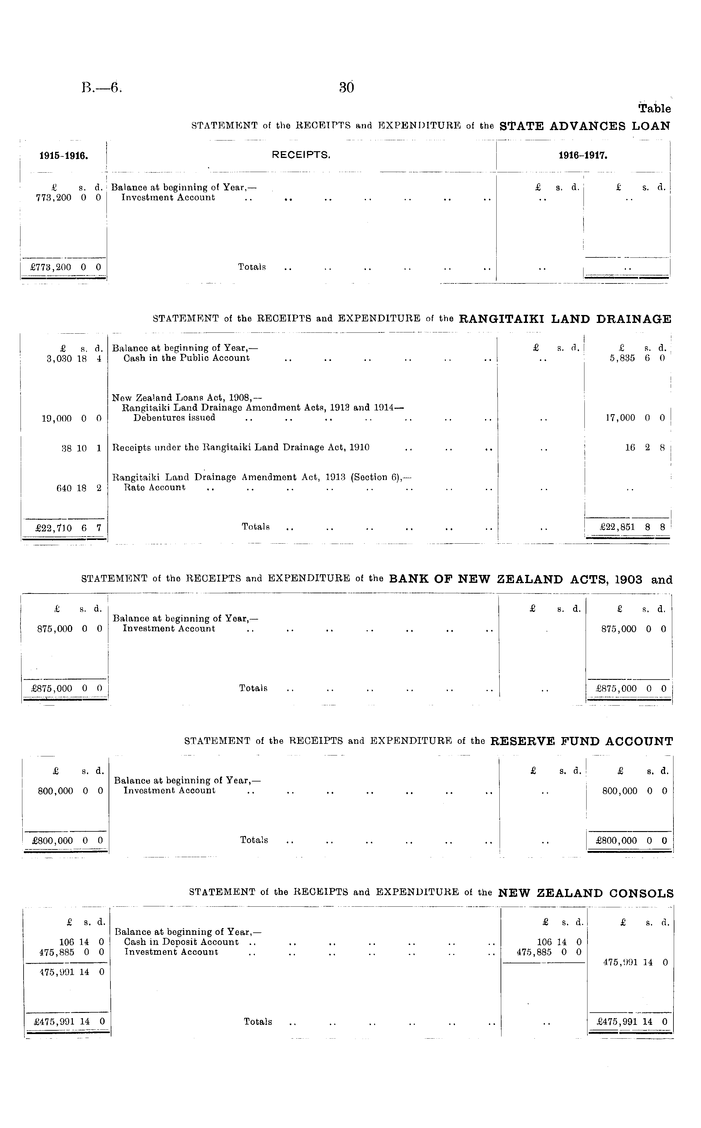 1915-1916. IH 16. RECEIPTS. 1916 1916-1917. I £ s. d. 773,200 0 0 s. d. Balance at beginning of Year, — 0 0 Investment Account £ s. d. £ s. d. £ s. d. 0 0 Totals £773,200 0 0 STATEMENT of the RECEIPTS and EXPENDITURE of the RANG! [TAIKI LAN ITAIKI LAND DRAINAGE £ s. d. 3,030 18 4 s. d. Balance at beginning of Year, — 18 4 Cash in the Publio Account £ a. 6. I £ s. d. 5,835 6 0 £ s. A. 19,000 0 0 New Zealand Loans Act, 1908, — Rangitaiki Land Drainage Amendment Acta, 1913 and 1914— 0 0 Debentures issued 17,000 0 0 38 10 1 10 1 Receipts under the Rangitaiki Land Drainage Act, 1910 16 2 8 640 18 2 Rangitaiki Land Drainage Amendment Act, 1913 (Seotion 6), — 18 2 Rate Account 6 7 Totals £22,851 8 8 £22,710 6 7 STATEMENT of the RECEIPTS and EXPENDITURE of the BANK OF NEW 2 3EALAND A TS, 1903 and £ s. d. s. d. Balance at beginning of Year, — 0 0 Investment Acoount £ s. d. £ s. d. £ s. d. £ s. d. 875,000 0 0 875,000 0 0 875,000 0 0 0 0 Totals £875,000 0 0 £875,000 0 0 STATEMENT of the RECEIPTS and EXPENDITURE of the K ESERVE FUND ACCOUNT ESERVE FU: £ s. d. s. d. Balance at beginning of Year,— 0 0 Investment Acoount £ s. d. [ £ s. d. £ s. d. 800,000 0 0 800,000 0 0 0 0 Totals £800,000 0 0 £800,000 0 0 STATEMENT of the RECEIPTS and EXPENDITURE of the ] MEW ZEALA EW ZEALAND CONSOLS £ 8. d. a. d. Balance at beginning of Year,— 14 0 Cash in Deposit Account .. 0 0 Investment Acoount 14 0 £ s. d 106 14 C 475,885 0 0 £ s. d. £ s. d. 106 14 0 475,885 0 0 106 14 0 475,885 0 0 475,991 14 0 475,991 14 0 14 0 Totals £475,991 14 0 £475,991 14 0