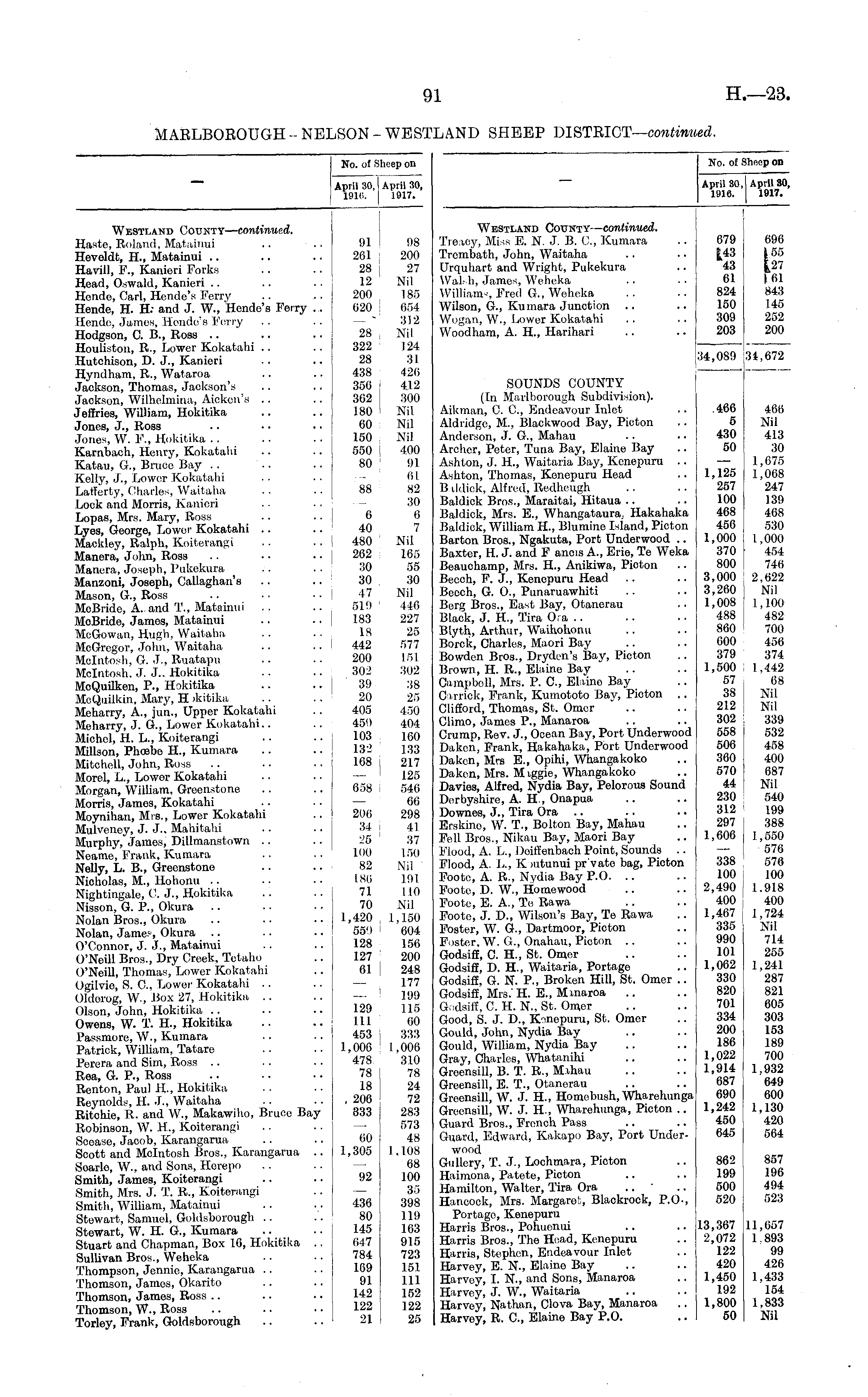 No. of Sheep on April 30, April 30, 1916. 1917. April 30, April 80, 1916. 1917. No. of Sheep on Westland County— continued. Haste, Roland, Matainui .. Hevoldt, H., Matainui Havill, F., Kanieri Forks Head, Oswald, Kanieri Hende, Carl, Hondo's Ferry Hende, H. H.' and J. W., 'Hende's Ferry .. Hende, James, Hende's Ferry Hodgson, C. B., Ross Houliston, R., LoWer Kokatahi Hutchison, D. J., Kanieri Hyndham, R., Wataroa Jackson, Thomas, Jackson's Jackson, Wilhelmina, Aicken's Jeffries, William, Hokitika Jones, J., Ross Jones, W. F., Hokitika Karnbach, Henry, Kokatahi Katau, G., Bruce Bay Kelly, J., Lower Kokatahi Lafterty, Charles, Waitaha Lock and Morris, Kanieri Lopas, Mrs. Mary, Ross .. Lyes, George, Lower Kokatahi Mackley, Ralph, Koiterangi Manera, John, Ross Manera, Joseph, Pukekura Manzoni, Joseph, Callaghan's Mason, G., Ross .. • • ■ • ! MoBride, A-and T., Matainui MoBride, Jamos, Matainui McGowan, Hugh, Waitaha McGregor, John, Waitaha Mcintosh, G. J., Ruatapu Mcintosh. J. J.. Hokitika McQuilken, P., Hokitika McQuilkin, Mary, H ikitika Meharry, A., jun., Upper Kokatahi Meharry, J. G., Lower Kokatahi.. Michel, H. L., Koiterangi Millson, Phoebe H., Kumara Mitchell, John, Ross Morel, L., Lowor Kokatahi Morgan, William, Greenstone Morris, James, Kokatahi Moynihan, Mrs., Lower Kokatahi Mulveney, J. J.. Mahitahi Murphy, Jamos, Dillmanstown Neame, Frank, Kumara Nelly, L. B., Greenstone Nioholas, M., Hohonu Nightingale, C. J., Hokitika Nisson, G. P., Okura Nolan Bros., Okura Nolan, James, Okura O'Connor, J. J., Matainui O'Neill Bros., Dry Creek, Totaho O'Neill, Thomas, Lower Kokatahi Ogilvie, S. G, Lower Kokatahi Oldorog, W., Box 27, Hokitika Olson, John, Hokitika Owens, W. T. H., Hokitika Passmore, W., Kumara Patrick, William, Tatare Perera and Sim, Ross Rea, G. P., Ross Renton, Paul H., Hokitika Reynolds, H. J., Waitaha Ritchie, R. and W., Makawiho, Bruce Bay Robinson, W. H., Koiterangi Scease, Jacob, Karangarua Scott and Mcintosh Bros., Karangarua .. Searle, W., and Sons, Herepo Smith, James, Koiterangi Smith, Mrs. J. T. R., Koiterangi Smith, William, Matainui Stowart, Samuel, Goldsborough Stowart, W. H. G„ Kumara Stuart and Chapman, Box 16, Hokitika .. SulUvan Bros., Wehcka Thompson, Jennie, Karangarua Thomson, James, Okarito Thomson, James, Ross Thomson, W., Ross Torley, Frank, Goldsborough 91 ! 261 28 | 12 I 200 620 28 322 28 438 356 i 302 180 60 150 550 80 88 6 40 480 262 30 30 47 519 183 18 442 200 302 39 20 405 450 103 132 168 658 206 34 , 25 100 82 186 71 70 1,420 559 128 127 61 129 111 453 1,006 478 78 18 , 206 833 60 1,305 92 436 80 145 647 784 169 91 142 122 21 98 200 27 Nil 185 654 312 Nil 124 31 426 412 300 Nil Nil Nil 400 91 01. 82 30 6 7 Nil 165 56 30 Nil 446 227 25 577 151 302 38 25 450 404 160 133 217 125 546 00 298 41 37 150 Nil 191 110 Nil 1,150 604 156 200 248 177 199 115 60 333 1,006 310 78 24 72 283 573 48 1,108 68 100 35 398 119 163 915 723 151 111 152 122 25 Westland County— continued. Treaoy, Miss E. N. J. B. G, Kumara Trembath, John, Waitaha Urquhart and Wright, Pukekura \\';i,l li, James Wcheka Williams Fred G., Weheka Wilson, G., Kumara Junction Wogan, W., Lower Kokatahi Woodham, A. H., Harihari SOUNDS COUNTY (In Marlborough Subdivision). Aikman, C. G, Endeavour Inlet Aldridge, M., Blackwood Bay, Picton Anderson, J. G., Mahau Archer, Peter, Tuna Bay, Elaine Bay Ashton, J. H., Waitaria Bay, Kenepuru .. Ashton, Thomas, Kenepuru Head Baldick, Alfred, Redheugh Baldick Bros., Maraitai, Hitaua Baldick, Mrs. E., Whangataura, Hakahaka Baldick, William IL, Blumine Island, Picton Barton Bros., Ngakuta, Port Underwood .. Baxter, H. J. and F ancis A., Erie, Te Weka Beauchamp, Mrs. H., Anikiwa, Picton Beech, F. J., Kenepuru Head Beech, G. O., Punaruawhiti Borg Bros., East Bay, Otanerau Black, J. H., Tira Ora .. Blyth, Arthur, Waihohonu Borck, Charles, Maori Bay Bowden Bros., Dryden's Bay, Picton Brown, H. R., Elaine Bay Campbell, Mrs. P. G, Eliino Bay Oirrick, Frank, Kumototo Bay, Picton .. Clifford, Thomas, St. Omer Cllmo, James P., Manaroa Crump, Rev. J., Ocean Bay, Port Underwood Daken, Frank, Hakahaka, Port Underwood Daken, Mrs E., Opihi, Whangakoko Daken, Mrs. M iggie, Whangakoko Davies, Alfred, Nydia Bay, Polorous Sound Derbyshire, A. H, Onapua Downes, J., Tira Ora Erskine, W. T., Bolton Bay, Mahau Fell Bros., Nikau Bay, Maori Bay Flood, A. L, Deitfenbach Point, Sounds .. Flood, A. L., K mtunui private bag, Picton Foote, A. R., Nydia Bay P.O. Foote, D. W., Homewood Foote, E. A., Te Rawa Foote, J. D., Wilson's Bay, Te Rawa Foster, W. G., Dartmoor, Picton F.istcr.W. G., Onahau, Picton .. Godsiff, G H, St. Omer Godsiff, D. H, Waitaria, Portage Godsiff, G. N. P., Broken Hill, St. Omer .. Godsiff, Mrs.' H. E., Mmaroa Godsiff, C. H. N., St. Omer Good, S. J. D., Kenepuru, St. Omer Gould, John, Nydia Bay Gould, William, Nydia Bay Gray, Charles, Whatanihi Grccnsill, B. T. R., Mihau Grcensill, E. T., Otanerau Grcensill, W. J. H, Homebush, Wharehunga Grcensill, W. J. H, Wharehunga, Picton .. Guard Bros., French Pass Guard, Edward, Kakapo Bay, Port Underwood Gullcry, T. J., Lochmara, Picton Haimona, Patete, Picton Hamilton, Walter, Tira Ora Hancock, Mrs. Margate,, Blackrock, P.O-, Portage, Kenepuru Harris Bros., Pohuenui Harris Bros., The Head, Kenepuru Harris, Stephen, Endeavour Inlet Harvey, E. N., Elaine Bay Harvoy, I. N., and Sons, Manaroa Harvey, J. W, Waitaria Harvey, Nathan, Clova Bay, Manaroa Harvey, R. G, Elaine Bay P.O. 34,089 .466 5 430 50 1,125 257 100 468 456 1,000 370 800 3,000 3,200 1,008 488 860 600 379 1,500 57 38 212 302 558 506 360 570 44 230 312 297 1,600 679 1,43 43 61 824 150 309 203 34,672 466 Nil 413 30 1,675 1,068 247 139 468 530 1,000 454 746 2.022 Nil 1,100 482 700 456 374 1,442 68 Nil Nil 339 532 458 400 687 Nil 540 199 388 I 1,550 576 576 100 1.918 400 1,724 Nil 714 255 1,241 287 821 605 303 153 189 700 1.932 649 600 1,130 420 564 090 | 55 127 Mil 843 145 252 200 338 100 2,490 400 1,467 335 990 101 1,062 330 820 701 334 200 186 1,022 1,914 68