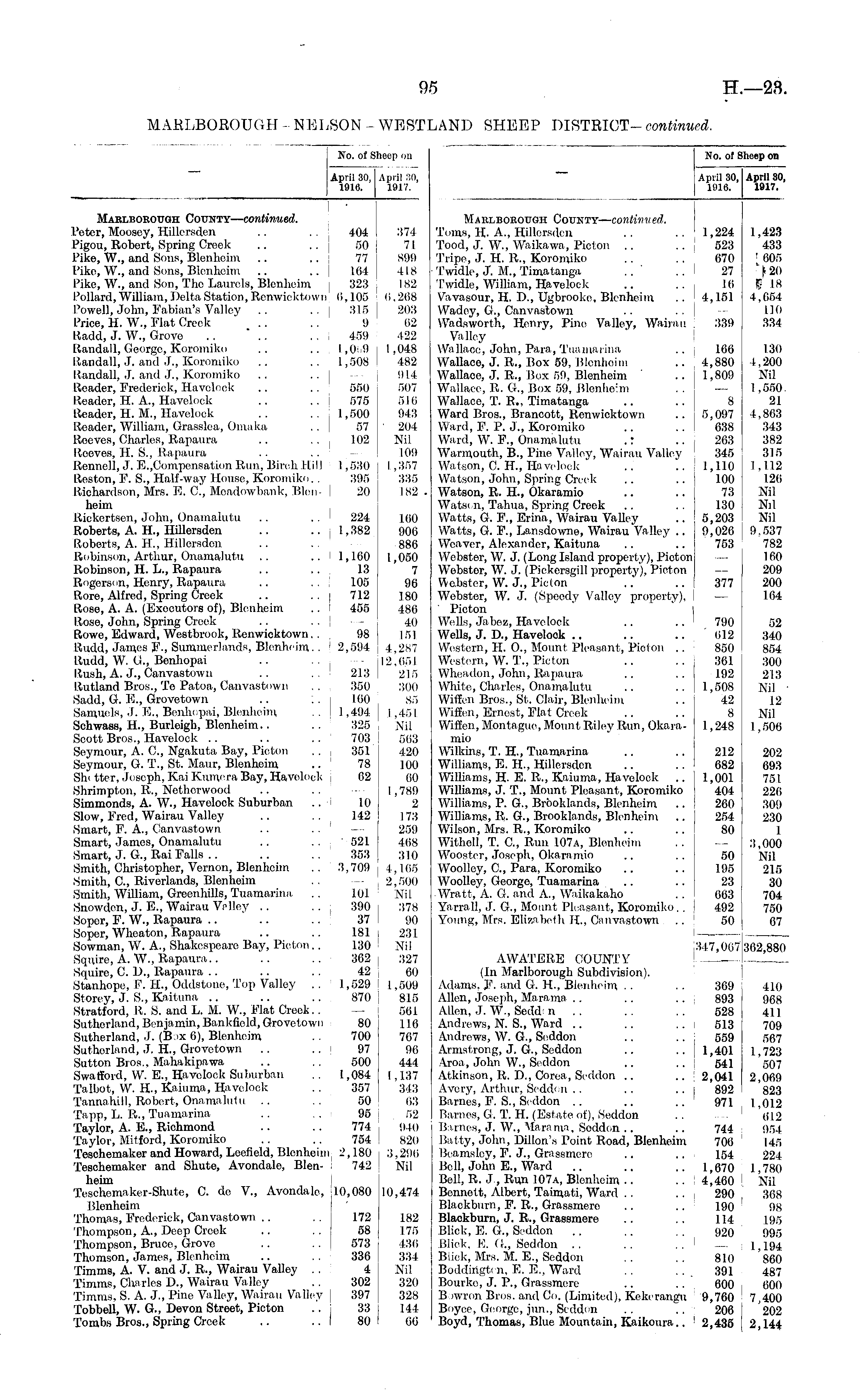 No. of Sheep on April 30, April :!(), 1916. 1917. No. of Sheep on April 30, 11116. April 30, 1917. ] • Marlborough County— continued. Peter, Moosey, HiUcrsden .. .. 404 Pigou, Robort, Spring Creek ... .. 50 Pike, W., and Sons, Blenheim .. .. 77 Piko, W., and Sons, Blenhoim .. .. 164 Pike, W., and Son, The Laurels, Blenheim 323 Pollard, William, Delta Station, Renwicktown 0,105 Powell, John, Fabian's Valley .. 315 Price, H. W., Flat Creek .. . . 9 ltadd, J. W., Grove .. " .. . . 459 Randall, George, Koromiko .. .. 1,0 9 Randall, J. and <L, Koromiko .. .. 1,508 Randall, J. and J., Koromiko Reader, Frederick, Havelock .. .. 550 Reader, H. A., Havelock .. .. 575 Reader, H. M., Havelock .. .. 1,500 Reader, William, Grasslea, Omaka .. 57 Reeves, Charles, Rapaura .. .. 102 Rooves, H. S., Rapaura Ronncll, J. E.,Compensation Run, Birch Hill 1,530 Iteston, F. S., Half-way House, Koromiko. . 395 Richardson, Mrs. E. G, Meadowbank, Bleu- ! 20 heim Rickertsen, John, Onamalutu .. . . 224 Roberts, A. H., HiUersden .. . . 1,382 Roborts, A. H., Hillersden Robinson, Arthur, Onamalutu .. .. 1,160 Robinson, H. L., Rapaura .. .. 13 Rogersi n, Henry, Rapaura .. .. 105 Rore, Alfred, Spring Creek .. .. 712 Rose, A. A. (Executors of), Blenheim .. 455 Rose, John, Spring Creek Rowe, Edward, Westbrook, Renwicktown. . 98 Rudd, .Tames F., Summerlands, Blenheim. . 2,594 Rudd, W. G., Benhopai Rush, A. J., Canvastown .. . . 213 Rutland Bros., Te Patoa, Canvastown .. , 350 Sadd, G. E., Grovetown .. :. I 160 Samuels, J. E., Benhopai, Blenheim . , 1,494 Schwass, H., Burleigh, Blenheim.. . . 325 Scott Bros., Havelock .. .. .. 703 Seymour, A. C, Ngakuta Bay, Picton . . , 351 Seymour, G. T., St. Maur, Blenheim .. 78 Shi tter, Joseph, Kai Kumera Bay, Havelock 02 Shrimpton, It., Netherwood Simmonds, A. W., Havelock Suburban .. 10 Slow, Fred, Wairau Valley .. .. 142 Smart, F. A., Canvastown Smart, James, Onamalutu .. .. '521 Smart, J. G., Rai Falls .. .. . . 353 Smith, Christopher, Vernon, Blonhoim .. 3,709 Smith, G, Rivcriands, Blenheim Smith, WUliam, Greenhills, Tuamarina, .. 101 Snowdon, J. E., Wairau Vdley .. ... 390 Sopor, P. W., Rapaura .. .. .. j 37 Sopor, Whcaton, Rapaura .. .. 181 Sowman, W. A., Shakespeare Bay, Picton.. 130 Squire, A. W., Rapaura.. .. .. 302 Squire, C. D.„ Rapaura .. .. . . 42 Stanhope;, F. TL, Oddstone, Top Valley . . 1,529 Storey, J. S., Kaituna .. .. .. 870 Stratford, it. S. and L. M. W., Flat Creek. . Sutherland, Benjamin, Bankfield, Grovctown 80 Sutherland, •). (B >x 6), Blenheim .. 700 Sutherland, J. H., Grovetown .. .. 97 Sutton Bros., Mahakipawa .. .. 500 Swafford, W. E., Havelock Suburban .. 1,084 Talbot, W. H, Kaiuma, Havelock . . 357 Tannahill, Robert, Onamalutu .. .. 50 Tapp, L. R., Tuamarina . . .. 95 Taylor, A. E., Richmond .. .. 774 Taylor, Mil ford, Koromiko .. .. 754 Teschemaker and Howard, Leefield, Blenheim 2,180 Teschemaker and Shute, Avondalo, Blen- 742 heim Teschemakcr-Shute, 0. de V., Avondalo, 10,080 Blonhoim Thomas, Frederick, Canvastown .. 172 'Thompson, A., Deep Creek .. . . 58 Thompson, Bruce, Grove .. .. 573 Thomson, James, Blenheim .. .. 336 Timms, A. V. and J. It., Wairau Valley .. 4 Timms, Charles D„ Wairau Valley .. 302 Timms, S. A. J., Pine Valley, Wairau Valley 397 TobbeU, W. G., Devon Street, Picton .. 33 Tombs Bros., Spring Creek .. .. 80 374 71 899 418 182 0,268 203 62 422 1,048 482 914 507 510 94 3 ' 204 Nil 109 I , 357 335 182 . 100 906 886 1,050 7 96 180 486 40 151 4.2S7 12,051 215 300 85 I ,451 Nil 503 420 100 00 I , 789 2 173 259 468 310 1,105 2,500 Nil 378 90 231 Nil 327 60 1,509 815 561 116 767 96 444 1,137 343 03 52 910 820 3,296 Nil Marlborough County— continued. Toms, H. A., Hillcrsdcn .. 1,224 1,423 Tood, J. W., Waikawa, Picton .. .. 523 433 'Tripe, J. H. It., Koromiko .. .. 670 [ 005 T'widle, J. M., Timatanga ..' .. 27 J20 Twidle, William, Havelock .. ... 16 6 18 Vavasour, H. D., Ugbrooke, Blenheim .. ' 4,151 4,654 Wadey, G., Canvastown .. ..I 110 Wadsworth, Henry, Pine Valley, Wairau 339 334 Valloy Wallace, John, Para,'Tua ma lira .. 166 130 Wallace, J. R., Box 59, Blenheim .. 4,880 4.200 Wallace, J. R., Box 59, Blenheim .. I 1,809 Nil Wallace, R. G., Box .59, Blenhe : m .. 1,550. Wallace, T. R„ Timatanga .. .. 8 21 Ward Bros., Brancott, Renwicktown .. ,5,097 4,803 Ward, F. P. J., Koromiko .. .. I 638 343 Ward, W. F., Onamalutu .: ... 263 382 Warmouth, B., Pine Valley, Wairau Valley ! 345 315 Watson, C. IT., Havelock . . .. 1,110 I , 112 Watson, John, Spring Creek .. .. 100 126 Watson, R. H., Okaramio .. .. 73 Nil Watson, Tahua, Spring Creek .. .. 130 Nil Watts, G. F., Erina, Wairau VaUev .. 5,203 Nil Watts, G. F., Lansdowne, Wairau Valley .. 9,026 j 9.537 Weaver, Alexander, Kaituna .. .. 753 782 Webster, W. J. (Long Island property), Picton 160 Webstor, W. J. (Pickersgill property), Picton — 209 Webster, W. J., Pic I on .. .. 377 200 Webstor, W. J. (Speedy Valley property), ! — 164 Picton Wells, Jaboz, Havelock .. .. 790 52 Wells, J. D., Havelock .. .. .. 012 340 Western, H. O., Mount Pleasant, Picton .. 850 854 Western, W. T., Picton .. .. 361 300 Wheadon, John, Rapaura .. .. 192 213 White, Charles, Onamalutu .. .. 1,508 1STiI Wiffen Bros., St. Clair, Blenheim .. 42 12 Wiffen, Ernest, Flat Creek .. .. 8 Nil Wiffen, Montague, Mount Riley Run, Okara- 1,248 1,500 mio Wilkins, T. H., Tuamarina .. .. 212 202 Williams, E. H., Hillersden .. .. 682 093 Williams, H. E. R., Kaiuma, Havelock .. | 1,001 751 Williams, J. T., Mount Pleasant, Koromiko 404 220 Williams, P. G., Brooklands, Blenheim .. ' 260 309 Williams, It. G., Brooklands, Blenheim .. 254 230 Wilson, Mrs. R., Koromiko .. .. 80 1 Withell, T. G, Run 107a, Blenheim .. — 3,000 Wooster, Joseph, Okaramio .. .. 50 Nil Woolley, G, Para, Koromiko .. .. 195 215 Woolley, George, Tuamarina .. .. 23 j 30 Wratt,'A. O. and A., Waikakaho .. 663 1 704 Yarrall, J. G., Mount Pleasant, Koromiko. . I 492 750 Young, Mrs. Elizabeth TL, Canvastown .. 50 67 1347,007 302,880 AWATERE COUNTY ' (In Marlboroug