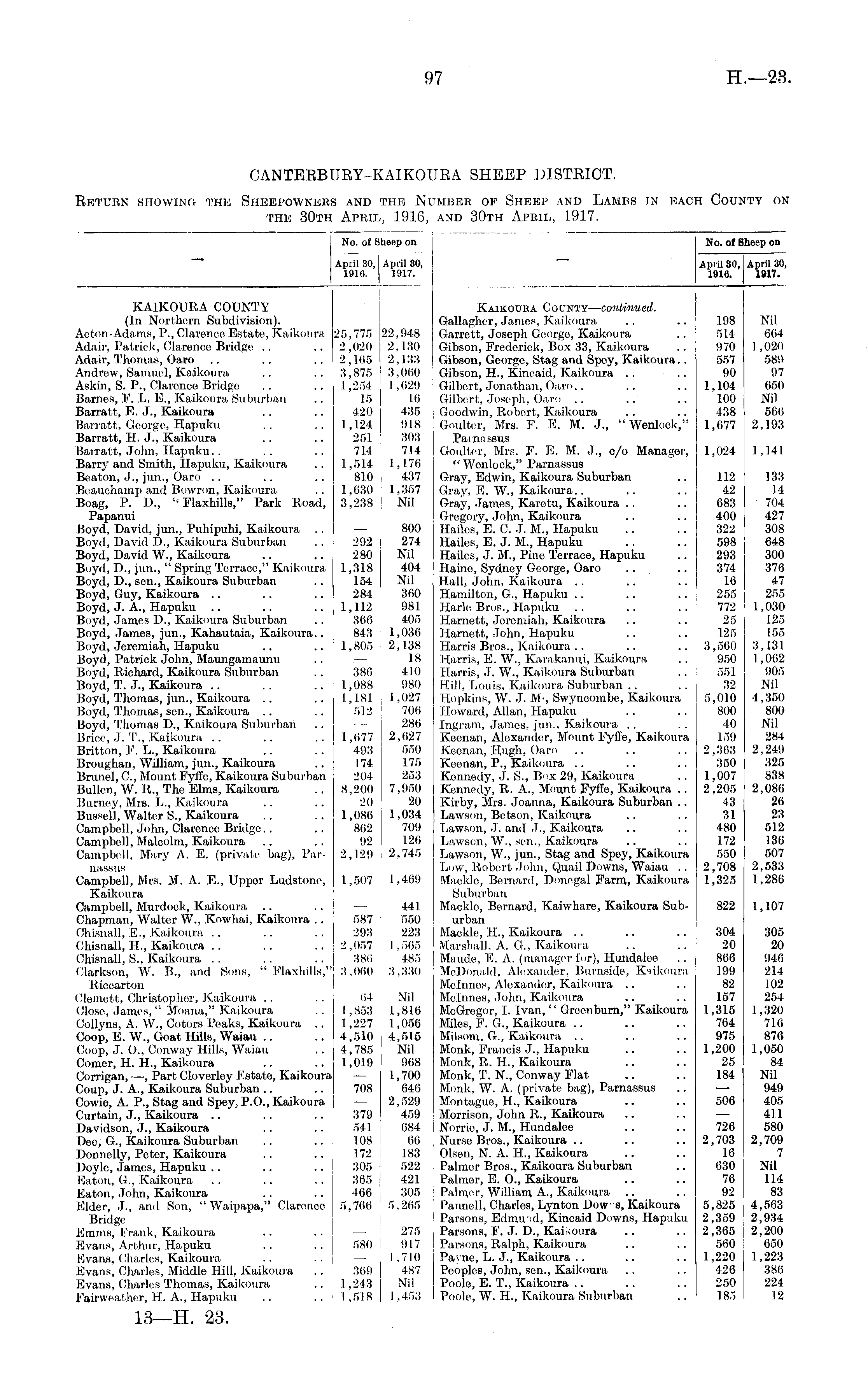 CANTERBURY-KAIKOURA SHEEP DISTRICT. Return showing the Sheepowners and the Number of Sheep and Lambs in each County on the 30th April, 1916, and 30th April, 1917.
