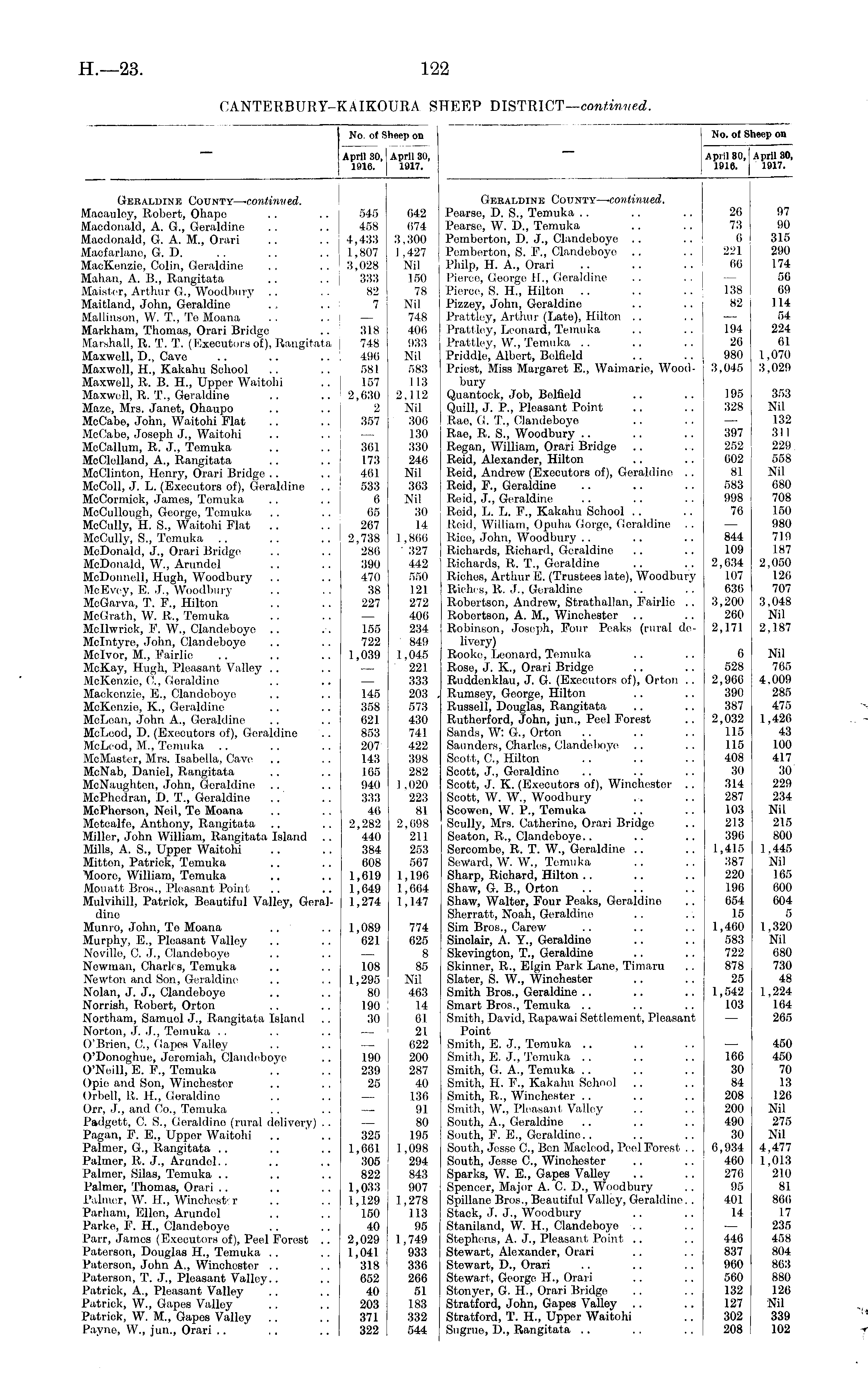 No. of Sheep on April 30, i April 30, 1916. | 1917. April 80, April 30, 1916. 1917. No. of Sheep on Geraldine County— -continued. Macau ley, Robert, Ohape Macdonald, A. G., Geraldine Macdonald, G. A. M., Orari Macfarlano, G. D. MacKenzio, Colin, Geraldine Mahan, A. B., Rangitata Maister, Arthur G., Woodbury Maitland, John, Geraldine Mallinson, W. T., Te Moana Markham, Thomas, Orari Bridge Marshall, R. T. T. (Executors of), Rangitata Maxwell, D., Cave Maxwell, H., Kakahu School Maxwell, R. B. H., Upper Waitohi Maxwell, R. T., Geraldine Maze, Mrs. Janet, Ohaupo McCabe, John, Waitohi Flat McCabe, Joseph J., Waitohi McCallum, It. J., Temuka McClelland, A., Rangitata McClinton, Henry, Orari Bridge McColl, J. L. (Executors of), Geraldine .. McCormick, James, Temuka McCullough, George, Temuka McCully, H. S., Waitohi Flat McCully, S., Temuka McDonald, J., Orari Bridge McDonald, W., Arundel McDonnell, Hugh, Woodbury McEvey, E. J., Woodbury McGarva, T. F., Hilton McGrath, W. It., Temuka Mcllwrick, P. W., Clandeboye Mdntyre, John, Clandeboye Mclvor, M, Fairlic McKay, Hugh, Pleasant Valley McKenzie, (!., Geraldine Mackonzie, E., Clandeboye McKenzie, K., Geraldine McLean, John A., Geraldine McLood, D. (Executors of), Goraldine McLeod, M., Temuka MeMaster, Mrs. Isabella, Cavo McNab, Daniel, Rangitata McNaughton, John, Geraldine McPhodran, D. T., Geraldine McPhorson, Neil, Te Moana Metcalfo, Anthony, Rangitata Miller, John William, Rangitata Island Mills, A. S., Upper Waitohi Mitten, Patrick, Temuka Moore, William, Temuka Mouatt Bros., Pleasant Point Mulvihill, Patrick, Beautiful Valley, Geraldino Munro, John, Te Moana Murphy, E., Pleasant Valley Neville, G J., Clandeboye Nowman, Charles, Temuka Newton and Son, Geraldine Nolan, J. J., Clandeboye Norrish, Robert, Orton Northam, Samuol J., Rangitata Island Norton, J. J., Temuka O'Brien, G, Gapes Valley O'Donoghue, Jeromiah, Clandeboye O'Neill, E. F., Temuka Opie and Son, Winchester Orbell, It. H., Goraldine Orr, J., and Co., Temuka Padgett, G S., Geraldine (rural delivery) .. Pagan, F. E., Uppor Waitohi Palmor, G., Rangitata Palmor, It. J., Arundel. . Palmer, Silas, Tomuka Palmer, Thomas, Orari Palmer, W. H., Winchcst- r Parham, Ellon, Arundol Parke, F, H., Clandeboye Parr, James (Executors of), Peel Forest .. Paterson, Douglas H., Temuka Paterson, John A., Winchester Paterson, T. J., Pleasant Valley.. Patrick, A., Pleasant Valley Patrick, W., Gapes Valloy Patrick, W. M., Gapes Valley Payne, W., jun., Orari 545 458 4,433 1,807 3,028 333 82 7 318 748 490 581 157 2,030 2 357 301 173 401 533 0 05 267 2,738 286 390 470 38 227 155 722 1,039 145 358 621 853 207 143 165 940 333 46 2,282 440 384 608 1,619 1,649 1,274 042 674 3,300 1,427 Nil 150 78 Nil 748 406 933 Nil 583 113 2.112 Nil 306 130 330 246 Nil 363 Nil 30 14 1,800 ' 327 442 550 121 272 406 234 849 1,045 221 333 203 573 430 741 422 398 282 1,020 223 81 2,098 211 253 567 1,196 1,604 1,147 Geraldine County— continued. Pearse, D. S., Temuka Pearse, W. D., Tomuka Pemberton, D. J., Clandeboye Pemberton, S. P., Clandeboye Philp, H. A., Orari Pierce, Georgo IT., Geraldine Pierce, S. H., Hilton Pizzey, John, Geraldine Prattley, Arthur (Late), Hilton Prattley, Leonard, Temuka Prattley, W., Temuka Priddle, Albert, Belfield Priest, Miss Margaret E., Waimarie, Woodbury Quantock, Job, Belfield Quill, J. P., Pleasant Point Rae, G. T., Clandeboye Rae, R. S., Woodbury Regan, William, Orari Bridge Reid, Alexander, Hilton Reid, Andrew (Executors of), Geraldine .. Reid, P., Geraldine Roid, J., Geraldine Reid, L. L. F., Kakahu School Reid, William, Opuha Gorge, Geraldine .. Rice, John, Woodbury Richards, Richard, Geraldine Richards, R. T., Geraldine Riches, Arthur B. (Trustees late), Woodbury Riches, It. .1.. Geraldine Robertson, Andrew, Strathallan, Fairlie . . Robertson, A. M., Winchester Robinson, Joseph, Four Peaks (rural delivery) Rookc, Leonard, Temuka Rose, J. K, Orari Bridge Ruddenklau, J. G. (Executors of), Orton .. Rumsey, George, Hilton Russell, Douglas, Rangitata Rutherford, John, jun., Peel Forest Sands, W: G., Orton Saunders, Charles, Clandeboye Scott, G, Hilton Scott, J., Geraldino Scott, J. K. (Executors of), Winchester .. Scott, W. W., Woodbury Scowon, W. P., Temuka Scully, Mrs. Catherine, Orari Bridge Seaton, R., Clandeboye.. Sercombe, R. T. W., Geraldine Seward, W. W., Temuka Sharp, Richard, Hilton Shaw, G. B., Orton Shaw, Walter, Four Peaks, Geraldino Sherratt, Noah, Geraldine Sim Bros., Carew Sinclair, A. Y., Geraldine Skevington, T., Geraldine Skinner, It., Elgin Park Lane, Timaru Slater, S. W., Winchester Smith Bros., Geraldine Smart Bros., Temuka Smith, David, Rapawai Settlement, Pleasant Point Smith, E. J., Tomuka .. Smith, E. J., Temuka Smith, G. A., Temuka Smith, H. P., Kakahu School Smith, R., Winchester Smith, W., Pleasant, Valley South, A., Geraldine South, F. E., Geraldino.. South, Jesse G, Ben Macleod, Peed Forest . . South, Jesse G, Winchester Sparks, W. E., Gapes VaUey Spencer, Major A. C. D., Woodbury Spillane Bros., Beautiful Valloy, Geraldine. . Stack, J. J., Woodbury Staniland, W. H., Clandeboye Stephens, A. J., Pleasant Point Stewart, Alexander, Orari Stewart, D., Orari Stewart, George H., Orari Stonyer, G. IL, Orari Bridge Stratford, John, Gapes Valley Stratford, T. IL, Upper Waitohi Sugrue, D., Rangitata 26 73 (i 221 00 138 82 194 26 980 3,045 195 328 397 252 002 81 583 998 70 844 109 2,034 107 636 3,200 260 2,171 0 528 2,900 390 387 2,032 1.15 115 408 30 314 287 103 213 390 1,415 387 220 196 654 15 1,460 583 722 878 25 1,542 103 97 90 315 290 174 50 09 114 54 224 01 1 ,070 3,029 353 Nil 132 311 229 558 Nil 680 708 150 980 719 187 2,050 126 707 3,048 Nil 2,187 Nil 705 4,009 285 475 1,420 43 100 417 30 229 234 Nil 215 800 1,445 Nil 165 600 604 5 1,320 Nil 080 730 48 1,224 164 265 1,089 621 I os 1,295 80 190 30 190 239 25 774 625 8 85 Nil 463 14 61 21 622 200 287 40 136 91 80 195 I ,098 294 843 907 1,278 113 95 1,749 933 336 266 51 183 332 544 166 30 84 208 200 490 30 6,934 460 27