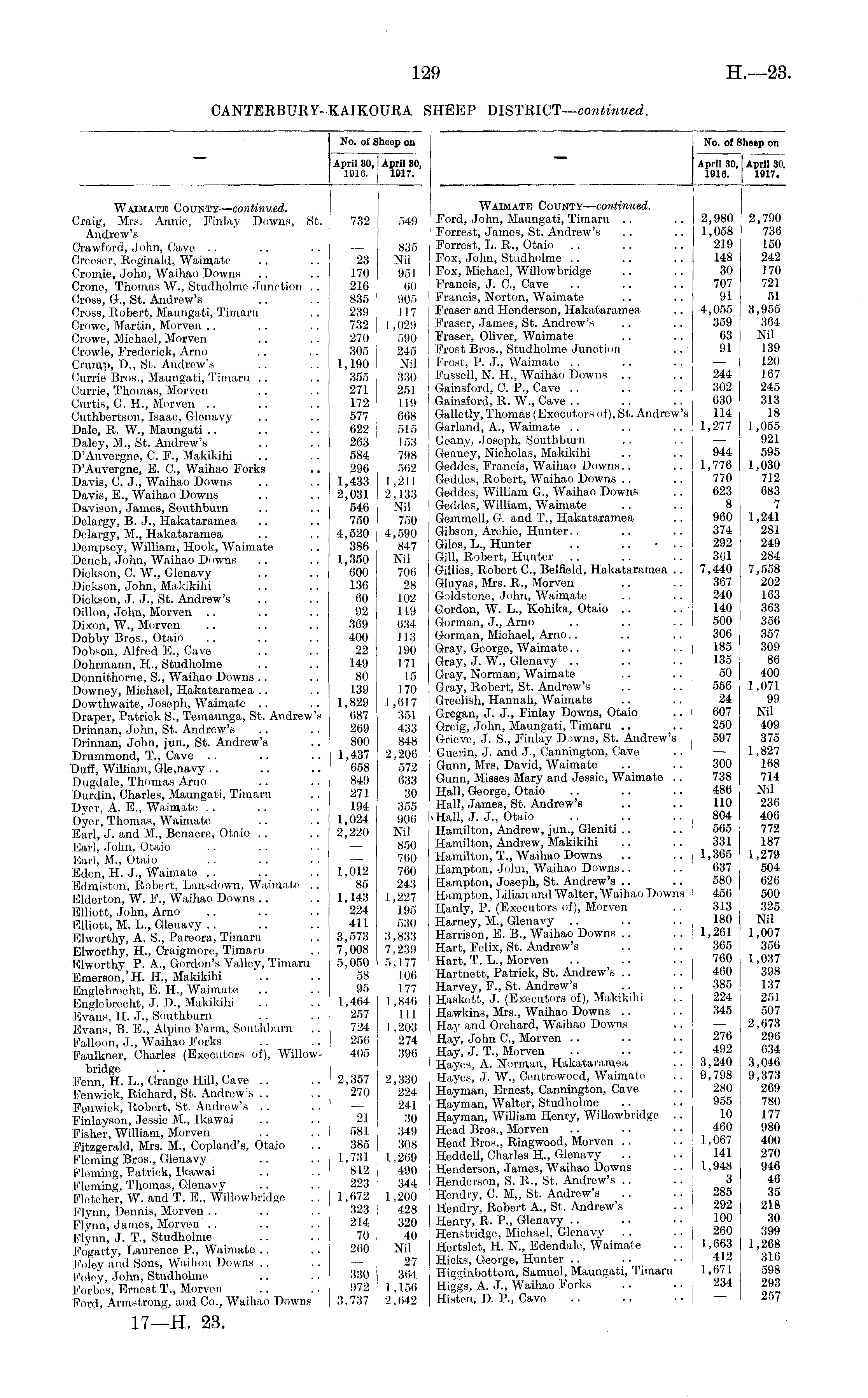 No. of Sheep on No. of Sheep on April 80, April 80, 1916. 1917. April .30,1 April 30, 1916. | 1917. Waimate County— continued. Craig, Mrs. Annie, Finlay Downs, St. Andrew's Crawford, John, Gave Creesor, Reginald, Waimate Cromie, John, Waihao Downs Crone, Thomas W., Studholme Junction . . Cross, G., St. Andrew's Cross, Robert, Maungati, Timaru Crowe, Martin, Morven Crowe, Michael, Morven Crowle, Frederick, Arno Crump, D., St. Andrew's Currie Bros., Maungati, Timaru Currie, Thomas, Morven Curtis, G. H., Morven Cuthbertson, Isaac, Glenavy Dale, R. W., Maungati Daley, M., St. Andrew's D'Auvergne, G P., Makikihi D'Auvergne, E. G, Waihao Forks Davis, C. J., Waihao Downs Davis, E., Waihao Downs Davison, James, Southburn Delargy, B. J., Hakataramea Delargy, M., Hakataramea Dempsey, William, Hook, Waimate Dench, John, Waihao Downs Dickson, C. W., Glenavy Dickson, John, Makikihi Dickson, J. J., St. Andrew's Dillon, John, Morven Dixon, W., Morven Dobby Bros., Otaio Dobson, Alfred E., Cave Dohrmann, H., Studholme Donnithorne, S., Waihao Downs Downey, Michael, Hakataramea Dowthwaite, Josoph, Waimate Draper, Patrick S., Temaunga, St. Andrew's Drinnan, John, St. Andrew's Drinnan, John, jun., St. Andrew's Drummond, T., Cave Duff, WiUiam, Gle,navy Dugdale, Thomas Arno Durdin, Charles, Maungati, Timaru Dyer, A. E., Waimate Dyer, Thomas, Waimate Earl, J. and M., Benacre, Otaio Earl, John, Otaio Earl, M., Otaio Eden, IT. J., Waimate Edmistnn, Robert, Lansdown, Waimate . . Elderton, W. F., Waihao Downs Elliott, John, Arno Elliott, M. L., Glenavy Elworthy, A. S., Pareora, Timaru Elworthy, H., Craigmorc, Timaru Elworthy P. A., Gordon's Valley, Timaru Emerson,' H. IL, Makikihi Englebrccht, E. IL, Waimate Englebrecht, J. D., Makikihi Evans, H. J., Southburn Evans, B. E., Alpine Farm, Southburn Falloon, J., Waihao Forks Faulkner, Charles (Executors of), Willowbridge Fenn, H. L., Grange Hill, Cave Fenwick, Richard, St. Andrew's Femviok, Robert, St. Andrew's Finlayson, Jessie M., Ikawai Fisher, William, Morven Fitzgerald, Mrs. M., Copland's, Otaio Fleming Bros., Glenavy Fleming, Patrick, Ikawai Fleming, Thomas, Glenavy Fletcher, W. and T. E., Willowbridge Flynn, Dennis, Morven Flynn, Jamos, Morven Flynn, J. T., Studholme Fogarty, Laurence P., Waimate Foley and Sons, Waihou Downs Foley, John, Studholme Forbes, Ernest T., Morven Ford, Armstrong, and Co., Waihao Downs 732 23 T70 216 835 239 732 270 305 1,190 355 271 172 577 622 263 584 296 1,433 2,031 546 750 4,520 386 1,350 600 136 60 92 369 400 22 149 80 139 1,829 687 269 800 1,437 658 849 271 194 1,024 2,220 549 835 Nil 951 60 905 117 1 ,029 590 245 Nil 330 251 119 668 515 153 798 .562 1,211 2,133 Nil 750 4,590 847 Nil 706 28 102 119 634 113 190 171 15 170 1,617 351 433 848 2,200 572 633 30 355 906 Nil 8,50 760 760 243 1,227 195 .530 3,833 7,239 5,177 106 177 1,840 111 I ,203 274 390 Waimate County— continued. Ford, John, Maungati, Timaru Forrest, James, St. Andrew's Forrest, Ii. R., Otaio Fox, John, Studholme Fox, Michael, Willowbridge Francis, J. G, Cave Francis, Norton, Waimate Fraser and Henderson, Hakataramea Fraser, James, St. Andrew's Fraser, Oliver, Waimate Frost Bros., Studholme Junction Frost, P. J., Waimate Fussell, N. H., Waihao Downs Gainsford, C. P., Cave Gainsford, R. W., Cave Galletly, Thomas (Exocutors of), St. Andrew's Garland, A., Waimate Geany, Joseph, Southburn Geaney, Nicholas, Makikihi Geddes, Francis, Waihao Downs.. Geddes, Robert, Waihao Downs Geddes, William G., Waihao Downs Geddes, William, Waimate Gemmell, G. and T., Hakataramea Gibson, Archie, Hunter.. Giles, L., Hunter .. .. - Gill, Robert, Hunter Gillies, Robert C, Belfield, Hakataramea .. Gluyas, Mrs. R., Morven Goldstone, John, Waimate Gordon, W. L., Kohika, Otaio Gorman, J., Arno Gorman, Michael, Arno Gray, George, Waimate.. Gray, J. W., Glenavy Gray, Norman, Waimate Gray, Robert, St. Andrew's Greelish, Hannah, Waimate Gregan, J. J., Finlay Downs, Otaio Greig, John, Maungati, Timaru Grieve, J. S., Finlay Downs, St. Andrew's Gucrin, J. and J., Cannington, Cave Gunn, Mrs. David, Waimate Gunn, Misses Mary and Jessie, Waimate .. Hall, George, Otaio Hall, Jamos, St. Andrew's ■ Hall, J. J., Otaio Hamilton, Androw, jun., Gleniti Hamilton, Andrew, Makikihi Hamilton, T., Waihao Downs Hampton, John, Waihao Downs Hampton, Joseph, St. Andrew's Hampton, Lilian and Walter, Waihao Downs Hanly, P. (Executors of), Morven Harney, M., Glenavy Harrison, E. B., Waihao Downs Hart, Felix, St. Andrew's Hart, T. L„ Morven Hartnett, Patrick, St. Andrew's Harvey, F., St. Andrew's Haskett, J. (Executors of), Makikihi Hawkins, Mrs., Waihao Downs Hay and Orchard, Waihao Downs Hay, John C, Morven Hay, J. T., Morven Hayes, A. Norman, Hakataramea Hayes, J. W., Centrewocd, Waimate Hayman, Ernest, Cannington, Cave Hayman, Walter, Studholme Hayman, William Honry, Willowbridge .. Head Bros., Morven Head Bros., Ringwood, Morven Heddell, Charles TL, Glenavy Henderson, James, Waihao Downs Henderson, S. R., St. Andrew's Hendry, 0. M„ St. Andrew's Hendry, Robert A., St. Andrew's Henry, R. P., Glenavy Henstridge, Michael, Glenavy Hertslet, H. N., Edendale, Waimate Hicks, George, Hunter Higginbottom, Samuel, Maungati, 'Timaru Higgs, A. J., Waihao Forks Histen, D. P., Cavo 2,980 1,058 219 148 30 707 91 4,055 359 63 91 244 302 630 114 1,277 944 1,770 770 623 8 960 374 292 361 7,440 367 240 140 500 306 185 135 50 556 24 607 250 597 300 738 486 110 804 565 331 1,365 037 580 456 313 180 1,261 365 760 460 385 224 345 2,790 736 150 242 170 721 51 3,955 364 Nil 139 120 167 245 313 18 1,055 921 595 1,030 712 683 7 1,241 281 249 284 7,558 202 163 363 356 357 309 80 400 1,071 99 Nil 409 375 1,827 168 714 Nil 236 400 772 187 I ,279 504 026 500 325 Nil 1,007 350 1,037 398 137 251 507 2,673 290 034 3,046 9,373 209 780 177 980 400 270 946 46 35 218 30 399 1,208 316 .598 293 257 1,012 85 1,143 224 411 3,573 7,008 5,050 58 95 1,464 257 724 256 405 2,357 270 21 581 385 1,731 812 223 1,072 323 214 70 260 2,330 224 241 30 349 308 I ,2