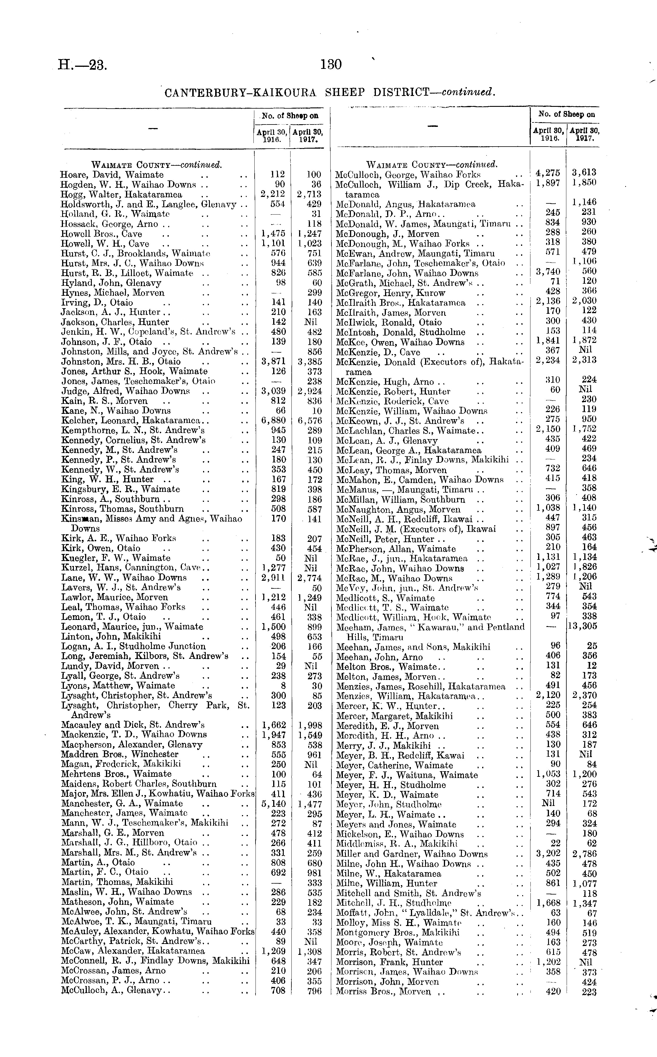 .No. of Shespon April 30, April 30, 1916. 1917. April 30, April 30, 1916. 1917. No. of Sheep on Waimate County— continued. Hoare, David, Waimate Hogden, W. H., Waihao Downs Hogg, Walter, Hakataramea Holdsworth, J. and E., Langlee, Glenavy .. Holland, Or. It., Waimate Hossack, George, Arno Howell Bros., Cave Howell, W. H., Cave Hurst, C. J., Brooklands, Waimate Hurst, Mrs. J. C, Waihao Downs Hurst, R. B., Lilloet, Waimate Hyland, John, Glenavy Hynos, Michael, Morven Irving, D., Otaio Jackson, A. J., Hunter Jackson, Charles, Hunter Jenkin, TL W., Copeland's, St. Andrew's . . Johnson, J. F., Otaio Johnston, Mills, and Joyce, St. Andrew's . . Johnston, Mrs. H. B., Otaio Jones, Arthur S., Hook, Waimate Jones, James, Teschemaker's, Otaio Judge, Alfred, Waihao Downs Kain, R. S., Morven Kane, N., Waihao Downs Kelcher, Leonard, Hakataramea Kempthorne, L. N., St. Andrew's Kennedy, Cornelius, St. Andrew's Kennedy, M., St. Andrew's Kennedy, P., St. Andrew's Kennedy, W., St. Andrew's King, W. H., Hunter Kingsbury, E. R., Waimate Kinross, A., Southburn Kinross, Thomas, Southburn Kinsman, Misses Amy and Agnes, Waihao Downs Kirk, A. E., Waihao Forks Kirk, Owen, Otaio Kuegler, F. W., Waimate Kurzel, Hans, Cannington, Cave Lane, W. W., Waihao Downs Lavers, W. J., St. Andrew's Lawlor, Maurice, Morven Leal, Thomas, Waihao Forks Lemon, T. J., Otaio Leonard, Maurice, jun., Waimate Linton, John, Makikihi Logan, A. I., Studholme Junction Long, Jeremiah, Kilbors, St. Andrew's Lundy, David, Morven Lyall, George, St. Andrew's Lyons, Matthew, Waimate Lysaght, Christopher, St. Andrew's Lysaght, Christopher, Cherry Park, St. Andrew's Macauley and Dick, St. Andrew's Mackenzie, T. D., Waihao Downs Macpherson, Alexander, Glenavy Maddren Bros., Winchester Magan, Frederick, Makikiki Mehrtens Bros., Waimate Maidens, Robert Charles, Southburn Major, Mrs. Ellen J., Kowhatiu, Waihao Forks Manchester, G. A., Waimate Manchester, James, Waimate; Mann, W. J., Teschemaker's, Makikihi Marshall, G. E., Morven Marshall, J. G., Hillboro, Otaio Marshall, Mrs. M., St. Andrew's Martin, A., Otaio Martin, F. C, Otaio Martin, Thomas, Makikihi Maslin, W. IL, Waihao Downs Matheson, John, Waimate McAlwco, John, St. Andrew's McAlwee, T. K, Maungati, Timaru McAuley, Alexander, Kowhatu, Waihao Forks McCarthy, Patrick, St. Andrew's McCaw, Alexander, Hakataramea McConneU, R. J., Findlay Downs, Makikihi McCrossan, James, Arno McCrossan, P. J., Arno .. McCulloch, A., GIcn,avy.. 112 90 2,212 554 1,475 1,101 576 944 820 98 141 210 142 480 139 3,871 126 3,039 812 66 6,880 945 130 247 180 353 167 819 298 508 170 183 430 50 1,277 2,911 100 36 2,713 429 31 118 1 ,247 1,023 751 639 585 00 299 140 163 Nil 482 180 856 3,385 373 238 2,924 836 10 0,576 289 109 215 130 450 172 398 186 587 141 207 454 Nil Nil 2,774 50 1,249 Nil 338 899 653 166 55 Nil 273 30 85 203 Waimate County— continued. McCulloch, George, Waihao Porks .. ! 4,275 McCulloch, William J., Dip Creek, Haka- j 1,897 taramca McDonald, Angus, Hakataramea .. j — McDonald, D. P., Arno.. .. .. 245 McDonald, W. James, Maungati, Timaru .. 834 McDonough, J., Morven .. ... 288 McDonough, M., Waihao Forks .. .. 318 McEwan, Andrew, Maungati, Timaru .. • r >71 MoParlane, John, Teschemaker's, Otaio . . — McFarlane, John, Waihao Downs .. 3,740 McGrath, Michael, St. Andrew's .. ... 71 McGregor, Henry, Kurow .. • • 428 Mcllraith Bros., Hakataramea .. .. 2,130 Mcllraith, James, Morven .. .. 170 Mcllwick, Ronald, Otaio .. .. 300 Mcintosh, Donald, Studholme .. .. 153 McKoe, Owen, Waihao Downs .. .. 1,841 McKenzie, D., Cave . . .. .. 367 McKenzie, Donald (Executors of), Hakata- 2,234 ramea McKenzie, Hugh, Arno . . .. .. 310 McKenzie, Robert, Hunter .. .. TO McKenzie, Roderick, Cave McKenzie, William, Waihao Downs .. 220 McKeown, J. J., St. Andrew's .. .. 275 McLachlan, Charles S., Waimate.. .. 2, 150 McLean, A. J., Glenavy .. .. 435 McLean, George A., Hakataramea .. 409 McLean, R. J., Finlay Downs, Makikihi . . McLeay, Thomas, Morven .. . ■ 732 McMahon, E., Camden, Waihao Downs .. 415 McManus, —, Maungati, Timaru . . .. ( McMillan, WiUiam, Southburn .. .. j 300 McNaughton, Angus, Morven .. .. 1,038 McNeill, A. II., Redcliff, Ikawai . . .. 447 McNeill, J. M. (Executors of), Ikawai .. 897 McNeill, Peter, Hunter .. .. .. 305 McPherson, Allan, Waimate .. .. 210 McRae, J., jun., Hakataramea .. .. 1,131 McRae, John, Waihao Downs .. .. 1,027 McRae, M., Waihao Downs .. .. 1,289 McVcy, John, jun., St. Andrew's .. | 279 Medlicott, S., Waimate . . .. 774 Mcdlicc tt, T. S., Waimate . .. .. 344 Medlicott, William, Hook, Waimate . . 97 Meeham, James, " Kawarau," and Pentland — Hills, Timaru Meehan, Jamos, and Sons, Makikihi . . 96 Meehan, John, Arno .. .. .. 406 Melton Bros., Waimate. . .. .. 131 Melton, James, Morven.. .. .. 82 Menzies, James, Rosehill, Hakataramea .. 491 Menzies, William, Hakataramea. . .. 2,120 Mercer, K.W., Hunter.. .. ..j 225 Mercer, Margaret, Makikihi .. .. i 500 Meredith, E. J., Morven .. .. 554 Meredith, TL H., Arno .. .. .. j 438 Merry, J. J., Makikihi .. .. .. 130 Meyer, B. IL, Redcliff, Kawai . . .. 131 Meyer, Catherine, Waimate .. .. 90 Meyer, F. J., Waituna, Waimate .. 1,053 Meyer, H. H., Studholme .. .. 302 Meyer, K. D., Waimate .. .. 714 Meyer, John, Studholme .. .. -Nil Meyer, L. TL, Waimate .. .. .. 140 Meyers and Jones, Waimate .. .. ; 294 Mickelson, E., Waihao Downs .. Middlemiss, R. A., Makikihi .. .. 22 Miller and Gardner, Waihao Downs .. 3,202 Milne, John IL, Waihao Downs .. .. 435 Milno, W., Hakataramea .. .. 502 Milne, William, Hunter .. .. 861 Mitchell and Smith, St. Andrew's . . — Mitchell, J. H., Studholme .. ..I 1,668 Moffatt, John, " LyaUdale," St. Andrew's. . 03 Molloy, Miss S. H., Waimate .. .. 160 Montgomery Bros., Makikihi .. .. 494 Moore, Joseph, Waimate .. .. 163 Morris, Robert, St. Andrew's .. .. 615 Morrison, Frank, Hunter . . ,.11,202 Morrison, James, Waihao Downs . . ' 358 Morrison, John, Morven Morriss Bros., Morven ,. .. ,. I 420 3,613 1,850 1,146 231 93