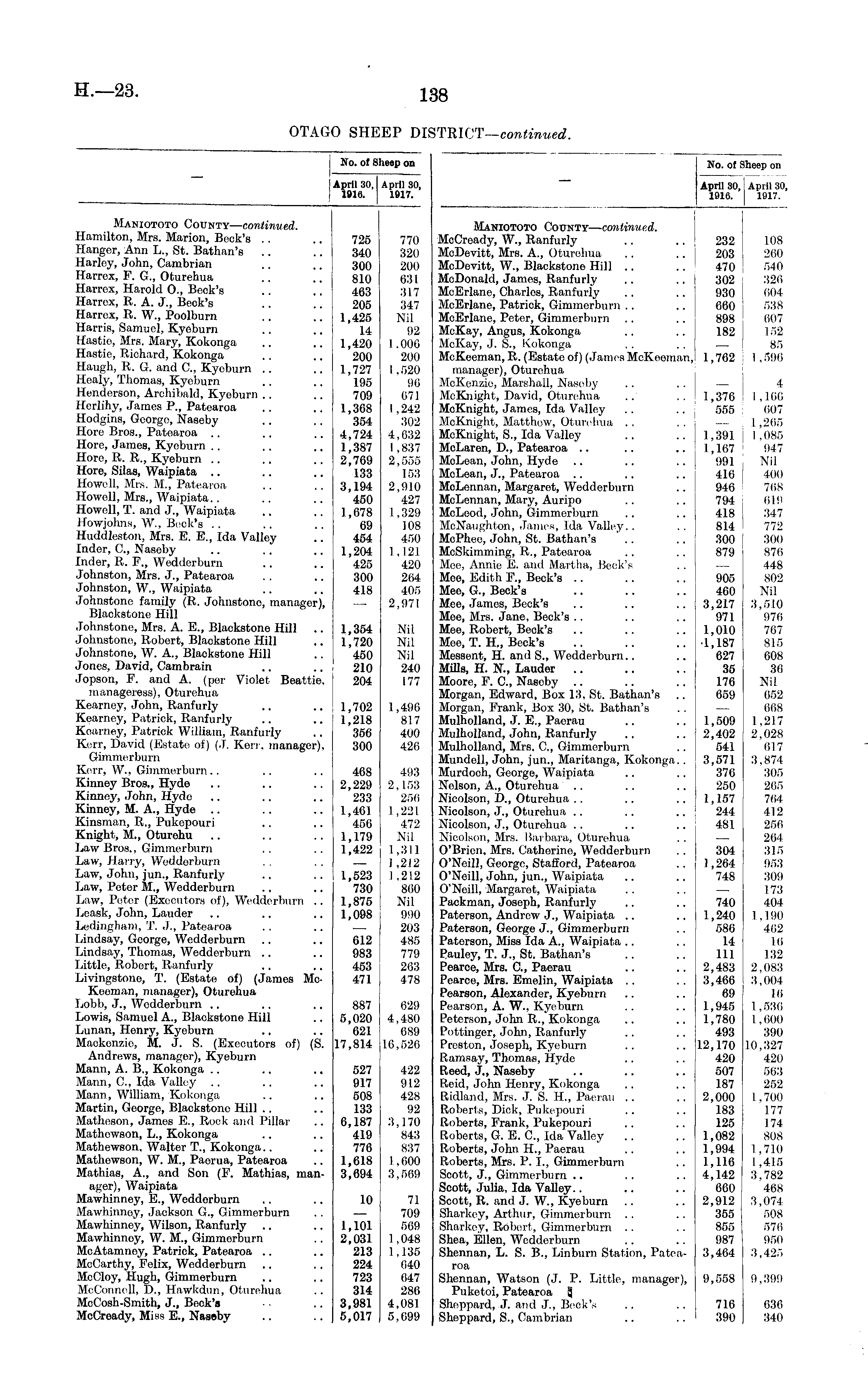 No. of Sheep on April 30, April 30, 1916. 1917. No. of Sheep on April 30,1 April 30, 1916. 1917. Maniototo County— continued. Hamilton, Mrs. Marion, Beck's Hanger, Ann L., St. Bathan's .. Harley, John, Cambrian Harrex, F. G., Oturehua Harrex, Harold 0., Beck's Harrex, R. A. J., Beok's Harrex, R. W., Poolburn Harris, Samuel, Kyeburn Hastie, Mrs. Mary, Kokonga Hastie, Richard, Kokonga Haugh, It. G. and G, Kyeburn .. Healy, Thomas, Kyoburn Henderson, Archibald, Kyeburn .. Hcrlihy, James P., Patearoa Hodgins, George, Naseby Hore Bros., Patearoa Hore, James, Kyoburn Hore, R. R., Kyeburn Hore, SUas, Waipiata Howell, Mrs. M., Patearoa Howell, Mrs., Waipiata.. Howell, T. and J., Waipiata Howjohns, W., Beck's Huddleston, Mrs. E. E., Ida Valley Inder, G, Naseby Inder, R. F., Wedderburn Johnston, Mrs. J., Patearoa Johnston, W., Waipiata Johnstone family (R. Johnstone, manager), Blackstone Hill Johnstone, Mrs. A. E., Blackstone Hill Johnstone, Robert, Blackstone Hill Johnstone, W. A., Blackstone Hill Jones, David, Cambrain Jopson, F. and A. (per Violet Beattie, manageress), Oturehua Kearney, John, Ranfurly Kearney, Patrick, Ranfurly Koarney, Patrick William, Ranfurly Kerr, David (Estato of) (J. Kerr, manager), Gimmerburn Kerr, W., Gimmerburn Kinney Bros., Hyde Kinney, John, Hyde Kinney, M. A., Hyde Kinsman, R., Pukepouri Knight, M., Oturehu Law Bros., Gimmerburn Law, Harry, Weddorburn Law, John, jun., Ranfurly Law, Potor M., Wedderburn Law, Peter (Executors of), Wedderburn .. Loask, John, Lauder Ledingham, T. J., Patearoa Lindsay, George, Wedderburn Lindsay, Thomas, Wedderburn Little, Robort, Ranfurly Livingstono, T. (Estate of) (James McKeoman, manager), Oturehua Lobb, J., Wodderburn Lowis, Samuel A., Blackstone Hill Lunan, Henry, Kyeburn Mackenzie, M. J. S. (Executors of) (S. Andrews, manager), Kyeburn Mann, A. B., Kokonga Mann, G, Ida Valley Mann, William, Kokonga Martin, George, Blackstone Hill Matheson, James E., Rook and Pillar Mathowson, L., Kokonga Mathewson, Walter T., Kokonga.. Mathewson, W. M., Paorua, Patearoa Mathias, A., and Son (F. Mathias, manager), Waipiata Mawhinney, E., Weddorburn Mawhinnoy, Jackson G., Gimmorburn Mawhinnoy, Wilson, Ranfurly Mawhinney, W. M., Gimmerburn McAtamnoy, Patrick, Patearoa McCarthy, Felix, Wedderburn McCloy, Hugh, Gimmerburn McConnell, D., Hawkdun, Oturehua McCosh-Smith, J., Beck's McCready, Miss E., Naseby 725 340 300 810 463 205 1,425 14 1,420 200 1,727 195 709 1,368 354 4,724 1,387 2,769 133 3,194 450 1,678 69 454 1,204 425 300 418 1,354 1,720 450 210 204 1,702 1,218 356 300 468 2,229 233 1,461 456 1,179 1,422 770 320 200 631 317 347 Nil 92 1.006 200 1,520 90 671 1,242 302 4,032 1,837 2,555 153 2,910 427 1,329 108 450 1,121 420 264 405 2,971 Nil Nil Nil 240 177 1,496 817 400 426 493 2,153 250 1,221 472 Nil 1,311 1,212 1,212 800 Nil 990 203 485 779 203 478 Maniototo County— continued. McCready, W., Ranfurly McDevitt, Mrs. A., Oturehua McDevitt, W., Blackstone Hill .. McDonald, James, Ranfurly McErlane, Charles, Ranfurly McErlane, Patrick, Gimmerburn McErlane, Peter, Gimmerburn McKay, Angus, Kokonga McKay, J. S., Kokonga McKccman, R. (Estate of) (James McKcoman, manager), Oturehua McKenzie, Marshall, Naseby McKnight, David, Oturehua McKnight, James, Ida Valley McKnight, Matthew, Oturehua McKnight, S., Ida Valley McLaren, D., Patoaroa McLean, John, Hyde McLean, J., Patearoa McLennan, Margaret, Wedderburn McLennan, Mary, Auripo McLood, John, Gimmerburn McNaughton, James, Ida Valley.. McPhee, John, St. Bathan's McSkimming, It., Patearoa Mee, Annie E. and Martha, Beck's Mee, Edith P., Beck's Mee, G., Beck's Mee, James, Beck's Mee, Mrs. Jane, Beck's Mee, Robert, Beck's Mco, T. H., Beck's Messent, H. and S., Wedderburn.. MiUs, H. N., Lauder Moore, F. C, Naseby Morgan, Edward. Box 13, St. Bathan's Morgan, Frank, Box 30, St. Bathan's Mulholland, J. E., Paerau Mulholland, John, Ranfurly Mulholland, Mrs. G, Gimmorburn Mundell, John, jun., Maritanga, Kokonga.. Murdoch, Georgo, Waipiata Nelson, A., Oturehua Nioolson, D., Oturehua Nicolson, J., Oturehua Nicolson, J., Oturehua Nicolson, Mrs. Barbara, Oturehua O'Brien. Mrs. Catherine, Wedderburn O'Neill, George, Stafford, Patearoa O'Neill, John, jun., Waipiata O'Noill, Margaret, Waipiata Packman, Joseph, Ranfurly Paterson, Andrew J., Waipiata Paterson, George J., Gimmerburn Paterson, Miss Ida A., Waipiata Pauley, T. J., St. Bathan's Pearco, Mrs. G, Paerau Pearce, Mrs. Emclin, Waipiata Pearson, Alexander, Kyeburn Pearson, A. W., Kyeburn Peterson, John R., Kokonga Pottinger, John, Ranfurly Preston, Joseph, Kyeburn Ramsay, Thomas, Hyde Reed, J., Naseby Reid, John Henry, Kokonga Ridland, Mrs. J. S. H., Paerau Roberts, Dick, Pukepouri Roberts, Frank, Pukepouri Roberts, G. E. C, Ida Valley Roberts, John IT., Paerau Roberts, Mrs. P. I., Gimmerburn Scott, J., Gimmerburn Scott, Julia, Ida VaUey.. Scott, R. and J. W., Kyeburn Sharkey, Arthur, Gimmerburn Sharkey, Robert, Gimmerburn Shea, Ellen, Wedderburn Shennan, L. S. B., Linburn Station, Patea232 203 470 302 930 660 898 182 1,762 1,376 555 1,391 1,167 991 416 946 794 418 814 300 879 905 460 3,217 971 1,010 •1,187 627 35 176 659 1,509 2,402 541 3,571 376 250 1,157 244 481 108 260 540 326 004 538 007 152 85 1 .590 4 1,100 007 1 ,205 1,085 947 Nil 400 708 ()I9 347 772 300 870 448 802 Nil 3,510 970 707 815 008 30 Nil 052 668 1,217 2,028 017 3.874 305 205 704 412 250 264 315 953 309 173 404 1,190 462 10 132 2,083 3.001 10 1,530 1.000 390 10,327 420 563 252 1,700 177 174 808 1,710 I ,415 3,782 408 3,074 508 570 950 3,425 1,523 730 1,875 1,098 304 1,264 748 612 983 453 471 887 5,020 621 17,814 527 917 508 133 6,187 419 776 1,618 3,694 629 4,480 689 16,526 422 912 428 92 3,170 843 837 1.000 3.509 740 1,240 586 14 111 2,483 3,466 69 1,945 1,780 493 12,170 420 507 187 2,000 183 125 1,082 1,994 1,116 4,142 660 2,912 355 855 987 3,464 10 71 709 569 1,048 1.135 040 047 286 4,081 5,099 1,101 2,031 213 224 723 314 3,981 5,017 roa Shennan, Watson (J. P. Little, manager), Puketoi, Patear