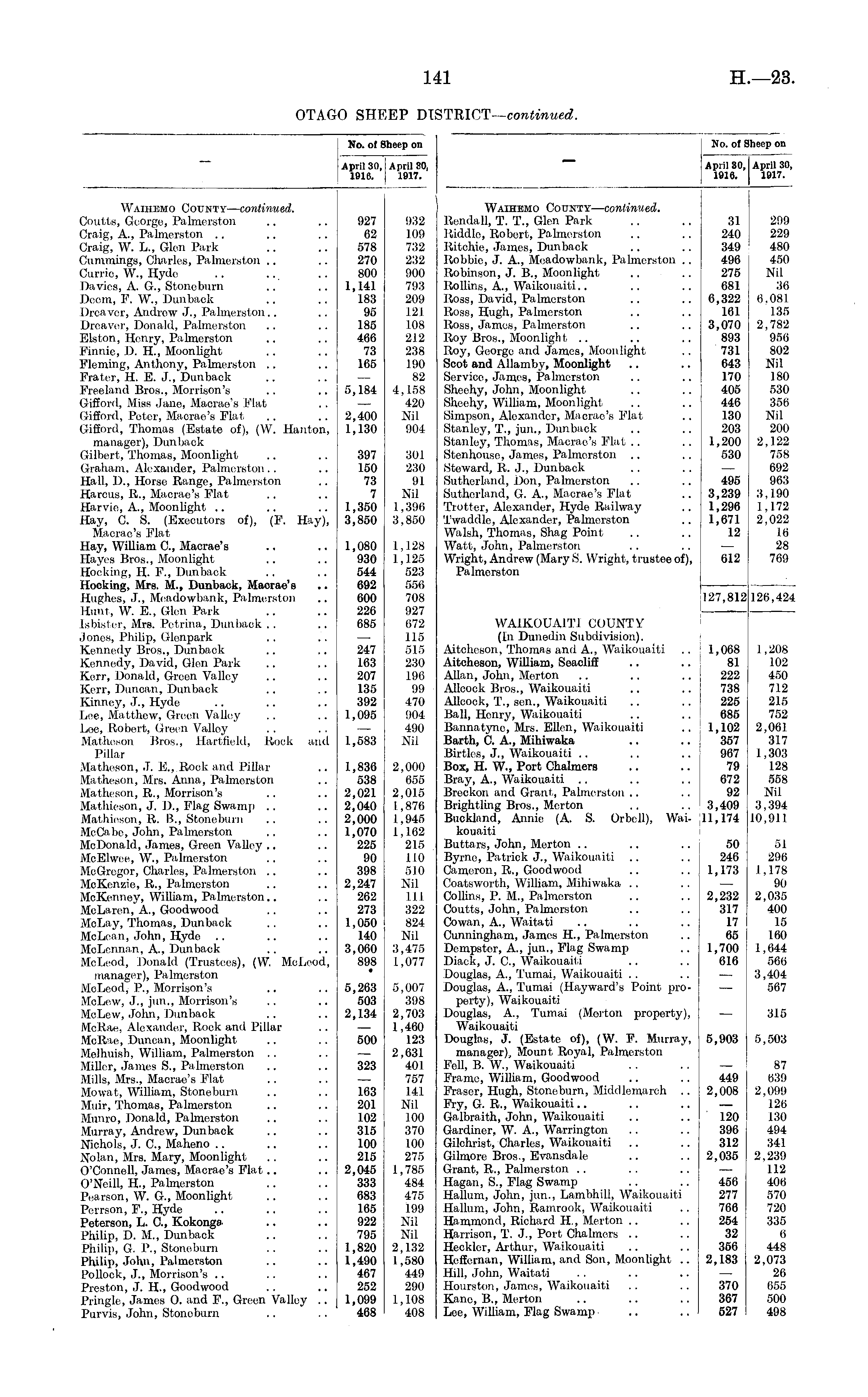 No. of Sheep on April 30, April 30, 1916. 1917. April 30, April 30, 1916. 1917. No. of Sheep on Waihemo County— continued. Ooutts, George, Palmerston Craig, A., Palmerston Craig, W. L., Glen Park Cummings, Charles, Palmerston Currie, W., Hyde Davies, A. G., Stonoburn Deem, F. W., Dunback Drcaver, Androw J., Palmerston,. Droavcr, Donald, Palmerston Elston, Henry, Palmerston Finnic, D. H., Moonhght Fleming, Anthony, Palmerston Frater, H. E. J., Dunback Freeland Bros., Morrison's Gifford, Miss Jane, Macrae's Plat Gifford, Peter, Macrae's Flat Gifford, Thomas (Estate of), (W. Hanton, manager), Dunback Gilbert, Thomas, Moonlight Graham, Alexander, Palmerston.. Hall, D., Horse Range, Palmerston Harcus, R., Macrae's Flat Harvie, A., Moonhght Hay, C. S. (Executors of), (F. Hay), Macrae's Flat Hay, WiUiam C, Macrae's Hayes Bros., Moonlight Hocking, H. F., Dunback Hocking, Mrs. M, Dunback, Macrae's Hughes, J., Meadowbank, Palmerston Bunt, W. B., Glen Park Isbister, Mrs. Pctrina, Dun hack Jones, Philip, Glonpark Kennedy Bros., Dunback Kennedy, David, Glen Park Kerr, Donald, Green Valley Kerr, Duncan, Dunback Kinnoy, J., Hyde Lee, Matthow, Green VaUey Lee, Robert, Green Valloy Matheson Bros., Hartfield, Rock and Pillar Matheson, J. E., Rock and Pillar Matheson, Mrs. Anna, Palmerston Matheson, R., Morrison's Mathieson, J. D., Flag Swamp Mathieson, R. B., Stoneburn McCabe, John, Palmerston McDonald, James, Green VaUey McElwoe, W., Palmerston McGregor, Charles, Palmerston McKenzie, R., Palmerston McKcnney, William, Palmerston McLaren, A., Goodwood McLay, Thomas, Dunback McLean, John, Hyde McLennan, A., Dunback McLeod, Donald (Trustees), (W. McLeod, manager), Palmerston McLeod, P., Morrison's McLow, J., jun., Morrison's McLew, John, Dunback McRae, Alexander, Rock and Pillar McRae, Duncan, Moonlight Melhuish, William, Palmerston MiUcr, James S., Palmerston Mills, Mrs., Macrae's Flat Mowat, William, Stoneburn Muir, Thomas, Palmerston Munro, Donald, Palmerston Murray, Andrew, Dunback Nichols, J. G, Maheno Nolan, Mrs. Mary, Moonlight O'Connell, Jamos, Macrae's Flat O'Neill, H, Palmerston Pearson, W. G„ Moonlight Perrson, F., Hyde Peterson, L. G, Kokonga Philip, D. M., Dunback Philip, G. P., Stoneburn Philip, John, Palmerston Pollock, J., Morrison's Preston, J. H., Goodwood Pringle, James O. and F., Green Valley .. Purvis, John, Stonoburn 927 62 578 270 800 1,141 183 95 185 466 73 165 5,184 2,400 1,130 397 150 73 7 1,350 3,850 1,080 930 544 692 600 226 685 247 163 207 135 392 1,095 1,583 1,836 538 2,021 2,040 2,000 1,070 225 90 398 2,247 262 273 1,050 140 3,060 898 • 932 109 732 232 900 793 209 121 108 212 238 190 82 4,158 420 Nil 904 301 230 91 Nil 1,390 3,850 1,128 1,125 523 550 708 927 672 115 515 230 196 99 470 904 490 Nil 2,000 655 2,015 1,876 1,945 1,162 215 110 510 Nil 111 322 824 Nil 3,475 1,077 Waihemo County— continued. Rendall, T. T„ Glen Park Riddle, Robort, Palmerston Ritchie, .Tames, Dunback Robbie, J. A., Meadowbank, Palmerston .. Robinson, J. B., Moonlight Rollins, A., Waikouaiti.. Ross, David, Palmerston Ross, Hugh, Palmerston Ross, James, Palmerston Roy Bros., Moonlight Roy, George and James, Moonlight Scot and Allamby, Moonlight Service, James, Palmerston Sheehy, John, Moonlight Sheehy, William, Moonlight Simpson, Alexander, Macrae's Flat Stanley, T., jun., Dunback Stanley, Thomas, Macrae's Flat Stenhouse, James, Palmerston Steward, It. J., Dunback Sutherland, Don, Palmerston Sutherland, G. A., Macrae's Flat Trotter, Alexander, Hyde Railway 'Twaddle, Alexander, Palmerston Walsh, Thomas, Shag Point Watt, John, Palmerston Wright, Andrew (Mary S. Wright, trustee of), Palmerston WAIKOUAITI COUNTY (In Dunedin Subdivision). Aitcheson, Thomas and A., Waikouaiti Aitcheson, WiUiam, Seacliff AUan, John, Merton Allcoek Bros., Waikouaiti AUcock, T., sen., Waikouaiti Ball, Henry, Waikouaiti Bannatyne, Mrs. Ellen, Waikouaiti Barth, C. A., Mihiwaka Birtles, J., Waikouaiti Box, H. W., Port Chalmers Bray, A., Waikouaiti Breckon and Grant, Palmerston Brightling Bros., Merton Buckland, Annie (A. S. Orbell), Waikouaiti Butters, John, Merton Byrne, Patrick J., Waikouaiti Cameron, R., Goodwood Coatsworth, William, Mihiwaka CoUins, P. M., Palmerston Coutts, John, Palmerston Cowan, A., Waitati Cunningham, James H., Palmerston Dempster, A., jun., Flag Swamp Diack, J. G, Waikouaiti Douglas, A., 'Tumai, Waikouaiti Douglas, A., Tumai (Hayward's Point property), Waikouaiti Douglas, A., Tumai (Morton property), Waikouaiti Douglas, J. (Estate of), (W. F. Murray, manager), Mount Royal, Palmerston Fell, B. W., Waikouaiti Frame, William, Goodwood Fraser, Hugh, Stoneburn, Middlemarch .. Fry, G. R., Waikouaiti Galbraith, John, Waikouaiti Gardiner, W. A., Warrington Gilchrist, Charles, Waikouaiti Gilmorc Bros., Evansdale Grant, R., Palmerston Hagan, S., Flag Swamp Hallum, John, jun., Lambhill, Waikouaiti Hallum, John, Ramrook, Waikouaiti Hammond, Richard H, Morton Harrison, T. J., Port Chalmers Heckler, Arthur, Waikouaiti Heffernan, William, and Son, Moonlight .. Hill, John, Waitati Hourston, James, Waikouaiti Kane, B., Merton Lee, William, Flag Swamp 127,812 1,068 81 222 738 225 685 1,102 357 967 79 672 92 3,409 11,174 31 240 349 496 275 681 6,322 161 3,070 893 731 643 170 405 446 130 203 1,200 530 495 3,239 1,296 1,671 12 612 126,424 1,208 102 450 712 215 752 2,061 317 1,303 128 558 Nil 3,394 10,911 299 229 480 450 Nil 30 0.081 135 2,782 956 802 Nil 180 530 356 Nil 200 2,122 758 692 963 3,190 1,172 2,022 16 28 769 50 246 1,173 2,232 317 17 65 1,700 616 51 296 1,178 90 2,035 400 15 160 1,644 566 3,404 567 5,263 503 2,134 500 323 163 201 102 315 100 215 2,045 333 683 165 922 795 1,820 1,490 467 252 1,099 468 5,007 398 2,703 1,460 123 2,031 401 757 141 Nil 100 370 100 275 1,785 484 475 199 Nil Nil 2,132 1,580 449 290 1,108 408 5,903 449 2,008 120 396 312 2,035 315 5,503 87 639 2,099 126 130 494 341 2,239 112 406 570 720 335 0 448 2,073 26 655 500 498 456 277 766 254 32 356 2,183 370 367 527