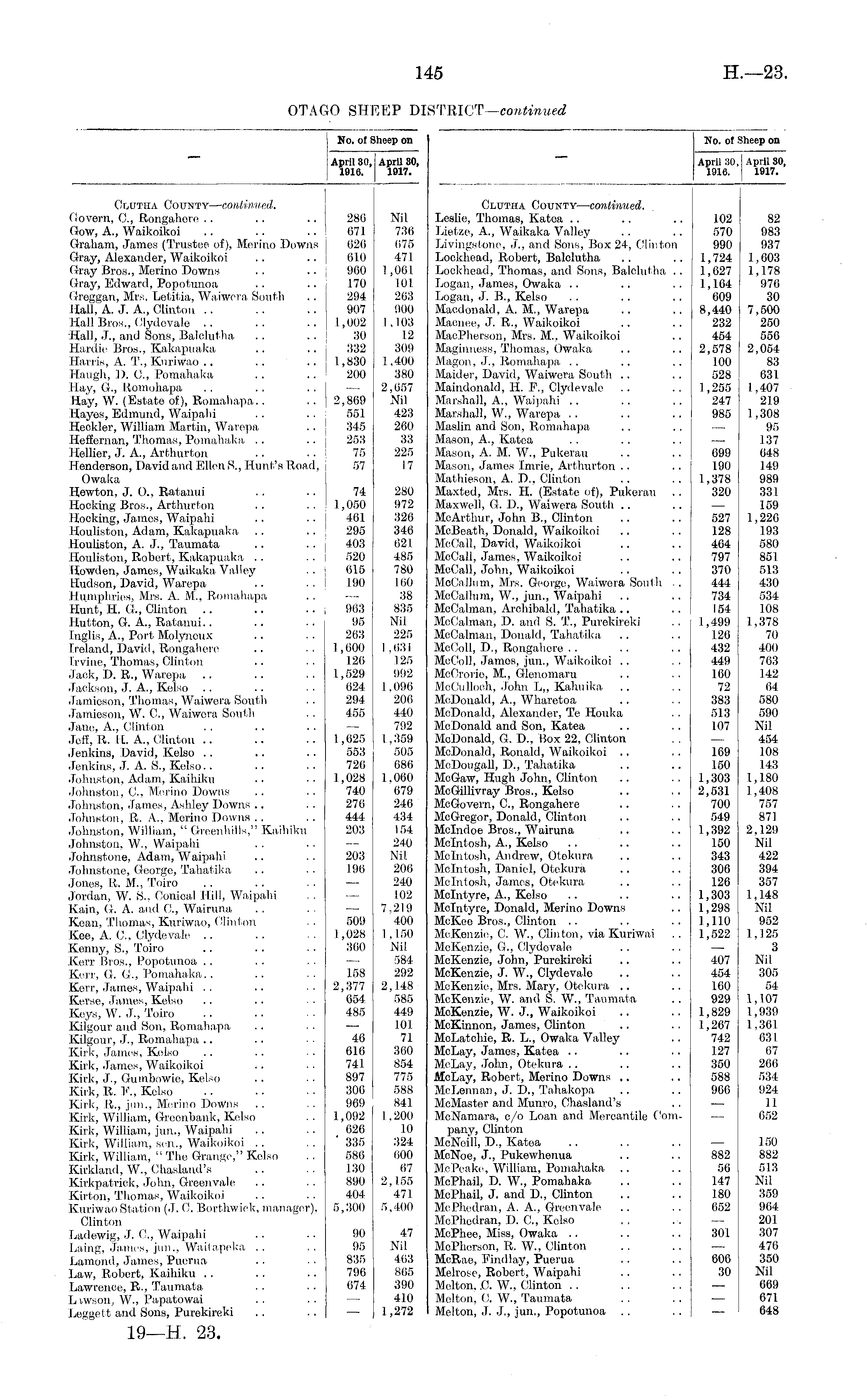 No. of Sheep on April 30, April 30, 1916. 1917. No. of Sheep on April 30, April 30, [ 1916. 1917. Clutha County— continued. Govern, G, Rongahere Gow, A., Waikoikoi Graham, Jamos (Trustee of), Merino Downs Gray, Alexander, Waikoikoi Gray Bros., Merino Downs Gray, Edward, Popotunoa Greggan, Mrs. Letitia, Waiwera South Hall, A. J. A., Clinton Hall Bros., Clydevale .. Hall, J., and Sons, Balclutha Hardlc Bros., Kakapuaka Harris, A. T., Kuriwao Haugh, D. G, Pomahaka Hay, G., Romohapa Hay, W. (Estate of), Romahapa.. Hayes, Edmund, Waipahi Heckler, William Martin, Warepa Heffernan, Thomas, Pomahaka Hellier, J. A., Arthurton Henderson, David and Ellon S., Hunt's Road, Owaka Hewton, J. 0., Ratanui Hocking Bros., Arthurton Hocking, James, Waipahi Houliston, Adam, Kakapuaka HouUston, A. J., Taumata Houliston, Robert, Kakapuaka Howden, James, Waikaka Valley Hudson, David, Warepa Humphries, Mrs. A. M., Romahapa Hunt, IT. 0., Clinton Hutton, G. A., Ratanui.. Inglis, A., Port Molyncux Ireland, David, Rongahere Irvine, Thomas, Clinton Jack, D. R., Warepa Jackson, J. A., Kelso Jamieson, Thomas, Waiwera South Jamieson, W. G, Waiwora South Jane, A., Clinton Jeff, R. H. A., Clinton Jenkins, David, Kelso Jenkins, J. A. S., Kelso.. Johnston, Adam, Kaihiku Johnston, C, Merino Downs Johnston, James, Ashley Downs Johnston, R. A., Merino Downs Johnston, William, " GreenhiUs," Kaihiku Johnston, W., Waipahi Johnstone, Adam, Waipahi Johnstone, George, Tahatika Jones, It. M., Toiro Jordan, W. S., Conical Hill, Waipahi Kain, G. A. and G, Wairuna Kean, Thomas, Kuriwao, Clinton Kee, A. G, Clydevale Kenny, S., Toiro Kerr Bros., Popotunoa Kerr, G. G., Pomahaka.. Kerr, James, Waipahi Kerse, .Tames, Kelso Keys, W. J., Toiro Kilgour and Son, Romahapa Kilgour, J., Romahapa Kirk, .Tames, Kolso Kirk, .Tames, Waikoikoi Kirk, J., Gumbowie, Kelso Kirk, R. P., Kelso Kirk, It., jun., Merino Downs Kirk, William, Greonbank, Kelso Kirk, William, jun., Waipahi Kirk, William, sen., Waikoikoi Kirk, William, " The Grange," Kelso Kirkland, W., Chasland's Kirkpatrick, John, Greenvale Kirton, Thomas, Waikoikoi Kuriwao Station (J. C. Borthwick, manager), Clinton Ladewig, J. G, Waipahi Laing, James, jun., Waitapeka Lamond, James, Puerua Law, Robert, Kaihiku Lawrence, R., Taumata Liwgon, W., Papatowai Leggett and Sons, Purekireki 286 671 626 610 960 170 294 907 1,002 30 332 1,830 200 2,869 551 345 253 75 57 74 1,050 461 295 403 520 615 190 963 95 263 1,000 126 1,529 624 294 455 1,625 553 726 1,028 740 270 444 203 Nil 730 075 471 1,061 101 263 900 1,103 12 309 1,400 380 2,057 Nil 423 260 33 225 17 280 972 326 346 621 485 780 100 38 835 Nil 225 1,031 125 992 1,096 206 440 792 1,359 505 686 1,000 079 246 434 154 240 Nil. 206 240 102 7,219 400 1,150 Nil 584 292 2,148 585 449 101 7.1 360 854 775 588 841 1,200 10 324 600 67 2,155 471 5,400 Clutha County— continued. Leslie, Thomas, Katea Lietze, A., Waikaka Valley Livingstone, J., and Sons, Box 24, Clinton Lockhcad, Robert, Balclutha Lockhcad, Thomas, and Sons, Balclutha . . Logan, James, Owaka Logan, .1. B., Kelso Macdonald, A. M., Warepa Macnee, .T. R., Waikoikoi MaoPherson, Mrs. M., Waikoikoi Maginness, Thomas, Owaka Magon, J,, Romahapa .. Maider, David, Waiwera South Maindonald, H. F., Clydevale Marshall, A., Waipahi .. Marshall, W., Warepa Maslin and Son, Romahapa Mason, A., Katea Mason, A. M. W., Pukerau Mason, James Imrie, Arthurton Mathieson, A. D., Clinton Maxted, Mrs. H. (Estate of), Pukerau .. Maxwell, G. D., Waiwera South McArthur, John B., Clinton MoBeath, Donald, Waikoikoi MoCaU, David, Waikoikoi McCall, James, Waikoikoi McCall, John, Waikoikoi McCallum, Mrs. George, Waiwora .South . . McCallum, W., jun., Waipahi McCalman, Archibald, Tahatika McCalman, D. and S. T., Purekireki McCalman, Donald, Tahatika McColl, D., Rongahere McColl, Jamos, jun., Waikoikoi McCroric, M., Glenomaru McCulloch, John L„ Kahuika McDonald, A., Wharetoa McDonald, Alexander, Te Houka McDonald and Son, Katea McDonald, G. D., Box 22, Clinton McDonald, Ronald, Waikoikoi .. McDougall, D., 'Tahatika McGaw, Hugh John, Clinton McGillivray Bros., Kelso MoGovern, C, Rongahere McGregor, Donald, Clinton Mclndoe Bros., Wairuna Mcintosh, A., Kelso Mcintosh, Andrew, Otokura Mcintosh, Daniel, Otokura Mcintosh, James, Otekura Mclntyre, A., Kelso Mdntyre, Donald, Merino Downs McKco Bros., Clinton McKenzie, G W., Clinton, via Kuriwai McKenzio, G., Clydevale McKenzie, John, Purekireki McKenzie, J. W., Clydovale McKenzie, Mrs. Mary, Otekura McKenzie, W. and S. W., Taumata McKenzie, W. J., Waikoikoi McKinnon, James, Clinton McLatchic, R. L., Owaka Valley McLay, James, Katca McLay, John, Otekura McLay, Robert, Merino Downs McLennan, J. D., Tahakopa MeMaster and Munro, Chasland's McNamara, c/o Loan and Mercantile Company, Clinton McNeill, D, Katea McNoe, J., Pukewhenua McPeake, William, Pomahaka McPhail, D. W., Pomahaka McPhail, J. and D., Clinton McPhedran, A. A., Greenvale McPlicdran, D. G, Kelso McPhee, Miss, Owaka McPherson, R. W., Clinton McRae, Findlay, Puerua Melrose, Robert, Waipahi Melton, G. W., Clinton .. Melton, 0. W., Taumata Melton, J. J., jun., Popotunoa 102 570 990 1,724 1,027 1,164 609 8,440 232 454 2,578 100 528 1,255 247 985 699 190 1,378 320 527 128 464 797 370 444 734 154 1,499 126 432 449 160 72 383 513 107 169 150 1,303 2,531 700 549 1,392 150 343 306 126 1,303 1,298 1,110 1,522 82 983 937 1,003 1,178 976 30 7,500 250 556 2,054 83 631 1,407 219 1,308 95 137 648 149 989 331 159 1,220 193 580 851 513 430 534 108 1,378 70 400 763 142 04 580 590 Nil 454 108 143 1,1.80 1,408 757 871 2,129 Nil 422 394 357 1,148 Nil 952 1,125 3 Nil 305 54 1,107 1,939 1,301 631 07 266 534 924 11 652 203 190 509 1,028 300 158 2,377 654 485 407 454 160 929 1,829 1,267 742 127 350 588 966 46 616 741 897 306 969 1,092 626 ' 335 586 130 890 404 5,300 90 95 835 796 074 47 Nil 463 865 390 410 1,272 882 56 147 180 652 150 882 513 Nil 359 964 201 307 476 350 Nil 669 671 648 301 606 30