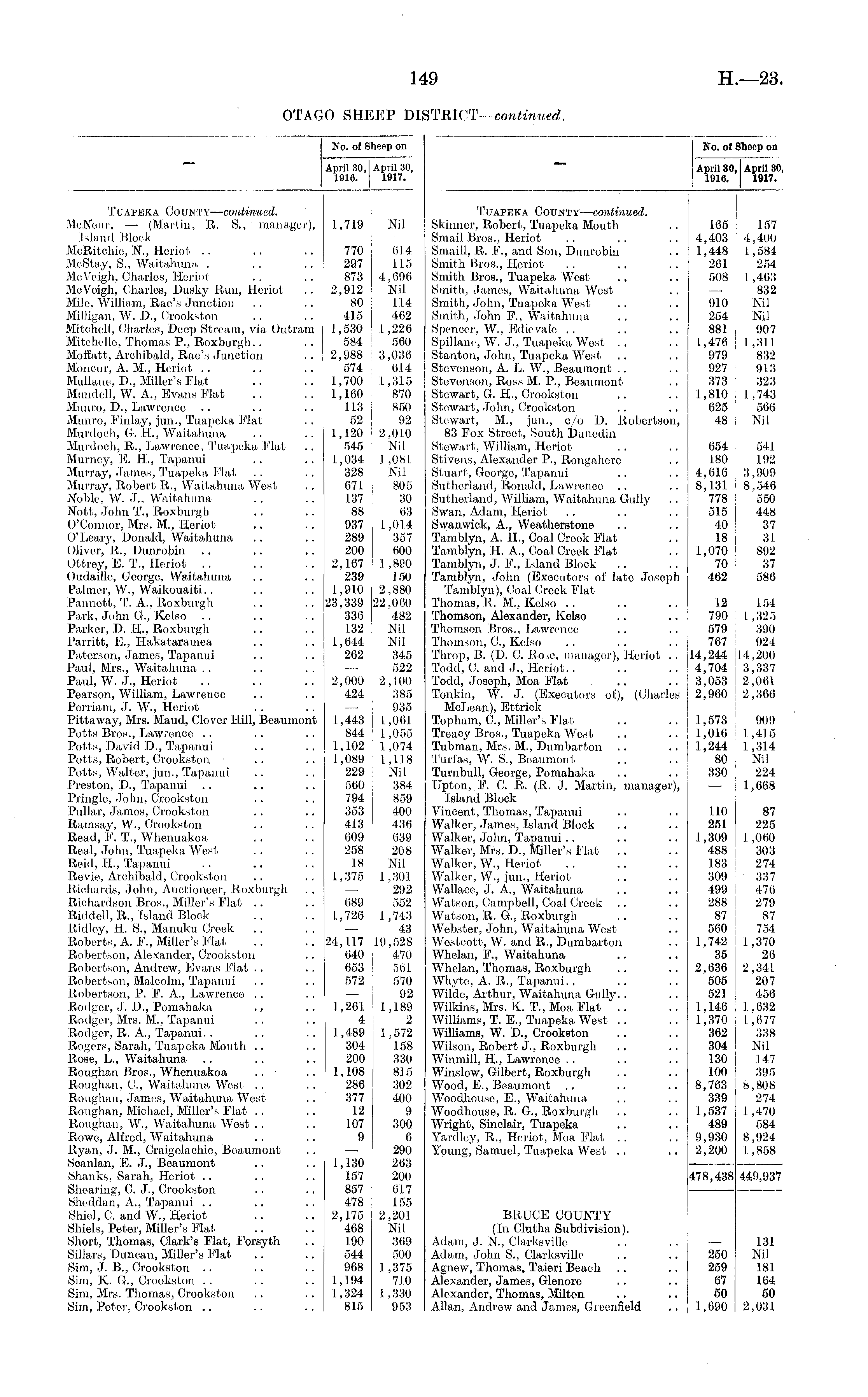 April 30, April 30, 1916. 1917. No. o( Sheep on No. of Sheep on April 30, April 30, 1916. 1917. Tuapuka County— continued. M.cNour, — (Martin, It. S., manager), Island Block McRitchie, N., Heriot McStay, S., Waitahuna . MoVeigh, Charles, Heriot McVeigh, Charles, Dusky Run, Heriot Mile, William, Rao's Junction Milligan, W. D., Crookston Mitchell, Charles, Deep Stream, via Outram Mitehellc, Thomas P., Roxburgh Moffatt, Archibald, Rae's Junction Moncur, A. M., Heriot Mullaue, D., Miller's Flat Mundell, W. A., Evans Flat Munro, D., Lawrence Munro, Finlay, jun., Tuapeka Flat Murdoch, G. H., Waitaluma Murdoch, R., Lawrence, Tuapeka Flat Murney, E. H., Tapanui Murray, James, Tuapeka Flat ... Murray, Robert R., Waitahuna West Noble, W. J.. Waitahuna Nott, John T., Roxburgh O'Connor, Mrs. M., Heriot O'Leary, Donald, Waitahuna Oliver, It., Dunrobin Ottrey, E. T., Heriot Oudaille, George, Waitahuna Palmer, W., Waikouaiti.. Pannett, T. A., Roxburgh Park, John G., Kelso Parker, D. H., Roxburgh Parritt, E., Hakataramea Paterson, James, Tapanui Paul, Mrs., Waitahuna Paul, W. J., Heriot Poarson, William, Lawrenoe Porriam, J. W., Heriot Pitta way, Mrs. Maud, Clover Hill, Beaumont Potts Bros., Lawrence Potts, David D., Tapanui Potts, Robert, Crookston Potts, Walter, jun., Tapanui Preston, I)., Tapanui Pringle, John, Crookston Pullar, Jamos, Crookston Ramsay, W., Crookston Read, P. T., Whenuakoa Real, John, Tuapeka West Reid, II., Tapanui Revie, Archibald, Crookston Richards, John, Auctioneer, Roxburgh Richardson Bros., Miller's Flat Riddell, R„ Island Blook Ridley, H. S., Manuku Creek Roberts, A. P., Miller's Flat Robertson, Alexander, Crookston Robertson, Andrew, Evans Flat Robertson, Malcolm, 'Tapanui Robertson, P. F. A., Lawrence Rodger, J. D., Pomahaka ., Rodger, Mrs. M., 'Tapanui Rodger, R. A., Tapanui.. Rogers, Sarah, Tuapeka Mouth Rose, L., Waitahuna Roughan Bros., Whenuakoa Roughan, (!., Waitahuna West Roughan, James, Waitahuna West Roughan, Michael, Miller's Flat Roughan, W., Waitahuna West Rowe, Alfred, Waitahuna Ryan, J. M., Craigelachio, Beaumont Scanlan, E. J., Beaumont Shanks, Sarah, Heriot Slioaring, C. J., Crookston Sheddan, A., Tapanui Shicl, C. and W., Heriot Shiels, Peter, Miller's Flat Short, Thomas, Clark's Flat, Forsyth Sillars, Duncan, Miller's Hat Sim, J. B., Crookston Sim, K. G., Crookston Sim, Mrs. Thomas, Crookston Sim, Peter, Crookston .. 1,719 Nil 770 014 297 115 873 4,696 2,912 Nil 80 114 415 462 1,530 1,226 584 560 2,988 3,030 574 0.1.4 1,700 1,315 1,160 870 113 850 52 i 92 1,120 i 2,010 545 Nil 1,034 , 1,081. 328 Nil 671 805 137 30 88 03 937 1,014 289 I 357 200 000 2,167 1,880 239 150 1,910 2,880 23,339 22,000 330 482 132 Nil 1,644 Nil 262 345 — 522 2,000 2,100 424 385 935 1,443 | 1,061 844 1,055 1,102 1,074 1,089 1,118 229 Nil 560 384 794 859 353 400 413 430 009 639 258 208 18 ! Nil 1,375 ! 1,301 — ! 292 089 552 1,726 1,743 43 24,117 19..528 040 | 470 053 ! 501 572 570 — j 92 1,261 ! 1,189 4 - 2 1,489 1,572 304 ! 158 200 ■ 330 1,1.08 815 286 , 302 377 400 12 9 107 300 9 6 — 290 1,130 263 157 200 857 017 478 155 2,175 2,201 468 Nil 190 309 544 500 968 1 ,375 1,194 710 1,324 1,330 815 953 T ir apeka Co unty—continued. Skinner, Robert, Tuapeka Mouth Smail Bros., Horiot Smaill, R. P., and Son, Dunrobin Smith Bros., Heriot Smith Bros., 'Tuapeka West Smith, James, Waitahuna Wost Smith, John, Tuapeka West Smith, John F., Waitahuna Spencer, W., Edievale Spillano, W. J., Tuapeka West Stanton, John, Tuapeka West Stevenson, A. L. W., Beaumont Stevenson, Ross M. P., Beaumont Stewart, G. H,, Crookston Stewart, John, Crookston Stewart, M., jun., c/o D. Robertson, 83 Fox Street, South Dunedin Stewart, William, Horiot Stivens, Alexander P., Rongahere Stuart, Goorgo, Tapanui Sutherland, Ronald, Lawrence Sutherland, William, Waitahuna Gully Swan, Adam, Heriot Swanwick, A., Weatherstone Tamblyn, A. H., Coal Creek Flat Tamblyn, H. A., Coal Creek Flat Tamblyn, J. F., Island Block Tamblyn, John (Executors of late Josoph Tamblyn), Coal Creek Flat Thomas, It. M., Kelso 'Thomson, Alexander, Kelso 'Thomson Bros., Lawrence Thomson, C, Kelso Tlnop, B. (D. G. Rose, manager), Heriot .. Todd, C. and J., Horiot.. Todd, Joseph, Moa Flat Tonkin, W. .1. (Executors of), (Charles McLean), Ettrick Topham, C, Miller's Flat Treacy Bros., Tuapeka West Tubman, Mrs. M., Dumbarton Turfas, W. S., Beaumont Turnbull, George, Pomahaka Upton, F. G R. (R. J. Martin, manager), Island Block Vincent, Thomas, Tapanui Walker, James, Island Block Walker, John, Tapanui Walker, Mrs. D., Miller's Flat Walker, W., Horiot Walker, W., jun., Heriot Wallace, J. A., Waitahuna Watson, Campbell, Coal Creek Watson, R. G., Roxburgh Webster, .Tohn, Waitahuna West Wostcott, W. and R., Dumbarton Whelan, F., Waitahuna Whelan, Thomas, Roxburgh Whyte, A. R., Tapanui.. Wilde, Arthur, Waitahuna Gully.. Wilkins, Mrs. K. T., Moa Flat Williams, T. E., Tuapeka West Williams, W. D., Crookston Wilson, Robert J., Roxburgh Winmill, H-, Lawrence Winslow, Gilbert, Roxburgh Wood, E., Beaumont Woodhouse, E., Waitaluma Woodhouse, R. G., Roxburgh Wright, Sinclair, Tuapeka Yardley, R., Heriot, Moa Flat Young, Samuel, Tuapeka West 165 : 157 4,403 4,400 1,448 .1,584 261 254 508 I ,463 832 910 Nil 254 Nil 881 907 1,476 1,311 979 832 927 913 373 323 1,810 1.743 625 566 48 Nil 654 54.1 180 192 4,616 3,909 8,131 i 8,546 778 5.50 515 448 40 37 18 31 1,070 892 70 37 462 580 12 154 790 1,325 579 390 767 924 1.4,244 114,200 4,704 3,337 3,053 2,061 2,960 2,366 1,573 909 1,016 1,415 1,244 1,314 80 Nil 330 224 — 1,068 110 87 251 225 1,309 1,060 488 303 183 274 309 337 499 ; 476 288 279 87 ! 87 560 ! 754 1,742 I 1,370 35 20 2,036 2,341 505 207 521 ' 450 1,146 1.032 1,370 1,077 362 338 304 Nil 130 147 100 395 8,763 8,808 339 274 1,537 1,470 489 584 9,930 8,924 2,200 1,858 478,438 449,937 BRUCE COUNTY (In Clutha Subdivision). Adam, J. N., Ciarksville Adam, John S., Ciarksville Agnew, Thomas, Taieri Beach Alexander, Jamos, Glenore Alexander, Thomas, Milton All