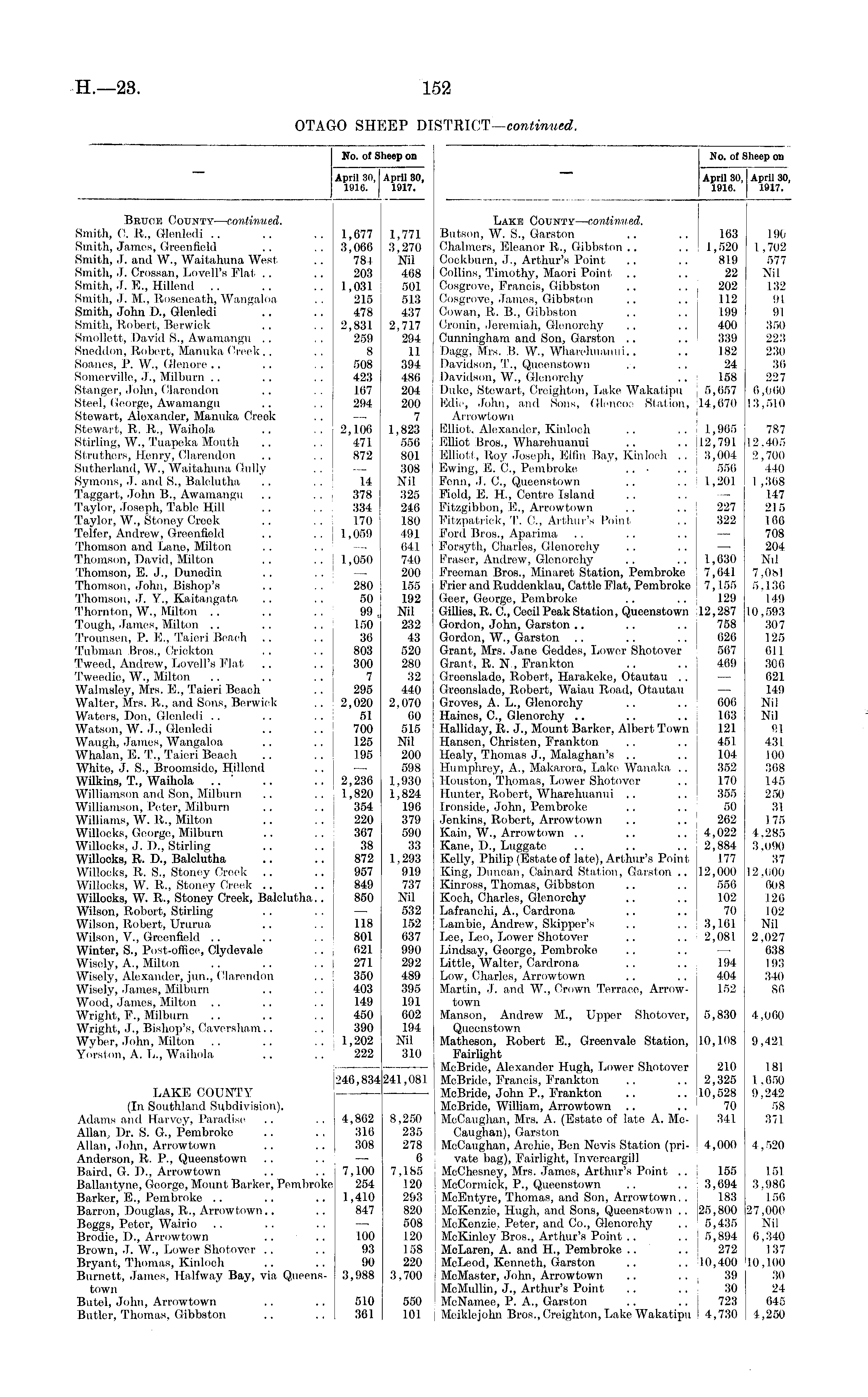 No. of Sheep on No. of Sheep on April 30,1 April 80, 1916. 1917. April 30 1Q1A April 30, April 30, 1916. 1917. 1916. Bruce County— continued. Smith, 0. R., Glenledi Smith, Jamos, Greenfield Smith, J. and W., Waitahuna West Smith, J. Crossan, LoveU's Flat Smith, J. E., Hillend Smith, J. M., Roseneath, Wangaloa Smith, John D, Glenledi Smith, Robert, Berwick Smollett, David S., Awamangu Sneddon, Robert, Manuka Creek Soancs, P. W., Glenore Somerville, .)., Milburn Stanger, John, Clarendon Steel, George, Awamangu Stewart, Alexander, Manuka Creek Stewart, R. R., Waihola Stirling, W., 'Tuapeka Mouth Struthcrs, Henry, Clarendon Sutherland, W., Waitahuna Gully Symons, J. and S., Balclutha Taggart, John B., Awamangu Taylor, Joseph, Table Hill Taylor, W., Stoney Creek Teller, Andrew, Greenfield Thomson and Lano, Milton Thomson, David, Milton Thomson, E. J., Dunedin Thomson, John, Bishop's Thomson, J. Y., Kaitangata. Thornton, W., Milton Tough, James, Milton Trounsen, P. E., Taieri Beach Tubman Bros,, Crickton Tweed, Andrew, LoveU's Plat Tweedie, W., Milton Walmsley, Mrs. E., Taieri Beach Walter, Mrs. R., and Sons, Berwick Waters, Don, Glenledi Watson, W. J., Glenledi Waugh, James, Wangaloa Whalan, E.'!.'., Taieri Beach White, J. S., Broomsido, Hillend Wilkins, T., Waihola .. ' Williamson and Son, Milburn Williamson, Peter, Milburn Williams, W. It., Milton Willoeks, George, Milburn Willoeks, J. D., Stirling Willoeks, R. D., Balclutha Willoeks, R. S„ Stoney Greek Willoeks, W. R., Stoney Greek .. .. j Willoeks, W. R., Stoney Creek, Balclutha.. Wilson, Robort, Stirling Wilson, Robert, Ururua Wilson, V., Greenfield Winter, S., Post-office, Clydovale Wisely, A., Milton Wisely, Alexander, jun., Clarendon Wisely, James, Milburn Wood, James, Milton Wright, P., Milburn Wright, J., Bishop's, Oavorsluim.. Wyber, John, Milton Yorston, A. L., Waihola 1,677 3,060 784 203 1,031 215 478 2,831 259 8 508 423 167 294 2,106 471 872 14 378 334 170 1,0.59 1,050 280 50 99, 150 30 803 300 7 295 2,020 51 700 125 195 2,236 1,820 354 220 367 38 872 957 849 850 118 801 621 271 350 403 149 450 390 1,202 222 1,771 3,270 Nil 468 501 513 437 2,717 294 11 394 486 204 200 7 1,823 556 801 308 Nil 325 246 180 491 641 740 200 155 192 Nil 232 43 520 280 32 440 2,070 00 515 Nil 200 598 1,930 1,824 196 379 590 33 1,293 919 737 Nil 532 152 637 990 292 489 395 191 602 194 Nil 310 Lake County— continued. Butson, W. S., Garston .. .. 163 Chalmers, Eleanor It., Gibbston .. .. 1,520 Cockburn, J., Arthur's Point .. .. 819 Collins, Timothy, Maori Point .. .. 22 Cosgrove, Francis, Gibbston .. ... 202 Oosgrove, James, Gibbston .. .. 112 Cowan, R. B., Gibbston .. .. 199 Cronin, Jeremiah, Glenorchy .. .. 400 Cunningham and Son, Garston .. .. 339 Dagg, Mrs. B. W., Wharehuanui.. .. 182 Davidson, T., Queenstown .. . . 24 Davidson, W., Glenorchy .. j 158 Duke, .Stewart, Creighton, Lake Wakatipu j 5,657 Edie, John, and Sons, Glencoc Station, 14,070 Arrowtown Elliot, Alexander, Kinloch .. ., | 1,905 Elliot Bros., Wharehuanui .. .. 112,791 Elliott, Roy Joseph, Elfin Bay, Kinloch . . 3,004 Ewing, E. G, Pembroke ... .. 550 Fenn, J. C, Queenstown .. .. 1,201 Fiold, E. H., Centre Island Fitzgibbon, E., Arrowtown .. .. 227 Fitzpatrick, T. G, Arthur's Point .. 322 Ford Bros., Aparima . . .. . . — Forsyth, Charles, Glenorchy . . .. —■ Eraser, Andrew, Glenorchy .. .. 1,630 Freeman Bros., Minaret Station, Pembroke 7,041 Frier and Ruddenklau, Cattle Flat, Pembroke 7,155 Geer, George, Pembroke .. .. 129 Gillies, R. G, Cecil Peak Station, Queenstown 12,287 Gordon, John, Garston .. .. .. 758 Gordon, W., Garston .. . . . . 020 Grant, Mrs. Jane Geddes, Lower Shotover 507 Grant, R. N, Frankton .. .. 409 Groonslado, Robert, Harakeke, Otautau . . —■ Greenslade, Robert, Waiau Road, Otautau —■ Groves, A. L., Glenorchy .. .. 006 Haines, C, Glenorchy .. .. .. I 163 Halliday, It. J., Mount Barker, Albert Town 121 Hansen, Christen, Frankton .. .. 451 Healy, Thomas J., Malaghan's .. .. 104 Humphrey, A., Makarora, Lake Wanaka .. 352 Houston, Thomas, Lower Shotover .. 170 Hunter, Robert, Wharehuanui .. .. 355 Ironside, John, Pembroke .. .. 50 Jenkins, Robert, Arrowtown .. .. J 262 Kain, W., Arrowtown .. .. .. I 4,022 Kane, D., Luggate .. .. .. 2,884 Kelly, Philip (Estateof late), Arthur's Point 177 King, Duncan, Cainard Station, Garston .. 12,000 Kinross, Thomas, Gibbston .. .. 550 Koch, Charles, Glenorchy .. .. 102 Lafranehi, A., Cardrona .. .. 70 Lambie, Andrew, Skipper's .. .. 3,161 Lee, Leo, Lower Shotover .. .. 2,081 Lindsay, George, Pembroke .. .. —■ Little, Walter, Cardrona . . .. 194 Low, Charles, Arrowtown .. .. 404 Martin, J. and W., Grown 'Terrace, Arrow- 152 town Manson, Andrew M., Upper Shotover, 5,830 Queenstown Matheson, Robert E., Greenvale Station, 10,108 Fairlight McBride, Alexander Hugh, Lower Shotover 210 MoBride, Francis; Frankton .. .. 2,325 McBride, John P., Frankton .. .. 10,528 McBride, William, Arrowtown .. .. 70 McCaughan, Mrs. A. (Estato of late A. Mc- 341 Caughan), Garston McCaughan, Archie, Ben Nevis Station (pri- 4,000 vate bag), Fairlight, Invercargill MeChesney, Mrs. James, Arthur's Point .. i 155 McCormick, P., Queenstown .. .. ; 3,694 McEntyre, Thomas, and Son, Arrowtown. . 183 McKenzie, Hugh, and Sons, Queenstown .. 25,800 McKenzie. Peter, and Co., Glenorchy .. 5,435 MoKinley Bros., Arthur's Point .. .. 5,894 McLaren, A. and H., Pembroke .. .. 272 McLeod, Kenneth, Garston .. .. 10,400 MeMaster, John, Arrowtown .. ... 39 McMullin, J., Arthur's Point .. .. ! 30 MoNamee, P. A., Garston .. .. j 723 Mi'iklejohu Bros., Creighton, Lake Wakatipu I 4,730 190 1,702 577 Nil 132 91 91 350 223 230 30 227 0,000 13,510 787 12.405 2,700 440 1 ,308 147 215 I 00 708 204 Nil 7,08] 5.130 149 10,593 307 125 011 300 621 149 Nil Nil 91 431 100 368 145 250 31 I 75 4.285 3,090 37 12,000 008 126 102 Nil 2,027 038 193 340 SO 4,000 9,421 LAKE COUNTY (In Southland Subdivision). Adams and Harvey, Paradise Allan, Dr. S. G., Pembroke Allan, .lohn, Arrowtow