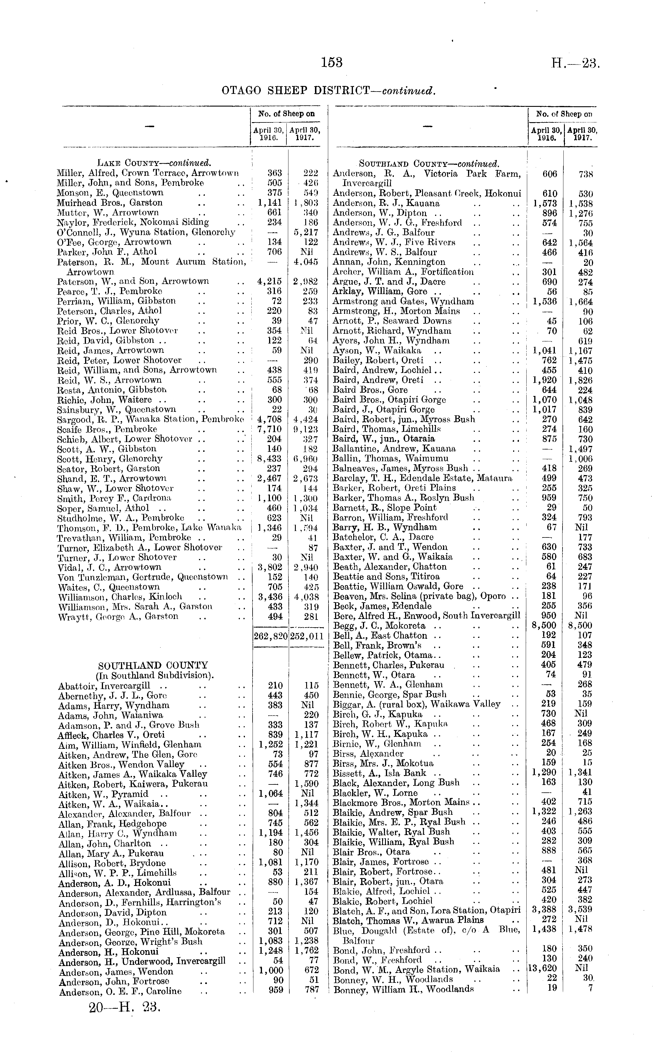 No. of Sheep on April 30, April 30, 1910. 1917. No. of Sheep on April 30, | April 3( 1916. 1917. April 30, 1917. '" LAKE County— -continued. I Miller, Alfred, Crown Terrace, Arrowtown 303 MiUer, John, and Sons, Pembroke .. j 505 Monson, E., Queenstown .. .. 375 Muirhead Bros., Garston .. .. j 1,141 Mutter, W., Arrowtown .. .. I 661 Naylor, Frederick, Nokomai Siding .. i 234 O'Connell, J., Wyuna Station, Glenorohy — O'Fee, George, Arrowtown .. .. I 134 Parker, John P., Athol .. ... . 706 Paterson, R. M., Mount Aurum Station, — Arrowtown Paterson, W., and Son, Arrowtown .. , 4,215 Pearce, T. J., Pembroke .. .. j 316 Perriam, William, Gibbston ,. .. 72 Peterson, Charles, Athol .. .. I 220 Prior, W. G, Glenorchy .. .. I 39 Reid Bros., Lower Shotover .. .. I 354 Reid, David, Gibbston .. .. .. 122 Reid, James, Arrowtown .. .. 59 Reid, Peter, Lower Shotover . . .. ■ Reid, WiUiam, and Sons, Arrowtown .. 438 Reid, W. S., Arrowtown . . .. 555 Resta, Antonio, Gibbston .. .. 68 Richio, John, Waitere . . .. .. 300 Sainsbury, W., Queenstown ... .. 22 Sargood, R. P., Wanaka Station, Pembroke : 4,708 Scaife Bros., Pembroke .. .. 7,710 Schick, Albert, Lower Shotover .. ..' 204 Scott, A. W., Gibbston .. .. 140 Scott, Henry, Glenorchy .. .. 8,433 Seator, Robert, Garston .. .. 237 Shand, E. T., Arrowtown .. .. 2,467 Shaw, W., Lower Shotover . . .. 174 Smith, Percy P., Cardrona .. .. 1,1,00 Sopor, Samuel, Athol .. .. .. 460 Studholme, W. A., Pembroke . . .. 623 Thomson, F. D., Pembroke, Lake Wanaka 1,346 Trevathan, William, Pembroke .. .. 29 Turner, Elizabeth A., Lowor Shotover Turner, J., Lower Shotover .. .. 30 Vidal, J. 0., Arrowtown .. .. 3,802 Von Tunzleman, Gertrude, Queenstown .. 152 Waitos, G, Queenstown .. .. 705 Williamson, Charles, Kinloch .. .. 3,436 Williamson, Mrs. Sarah A., Garston .. 433 Wraytt, George A., Garston .. .. 494 262,821 222 420 549 I ,803 340 186 5,217 122 Nil 4,045 2,982 259 233 83 47 Nil. 04 Nil 290 419 374 08 300 30 4,424 9,123 327 182 0,960 294 2,073 144 1 .300 1 ,034 Nil 1,594 41 87 Nil 2,940 140 425 4,038 319 281 Southland County— continued. Anderson, R. A., Victoria Park Farm, 606 Invercargill Anderson, Robert, Pleasant Greek, Hokonui 610 Anderson, R. J., Kauana .. .. 1,573 Anderson, W., Dipton .. .. .. j 896 Anderson, W. J. 6., Freshford . . .. I 574 Andrews, J. G., Balfour .. .. —. Andrews, W. J., Five Rivers .. .. j 642 Andrews, W. S., Balfour . . ... 466 Annan, John, Kennington .. ... I — Archer, William A., Fortification .. 301 Argue, J. T. and J., Dacre . . .. 690 Arklay, William, Gore .. .. .. 56 Armstrong and Gates, Wyndham .. 1,536 Armstrong, IT., Morton Mains . . .. — Arnott, P., Seaward Downs .. ., 45 Arnott, Richard, Wyndham .. .. ! 70 Ayers, John H., Wyndham . . .. j — Ayson, W., Waikaka .. .. .. | 1,041 Bailey, Robert, Oreti .. .. .. | 762 Baird, Andrew, Lochiel.. .. .. 455 Baird, Andrew, Oreti .. .. .. 1,920 Baird Bros., Gore .. . . .. 644 Baird Bros., Otapiri Gorge .. .. 1,070 Baird, J., Otapiri Gorge .. .. 1,017 Baird, Robert, jun., Myross Bush .. I 270 Baird, Thomas, Limehills . . .. I 274 Baird, W., jun., Otaraia .. ,. 875 Ballantine, Andrew, Kauana .. ... — Ballin, Thomas, Waimumu . . .. ; — Balneavos, James, Myross Bush . . .. ] 418 Barclay, T. \I., Edendale Estate, Mataura 499 Barker, Robert, Oreti Plains .. . . ; 255 Barker, Thomas A., Roslyn Bush .. ! 959 Barnett, R., Slope Point .. .. 29 Barron, William, Freshford .. . . 324 Barry, H. B., Wyndham .. .. 67 Batohelor, C. A., Dacro . . .. —■ Baxter, J. and T., Wendon .. .. j 630 Baxter, W. and G., Waikaia .. ... 580 Boatb, Alexander, Chatton .. .. 61 Beattie and Sons, Titiroa . . .. 64 Beattie, William Oswald, Gore . . ... 238 Beavon, Mrs. Selina (private bag), Oporo .. 181 Beck, Jamos, Edendale .. .. 255 Bere, Alfred H., Enwood, South Invercargill 950 Begg, J. G, Mokoreta .. .. ..8,500 Bell,' A., East Chatton .. .. .. 192 Bell, Frank, Brown's .. .. .. 591 Bellew, Patrick, Otama.. .. .. 204 Bennett, Charles, Pukerau .. .. 405 Bennett, W., Otara .. .. .. 74 Bennett, W. A., Glenham .. .. —■ Bennie, George, Spar Bush .. .. 53 Biggar, A. (rural box), Waikawa Valley . . 219 Birch, G. J., Kapuka 730 Birch, Robert W., Kapuka . . .. 468 Birch, W. H., Kapuka .. .. .. 167 Birnie, W., Glenham .. .. .. 254 Birss, Alexander .. . . . • 20 Birss, Mrs. J., Mokotua .. .. 159 Bissett, A., Isla Bank .. .. •• 1,290 Black, Alexander, Long Bush . . .. 163 Blaekler, W., Lome Blackmore Bros., Morton Mains .. . . 402 Blaikie, Andrew, Spar Bush .. .. 1,322 Blaikie, Mrs. E. P., Ryal Bush .. .. 246 Blaikie, Walter, Ryal Bush .. .. 403 Blaikie, William, Ryal Bush .. . . 282 Blair Bros., Otara .. .. ■ • 888 Blair, James, Fortrose .. .. . • — Blair, Robert, Fortrose.. .. •• 481 Blair, Robert, jun., Otara .. •. 304 Blakie, Alfred, Lochiel . . .. . . 525 Blakic, Robert, Lochiel .. ■ • 420 Blatoh, A. F., and Son, Lora Station, Otapiri 3,388 Blatch, Thomas W., Awarua Plains .. 272 Blue, Dougald (Estate of), c/o A Blue, 1,438 Balfour Bond, John, Freshford .. .. . . 180 Bond, W., Freshford .. . . ■ • 130 Bond, W. M., Argyle Station, Waikaia .. 13,620 Bonney, W. H., Woodlands Bonney, William H-, Woodlands .. 19 738 530 1,538 1,270 755 30 1,664 410 20 482 274 85 1,064 90 106 02 619 1,167 1,475 410 1,820 224 1,048 839 642 160 730 1,497 1,000 209 473 .325 750 50 793 Nil 177 733 083 247 227 171 96 350 Nil 8.500 107 348 123 479 91 268 35 159 Nil 309 249 168 25 16 1,341 130 41 715 1,263 486 555 309 565 368 Nil 273 447 382 3,539 Nil 1,478 252,011 262,820 SOUTHLAND COUNTY (In Southland Subdivision). Abattoir, Invercargill .. .. .. 210 Abernetby, J. J. L., Gore, .. . . 443 Adams, Harry, Wyndham .. .. 383 Adams, John, Waianiwa Adamson, P. and J., Grove Bush . . 333 Affleck, Charles V., Oreti .. .. 839 Aim, William, Winfield, Glenham .. 1,252 Aitken, Andrew, The Glen, Gore . . 73 Aitken Bros., Wendon Valley .. . . 554 Aitken, James A., Waikaka Valley . . 746 Aitken, Robert, Kaiwera, Pukerau . 