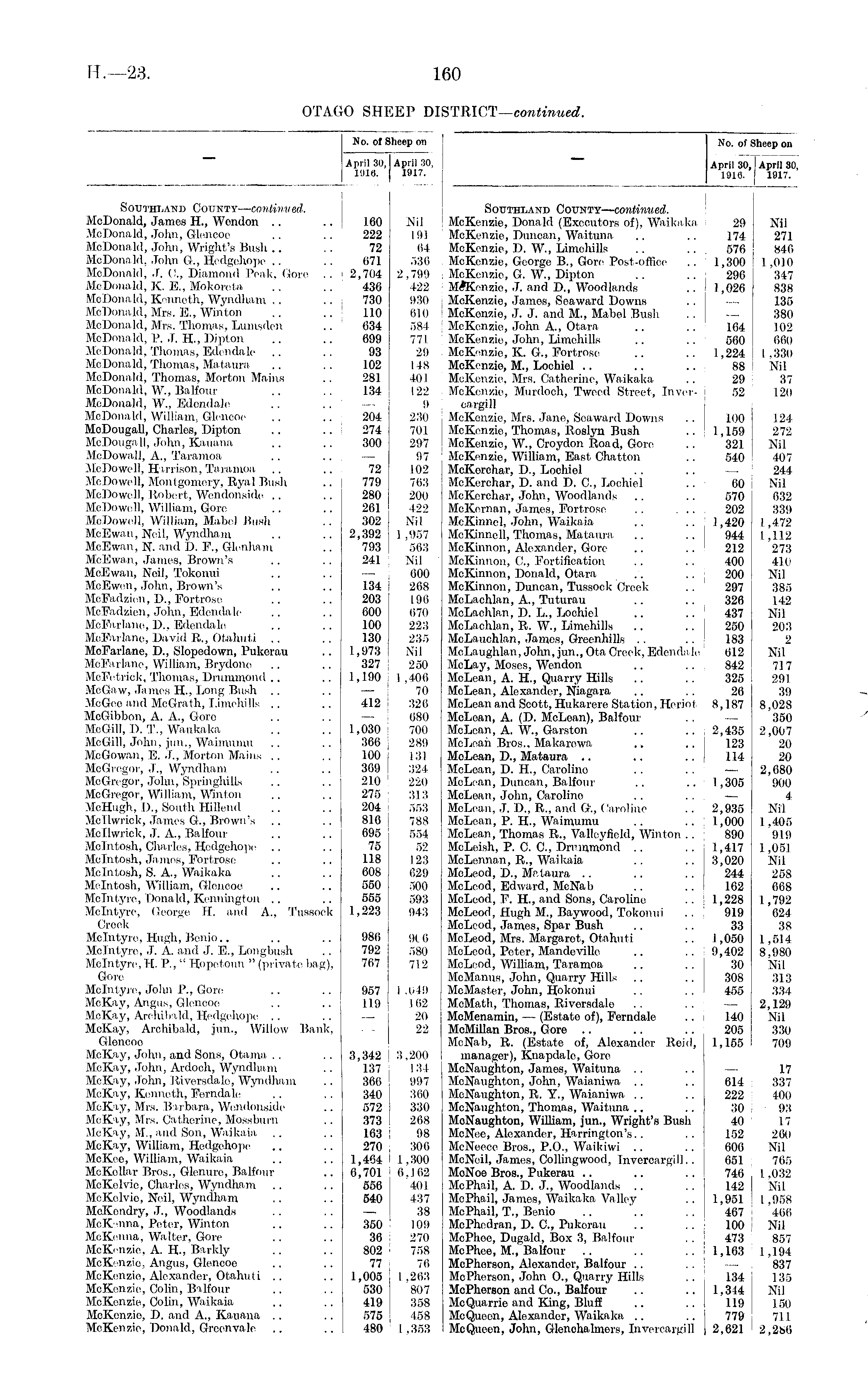 No. of Sheep on April 30,1 April 30, 1916. 1917. No. of Sheep on April 30, April 30, 1916. 1917. Southland County— contimi ed. McDonald, James H., Wondon .. .. 160 Nil McDonald, John, Glencoc .. .. 222 191 McDonald, John, Wright's Bush .. . . 72 04 McDonald, John G., Hedgehope .. .. 671 536 McDonald, J. G, Diamond Peak, Gore .. i 2,704 2,799 MoDonald, K. E., Mokoreta .. 436 422 McDonald, Kenneth, Wyndham .. .. 730 930 McDonald, Mrs. E., Winton .. .. 110 010 McDonald, Mrs. Thomas, Lumsden .. 634 584 McDonald, P. J. H, Dipton .. .. 699 771 McDonald, Thomas, Edendale .. .. 93 29 McDonald, Thomas, Mataura .. .. 102 148 McDonald, Thomas, Morton Mains .. 281 401 MoDonald, W., Balfour .. .. 134 122 McDonald, W„ Edendale .. . . — 9 McDonald, William, Glencoc .. .. 204 230 MoDougaU, Charles, Dipton .. .. 274 701 McDougall, John, Kauana .. .. 300 297 McDowall, A., Taramoa .. .. — 97 McDowell, Harrison, Taramoa .. .. ! 72 102 McDowell, Montgomery, Ryal Bush .. 779 763 McDowell, Robert, Wendonside .. .. 280 200 McDowell, William, Gore .. .. 261 422 McDowell, William, Mabel Bush .. 302 Nil McEwan, Neil, Wyndham .. .. 2,392 1,957 McEwan, N. and D. F., Glenham .. 793 563 McEwan, James, Brown's .. .. 241 Nil McEwan, Noil, Tokonui .. .. — 600 McEwen, John, Brown's .. .. 134 268 McFadzioii, D., Fortrose .. .. 203 196 McFadzien, John, Edendale .. .. 600 070 McFarlane, D., Edendale .. .. 100 223 McFarlane, David R., Otahuti .. .. 130 235 McFarlane, D., Slopedown, Pukerau .. 1,973 Nil McFarlane, William, Brydone .. .. 327 250 McFctrick, Thomas, Drummond .. .. 1,190 1,400 McGaw, James H, Long Bush .. .. —■ 70 McGee and McGrath, Limehills .. .. 412 326 McGibbon, A. A., Goro .. .. — 080 McGill, D. T., Waukaka .. .. 1,030 700 McGill, John, jun., Waimumu .. .. 366] 289 McGowan, E. J., Morton Mains .. .. 100 131 McGregor, J'., Wyndham .. .. 369 ! 324 McGregor, John, 'Springhills .. .. 210 j 220 McGregor, William, Winton .. .. 276 31:'. McHugh, I)., South HiUend .. .. 204 I 553 MclTwrick, James G., Brown's .. .. 816 I 788 Mcllwrick, J. A., Balfour .. .. 695 554 Mcintosh, Charles, Hedgehope .. . . 75 52 Mcintosh, James, Fortrose .. .. 118 123 Mcintosh, S. A., Waikaka .. .. 608 629 Mcintosh, William, Glencoc .. .. 550 I 500 Mdntyre, Donald, Kennington . . .. 555 593 Mclntyro, George H. and A., Tussock 1,223 943 Creek Mclntyro, Hugh, Benio.. .. .. 980 9(0 Mclntyro, J. A. and J. E., Longbush .. 792 580 Mdntyre, H. P., " Hopetoun " (private bag), 767 712 Gore Mdntyre, John P., Gore .. .. 957 1 ,049 McKay, Angus, Glencoc .. .. 119 162 McKay, Archibald, Hedgehope .. .. — 20 McKay, Archibald, jun., Willow Bank, 22 Glencoo McKay, John, and Sons, Otama . . .. 3,342 3,200 McKay, John, Ardoch, Wyndham .. 137 134 McKay, John, Wyndham .. 366 997 McKay, Kenneth, Ferndale ' .. .. 340 360 McKay, Mrs. Barbara, Wendonside .. 572 330 McKay, Mrs. Catherine, Mossburn .. 373 268 McKay, M., and Son, Waikaia .. .. 163 I 98 McKay, William, Hedgehope .. .. 270 j 306 McKoo, William, Waikaia .. .. 1,464 11,300 McKollar Bros., Glenure, Balfour .. 6,701 | 6.162 McKoIvio, Charles, Wyndham .. .. 666 401 McKclvic, Neil, Wyndham .. .. 640 437 McKendry, J., Woodlands . . . . — 38 McKenna, Peter, Winton .. .. 350 109 McKonna, Walter, Gore .. .. 36 270 McKenzie, A. H, Barkly .. .. 802 758 McK-nzio, Angus, Glencoo .. .. 77 70 McKenzie, Alexander, Otahuti .. .. 1,005 1,263 McKenzie, Colin, Balfour .. . . 530 807 McKenzie, Colin, Waikaia .. .. 419 358 McKenzie, D. and A., Kauana .. . . 575 4.58 McKenzie, Donald, Greenvale .. .. 480 1,353 Southland County— continued. Nil ! McKenzie, Donald (Executors of), Waikaka 29 Nil 191 McKenzie, Duncan, Waituna .. .. 174 271 04 McKenzie, D. W., Limehills .. .. 576 846 536 McKenzie, George B., Gore Post-office ..1,300 1,010 2,799 McKenzie, G. W., Dipton .. .. 296 347 422 M-*Kenzio, J. and D., Woodlands .. ■ 1,026 838 930 McKenzio, Jamos, Seaward Downs .. —. 135 610 McKenzie, J. J. and M., Mabel Bush .. — 380 5ST McKenzie, John A., Otara .. .. 164 102 771 MoKenzie, John, Limehills .. .. 560 660 29 McKenzie, K. G., Fortrose .. .. 1,224 1,330 148 McKenzie, M., Lochiel .. .. .. 88 Nil 401 McKenzie, Mrs. Catherine, Waikaka .. 29 37 122 McKenzie, Murdoch, Tweed Street, Inver- 52 I 120 9 cargill 230 : McKenzie, Mrs. Jane, Seaward Downs .. 100 124 701 i McKenzie, Thomas, Roslyn Bush .. 1,159 272 297 ; McKenzie, W., Croydon Road, Gore .. 321 Nil 97 .McKenzie, William, East Chatton ., 540 407 102 McKorchar, IX, Lochiol . . .. 244 763 McKorchar, D. and D. G, Lochiel .. 60 Nil 200 McKorchar, John, Woodlands .. .. 570 632 422 McKernan, James, Fortrose 202 339 Nil McKinnel, John, Waikaia .. .. 1,420 1,472 1,957 McKinncll, Thomas, Mataura .. .. I 944 1,112 563 McKinnon, Alexander, Gore .. .. 212 273 Nil McKinnon, C, Fortification .. .. 400 410 600 McKinnon, Donald, Otara .'. .. j 200 Nil 268 McKinnon, Duncan, Tussock Creek .. 297 385 190 McLachlan, A., Tuturau .. .. 326 142 070 McLachlan, D. L., Lochiel .. .. 437 Nil 223 McLachlan, R. W., Limehills .. .. 250 203 235 McLauchlan, James, Greenhills .. .. 183 2 Nil McLaughlan, John,jun., Ota Creek, Edendale 612 Nil 250 McLay, Moses, Wendon .. .. 842 717 1,400 McLean, A. H., Quarry Hills .. .. 325 291 70 McLean, Alexander, Niagara .. .. 26 39 326 McLean and Scott, Hukarere Station, Heriot 8,187 8,028 080 McLoan, A. (D. McLoan), Balfour . . 350 700 McLean, A. W., Garston .. .. 2,435 2,007 289 McLean Bros., Makarowa .. .. 123 20 131 McLoan, D., Mataura .. .. .. I 114 20 324 McLoan, D. H., Caroline .. .. — 2,680 220 McLean, Duncan, Balfour .. .. 1,305 900 313 McLean, John, Carolino .. . . — 4 553 McLean, J. D., R., and G\, Caroline ..2,936 Nil 788 McLean, P. H, Waimumu .. .. 11,000 1,405 554 McLean, Thomas R., Valleyficld, Winton .. \ 890 919 52 McLcish, P. G G, Drummond .. .. 1,417 1,051 123 McLennan, R„ Waikaia .. .. 3,020 Nil 629 McLeod, D., Mataura .. .. .. 244 258 500 McLeod, Edward, McNab .. .. 162 668 593 McLeod, F. H„ and Sons, Caroline .. i 1,228 