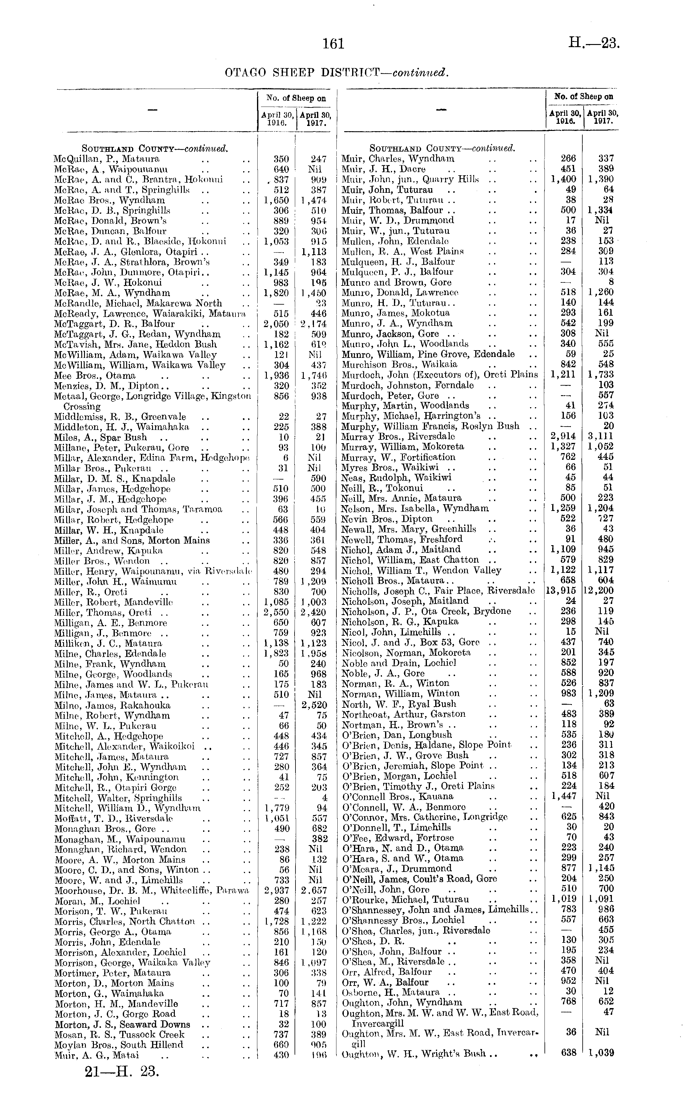 No. of Sheep on April 30,1 April 30, 1916. | 1917. No. of Sheep on April 30, April 30, 1916. 1917. Southland County— continued. McQuillan, P., Mataura McRae, A , Waipounamu McRae, A. and G, Brantra, Hokonui McRae, A. and T., Springhills Mcltao Bros., Wyndham McRae, D. B„ Springhills McRae, Donald, Brown's McRae, Duncan, Balfour McRae, D. and R., Blaeside, Hokonui McRao, J. A., Glonlorn, Otapiri McRae, J. A., Strathlora, Brown's McRae, John, Dunmore, Otapiri.. McRae, J. W., Hokonui McRae, M. A., Wyndham McRandle, Michael, Makarewa North Mcltcady, Lawrence, Waiarakiki, Mataura McTaggart, D. R., Balfour McTaggart, J. G., Redan, Wyndham McTavish, Mrs. Jane, Heddon Bush Mc William, Adam, Waikawa Valley Mc William, William, Waikawa Valley Mee Bros., Otama Menzies, D. M., Dipton.. Mctaal, George, Longridge Village, Kingston Crossing Middlomiss, R. B., Greenvale Middleton, H. J., Waimahaka Milos, A., Spar Bush Millane, Peter, Pukerau, Gore Millar, Alexander, Edina Farm, Hedgehope Millar Bros., Pukerau Millar, D. M. S., Knapdale Millar, James, Hedgehope Millar, J. M., Hedgehope Millar, Joseph and Thomas, 'Taramoa Millar, Robert, Hedgehope Millar, W. H., Knapdale Millor, A., and Sons, Morton Mains Miller, Andrew, Kapuka Miller Bros., Wendon Miller, Henry, Waipounamu, via Riversdale Miller, John H., Waimumu Miller, R., Oreti Miller, Robert, Mandeville Miller, Thomas, Oreti Milligan, A. E., Benmore Milligan, J., Benmore Milliken, J. G, Mataura Milne, Charles, Edendale ... Milne, Frank, Wyndham Milne, George, Woodlands Milne, James and W. L., Pukerau Milne, James, Mataura Milne, James, Rakahouka Milne, Robert, Wyndham Milno, W. L., Pukerau Mitchell, A., Hedgehope Mitchell, Alexander, Waikoikoi Mitchell, James, Mataura Mitchell, John E., Wyndham Mitchell, John, Kennington Mitchell, R., Otapiri Gorge Mitchell, Walter, Springhills Mitchell, William D., Wyndham Moflatt, T. D., Riversdale Monaghan Bros., Gore Monaghan, M., Waipounamu Monaghan, Richard, Wendon Moore, A. W., Morton Mains Mooro, C. D., and Sons, Winton Moore, W. and J., Limehills Moorhouse, Dr. B. M., Whiteolifle, Parawa Moran, M., Lochiel M'orison, T. W., Pukerau Morris, Charles, North Chatton Morris, Georgo A., Otama Morris, John, Edendale Morrison, Alexander, Lochiel Morrison, George, Waikaka Valley .Mortimer, Peter, Mataura Morton, D., Morton Mains Morton, G., Waimahaka Morton, H. M., Mandeville Morton, J. G, Gorgo Road Morton, J. S., Seaward Downs Mosan, R. S., Tussock Greek Moylan Bros., South HiUend Muir, A. G., Matai 350 640 . 837 512 1,050 306 889 320 1,053 349 1,145 983 1,820 515 2,050 182 1,162 121 304 1,936 320 856 22 225 10 93 6 31 510 396 63 566 448 336 820 820 480 789 830 1,085 2,550 050 759 I., 138 1,823 50 165 175 510 247 Nil 909 387 I ,474 510 954 300 915 1,113 183 964 195 I ,450 23 446 2,174 509 619 Nil 437 1,746 352 938 27 388 21 100 Nil Nil 590 500 455 10 559 404 361 548 857 294 1 ,209 700 I ,003 2,420 607 923 1 ,123 1,958 240 968 183 Nil 2,520 75 50 434 345 857 364 75 203 4 94 557 682 382 Nil 132 Nil Nil 2.057 257 023 1,222 1,1.68 150 120 I ,097 338 79 141 857 13 100 389 905 196 Southland County— conlinu ed. Muir, Charles, Wyndham Muir, J. H., Dacre Muir, John, jun., Quarry Hills Muir, John, Tuturau Muir, Robert, Tuturau Muir, Thomas, BaU'our Muir, W. D., Drummond Muir, W., jun., Tuturau Mullen, John, Edendale Mullen, It. A., West Plains Mulqueen, IL J., Balfour Mulqueen, P. J., Balfour Munro and Brown, Gore Munro, Donald, Lawrence Munro, IT. D., Tuturau.. Munro, James, Mokotua Munro, J. A., Wyndham Munro, Jackson, Gore Munro, John L., Woodlands Munro, WiUiam, Pine Grove, Edendale Murchison Bros., Waikaia Murdoch, John (Executors of), Oreti Plains Murdoch, Johnston, Ferndale Murdoch, Peter, G ore Murphy, Martin, Woodlands Murphy, Michael, Harrington's Murphy, William Francis, Roslyn Bush .. Murray Bros., Riversdale Murray, WiUiam, M'okoreta Murray, W., Fortification Myres Bros., Waikiwi .. Neas, Rudolph, Waikiwi Neill, It., Tokonui Neill, Mrs. Annie, Mataura Nelson, Mrs. Isabella, Wyndham Novin Bros., Dipton Newall, Mrs. Mary, Greenhills Ncwell, Thomas, Freshford Nichol, Adam J-, Maitland Nichol, William, East Chatton Nichol, William T., Wendon Valley Nicholl Bros., Mataura Nicholls, Joseph G, Fair Place, Riversdale Nicholson, Joseph, Maitland Nicholson, J. P., Ota Creok, Brydone Nicholson, R. G., Kapuka Nicol, John, Limehills Nicol, J. and J., Box 53, Gore Nicolson, Norman, Mokoreta Noble and Drain, Lochiel Noble, J. A., Gore Norman, It. A., Winton Norman, William, Winton North, W. F., Ryal Bush Northcoat, Arthur, Garston Nortman, H., Brown's O'Brien, Dan, Longbush O'Brien, Denis, Haldane, Slope Point O'Brien, J. W., Grove Bush O'Brien, Jeremiah, Slope Point O'Brien, Morgan, Lochiel O'Brien, Timothy J., Oreti Plains O'Connell Bros., Kauana O'Connoll, W. A., Bonmoro O'Connor, Mrs. Catherine, Longridge O'Donnell, T., Limehills O'Fee, Edward, Fortrose O'Hara, N. and D., Otama O'Hara, S. and W., Otama O'Mcara, J., Drummond O'Neill, James, Coult's Road, Gore O'Neill, John, Gore O'Rourke, Michael, Tuturau O'Shannessey, John and James, Limehills.. O'Shiinnessy Bros., Lochiel O'Shoa, Charles, jun., Riversdale O'Shea, D. R. O'Shea, John, Balfour O'Shea, M., Riversdale . . Orr, Alfred, Balfour Orr, W. A., Balfour Osborne, H., Mataura Oughton, John, Wyndham Oughton, Mrs. M. W. and W. W., East Road, Invorcargill Oughton, Mrs. M. W., East Road, Invercargill Oughton, W. H., Wright's Bush 266 451 1,400 49 38 500 17 36 238 284 304 518 140 293 542 308 340 59 842 1,211 41 156 2,914 1,327 762 66 45 85 500 1,259 522 36 91 1,109 579 1,122 058 13,915 24 236 298 15 437 201 852 588 526 983 337 389 1 ,390 04 28 1,334 Nil 27 153 309 113 304 8 1,260 144 161 199 Nil 5,55 25 548 1,733 103 557 274 103 20 3,111 1,052 445 51 44 51 223 1,204 727 43 480 945 829 1,117 604 12,200 27 119 145 Nil 740 345 197 920 837 I ,209 63 389 92 18(J 311 318 213 607 184 Nil 420 843 20 43 240 257 1 ,145 250 700 1,091 980 663 455 305 234 Nil 404 Nil 12 052 47 47 00