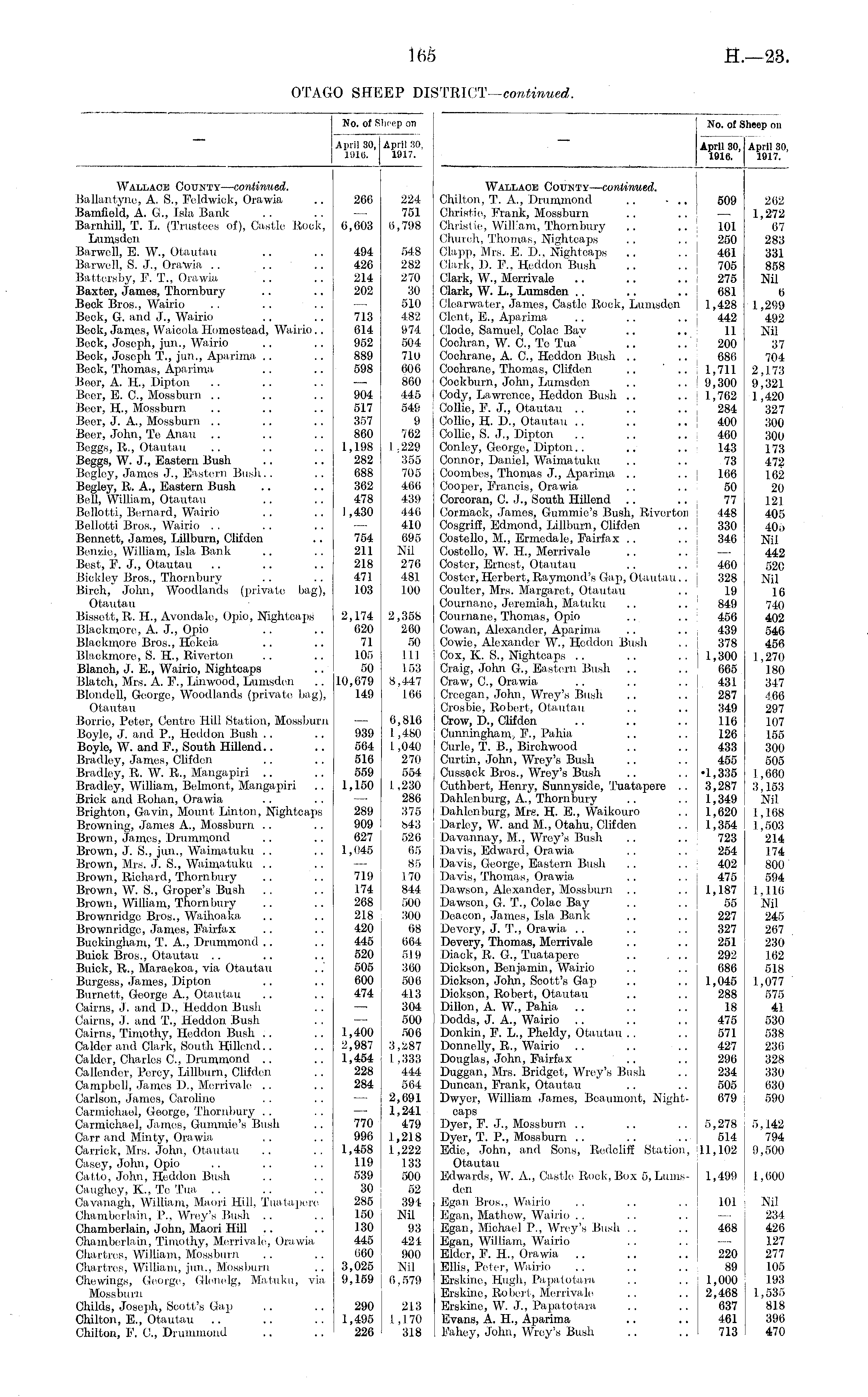 No. of Slirep on April 30, April 30, 1916. 1917. No. of Sheep on April 30,1 April 30, 1916. 1917. Wallaob County— continued. Ballantyne, A, S., Feldwick, Orawia Bamfield, A. G., Isla Bank Bamhill, T. L. (Trustees of), Castle Rock, Lumsden Barwell, E. W., Otautau Barwell, S. J., Orawia Battcrsby, F. T., Orawia Baxter, James, Thornbury Beck Bros., Wairio Beck, G. and J., Wairio Beck, James, Waicola Homestead, Wairio.. Bock, Joseph, jun., Wairio Beck, Josoph T., jun., Aparima Beck, Thomas, Aparima Boor, A. H., Dipton Beer, E. G, Mossburn Beer, H., Mossburn Beer, J. A., Mossburn Beer, John, Te Anau Boggs, R., Otautau Beggs, W. J., Eastern Bush Bcgley, James J., Eastern Bush.. Begley, R. A., Eastern Bush Bell, William, Otautau Bellotti, Bernard, Wairio Bellotti Bros., Wairio Bennett, James, Lillburn, Clifden Benzie, William, Isla Bank Best, F. J., Otautau Bickley Bros., Thornbury Birch, John, Woodlands (private bag), Otautau Bissett, Tt. IT., Avondalo, Opio, Nightcaps Blackmore, A. J., Opio Blackmore Bros., Hekeia Blackmore, S. H., Riverton Blanch, J. E., Wairio, Nightcaps Blatch, Mrs. A. P., Linwood, Lumsden BlondcU, George, Woodlands (private bag), Otautau Borrio, Peter, Centro Hill Station, Mossburn Boyle, J. and P., Heddon Bush Boyle, W. and F., South Hillend.. Bradley, James, Clifden Bradley, It. W. R., Mangapiri Bradley, William, Belmont, Mangapiri Brick and Rohan, Orawia Brighton, Gavin, Mount Linton, Nightcaps Browning, James A., Mossburn Brown, James, Drummond Brown, J. S., jun., Waimatuku Brown, Mrs. J. S., Waimatuku Brown, Richard, Thornbury Brown, W. S., Groper's Bush Brown, WiUiam, Thornbury Brownridgo Bros., Waihoaka Brownridge, James, Fairfax Buckingham, T. A., Drummond Buick Bros., Otautau Buick, R., Maraekoa, via Otautau Burgess, James, Dipton Burnett, George A., Otautau Cairns, J. and D., Heddon Bush Cairns, J. and T., Heddon Bush Cairns, Timothy, Heddon Bush Calder and Clark, South Hillend Calder, Charles G, Drummond Callender, Percy, Lillburn, Clifden Campbell, .Tames D., Merrivale Carlson, James, Caroline Garmichaol, George, 'Thornbury Carmiohael, James, Gummie's Bush Carr and Minty, Orawia Carrick, Mrs. John, Otautau Casey, John, Opio Catto, John, Heddon Bush Caughey, K., To 'Tua. Cavanagh, William, Maori Hill, Tuatapere Chamberlain, P., Wrey's Bush Chamberlain, John, Maori HiU Chamberlain, Timothy, Merrivale, Orawia Chartres, William, Mossburn Chartres, William, jun., Mossburn Chewings, George, Glonelg, Matuku, via Mossburn Childs, Joseph, Scott's Gap Chilton, E., Otautau Chilton, F. G, Drummond 266 6,603 494 426 214 202 713 614 952 889 598 904 517 357 860 1,198 282 688 362 478 1,430 754 211 218 471 103 2,174 620 71 105 50 10,079 149 939 564 516 559 1,150 224 751 0,798 548 282 270 30 510 482 974 504 710 006 860 445 549 9 762 I .229 355 705 400 439 440 410 695 Nil 276 481 100 2,358 260 50 11.1 153 8,447 166 6,816 1 ,480 I. ,040 270 554 1,230 286 375 843 520 05 85 170 844 500 300 68 664 519 360 506 413 304 500 506 3,287 1,333 444 564 2,691 1,241 479 1,218 1,222 133 500 52 394 Nil 93 424 900 Nil 0,579 Wallace County— continued. Chilton, T. A., Drummond .. • .. 509 Christie, Frank, Mossburn Christie, WiUiam, Thornbury .. .. 101 Church, Thomas, Nightcaps . . .. 250 Clapp, Mrs. E. D., Nightcaps .. .. 461 Clark, D. P., Heddon Bush .. .. 705 Clark, W., Merrivale .. .. .. 275 Clark, W. L., Lumsden .. .. .. j 681 Clearwater, James, Castle Rock, Lumsden ] 1,428 Clcnt, E., Aparima .. .. .. j 442 Glode, Samuel, Colac Bav .. .. 11 Cochran, W. G, To Tua' .. ..' ! 200 Cochrane, A. G, Heddon Bush .. .. 680 Cochrane, Thomas, Clifden .. .. 1,711 Cockburn, John, Lumsden .. .. 9,300 Cody, Lawrence, Heddon Bush .. ,. 1,762 Collie, F. J., Otautau .. .. ... 284 Collie, H. D., Otautau .. .. .. 400 Collie, S. J„ Dipton .. .. .. j 460 Conley, George, Dipton.. .. ,. 143 Connor, Daniel, Waimatuku .. .. 73 Coombes, Thomas J., Aparima .. .. 166 Cooper, Francis, Orawia .. .. 50 Corcoran, C. J., South HiUcnd .. .. 77 Cormack, James, Gummie's Bush, Riverton ; 448 Oosgriff, Edmond, Lillburn, Clifden .. \ 330 Costello, M., Ermcdale, Fairfax .. .. j 346 Gostollo, W. H., Morrivale .. .. I — Coster, Ernest, Otautau .. .. ! 460 Coster, Herbert, Raymond's Gap, Otautau.. ■ 328 Coulter, Mrs. Margaret, Otautau .. 19 Cournanc, Jeremiah, Matuku .. ,. 849 Cournane, Thomas, Opio .. ,, 456 Cowan, Alexander, Aparima .. .. 439 Cowie, Alexander W., Heddon Bush . . [ 378 Cox, K. S., Nightcaps .. .. ..1,300 Craig, John G., Eastern Bush .. ,, 665 Craw, G, Orawia .. .. .. 431 Crcegan, John, Wrey's Bush .. .. 287 Crosbie, Robert, Otautau .. .. 349 Crow, D., CUfden .. .. .. 116 Cunningham, F., Pahia .. .. 126 Curie, T. B., Birchwood .. .. 433 Curtin, John, Wrey's Bush .. .. 455 Cussack Bros., Wrey's Bush .. .. -1,335 Cuthbert, Henry, Sunnyside, Tuatapere .. 3,287 Dahlenburg, A., Thornbury .. .. 1,349 Dahlenburg, Mrs. H. E„ Waikouro .. 1,620 Darloy, W. and M., Otahu, Clifden .. 1,3.54 Davannay, M., Wrey's Bush .. .. 723 Davis, Edward, Orawia .. .. 254 Davis, George, Eastern Bush .. .. j 402 Davis, Thomas, Orawia .. .. 475 Dawson, Alexander, Mossburn .. .. 1,187 Dawson, G. T., Colac Bay .. .. 55 Deacon, James, Isla Bank .. .. 227 Devory, J. T., Orawia .. .. .. 327 Devery, Thomas, Merrivale . . .. 25 T Diack, R. G., Tuatapere .. ... 292 Dickson, Benjamin, Wairio .. .. 080 Dickson, John, Scott's Gap .. .. 1,045 Dickson, Robert, Otautau .. .. 288 Dillon, A. W., Pahia .. .. .. 18 Dodds, J. A., Wairio .. .. .. 475 Donkin, p. L., Pheldy, Otautau . . .. 571 Donnelly, R., Wairio . . .. .. 427 Douglas, John, Fairfax .. .. 290 Duggan, Mrs. Bridget, Wrey's Bush .. 234 Duncan, Frank, Otautau .. .. 505 Dwyer, William James, Beaumont, Night- 679 caps Dyer, F. J., Mossburn .. .. ..5,278 Dyer, T. P., Mossburn .. .. .. 514 Edie, John, and Sons, Redcliff Station, 11,102 Otautau Edwards, W. A., Castle Rock, Box 5, Linns- 1,499 den Egan Bros., Wairio . . . . . . 101 Egan, Mat how, Wairio . . . . . . — Egan, Michael P., Wrey's Bush .