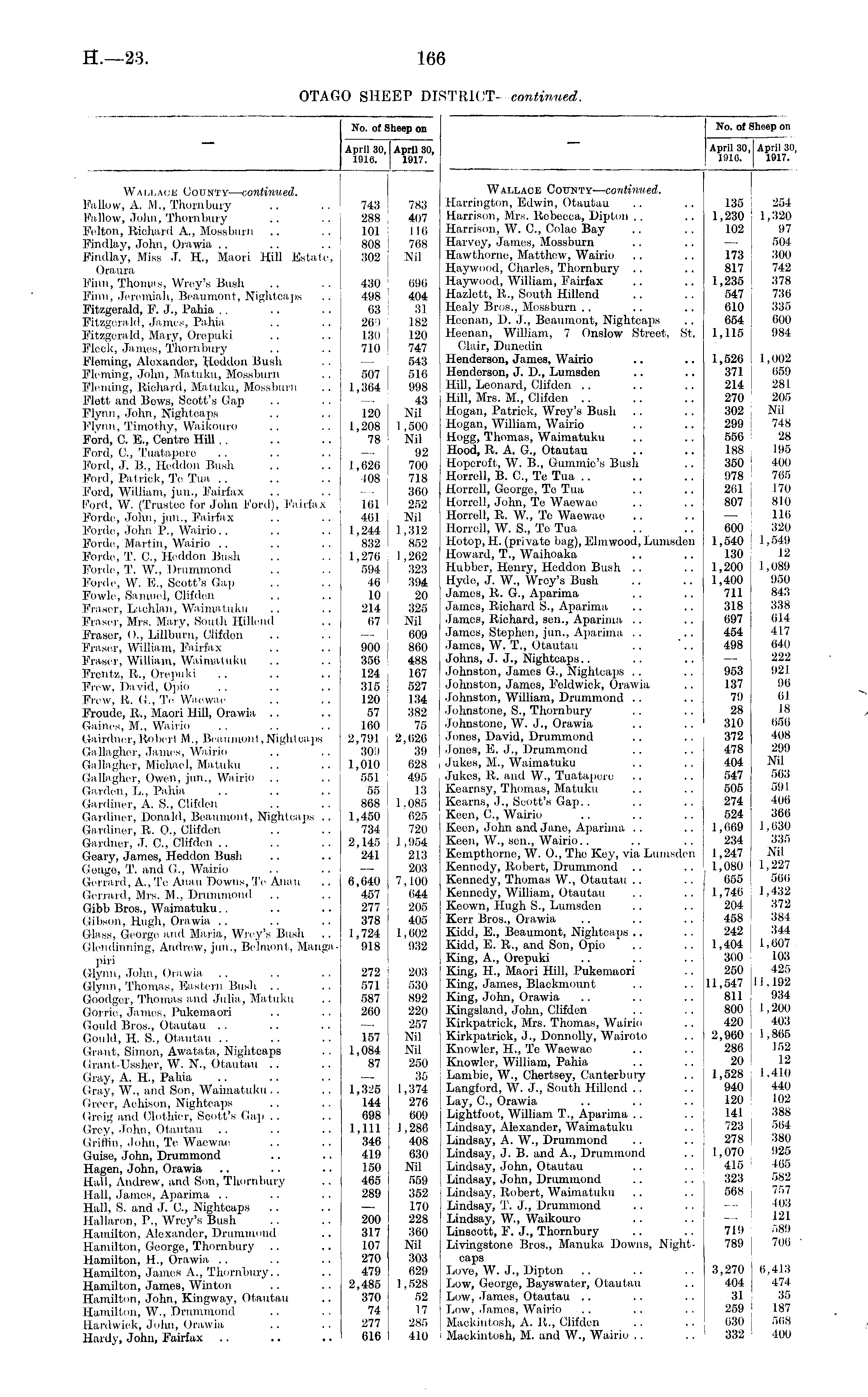 No. of Sheep on No. of Sheep on April 30, April 30, 1916. 1917. April 30, April 30, 1910. 1917. Wai,lack County— continued. Fallow, A. M., Thornbury Fallow, John, Thornbury Felton, Richard A., Mossburn Findlay, John, Orawia Findlay, Miss J. H, Maori Hill Estate, Oraura Finn, Thomas, Wrey's Bush Finn, Jeremiah, Beaumont, Nightoaps Fitzgerald, P. J., Pahia Fitzgerald, James, Pahia Fitzgerald, Mary, Orepuki Fleck, James, Thornbury Fleming, Aloxandor, Heddon Bush Fleming, John, Matuku, Mossburn Fleming, Richard, Matuku, Mossburn Flott and Bows, Scott's Gap Flynn, 7lohn, Nightcaps Flvnn, Timothy, Waikouro Ford, C. E., Centre HiU . . Ford, C, Tuatapere Ford, J. B., Heddon Bush Ford, Patrick, Te Tua .. Ford, William, jun., Fairfax Ford, W. (Trustee for John Ford), Fairfax Forde, John, jun., Fairfax Forde, John P., Wairio.. Forde, Martin, Wairio Forde, T. G, Heddon Bush Porde, T. W., Drummond Forde, W. E., Scott's Gap Fowle, Samuel, Clifden Fraser, Laohlan, Waimatuku Eraser, Mrs. Mary, South Hillend Frasor, ()., Lillburn, Clifdon Fraser, William, Fairfax Fraser, William, Waimatuku Frcntz, R., Orepuki Frew, David, Opio Frew, It. Or., Te Waewae Froude, R., Maori Hill, Orawia Gaines, M., Wairio Gairdner, Robert M., Beaumont,Nightcaps Gallagher, James, Wairio Gallagher, Michael, Matuku Gallagher, Owen, jun., Wairio Garden, L., Pahia Gardiner, A. S., Clifden Gardiner, Donald, Beaumont, Nightoaps .. Gardiner, R. 0., Clifden Gardner, J. G, Clifden Geary, James, Heddon Bush Gouge, T. and G., Wairio Gerrard, A., Te Auau Downs, Te Anau Gerrard, Mrs. M., Drummond Gibb Bros., Waimatuku. . Gibson, Hugh, Orawia Glass, George and Maria, Wrey's Bush Gleiidiniiing, Andrew, jun., Belmont, Mangapiri Glynn, John, Orawia Glynn, Thomas, Eastern Bush Goodgcr, Thomas and Julia, Matuku Gorrie, James, Pukemaori Gould Bros., Otautau Gould, H. S., Otautau .. Grant, Simon, Awatata, Nightcaps Grant-TJssher, W. N., Otautau .. Gray, A. H., Pahia Gray, W., and Son, Waimatuku Greer, Achison, Nightcaps Grcig and Clothier, Scott's Gap Grey, .Tohn, Otautau (Iril'lin, .lohn, Te Waewae Guise, John, Drummond Hagen, John, Orawia Hall, Andrew, and Son, Thornbury Hall, James, Aparima Hall, S. and J. G, Nightcaps Hallaron, P., Wrey's Bush Hamilton, Alexander, Drummond Hamilton, George, Thornbury Hamilton, H., Orawia Hamilton, James A., Thornbury.. Hamilton, James, Winton Hamilton, John, Kingway, Otautau Hamilton, W., Drummond Hardwick, John, Orawia Hardy, John, Fairfax 743 288 101 808 302 430 498 03 269 130 710 507 1,304 120 1,208 78 1,626 408 101 461 1,244 832 1,276 594 46 10 214 07 900 356 124 315 120 57 160 2,791 309 1,010 551 55 868 1,450 734 2,145 241 783 407 110 768 Nil 090 404 31 182 120 747 543 516 998 43 Nil 1,500 Nil 92 700 718 360 252 Nil 1,312 852 1,262 323 394 20 325 Nil 009 860 488 167 527 134 382 75 2,626 89 628 495 13 1.085 625 720 1,954 213 203 7,100 044 205 405 1,002 932 Wallace County— continued. Harrington, Edwin, Otautau Harrison, Mrs. Robeeca, Dipton Harrison, W. G, Colac Bay Harvey, James, Mossburn Hawthorne, Matthew, Wairio Haywood, Charles, Thornbury Haywood, William, Fairfax Hazlett, R., South Hillond Healy Bros., Mossburn Heenan, D. J., Beaumont, Nightcaps Heenan, William, 7 Onslow Street, St. Clair, Dunedin Henderson, James, Wairio Henderson, J. D., Lumsden Hill, Leonard, Clifden Hill, Mrs. M., Clifden Hogan, Patrick, Wrey's Bush Hogan, William, Wairio Hogg, Thomas, Waimatuku Hood, R. A. G., Otautau Hopcroft, W. B., Gummie's Bush Horrell, B. C, Te Tua Horrell, George, To Tua Horrell, John, Te Waewae Horrell, R. W., To Waewao Horrell, W. S., To Tua Hotop, H. (privato bug), Elmwood, Lumsden Howard, T., Waihoaka Hubbor, Henry, Heddon Bush Hyde, J. W., Wrey's Bush James, R. G., Aparima James, Richard S., Aparima James, Richard, sen., Aparima James, Stephen, jun., Aparima •Tames, W. T., Otautau Johns, J. J., Nightcaps.. Johnston, James G., Nightcaps Johnston, James, Feldwick, Orawia Johnston, William, Drummond Johnstone, S., Thornbury Johnstone, W. J., Orawia Junes, David, Drummond Jones, E. J., Drummond Jukes, M., Waimatuku Jukes, It. and W., Tuatapere Kearnsy, Thomas, Matuku Kearns, J., Scott's Gap.. Keen, C, Wairio Keen, John and Jane, Aparima .. Keen, W., sen., Wairio.. Kcmpthorne, W. 0., The Key, via Lumsden Kennedy, Robert, Drummond Kennedy, Thomas W., Otautau Kennedy, William, Otautau Keown, Hugh S., Lumsden Kerr Bros., Orawia Kidd, E., Beaumont, Nightoaps Kidd, E. R., and Son, Opio King, A., Orepuki King, H., Maori Hill, Pukemaori King, James, Blackmount King, ,Tohn, Orawia Kingsland, John, Clifden Kirkpatrick, Mrs. Thomas, Wairio Kirkpatrick, J., Donnelly, Wairoto Knowler, H., To Waewao Knowler, William, Pahia Lambie, W., Chertsey, Canterbury Langford, W. J., South Hillend Lay, C, Orawia Lightfoot, William T., Aparima Lindsay, Alexander, Waimatuku Lindsay, A. W., Drummond Lindsay, J. B. and A., Drummond Lindsay, John, Otautau Lindsay, John, Drummond Lindsay, Robert, Waimatuku Lindsay, T. J., Drummond Lindsay, W., Waikouro Linscott, P. .)., Thornbury Livingstone Bros., Manuka Downs, Nightcaps Love, W. J., Dipton Low, George, Bayswater, Otautau Low, .lames, Otautau Low, James, Wairio Mackintosh, A. It., Clifden Mackintosh, M. and W., Wairio 135 1,230 102 173 817 1,235 547 610 654 1,116 1,526 371 214 270 302 299 556 188 350 978 201 807 600 1,540 130 1,200 1,400 711 318 697 454 498 953 137 7!) 28 310 372 478 404 547 505 274 524 1,669 234 1,247 1,080 655 1,740 204 458 242 1,404 300 250 11,547 811 800 420 2,960 286 20 1,528 940 120 141 723 278 1,070 415 323 568 254 1,320 97 504 300 742 378 736 335 600 984 i ; 1,002 659 281 205 Nil 748 28 195 400 705 170 810 116 320 .1,549 12 1,089 950 843 338 614 117 010 222 921 90 01 18 656 ■108 299 Nil 503 591 406 366 1,030 335 Nil 1,227 560 I, 132 372 384 344 1,007 103 425 11,192 934 1,200 403 1,865 152 12 1,410 440 102 388 504 380 925 465 582 757 103 121 589 700 6,040 457 277 378 1,724 918 272 571 587 260 157 1,084 87 1,325 144 698 1,111 346 419 150 465 289 203 530 89