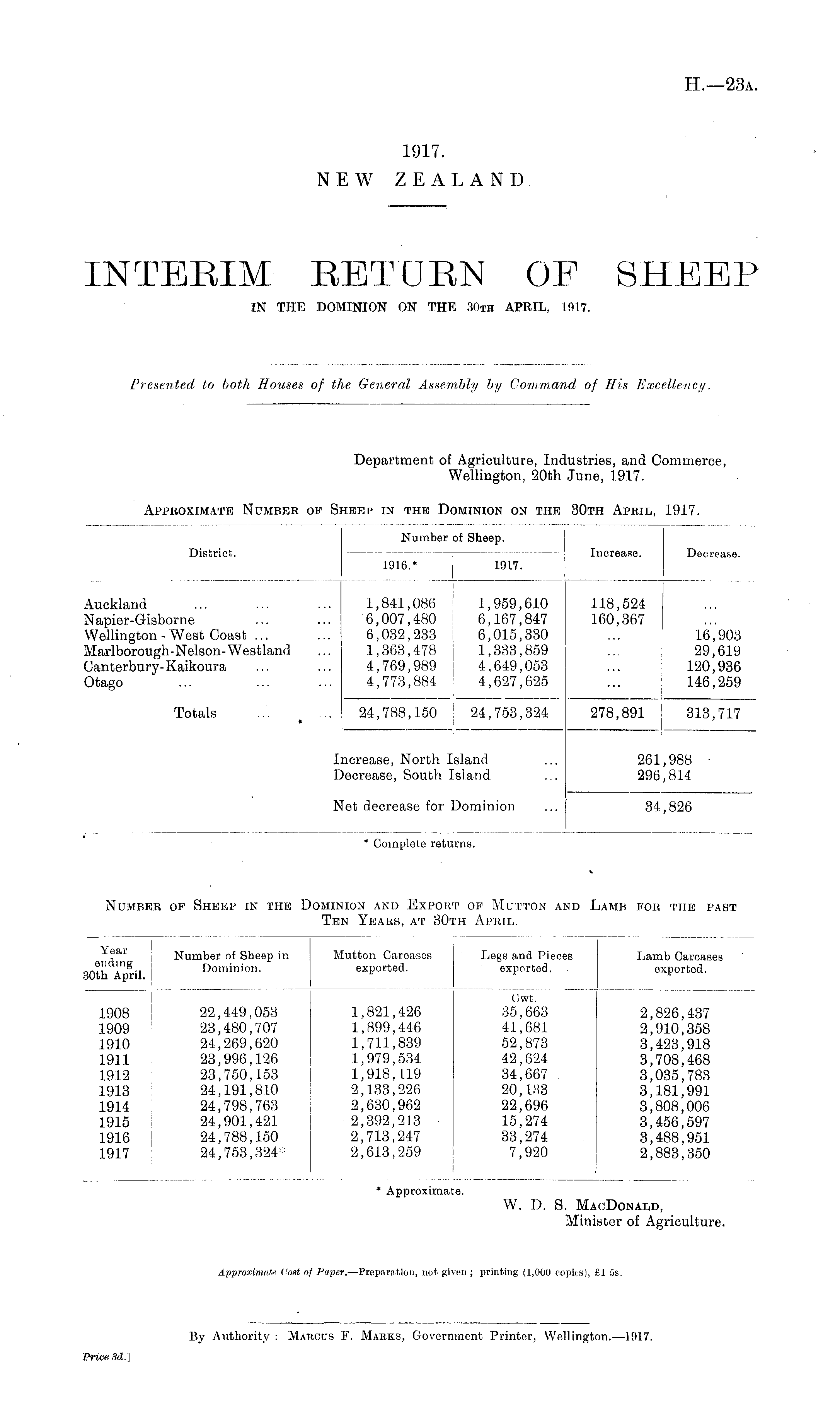 Year ending 10th April. Year ending Dth April. Number of Sheep in Dominion. mber of Sheep in Dominion. Mutton Carcases exported. Legs and Pieces exported. Lamb Carcases oxported. 1908 1909 1910 1911 1912 1913 1914 1915 1916 1917 22,449,053 23,480,707 24,269,620 23,996,126 23,750,153 24,191,81.0 24,798,763 24,901,421 24,788,150 24,753,324* i_ 1,821,426 1,899,446 1,711,839 1,979,534 1,918,119 2,133,226 2,630,962 2,392,213 2,713,247 2,613,259 Gwt. 35,663 41,681 52,873 42,624 34,667 20,133 22,696 15,274 33,274 7,920 2,826,437 2,910,358 3,423,918 3,708,468 3,035,783 3,181,991 3,808,006 3,456,597 3,488,951 2,883,350 * Approximate. idDONALD, .seer of Agriculture. W. D. S. Ms Min