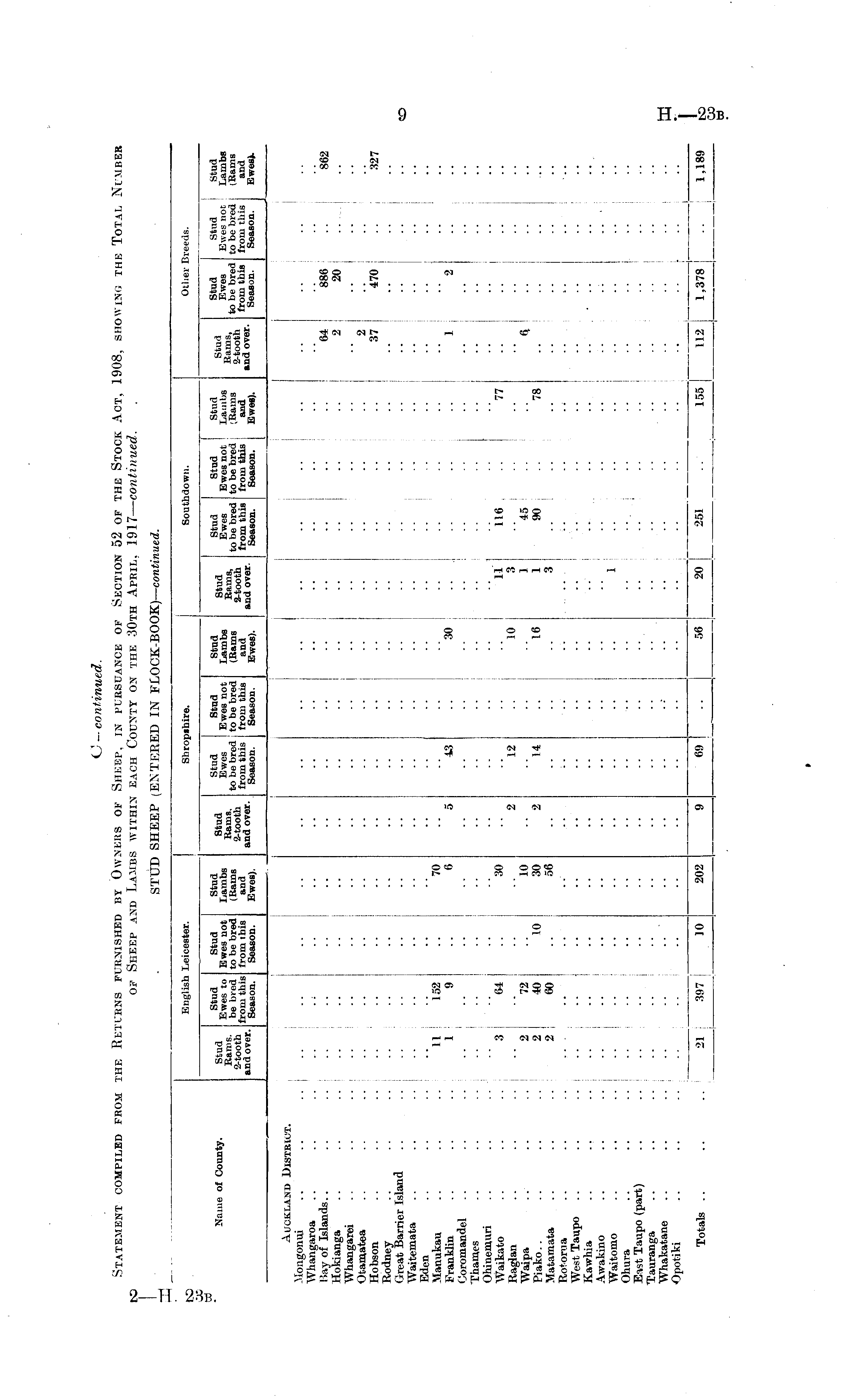 C — continued. Statement compiled from the Returns furnished by Owners of Sheep, in pursuance of Section 52 of the Stock Act, 1908, showing the Total Number of Sheep and Lambs within each County on the 30th April, 1917— continued. STUD SHEEP (ENTERED IN FLOCK-BOOK)— continued.
