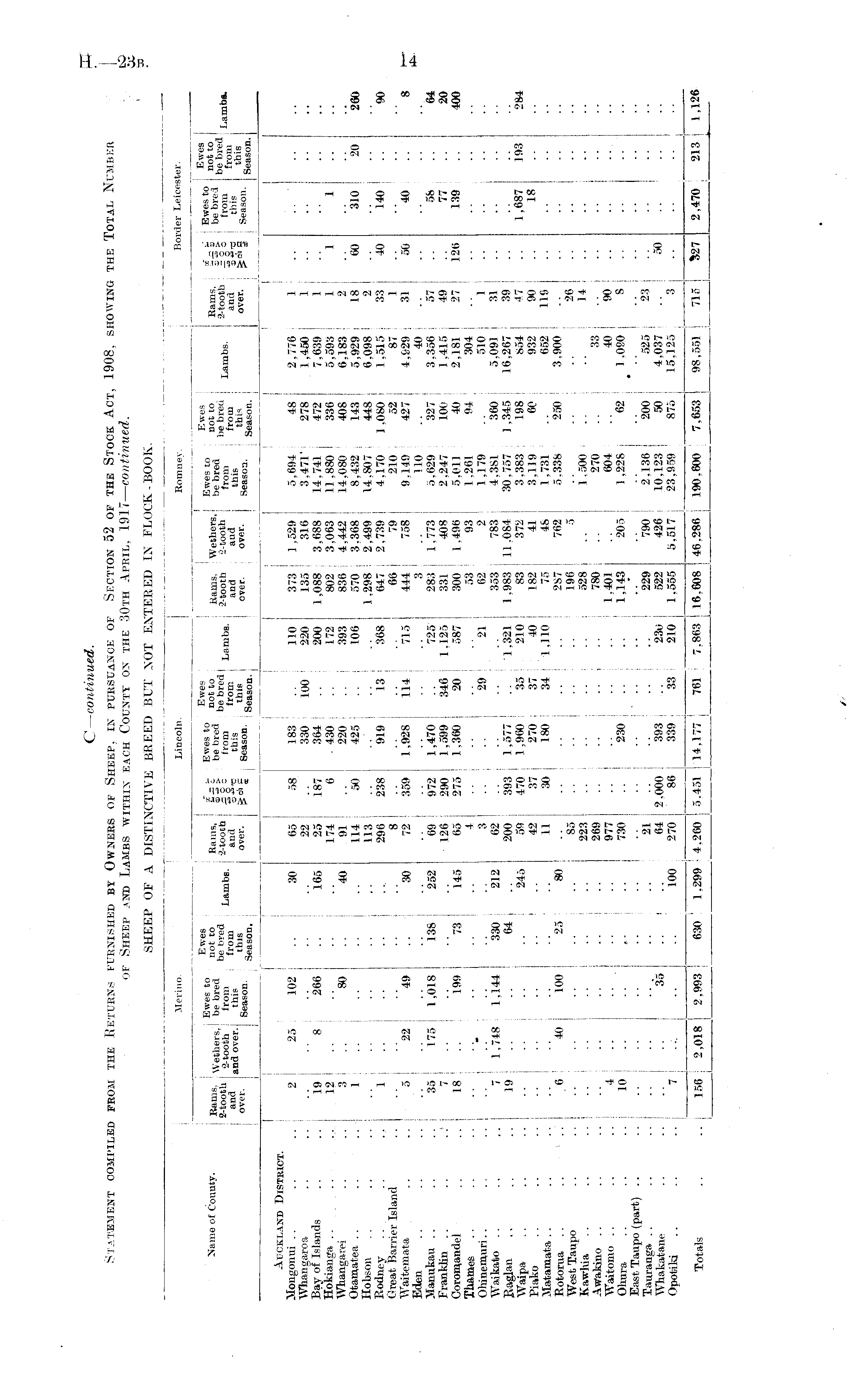 Merino. Lincoln Romnev. Border Leicester. Name of County. i i Ewes to E ™s ; Earns wethers.! be bred Ji 0 '.' 0 , 2-tooth 8 . tooih from be bred and an d over.! this f '° m | OVer ' I Season ' Season, j Lambs. r, I <£ ■- Ewes to „2J . & Kams, - -h-h he bred , not t0 Earns, •2-tooth; || 8 Tronf b-taedl Lamb8 2 . to oth and ! -S-St- tbfa from , anI j over, j »s«I . Season. 1 ' „, bwes to Wethers, be bred --tooth froni and tbis over. Season. Ewes not to be bred I T „„..,., from i Lambs - this Season, i i « „ u I Ewes to | Rams. --■=•-] he bred , n0 , t to ! 2-tooth: || S b ir „„r beared Lambg . and : t-S. t hi 0 fl °P' i I § I 86830 "' s£sL\ Auckland District. Mongonui Whangaroa Bay of Islands Hokianga Whangarei Otamatea Hobson Rodney .. Great Barrier Island Waitemata Eden Manukau Franklin Coromandel Thames . . Ohinemuri Waikato Baglan Waipa Piako Matamata Rotorua West Taupo Kawhia Awakino Waitomo Ohura East Taupo (part) .. Tauranga Whakatane Opotiki .. 1.. I 2 25 102 19 8 266 12 80 1 1 5 22 49 35 175 1,018 18 .. 199 7 1.748 1,144 19 6 40 100 4 10 .. .. .. . . 35 7 .. 138 | i3 30 165 40 30 252 145 65 58 22 25 187 174 6 91 114 .50 113 296 238 8 72 359 .. 69 972 126 290 65 275 4 3 62 200 393 59 470 42 37 11 30 85 223 269 977 730 L 183 330 - 100 364 430 220 '■ 425 919 13 1,928 114 1,470 1.599 1 346 1.360 ; 20 29 1,577 1 .960 35 270 ; 37 180 ! 34 230 393 339 33 110 373 1,529 220 135 316 200 1,088 3,688 172 802 3,063 393 836 4,442 106 570 , 3,368 1.298 2,499 368 647 2.739 66 i 79 I 715 444 i 758 | 3 .. 725- 283 1,773 i 1.125 331 408 587 300 1 ,496 53 93 21 62 2 353 783 1,321 1,983 1 11.084 : 210 83 372 ! 40 182 41 1.110 75 4S 2S7 762 I 196 5 528 j 780 1.401 1,143 205 j 229 790 I 230 '■ 522 426 210 i 1.555 5,517 5.694 3,471' 14,741 11.880 1 14,080 8.432 14.807 4.170 210 9.149 110 5,629 2,247 5,011 1.261 1.179 4,381 30.757 3.383 3,119 1.731 5.338 1 .500 270 604 1 .228 •• 2.136 I 10.123 23.959 I 48 2.776 278 1,450 472 7.639 336 5,593 408 6.183 143 5,929 : 448 I 6.098 1 .080 1 ,515 52 87 427 4.929 40 327 3.356 100 1.415 40 2.181 94 304 510 360 5.091 1 ,345 16,267 198 : 854 60 932 652 250 3,900 33 40 62 1 .090 200 ; 525 50 4,037 875 ; 15.125 1 1 1 1 2 18 2 33 31 57 49 27 39 I 47 i 90 119 26 14 90 S '23 j 3 1 60 40 50 126 i50 1 310 140 ! 40 58 77 139 '20 260 90 8 64 20 400 330 64 212 245 1 ,687 18 193 284 •• 25 80 '• .. •■ 21 64 2.000 270 86 100 I Totals 156 2,018 ': 2,993 | 630 1.299 4.260 ■ 5.451 14.177 761 7.863 16.608 46.286 . 190,600 7.653 ! 98,551 I 715 !,27 2,470 213 ! 1,121