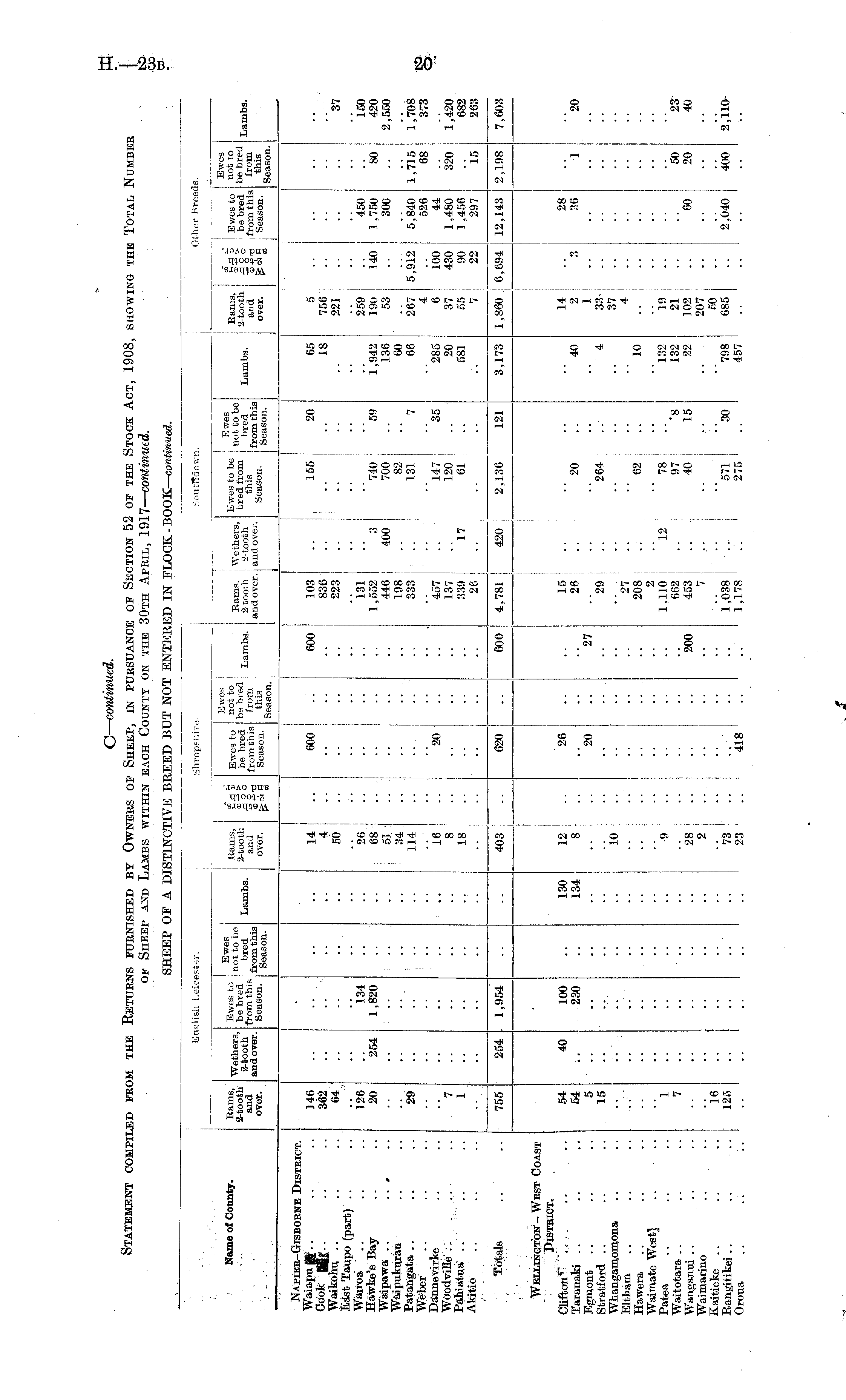 C. continued. Statement compiled from the Returns furnished by Owners of Sheep, in pursuance of Section 52 of the Stock Act, 1908, showing the Total Number of Sheep and Lambs within each County on the 30th April, 1917 — continued. SHEEP OF A DISTINCTIVE BREED BUT NOT ENTERED IN FLOCK- BOOK— continued.