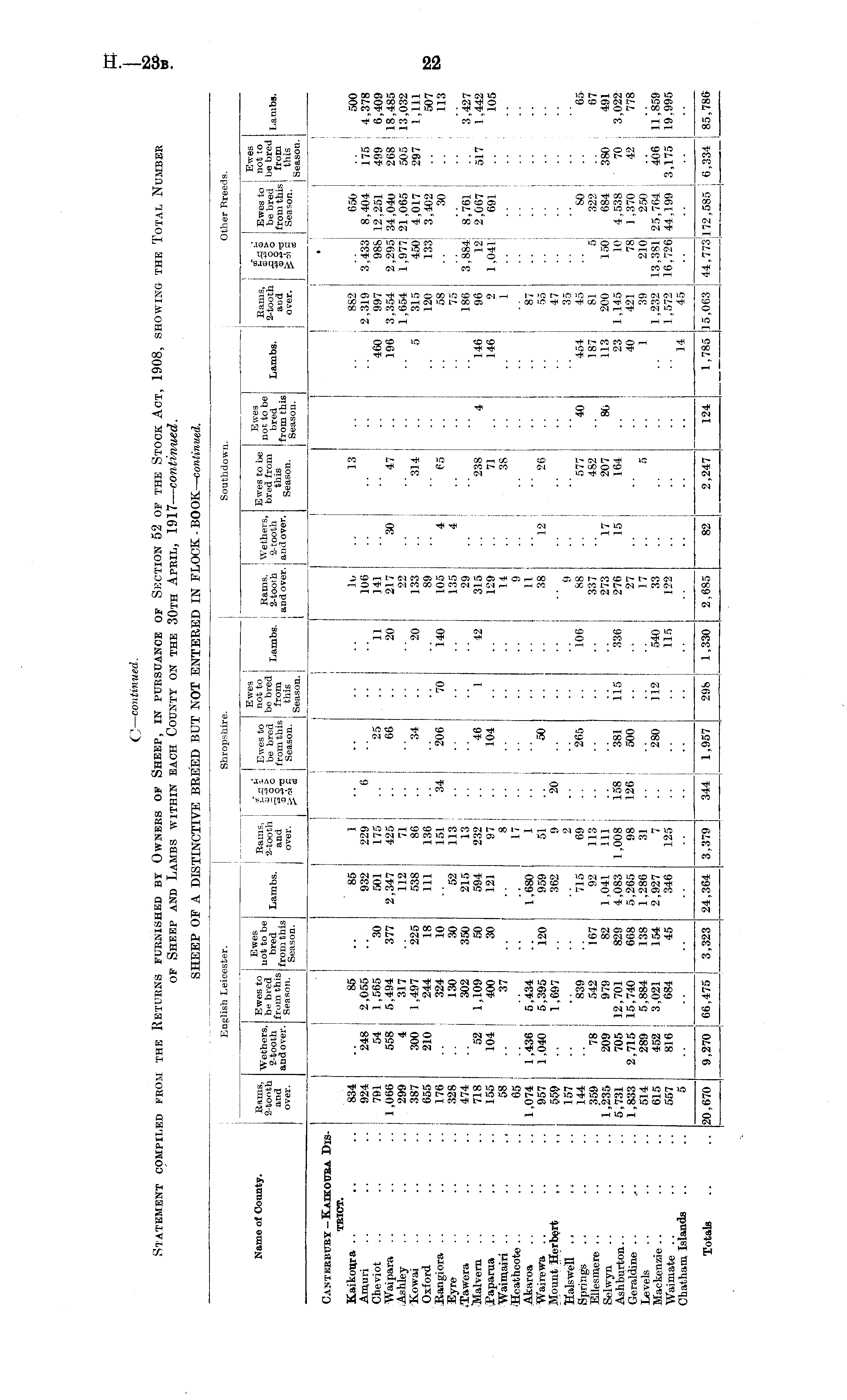 C— continued. Statement compiled from the Returns furnished by Owners of Sheep, in pursuance of Section 52 of the Stock Act, 1908, showing the Total Number of Sheep and Lambs within each County on the 30th April, 1917— continued. SHEEP OF A DISTINCTIVE BREED BUT NOT ENTERED IN FLOCK- BOOK— continued.