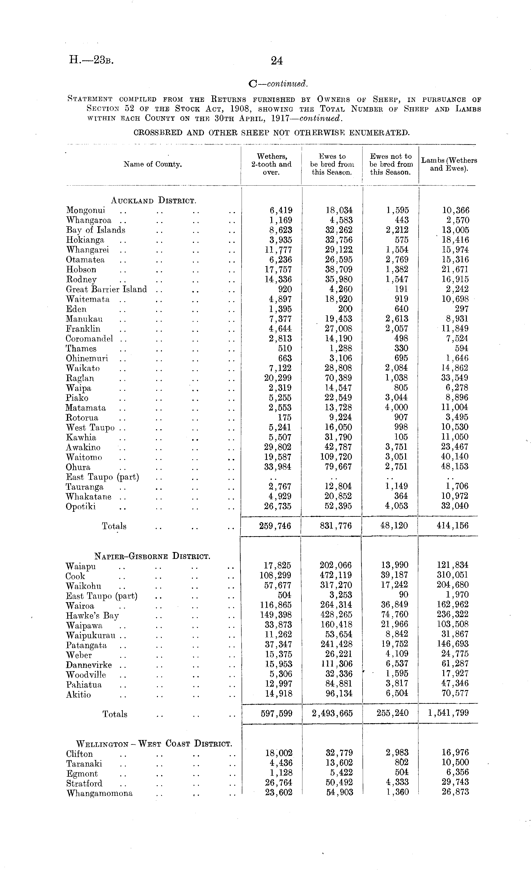 CROSSBRED AND OTHER SHEEP NOT 0' 'H KRWISE ENUMERATED. Wethers, Name of County. 2-tooth and over. Ewes to Ewes not to be bred from be bred from this Season. this Season. Lambs (Wethers and Ewes). Auckland Disteict. 18,034 1,595 4,583 443 32,262 2,212 32,756 575 29,122 1,554 26,595 2,769 38,709 1,382 35,980 1,547 4,260 191 18,920 919 200 640 19,453 2,613 27,008 2,057 14,190 498 I,288 330 3,106 695 28,808 2,084 70,389 1,038 1.4,547 805 22,549 3,044 13,728 4,000 9,224 907 16,050 998 31,790 105 42,787 3,751 109,720 3,051 79,667 2,751 10,366 2,570 13,005 18,416 15,974 15,316 21,671 16,915 2,242 10,698 297 8,931 11,849 7,524 594 1,646 14,862 33,549 6,278 8,896 11,004 3,495 10,530 11,050 23,467 40,140 48,153 Mongonui .. .. .. .. 6,419 6,419 1,169 8,623 3,935 11,777 6,236 17,757 14,336 920 4,897 1,395 7,377 4,644 2,813 510 663 7,122 20,299 2,319 5,255 2,553 175 5,241 5,507 29,802 19,587 33,984 18,034 4,583 32,262 32,756 29,122 26,595 38,709 35,980 4,260 18,920 200 19,453 27,008 14,190 1,288 3,106 28,808 70,389 14,547 22,549 13,728 9,224 16,050 31,790 42,787 109,720 79,667 Whangaroa .. .. .. .. 1,169 Bay of Islands .. .. .. 8,623 Hokianga .. .. .. .. 3,935 Whangarei .. .. .. .. 11,777 Otamatea .. .. .. .. 6,236 Hobson .. .. .. .. 17,757 Eodney .. .. .. .. 14,336 Great Barrier Island . . .. .. 920 Waitemata .. .. .. .. 4,897 Eden .. .. .. .. 1,395 Manukau . . .. .. .. 7,377 Franklin .. .. .. .. 4,644 Coromandel .. .. .. .. 2,813 Thames .. .. .. .. 510 Ohinemuri .. .. .. .. 663 Waikato .. .. .. .. 7,122 Raglan .. .. .. .. 20,299 Waipa .. .. .. .. 2,319 Piako .. .. .. .. 5,255 Matamata .. .. .. .. 2,553 Rotorua .. .. .. .. 175 West Taupo 5,241 Kawhia .. .. .. .. 5,507 Awakino .. .. .. .. 29,802 Waitomo .. .. .. .. 19,587 Ohura .. .. .. .. 33,984 East Taupo (part) Tauranga .. .. .. .. 2,767 Whakatane .. .. .. .. 4,929 Opotiki .. .. .. .. 26,735 2,767 4,929 26,735 12,804 1,149 20,852 364 52,395 4,053 12,804 20,852 52,395 1,706 10,972 32,040 Totals .. .. .. 259,746 259,746 831,776 48,120 414,156 Napier-Gisborne District. Waiapu 17,825 Cook .. .. .. .. 108,299 Waikohu 57,677 East Taupo (part) .. .. .. 504 Wairoa .. .. .. .. 116,865 Hawke's Bay 149,398 Waipawa .. .. .. .. 33,873 Waipukurau .. .. .. .. 11,262 Patangata .. .. .. .. 37,347 Weber .. .. .. .. 15,375 17,825 108,299 57,677 504 116,865 149,398 33,873 11,262 37,34-7 15,375 15,953 5,306 12,997 14,918 202,066 472,119 317,270 3,253 264,314 428,265 160,418 53,654 241,428 26,221 111,306 32,336 84,881 96,134 13,990 39,187 17,242 90 36,849 74.760 21,966 8,842 19,752 4,109 6,537 1,595 3,817 6,504 121,834 310,051 204,680 1,970 162,962 236,322 103,508 31,867 146,693 24,775 61,287 17,927 47,346 70,577 Dannevirke .. .. .. .. 15,953 Woodville .. .. .. .. 5,306 Pahiatua 12,997 Akitio .. 14,918 Totals .. .. .. 597,599 597,599 2,493,665 255,240 1,541,799 Wellington - West Coast District. Clifton 18,002 Taranaki .. .. .. .. 4,436 Egmont .. .. .. .. 1,128 Stratford .. .. .. .. 26,764 Whangamomona .. .. .. 23,602 18,002 4,436 1,128 26,764 23,602 32,779 13,602 5,422 50,492 54,903 2,983 802 504 4,333 1,360 16,976 10,500 6,356 29,743 26,873