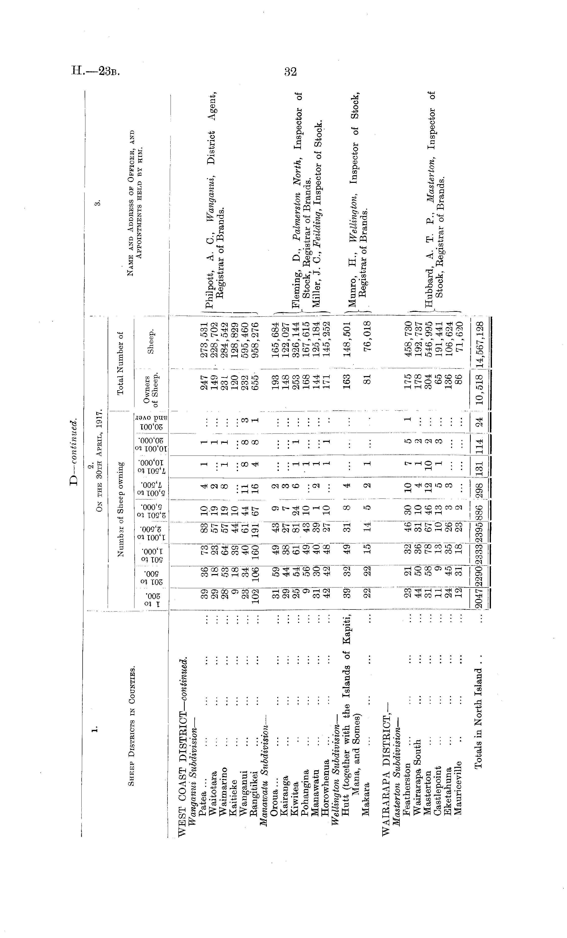 1. On the 30th April, 1917. 2. On the 30th April, 1917. I 3. Numbar of Sheep owning Total Nu amber of Numbar of Sheep owning Total Number of Sheep Districts in Counties. 11 UU1U-1 Wl Uur.cp il w ° 0 " : ~o ~g g 00 go og Owners rtcq o 10 o °. o„- lo,Z- o i 100 -0 o-a ot bneep. Sheep. Name and Address of Officer, and Appointments held by him. W r EST COAST DISTEICT— continued. Wanganui Subdivision — Patea ... ... ... ... ... 39 36 73 83 10 4 1 Waitotara ... ... ... ... 29 18 23 57 19 2 ... Waimarino ... ... ... ... 28 53 64 57 19 8 1 Kaitieke ... ... ... ... 9 18 39 44 10 Wanganui ... ... ... ... 23 34 40 61 44 11 8 Eangitikei ... ... ... ... 102 106 160 191j 67 16 4 Manawatu Subdivision — Oroua... ... ... ... ... 31 59 49 43 9 2 ... Kairanga ... ... ... ... 29 44 38 27 7 3 ... Kiwitea .. ... ... ... 25 54 61 81 24 6 1 Pohangina ... ... ... ... 9 56 49 43 10 ... 1 Manawatu ... ... ... ... 31 30 40 39 1 2 1 Horowhenua ... ... ... ... 42 42! 48; 27 10 ... 1 Wellington Subdivision — Hutt (together with the Islands of Kapiti, 39 32 49: 31 8 4 ... Mana, and Somes) Makara ... ... ... ... 22 22 15 14 5 2 1 WAIEAEAPA DISTEICT — Masterton Subdivision — Featherston ... ... ... ... 23 21 32 46 30 10 7 Wairarapa South ... ... ... 44 50 36 31 10 4 1 Masterton ... ... ... ... 31 58 78 67 46 12 10 Castlepoint ... ... ... ... 11 9 13 10 13 5 1 Eketahuna ... ... ... ... 24 45 35 26 3 3 ... Mauriceville .. ... ... ... 12 31 18 23! 2 Totals in North Island . . ... 20472290J23332395J886 298 131 1 *■ •■■ 247 273,531 „, .. . „ . 1 149 - 228 702 ; Ehilpott, A. O, Wanganui, District Agent, "{ j_ I 23 L 284'542 Eegistrar of Brands. j ".'.. 120 ! 8 8 3 232 595,460 4 8 1 655 958,276 jJ 193 165,684 \ 148 122,027 1 1 ••• 253 326,144 D., Palmerston North, Inspector of '1 168, 167,615 I Stock, Eegistrar of Brands. 1 144 125,184 Miller, J. O, Feilding, Inspector of Stock 1 1 ... 171 145,252 ) 163 148,501 ),. „ „. [Munro, H., Wellington, Inspector of Stock, 1 81 76 018 f R e n' strar of Brands. . 7 5 1 175 458,730 , 1 2 ... 178 192,737 10 2 ... 304 546,995 -Hubbard, A. T. P., Masterton, Inspector of 1 3 ... 65 191,441 I Stock, Eegistrar of Brands 136 106,624 j 86 71,620 I L31 114 24 10,518 ,14,567,128