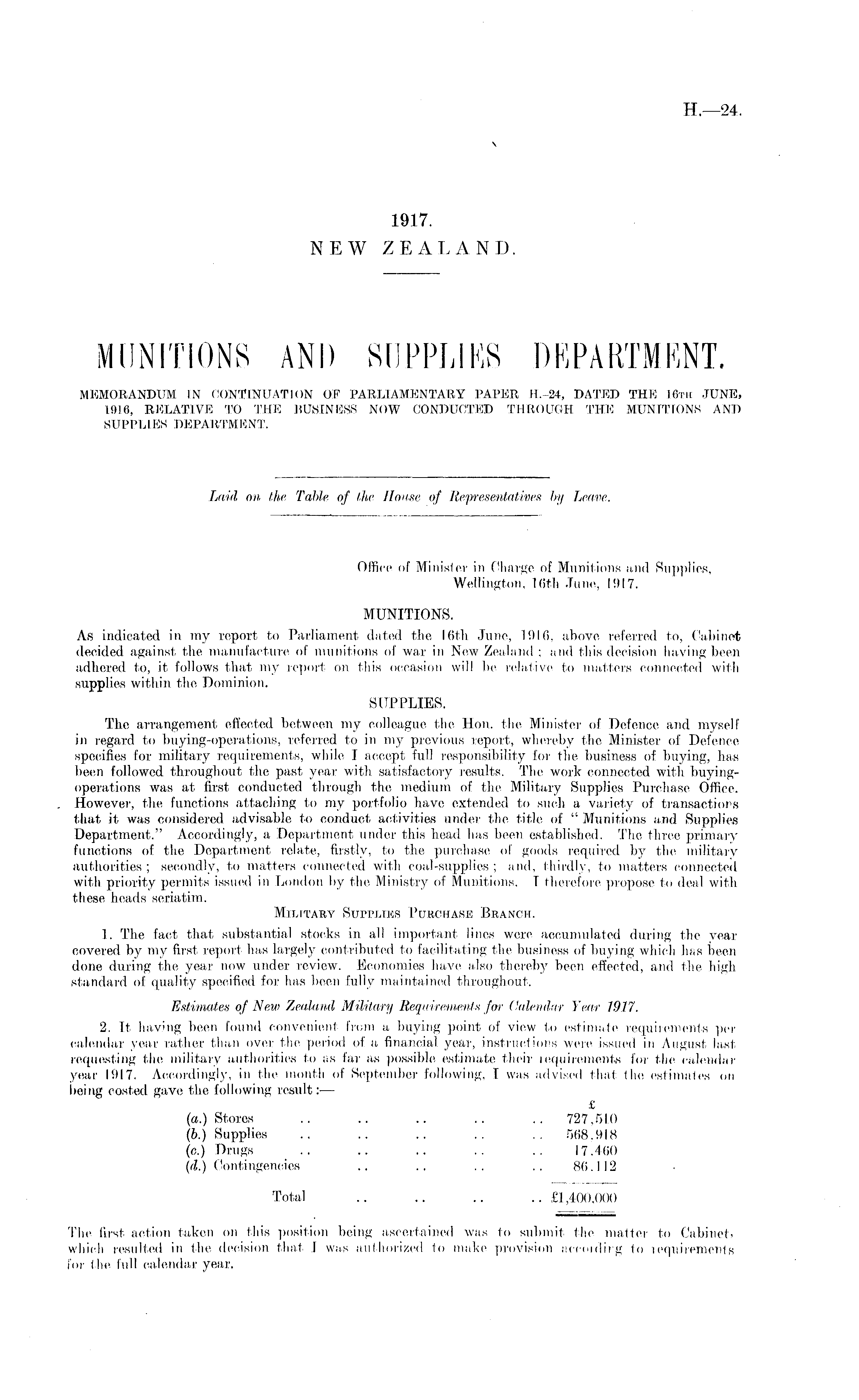 Office of Minister in Charge of Munitions and Supplies, Wellington. Kith June, 1917. MUNITIONS. As indicated in my report to Parliament dated the 16th June, 1916, above referred to, Cabinet decided against the manufacture of munitions of war in New Zealand ; and this decision having been adhered to, it follows that my report on this occasion will be relative to matters connected with supplies within the Dominion. SUPPLIES. The arrangement effected between my colleague the Hon. the Minister of Defence and myself in regard to buying-operations, referred to in my previous report, whereby the Minister of Defence specifies for military requirements, while I accept full responsibility for the business of buying, has been followed throughout the past year with satisfactory results. The work connected with buyingoperations was at first conducted through the medium of the Military Supplies Purchase Office. However, the functions attaching to my portfolio have extended to such a variety of transactions that it was considered advisable to conduct activities under the title of " Munitions and Supplies Department." Accordingly, a Department under this head has been established. The three primary functions of the Department relate, firstly, to the purchase of goods required by the military authorities; secondly, to matters connected with coal-supplies ; and, thirdly, to matters connected with priority permits issued in London by the Ministry of Munitions. I therefore propose to deal with these heads seriatim. Military Supplies Purchase Branch. 1. The fact that substantial stocks in all important lines were accumulated during the year covered by my first report has largely contributed to facilitating the business of buying which has been done during the year now under review. Economies have also thereby been effected, and the high standard of quality specified for has been fully maintained throughout. Estimates of New Zealand Military Requirements fay Calendar Year 1917. 2. It having been found convenient from a buying point of view to estimate requirements per calendar year rather than over the period of a financial year, instruct ions were issued in August last requesting the military authorities to as far as possible estimate their requirements for the calendar year 1917. Accordingly, in the month of September following. 1 was advised thai the estimates on being costed gave the following result:— £ (a.) Stores .. .. .. .. .. 727.510 (6.) Supplies .. .. .. .. .. 568.918 (c.) Drugs . . .. .. .. .. 17.400 (d.) Contingencies .. .. .. .. 86.112 Total .. .. .. .. £1,400,000 The first action taken on this position being ascertained was to submit the matter to Cabinet, which resulted in the decision that 1 was authorized to make provision accordirg to requirements for t lie full calendar year.