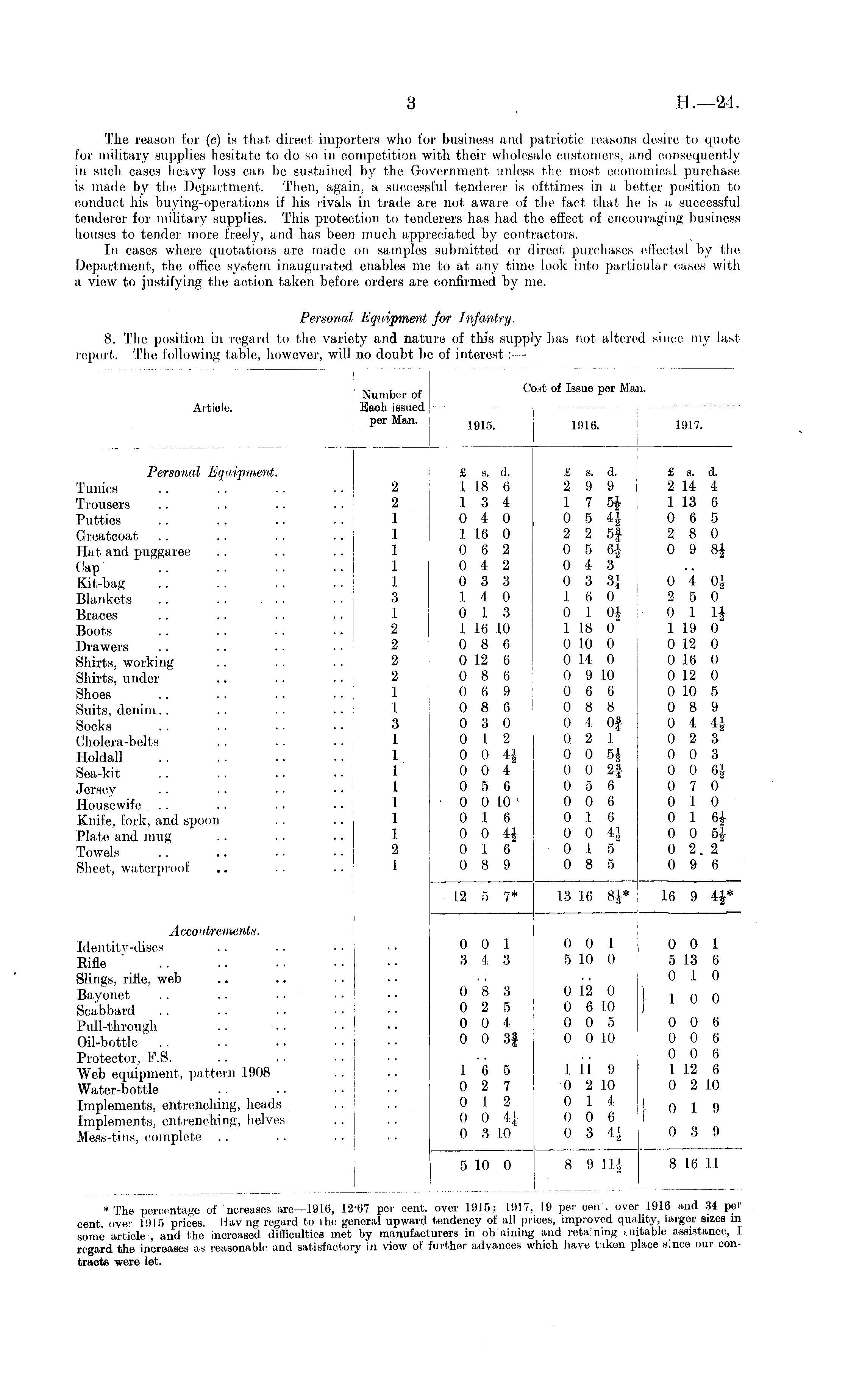 Number of Article. Eaoh issued , per Man. 1915 Ci >st of Issue per M. t. 1915. 1916. 1917. \ Personal Equipment. £ s. d. Tunics .. .'. .. .. 2 1 18 6 Trousers .. .. .. .. 2 13 4 Putties .. .. .. ... 1 0 4 0 Greatcoat . . . . . . . . 1 1 16 0 Hat, and puggaree . . . . . . 1 0 6 2 Cap 1 0 4 2 Kit-bag '.. .. .. .. 1 0 3 3 Blankets .. .. 3 14 0 Braces 1 0 13 Boots 2 116 .1.0 Drawers 2 0 8 6 Shirts, working .. .. .. 2 0 12 6 Shirts, under .. .. .. 2 0 8 6 Shoes .. .. .. •• 1 0 6 9 Suits, denim. . .. . . . . 1 0 8 6 Socks 3 030 Cholera-belts .. .. .. I 0 I. 2 Holdall .. .. .. .. 1 0 0 41 Sea-kit 1 0 0 4 Jersey .. .. .. .. 1 0 5 6 Housewife . . . . .. .. I ' 0 0 10 Knife, fork, and spoon . . . . i 0 16 Plate and mug .. .. .. 1 0 0 41 Towels .." 2 0 L 6 Sheet, waterproof .. .. .. I 0 8 9 £ s. d. 1 18 6 1 3 4 0 4 0 1 16 0 0 6 2 0 4 2 0 3 3 1 4 0 0 I 3 1 .1.6 .1.0 0 8 6 0 1.2 6 0 8 6 0 6 9 0 8 6 0 3 0 0 I. 2 0 0 41 0 0 4 0 5 6 0 0 10 0 1 6 0 0 41 0 1 6 0 8 9 £ s. d. 2 9 9 1 7 5$ 0 5 4| 2 2 5f 0 5 61 0 4 3" 0 3 3* 1 (i 0 0 I. 0.] 1 18 0 0 10 0 0 14 0 0 9 1.0 0 6 6 0 8 8 0 4 Of 0 2 I. 0 0 5i 0 0 2f 0 5 6 0 0 6 0 1. 6 0 0 4.1 0 1 5 0 8 5 £ s. d. 2 14 4 1 13 6 0 6 5 2 8 0 0 9 8,i 0 4 0.', 2 5 0" 0 1 1-| 1 19 0" 0 12 0 0 16 0 0 12 0 0 10 5 0 8 9 0 4 4-1 0 2 3 0 0 3 0 0 6i 0 7 ()" 0 I. 0 0 1 61 0 0 5| 0 2.2 0 9 6 1.2 5 7* 1.2 5 7* 13 16 8^* 16 9 4|* Accoutrements. Identity-discs .. .. • • • • 0 0 1 Rifle " 3 43 Slings, rifle, web Bayonet, . . .. .. • • • • 0 8 3 Scabbard .. .. .. ■• •• 0 2 5 Pull-through .. ■.. •• •• 0 0 4 Oil-bottle .. .. 0 0 3| Protector, F.S. Web equipment, pattern 1908 . . .. 16 5 Water-bottle .. .. .. •• 027 Implements, entrenching, heads ,. .. 0 12 Implements, entrenching, helves .. .. 0 0 4 J Mess-tins, complete .. . . .. • • 0 3 10 0 0 1 3 4 3 0 0 1 5 10 0 o o i 5 13 6 0 1 0 0 8 3 0 2 5 0 0 4 0 0 S| 0 12 0 0 6 10 0 0 5 0 0 1(1 ! I. 0 0 1 6 5 0 2 7 0 1 2 0 0 I] 0 3 10 III 9 0 2 10 0 1 4 0 0 6 0 3 4.1 0 0 6 0 0 6 0 0 6 1 12 6 0 2 10 I I 0 1 9 0 3 9 1 5 10 0 I 8 9 Hi 8 16 11 i *The percentage of ncreases are—1916, 12-67 per cent, over 1.915; 1917, cent, over 1915 prices. Hav ng regard to the general upward tendency of all pri some article-, and the increased difficulties mot by manufacturers in ob aining regard the increases as reasonable and satisfactory in view of further advances w traots were let. 19 per cell . over ices, improved qua. ; and retaining uii 'hich have taken p] r 1916 and 34 per ,lity, larger sizes in itable assistance, I ilace since our con-