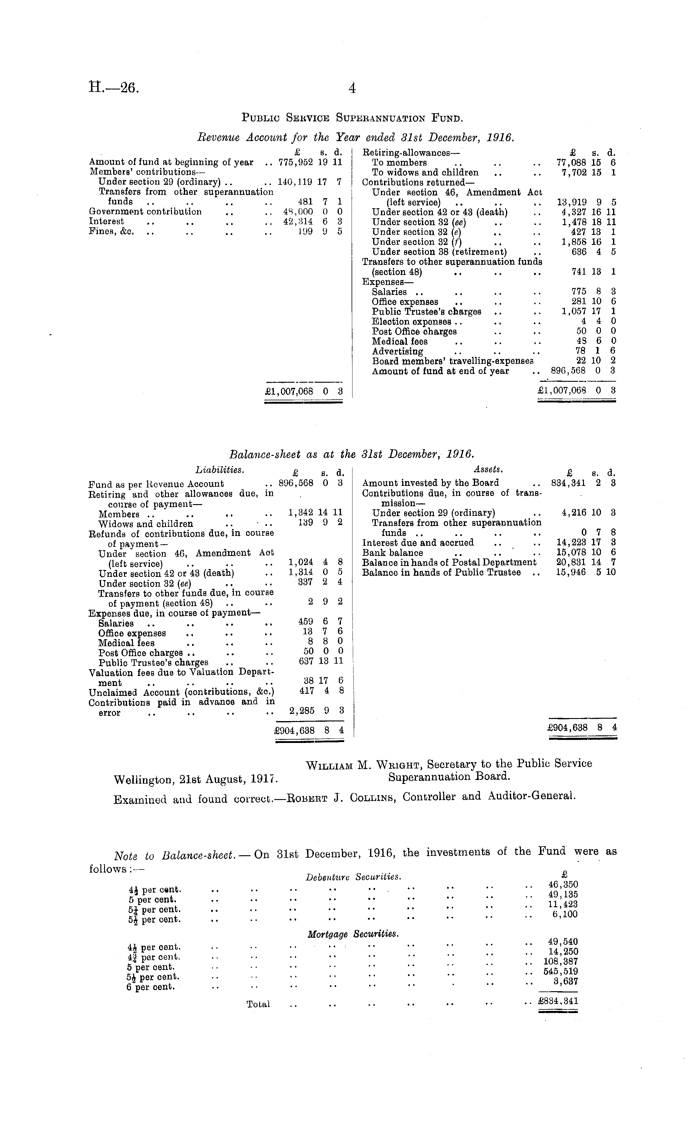 Public Sekvice Supekannuation Fund. Revenue Account for the Year ended 31st December, 1916. £ s. d. j Retiring-allowances— £ s. d. Amount of fund at beginning of year .. 775,952 19 11 | To members .. .. .. 77,088 15 6 Members'contributions— To widows and children .. .. 7,702 15 1 Under section 29 (ordinary) .. .. 140,119 17 7 | Contributions returned— Transfers from other superannuation Under section 46, Amendment Act funds .. .. .. .. 481 7 1 (left sorvioe) .. .. .. 13,919 9 5 Government contribution .. .. 48,000 0 0 Under seotion 42 or 43 (death) .. 4,327 16 11 Interest .. .. .. .. 42,314 6 3 Under seotion 32 (cc) .. .. 1,478 18 11 Fines, &c. .. .. .. .. 199 9 5 Under seotion 32 (c) .. .. 427 13 1 Under seotion 32 (/) .. .. 1,858 16 1 Under section 38 (retirement) .. 636 4 5 Transfers to other superannuation funds (seotion 48) .. .. .. 741 13 1 Expenses— Salaries .. .. .. .. 775 8 3 Office expenses .. .. .. 281 10 6 Publio Trustee's charges .. .. 1,057 17 1 Election expenses .. .. .. 4 4 0 Post Office oharges .. .. 50 0 0 Medical fees .. .. .. 48 6 0 Advertising .. .. .. 78 1 6 Board members' travelling-expenses 22 10 2 Amount of fund at end of year .. 896,568 0 3 £1,007,068 0 3 £1,007,068 0 3 Balance-sheet as at the 31st December, 1916. Liabilities. £ s d. Assets. £ s> Fund as per Rovenue Aocount .. 896,568 0 3 Amount invested by the Board .. 834,341 2 3 Retiring and other allowanoes due, in Contributions due, in course of transcourse of payment— mission— Members .. " .. .. ■• 1,342 14 11 Under section 29 (ordinary) .. 4,216 10 3 Widows and children .. • .. 139 9 2 Transfers from other superannuation Refunds of contributions due, in course funds .. .. .. .. 0 7 8 of payment— Interest due and accrued .. .. 14,223 17 3 Under seotion 46, Amendment Aot Bank balanoo .. .. .. 15,078 10 6 (left servioe) .. .. ■• 1,024 4 8 Balance in hands of Postal Department 20,831 14 7 Under seotion 42 or 43 (death) .. 1,314 0 5 Balance in hands of Publio Trustee .. 15,946 510 Under seotion 32 (cc) .. .. 337 2 4 Transfers to other fundß due, in course of payment (seotion 48) .. 2 9 2 Expenses due, in course of paymentSalaries .. .. .. .. 459 6 7 Offioe expenses .. .. • • 13 7 6 Medioal fees .. .. ■ • 8 8 0 Post Offioe charges .. .. .. 50 0 0 Publio Trustee's charges .. .. 637 13 11 Valuation fees due to Valuation Department 38 17 6 Unclaimed Account (contributions, &o.) 417 4 8 Contributions paid in advance and in error 2,285 9 3 £904,638 8 4 £904,638 8 4 William M. Weight, Secretary to the Public Service Wellington, 21st August, 1917. Superannuation Board. Examined and found correct.—Bobeet J. Collins, Controller and Auditor-General. Note to Balance-sheet. —On 31st December, 1916, the investments of the Fund were as follows :— „ Debenture Securities. *> ~_.„. ...... 46,350 *4P eroB ? b 49,135 5 per cent. .. •• •• •• •• •• 11 423 5J per cent ■• •■ ■• ;; ' 5$ per cent. .. ■ • • • • • • • • • '• ' Mortgage Securities. 49 540 4| per cent, •■ •• u > 4_P°r° e1 ' 1 ■' " 108,387 sP eroont ; 545,519 5* par cent .. .. 3 637 6 per oent. Total £834,341