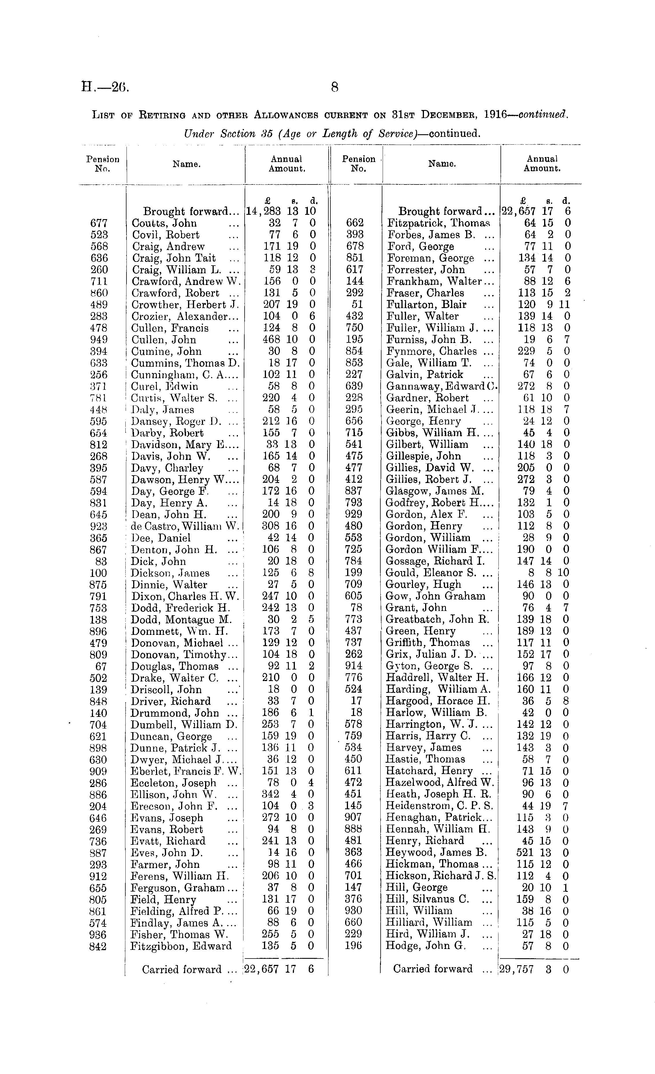 Pension No. Name. Annual Amount. Pension J No. Namo. Annual Amount. 677 523 568 636 260 711 860 489 283 478 949 394 633 256 371 781 448 595 654 812 268 395 587 594 831 645 923 365 867 83 100 875 791 753 138 896 479 809 67 502 139 848 140 704 621 898 630 909 286 886 204 646 269 736 887 293 912 655 805 861 574 936 842 Brought forward... Coutts, John Covil, Robert Craig, Andrew Craig, John Tait Craig, William L. ... Crawford, Andrew W. Crawford, Robert ... Crowther, Herbert J. Crozier, Alexander... Cullen, Francis Cullen, John Cumine, John Cummins, Thomas D. Cunningham, C. A.... Curel, Edwin Curtis, Walter S. ... Daly, James Dansey, Roger D. ... Darby, Robert Davidson, Mary E.... Davis, John W. Davy, Charley Dawson, Henry W.... Day, George F. Day, Henry A. Dean, John H. de Castro, William W. Dee, Daniel Denton, John H. ... Dick, John Dickson, James Dinnie, Walter Dixon, Charles H. W. Dodd, Frederick H. Dodd, Montague M. Dommett, Wm. H. Donovan, Michael ... Donovan, Timothy... Douglas, Thomas ... Drake, Walter C. ... Driscoll, John Driver, Richard Drummond, John ... Dumbell, William D. Duncan, George Dunne, Patrick J. ... Dwyer, Michael J.... Eberlet, Francis F. W. Eccleton, Joseph ... Ellison, John W. ... Erecson, John F. ... Evans, Joseph Evans, Robert Evatt, Richard Eves, John D. Farmer, John Ferens, William H. Ferguson, Graham... Field, Henry Fielding, Alfred P. ... Findlay, James A. ... Fisher, Thomas W. Fitzgibbon, Edward £ s. d. 14,283 13 10 32 7 0 77 6 0 171 19 0 118 12 0 59 13 3 156 0 0 131 5 0 207 19 0 104 0 6 124 8 0 468 10 0 30 8 0 18 17 0 102 11 0 58 8 0 220 4 0 58 5 0 212 16 0 155 7 0 33 13 0 165 14 0 68 7 0 204 2 0 172 16 0 14 18 0 200 9 0 308 16 0 42 14 0 106 8 0 20 18 0 125 6 8 27 5 0 247 10 0 242 13 0 30 2 5 173 7 0 129 12 0 104 18 0 92 11 2 210 0 0 18 0 0 33 7 0 186 6 1 253 7 0 159 19 0 136 11. 0 36 12 0 151 13 0 78 0 4 342 4 0 104 0 3 272 10 0 94 8 0 241 13 0 14 16 0 98 11 0 206 10 0 37 8 0 131 17 0 66 19 0 88 6 0 255 5 0 135 5 0 662 393 678 851 617 144 292 51 432 750 195 854 853 227 639 228 295 656 715 541 475 477 412 837 793 929 480 553 725 784 199 709 605 78 773 437 737 262 914 776 524 17 18 578 759 ' 534 450 611 472 451 145 907 888 481 363 466 701 147 376 930 660 229 196 Brought forward... Fitzpatrick, Thomas Forbes, James B. ... Ford, George Foreman, George ... Forrester, John Frankham, Walter... Fraser, Charles Fullarton, Blair Fuller, Walter Fuller, William J. ... Furniss, John B. Fynmore, Charles ... Gale, William T. .. Galvin, Patrick Gannaway, Edward C Gardner, Robert Geerin, Michael J. ... George, Henry Gibbs, William H. ... Gilbert, William ... Gillespie, John Gillies, David W. ... Gillies, Robert J. ... Glasgow, James M. Godfrey, Robert H.... Gordon, Alex F. Gordon, Henry Gordon, William ... Gordon William F.... Gossagc, Richard I. Gould, Eleanor S. ... Gourley, Hugh Gow, John Graham Grant, John Greatbatch, John R. Green, Henry Griffith, Thomas ... Grix, Julian J. D. ... Gvton, George S. ... Haddrell, Walter H. ! Harding, William A. Hargood, Horace H. Harlow, William B. Harrington, W. J. ... Harris, Harry C. Harvey, James Hastie, Thomas Hatchard, Henry ... Hazelwood, Alfred W. Heath, Joseph H. R. Heidenstrom, C. P. S. , Henaghan, Patrick... Hennah, William H. Henry, Richard ... Heywood, James B. Hickman, Thomas ... Hickson, Richard J, S. Hill, George Hill, Silvanus C. Hill, William Halliard, William ... Hird, William J. ... Hodge, John G. ... £ a. d. 22,657 17 6 64 15 0 64 2 0 77 11 0 134 14 0 57 7 0 88 12 6 113 15 2 120 9 11 139 14 0 118 13 0 19 6 7 229 5 0 74 0 0 67 6 0 272 8 0 61 10 0 1.18 18 7 24 12 0 45 4 0 140 18 0 118 3 0 205 0 0 272 3 0 79 4 0 132 1 0 103 5 0 112 8 0 28 9 0 190 0 0 147 14 0 8 8 10 146 13 0 90 0 0 76 4 7 139 18 0 189 12 0 117 11 0 152 17 0 97 8 0 166 12 0 160 11 0 36 5 8 42 0 0 142 12 0 132 19 0 143 3 0 58 7 0 71 15 0 96 13 0 90 6 0 44 19 7 115 3 0 .143 9 0 45 15 0 521 13 0 115 12 0 112 4 0 20 10 1 159 8 0 38 16 0 115 5 0 27 18 0 57 8 0 Carried forward ... 22,657 17 6 Carried forward ... ;29,757 3 0