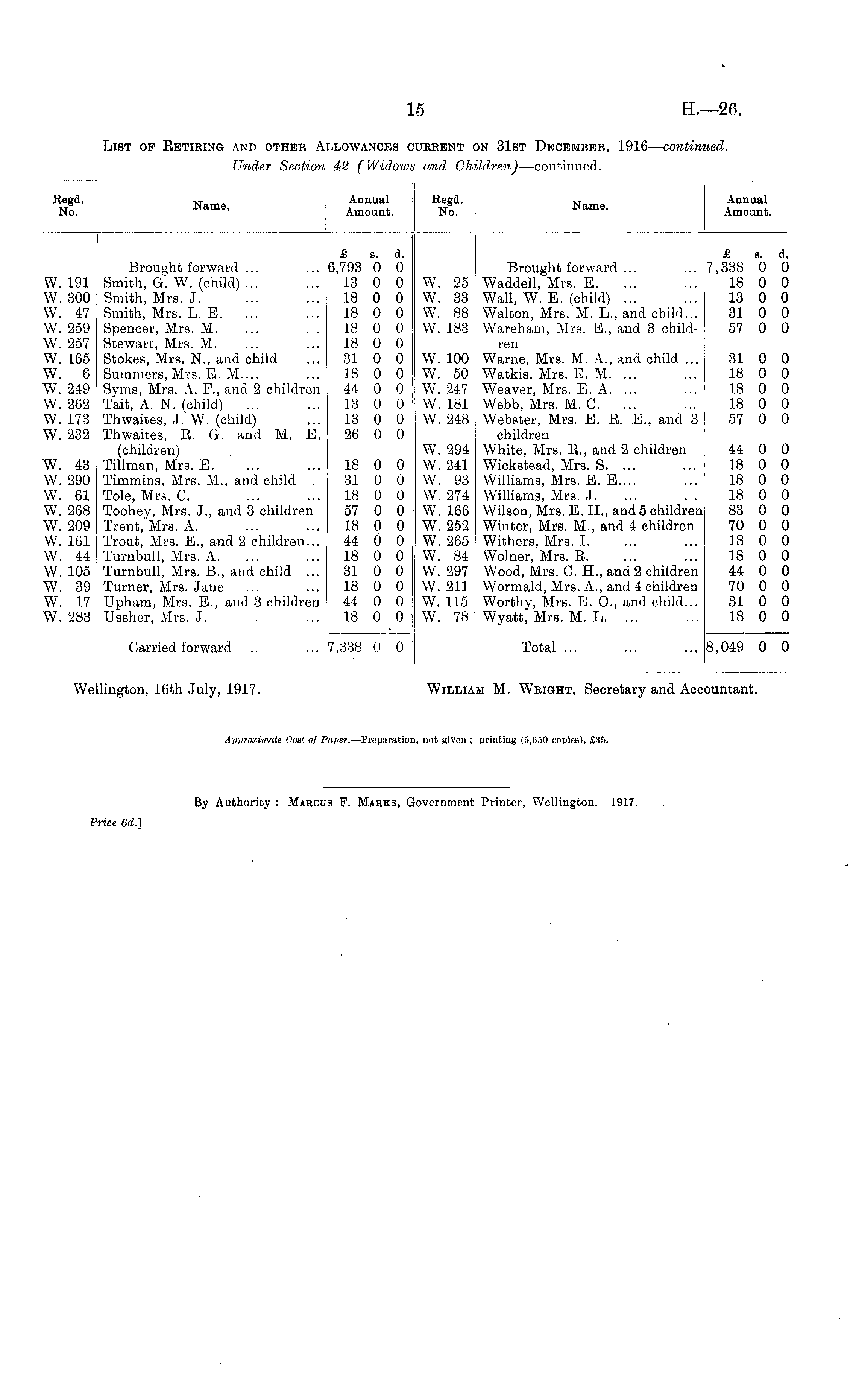 Regd. No. Name, Annual Amount. Regd. No. Name. Annual Amount. W. 191 W. 300 W. 47 W. 259 W. 257 W. 165 W. 6 W. 249 W. 262 W. 173 W. 232 Brought forward ... Smith, G. W. (child) ... Smith, Mrs. J. Smith, Mrs. L. E. ... Spencer, Mrs. M. Stewart, Mrs. M. Stokes, Mrs. N., and child Summers, Mrs. E. M.... Syrns, Mrs. A. F., and 2 children Tait, A. N. (child) ... Thwaites, J. W. (child) Thwaites, R. G. and M. E. (children) Tillman, Mrs. E. Timmins, Mrs. M., and child Tole, Mrs. C. Toohey, Mrs. J., and 3 children Trent, Mrs. A. Trout, Mrs. E., and 2 children... Turnbull, Mrs. A. Turnbull, Mrs. B., and child ... Turner, Mrs. Jane Dpham, Mrs. E., and 3 children Ussher, Mrs. J. £ s. d. 6,793 0 0 13 0 0 18 0 0 18 0 0 18 0 0 18 0 0 31 0 0 18 0 0 44 0 0 13 0 0 13 0 0 26 0 0 W. 25 W. 33 VV. 88 W. 183 W. IOO W. 50 W. 247 W. 181 W. 248 Brought forward ... Waddell, Mrs. E. Wall, W. E. (child) ... Walton, Mrs. M. L., and child... Wareham, Mrs. E., and 3 children Warne, Mrs. M. A., and child ... Watkis, Mrs. E. M. ... Weaver, Mrs. E. A. ... Webb, Mrs. M. C. ... Webster, Mrs. E. R. E., and 3 children White, Mrs. R., and 2 children Wiekstead, Mrs. S. ... Williams, Mrs. E. E.... Williams, Mrs. J. Wilson, Mrs. E. H., and 5 children Winter, Mrs. M., and 4 children Withers, Mrs. I. Wolner, Mrs. R, Wood, Mrs. 0. H., and 2 children Wormald, Mrs. A., and 4 children Worthy, Mrs. E. 0., and child... Wyatt, Mrs. M. L. ... £ a. 7,338 0 18 0 13 0 31 0 57 0 31 0 18 0 18 0 18 0 57 0 d. 0 0 0 0 0 0 0 0 0 0 W. 43 W. 290 W. 61 W. 268 W. 209 W. 161 W. 44 W. 105 W. 39 W. 17 W. 283 18 0 0 31 0 0 18 0 0 57 0 0 18 0 0 44 0 0 18 0 0 31 0 0 18 0 0 44 0 0 18 0 0 W. 294 W. 241 W. 93 W. 274 W. 166 W. 252 W. 265 W. 84 W. 297 W. 211 W. 115 W. 78 44 0 18 0 18 0 18 0 83 0 70 0 18 0 18 0 44 0 70 0 31 0 18 0 0 0 0 0 0 0 0 0 0 0 0 0 Carried forward ... 7,338 0 0 Total ... 8,049 0 0 We: ilin lington, 16th July, 1917. WlLLIA ,m M. Weight, Secretary and Acc< ountant.