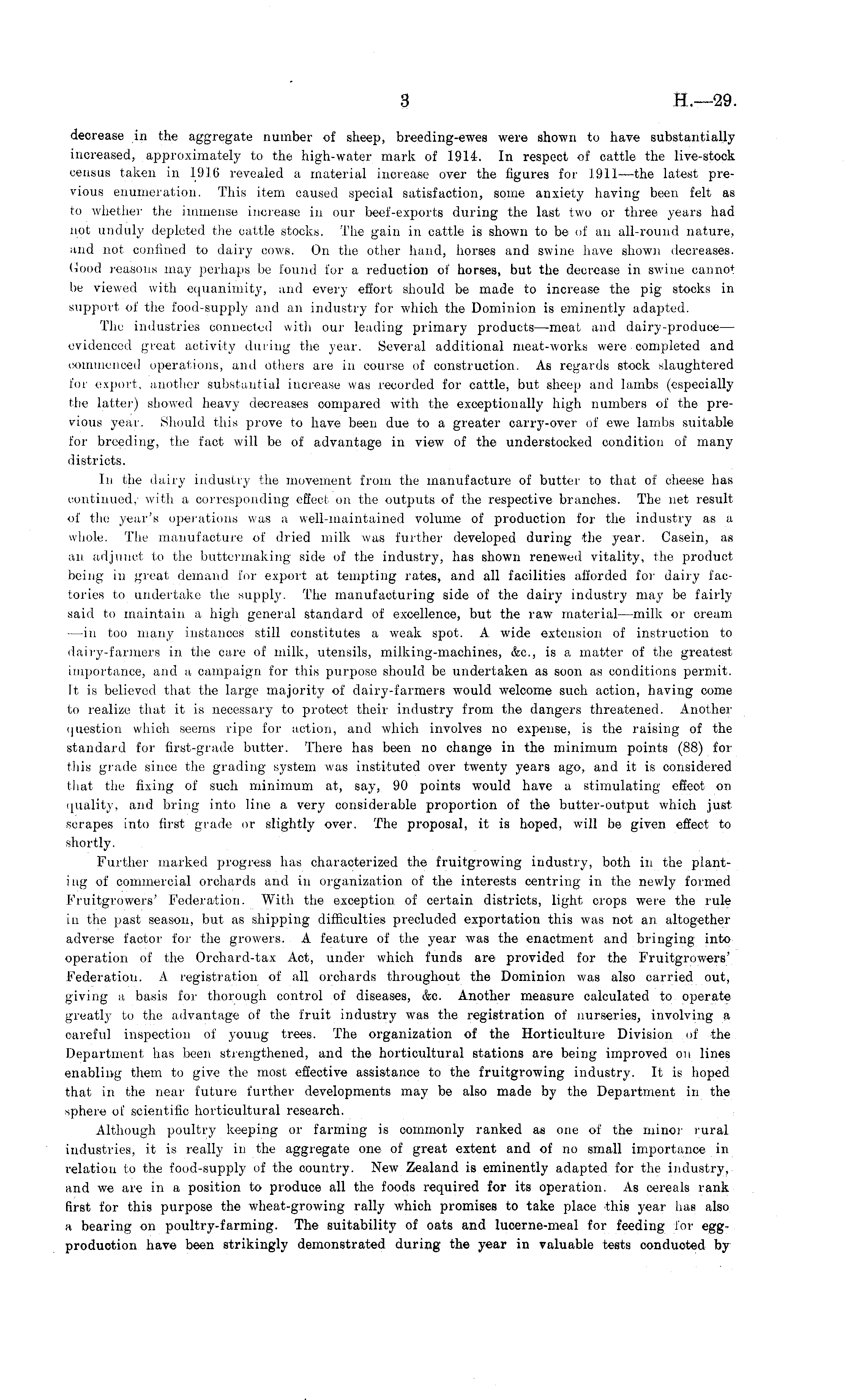 decrease in the aggregate number of sheep, breeding-ewes were shown to have substantially increased, approximately to the high-water mark of 1914. In respect of cattle the live-stock census taken in 1916 revealed a material increase over the figures for 1911—the latest previous enumeration. This item caused special satisfaction, some anxiety having been felt as to whether the immense increase in our beef-exports during the last two or three years had not unduly depleted the cattle stocks. The gain in cattle is shown to be of an all-round nature, and not confined to dairy cows. On the other hand, horses and swine have shown decreases. Good reasons may perhaps be found for a reduction of horses, but the decrease in swine cannot be viewed with equanimity, and every effort should be made to increase the pig stocks in support of the food-supply and an industry for which the Dominion is eminently adapted. The industries connected with our leading primary products —meat and dairy-produce — evidenced great activity during the year. Several additional meat-works were completed and commenced operations, and others are in course of construction. As regards stock slaughtered for export, another substantial increase was recorded for cattle, but sheep and lambs (especially the latter) showed heavy decreases compared with the exceptionally high numbers of the previous year. Should this prove to have been due to a greater carry-over of ewe lambs suitable for breeding, the fact will be of advantage in view of the understocked condition of many districts. In the dairy industry the movement from the manufacture of butter to that of cheese has continued,- with a corresponding effect on the outputs of the respective branches. The net result of the year's operations was a well-maintained volume of production for the industry as a whole. The manufacture of dried milk was further developed during the 3'ear. Casein, as an adjunct to the buttermaking side of the industry, has shown renewed vitality, the product being in great demand for export at tempting rates, and all facilities afforded for dairy factories to undertake the supply. The manufacturing side of the dairy industry may be fairlysaid to maintain a high general standard of e.xcellence, but the raw material —milk or cream —in too many instances still constitutes a weak spot. A wide extension of instruction to dairy-farmers in the care of milk, utensils, milking-machines, &c, is a matter of the greatest importance, and a campaign for this purpose should be undertaken as soon as conditions permit. It is believed that the large majority of dairy-farmers would welcome such action, having come to realize that it is necessary to protect their industry from the dangers threatened. Another question which seems ripe for action, and which involves no expense, is the raising of the standard for first-grade butter. There has been no change in the minimum points (88) for this grade since the grading system was instituted over twenty years ago, and it is considered that the fixing of such minimum at, say, 90 points would have a stimulating effect on quality, and bring into line a very considerable proportion of the butter-output which just scrapes into first grade or slightly over. The proposal, it is hoped, will be given effect to shortly. Further marked progress has characterized the fruitgrowing industry, both in the planting of commercial orchards and in organization of the interests centring in the newly formed Fruitgrowers' Federation. With the exception of certain districts, light crops were the rule in the past season, but as shipping difficulties precluded exportation this was not an altogether adverse factor for the growers. A feature of the year was the enactment and bringing into operation of the Orchard-tax Act, under which funds are provided for the Fruitgrowers' Federation. A registration of all orchards throughout the Dominion was also carried out, giving a basis for thorough control of diseases, &c. Another measure calculated to operate greatly to the advantage of the fruit industry was the registration of nurseries, involving a careful inspection of young trees. The organization of the Horticulture Division of the Department has been strengthened, and the horticultural stations are being improved 011 lines enabling them to give the most effective assistance to the fruitgrowing industry. It is hoped that in the near future further developments may be also made by the Department in the sphere of scientific horticultural research. Although poultry keeping or farming is commonly ranked as one of the minor rural industries, it is really in the aggregate one of great extent and of no small importance in relation to the food-supply of the country. New Zealand is eminently adapted for the industry, and we are in a position to produce all the foods required for its operation. As cereals rank first for this purpose the wheat-growing rally which promises to take place this year has also a bearing on poultry-farming. The suitability of oats and lucerne-meal for feeding for eggproduction have been strikingly demonstrated during the year in valuable tests conducted by