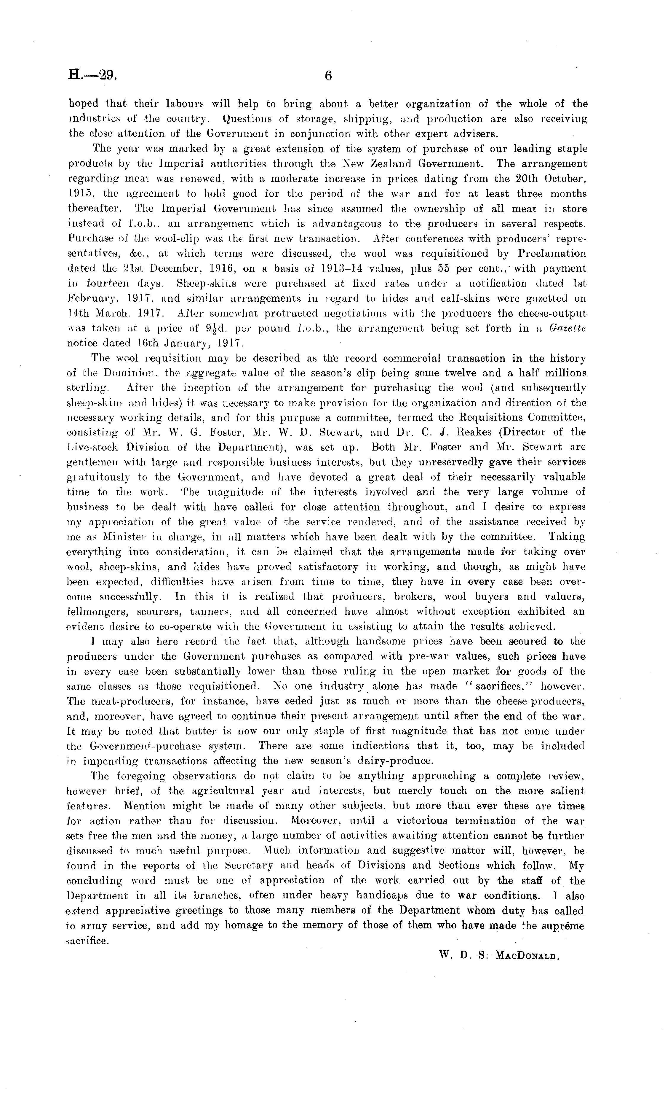hoped that their labours will help to bring about a better organization of the whole of the industries of the country. Questions of storage, shipping, and production are also receiving the close attention of the Government in conjunction with other expert advisers. The year was marked by a great extension of the system of purchase of our leading staple products by the Imperial authorities through the New Zealand Government. The arrangement regarding meat was renewed, with a moderate increase in prices dating from the 20th October, 1915, the agreement to hold good for the period of the war and for at least three months thereafter. The Imperial Government has since assumed the ownership of all meat in store instead of f.0.b., an arrangement which is advantageous to the producers in several respects. Purchase of the wool-clip was the first new transaction. After conferences with producers' representatives, &c, at which terms were discussed, the wool was requisitioned by Proclamation dated the 21st December, 1916, on a basis of 1913-14 values, plus 55 per cent.,'with payment in fourteen days. Sheep-skins were purchased at fixed rates under a notification dated Ist February, 1917, and similar arrangements in regard to hides and calf-skins were gazetted on 14th March. 1917. After somewhat protracted negotiations with the producers the cheese-output was taken at a price of per pound f.0.b., the arrangement being set forth in a Gazette. notice dated I.6th January, 1917. The wool requisition may be described as the record commercial transaction in the history of the Dominion, the aggregate value of the season's clip being some twelve and a half millions sterling. After the inception of the arrangement for purchasing the wool (and subsequently sheep-skins and hides) it was necessary to make provision for the organization and direction of the necessary working details, and for this purpose a committee, termed the Requisitions Committee, consisting of Mr. W. G. Foster, Mr. W. D. Stewart, and Dr. C. J. Reakes (Director of the Live-stock Division of the Department), was set up. Botli Mr. Foster and Mr. Stewart are gentlemen with large and responsible business interests, but they unreservedly gave their services gratuitously to the Government, and have devoted a great deal of their necessarily valuable time to the work. The magnitude of the interests involved and the very large volume of business to be dealt with have called for close attention throughout, and I desire to express my appreciation of the great value of the service rendered, and of the assistance received by me as Minister in charge, in all matters which have been dealt with by the committee. Taking everything into consideration, it can be claimed that the arrangements made for taking over wool, sheep-skins, and hides have proved satisfactory in working, and though, as might have been expected, difficulties have arisen from time to time, they have in every case been overcome successfully. In this it is realized that producers, brokers, wool buyers and valuers, fellmongers, scourers, tanners, and all concerned have almost without exception exhibited an evident desire to co-operate with the Government in assisting to attain the results achieved. 1 may also here record the fact that, although handsome prices have been secured to the producers under the Government purchases as compared with pre-war values, such prices have in every case been substantially lower than those ruling in the open market for goods of the same classes as those requisitioned. No one industry alone has made " sacrifices," however. The meat-producers, for instance, have ceded just as much or more than the cheese-producers, and, moreover, have agreed to continue their present arrangement until after the end of the war. It may be noted that butter is now our only staple of first magnitude that has not come under the Government-purchase system. There are some indications that it, too, may be included in impending transactions affecting the new season's dairy-produce. The foregoing observations do not claim to be anything approaching a complete review, however brief, of the agricultural year and interests, but merely touch on the more salient features. Mention might be made of many other subjects, but more than ever these are times for action rather than for discussion. Moreover, until a victorious termination of the war sets free the men and the money, a large number of activities awaiting attention cannot be further discussed to much useful purpose. Much information and suggestive matter will, however, be found in the reports of the Secretary and heads of Divisions and Sections which follow. My concluding word must be one of appreciation of the work carried out by the staff of the Department in all its branches, often under heavy handicaps due to war conditions. I also extend appreciative greetings to those many members of the Department whom duty has called to army service, and add my homage to the memory of those of them who have made the supreme sacrifice. W. D. S. MacDonald.