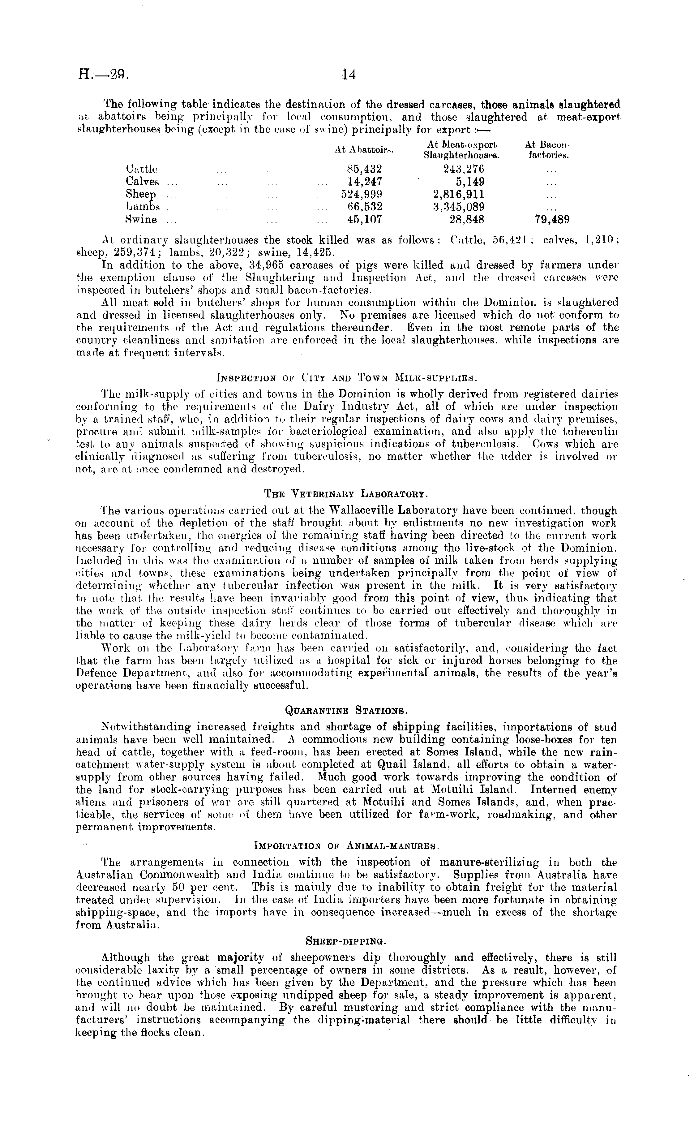 The following table indicates the destination of the dressed carcases, those animals slaughtered at abattoirs being principally for local consumption, and those slaughtered at meat-export slaughterhouses being (except in the case of swine) principally for export :• — i, i, ... At Meat-export At Bacon At Ahattoirs. „, , . r , . Slaughterhouses. lactones. Cattle ... ... ... ... 85,432 243,276 Calves ... ... ... ... 14,247 5,149 Sheep ... ... ... ... 524,999 2,816,911 Lambs ... ... ... ... 66,532 3,345,089 Swine ... ... ... 45,107 28,848 79,489 At ordinary slaughterhouses the stock killed was as follows: Cattle. 56,421; calves, 1,210; sheep, 259,374;' lambs, 20,322; swine, 14,425. In addition to the above, 34,965 carcases of pigs were killed and dressed by farmers under the exemption clause of the Slaughtering and Inspection Act, and the dressed carcases were inspected in butchers' shops and small bacon-factories. All meat sold in butchers' shops for human consumption within the Dominion is slaughtered and dressed in licensed slaughterhouses only. No premises are licensed which do not conform to the requirements of the Act and regulations thereunder. Even in the most remote parts of the country cleanliness and sanitation are enforced in the local slaughterhouses, while inspections are made at frequent intervals. Inspection of City and Town Milk-supplies. The milk-supply of cities and towns in the Dominion is wholly derived from registered dairies conforming to the requirements of the Dairy Industry Act, all of which are under inspection by a trained staff, who, in addition to their regular inspections of dairy cows and dairy premises, procure and submit milk-samples for bacteriological examination, and also apply the tuberculin test to any animals suspected of showing suspicious indications of tuberculosis. Cows which are clinically diagnosed as suffering from tuberculosis, no matter whether the udder is involved or not, are at once condemned and destroyed. The Veterinary Laboratory. The various operations carried out at the Wallaceville Laboratory have been continued, though on account of the depletion of the staff brought about by enlistments no new investigation work has been undertaken, the energies of the remaining staff having been directed to the current work necessary for controlling and reducing disease conditions among the live-stock of the Dominion. Included in this was the examination of a number of samples of milk taken from herds supplying cities and towns, these examinations being undertaken principally from the point of view of determining whether any tubercular infection was present in the milk. It is very satisfactory to note that the results have been invariably good from this point of view, thus indicating that the work of the outside inspection staff continues to be carried out effectively and thoroughly in the matter of keeping these dairy herds clear of those forms of tubercular disease which are liable to cause the milk-yield to become contaminated. Work on the Laboratory farm has been carried on satisfactorily, and, considering the fact that the farm has been largely utilized as a hospital for sick or injured horses belonging to the Defence Department, and also for accommodating experimental animals, the results of the year's operations have been financially successful. Quarantine Stations. Notwithstanding increased freights and shortage of shipping facilities, importations of stud animals have been well maintained. A commodious new building containing loose-boxes for ten head of cattle, together with a feed-room, has been erected at Somes Island, while the new raincatchment water-supply system is about completed at Quail Island, all efforts to obtain a watersupply from other sources having failed. Much good work towards improving the condition of the land for stock-carrying purposes has been carried out at Motuihi Island. Interned enemy aliens and prisoners of war are still quartered at Motuihi and Somes Islands, and, when practicable, the services of some of them have been utilized for farm-work, roadmaking, and other permanent improvements. Importation of Animal-manures. The arrangements in connection with the inspection of manure-sterilizing in both the Australian Commonwealth and India continue to be satisfactory. Supplies from Australia have decreased nearly 50 per cent. This is mainly due to inability to obtain freight for the material treated under supervision. In the case of India importers have been more fortunate in obtaining shipping-space, and the imports have in consequence increased—much in excess of the shortage from Australia. Sheep-dippino. Although the great majority of sheepowners dip thoroughly and effectively, there is still considerable laxity by a small percentage of owners in some districts. As a result, however, of the continued advice which has been given by the Department, and the pressure which has been brought to bear upon those exposing undipped sheep for sale, a steady improvement is apparent, and will no doubt be maintained. By careful mustering and strict compliance with the manufacturers' instructions accompanying the dipping-material there should be little difficulty in keeping the flocks clean.
