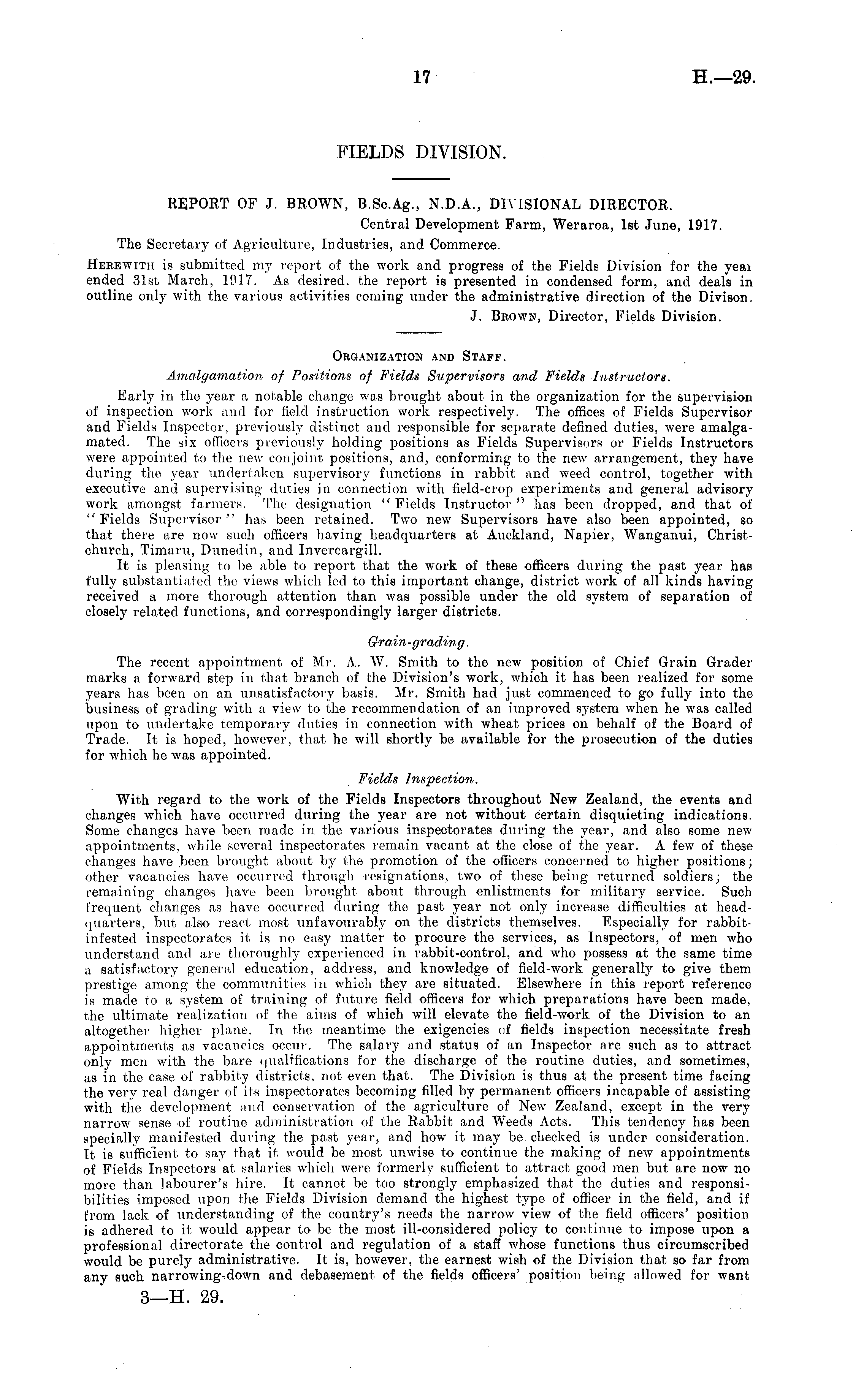 FIELDS DIVISION. REPOET OF J. BROWN, B.Sc.Ag., N.D.A., DIVISIONAL DIRECTOR, Central Development Farm, Weraroa, Ist June, 1917. The Secretary of Agriculture, Industries, and Commerce. Herewith is submitted my report of the work and progress of the Fields Division for the yeai ended 31st March, 1917. As desired, the report is presented in condensed form, and deals in outline only with the various activities coming under the administrative direction of the Divison. J. Brown, Director, Fields Division. Organization .and Staff. Amalgamation of Positions of Fields Supervisors and Fields Instructors. Early in the year a notable change was brought about in the organization for the supervision of inspection work and for field instruction work respectively. The offices of Fields Supervisor and Fields Inspector, previously distinct and responsible for separate defined duties, were amalgamated. The six officers previously holding positions as Fields Supervisors or Fields Instructors were appointed to the new conjoint positions, and, conforming to the new arrangement, they have during the year undertaken supervisory functions in rabbit and weed control, together with executive and supervising duties in connection with field-crop experiments and general advisory work amongst farmers. The designation " Fields Instructor " has been dropped, and that of " Fields Supervisor " has been retained. Two new Supervisors have also been appointed, so that there are now sucli officers having headquarters at Auckland, Napier, Wanganui, Christchurch, Timaru, Dunedin, and InvercargiU. It is pleasing to be .able to report that the work of these officers during the past year has fully substantiated the views which led to this important change, district work of all kinds having received a more thorough attention than was possible under the old system of separation of closely related functions, and correspondingly larger districts. Grain-grading. The recent appointment of Mr. A, W. Smith to the new position of Chief Grain Grader marks a forward step in that branch of the Division's work, which it has been realized for some years has been on an unsatisfactory basis. Mr. Smith had just commenced to go fully into the business of grading with a view to the recommendation of an improved system when he was called upon to undertake temporary duties in connection with wheat prices on behalf of the Board of Trade. It is hoped, however, that he will shortly be available for the prosecution of the duties for which he was appointed. Fields Inspection. With regard to the work of the Fields Inspectors throughout New Zealand, the events and changes which have occurred during the year are not without certain disquieting indications. Some changes have been made in the various inspectorates during the year, and also some new appointments, while several inspectorates remain vacant at the close of the year. A few of these changes have been brought about by the promotion of the officers concerned to higher positions; other vacancies have occurred through resignations, two of these being returned soldiers; the remaining changes have been brought about through enlistments for military service. Such frequent changes as have occurred during the past year not only increase difficulties at headquarters, but also react most unfavourably on the districts themselves. Especially for rabbitinfested inspectorates it is no easy matter to procure the services, as Inspectors, of men who understand and are thoroughly experienced in rabbit-control, and who possess at the same time a satisfactory general education, address, and knowledge of field-work generally to give them prestige among the communities in which they are situated. Elsewhere in this report reference is made to a system of training of future field officers for which preparations have been made, the ultimate realization of the aims of which will elevate the field-work of the Division to an altogether higher plane. In the meantimo the exigencies of fields inspection necessitate fresh appointments as vacancies occur. The salary and status of an Inspector are such as to attract only men with the bare qualifications for the discharge of the routine duties, and sometimes, as in the case of rabbity districts, not even that. The Division is thus at the present time facing the very real danger of its inspectorates becoming filled by permanent officers incapable of assisting with the development and conservation of the agriculture of New Zealand, except in the very narrow sense of routine administration of tho Rabbit and Weeds Acts. This tendency has been specially manifested during the past year, and how it may be checked is under consideration. It is sufficient to say that it would be most unwise to continue the making of new appointments of Fields Inspectors at salaries which were formerly sufficient to .attract good men but are now no more than labourer's hire. It cannot be too strongly emphasized that the duties and responsibilities imposed upon the Fields Division demand the highest type of officer in the field, and if from lack of understanding of the country's needs the narrow view of the field officers' position is adhered to it would appear to be the most ill-considered policy to continue to impose upon a professional directorate the control and regulation of a staff whose functions thus circumscribed would be purely administrative. It is, however, the earnest wish of the Division that so far from any such narrowing-down and debasement of the fields officers' position being allowed for want