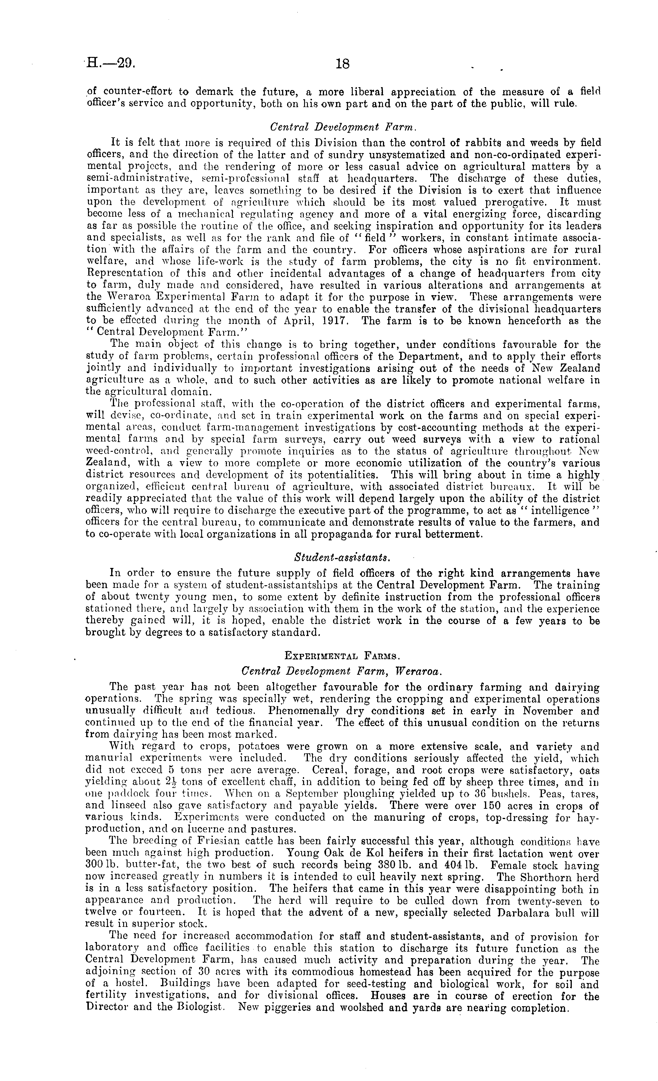 of counter-effort to demark the future, a more liberal appreciation of the measure of a field officer's service and opportunity, both on his own part and on the part of the public, will rule. Central Development Farm. It is felt that more is required of this Division than the control of rabbits and weeds by field officers, and tho direction of the latter and of sundry unsystematized and non-co-ordinated experimental projects, and the rendering of more or less casual advice on agricultural matters by a semi-administrative, semi-professional staff at headquarters. The discharge of these duties, important as they are, leaves something to be desired if the Division is to exert that influence upon the development of agriculture which should be its most valued prerogative. It must become less of a mechanical regulating agency and more of a vital energizing force, discarding as far as possible the routine of the office, and seeking inspiration and opportunity for its leaders and specialists, as well as for the rank and file of "field " workers, in constant intimate association with the affairs of the farm and the country. For officers whose aspirations are for rural welfare, and whose life-work is the study of farm problems, the city is no fit environment. Representation of this and other incidental advantages of a change of headquarters from city to farm, duly made and considered, have resulted in various alterations and arrangements at the Weraroa Experimental Farm to adapt it for the purpose in view. These arrangements were sufficiently advanced at the end of the year to enable the transfer of the divisional headquarters to be effected during the month of April, 1917. The farm is to be known henceforth as the " Central Development Farm." The main object of this change is to bring together, under conditions favourable for the study of farm problems, certain professional officers of the Department, and to apply their efforts jointly and individually to important investigations arising out of the needs of New Zealand agriculture as a whole, and to such other activities as are likely to promote national welfare in the agricultural domain. The professional staff, with the co-operation of the district officers and experimental farms, will devise, co-ordinate, and set in train experimental work on the farms and on special experimental areas, conduct farm-management investigations by cost-accounting methods at the experimental farms and by special farm surveys, carry out weed surveys with a view to rational weed-control, and generally promote inquiries as to the status of agriculture throughout NewZealand, with a view to more complete or more economic utilization of the country's various district resources and development of its potentialities. This will bring about in time a highly organized, efficient central bureau of agriculture, with associated district bureaux. It will be readily appreciated that the value of this work will depend largely upon tho ability of the district officers, who will require to discharge the executive part of the programme, to act as " intelligence " officers for the central bureau, to communicate and demonstrate results of value to the farmers, and to co-operate with local organizations in all propaganda for rural betterment. Student-assistants. In order to ensure the future supply of field officers of the right kind arrangements have been made for a system of student-assistantships at the Central Development Farm. The training of about twenty young men, to some extent by definite instruction from the professional officers stationed there, and largely by association with them in the work of the station, and the experience thereby gained will, it is hoped, enable the district work in the course of a few years to be brought by degrees to a satisfactory standard. Experimental Farms. Central Development Farm, Weraroa. The past year has not been altogether favourable for the ordinary farming and dairying operations. The spring was specially wet, rendering the cropping and experimental operations unusually difficult and tedious. Phenomenally dry conditions set in early in November and continued up to the end of the financial year. The effect of this unusual condition on the returns from dairying has been most marked. With regard to crops, potatoes were grown on a more extensive scale, and variety and manurial experiments were included. The dry conditions seriously affected the yield, which did not exceed 5 tons per acre average. Cereal, forage, and root crops were satisfactory, oats yielding about 2| tons of excellent chaff, in addition to being fed off by sheep three times, and in one paddock four times. AVhen on a September ploughing yielded up to 36 bushels. Peas, tares, and linseed also gave satisfactory and payable yields. There were over 150 acres in crops of various kinds. Experiments were conducted on the manuring of crops, top-dressing for hayproduction, and on lucerne and pastures. The breeding of Friesian cattle has been fairly successful this year, although conditions have been much against high production. Young Oak de Kol heifers in their first lactation went over 300 lb. butter-fat, the two best of such records being 380 lb. and 404 lb. Female stock having now increased greatly in. numbers it is intended to cull heavily next spring. The Shorthorn herd is in a less satisfactory position. The heifers that came in this year were disappointing both in appearance and production. The herd will require to be culled down from twenty-seven to twelve or fourteen. It is hoped that the advent of a new, specially selected Darbalara bull will result in superior stock. The need for increased accommodation for staff and student-assistants, and of provision for laboratory and office facilities to enable this station to discharge its future function as the Central Development Farm, has caused much activity and preparation during the year. The adjoining section of 30 acres with i