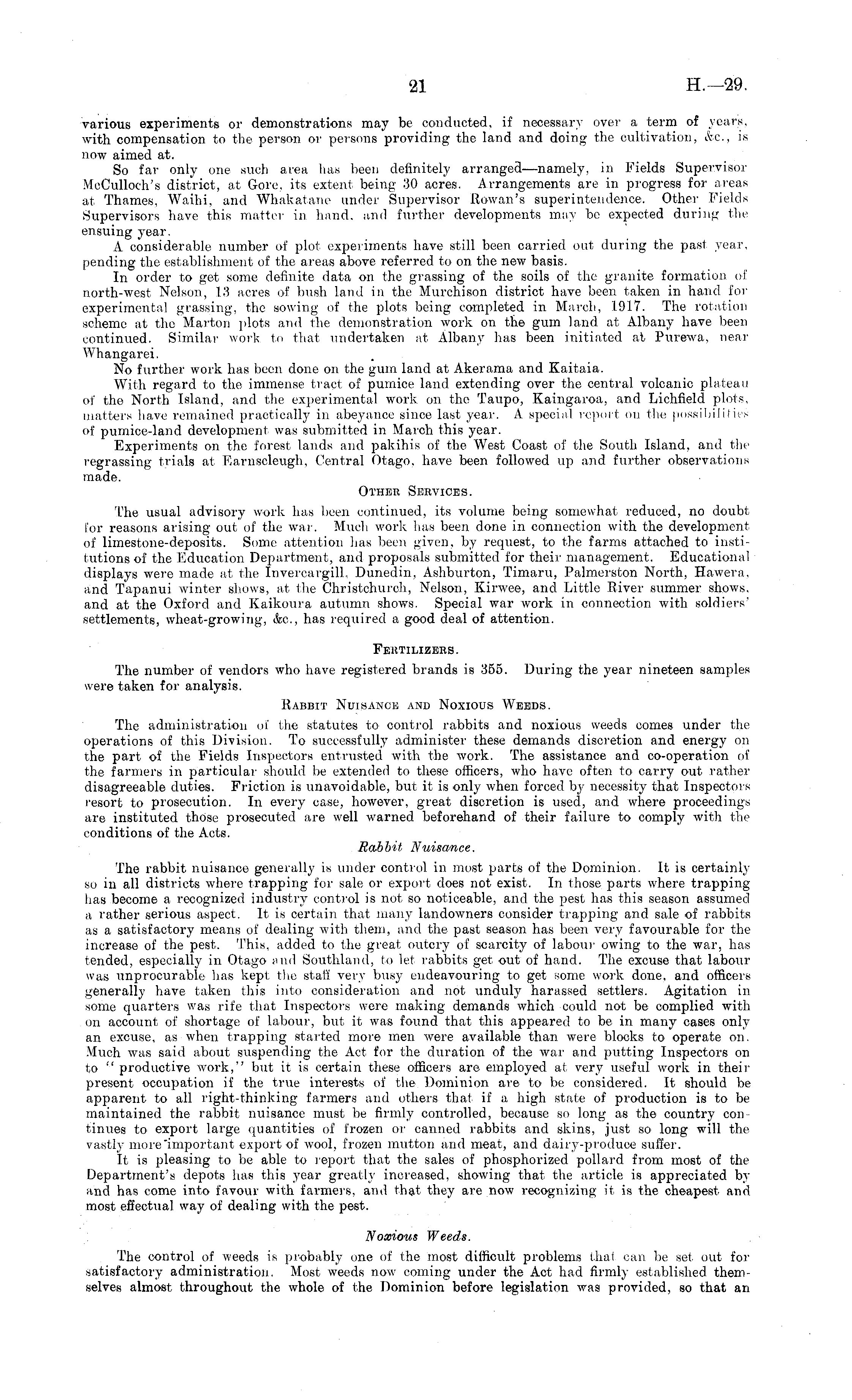 various experiments or demonstrations may be conducted, if necessary over a term of years, with compensation to the person or persons providing the land and doing the cultivation, <fec., is now aimed at. So far only one such area has been definitely arranged—namely, in Fields Supervisor McCulloch's district, at Gore, its extent being 30 acres. Arrangements are in progress for areas at Thames, Waihi, and Whakatane under Supervisor Rowan's superintendence. Other Fields Supervisors have this matter in hand, and further developments may be expected during tinensuing year. A considerable number of plot experiments have still been carried out during the past year, pending the establishment of the areas above referred to on the new basis. In order to get some definite data on the grassing of the soils of the granite formation of north-west Nelson, 13 acres of bush land in the Murchison district have been taken in hand for experimental grassing, the sowing of the plots being completed in March, 1917. The rotation scheme at the Marton plots and the demonstration work on the gum land at Albany have been continued. Similar work to that undertaken at Albany has been initiated at Purewa, near Whangarei. No further work has been done on the gum land at Akerama and Kaitaia. With regard to the immense tract, of pumice land extending over the central volcanic plateau of the North Island, and the experimental work on the Taupo, Kaingaroa, and Lichfield plots, matters have remained practically in abeyance since last year. A special reporl on the possibilities of pumice-land development was submitted in March this year. Experiments on the forest, lands and pakihis of the West Coast of the South Island, and the regrassing trials at Earnscleugh, Central Otago, have been followed up and further observations made. Other Services. The usual advisory work has been continued, its volume being somewhat reduced, no doubt for reasons arising out of the war. Much work has been done in connection with the development of limestone-deposits. Some attention has been given, by request, to the farms attached to institutions of the Education Department, and proposals submitted for their management. Educational displays were made at the InvercargiU, Dunedin, Ashburton, Timaru, Palmerston North, Hawera, and Tapanui winter shows, at the Christchureh, Nelson, Kirwee, and Little River summer shows, and at the Oxford and Kaikoura autumn shows. Special war work in connection with soldiers' settlements, wheat-growing, &c, has required a good deal of attention. Fertilizers. The number of vendors who have registered brands is 355. During the year nineteen samples were taken for analysis. Rabbit Nuisance and Noxious Weeds. The administration of the statutes to control rabbits and noxious weeds comes under the operations of this Division. To successfully administer these demands discretion and energy on the part of the Fields Inspectors entrusted with the work. The assistance and co-operation of the farmers in particular should be extended to these officers, who have often to carry out rather disagreeable duties. Friction is unavoidable, but it is only when forced by necessity that Inspectors resort to prosecution. In every case, however, great discretion is used, and where proceedings are instituted those prosecuted are well warned beforehand of their failure to comply with the conditions of the Acts. Babbit Nuisance. The rabbit nuisance generally is under control in most parts of the Dominion. It is certainly so in all districts where trapping for sale or export does not exist. In those parts where trapping has become a recognized industry control is not so noticeable, and the pest has this season assumed a rather serious aspect. It is certain that many landowners consider trapping and sale of rabbits as a satisfactory means of dealing with them, and the past season has been very favourable for the increase of the pest. This, added to the great outcry of scarcity of labour owing to the war, has tended, especially in Otago and Southland, to let rabbits get out of hand. The excuse that labour was unprocurable has kept the staff very busy endeavouring to get some work done, and officers generally have taken this into consideration and not unduly harassed settlers. Agitation in some quarters was rife that Inspectors were making demands which could not be complied with on account of shortage of labour, but it was found that this appeared to be in many cases only an excuse, as when trapping started more men were available than were blocks to operate on. Much was said about susjjending the Act for the duration of the war and putting Inspectors on to " productive work," but it is certain these officers are employed at very useful work in their present occupation if the true interests of the Dominion are to be considered. It should be apparent to all right-thinking farmers and others that if a high state of production is to be maintained the rabbit nuisance must be firmly controlled, because so long as the country continues to export large quantities of frozen or canned rabbits and skins, just so long will the vastly more'important export of wool, frozen mutton and meat, and dairy-produce suffer. It is pleasing to be able to report that the sales of phosphorized pollard from most of the Department's depots has this year great!)' increased, showing that the article is appreciated by and has come into favour with farmers, ami that they are now recognizing it is the cheapest and most effectual way of dealing with the pest. Noxious Weeds. The control of weeds is probably one of the most difficult problems that can be set out for satisfactory administration. Most weeds now coming under the Act had firmly established themselves almost throughout the whole of the Dominion before legislation was provided, so that an